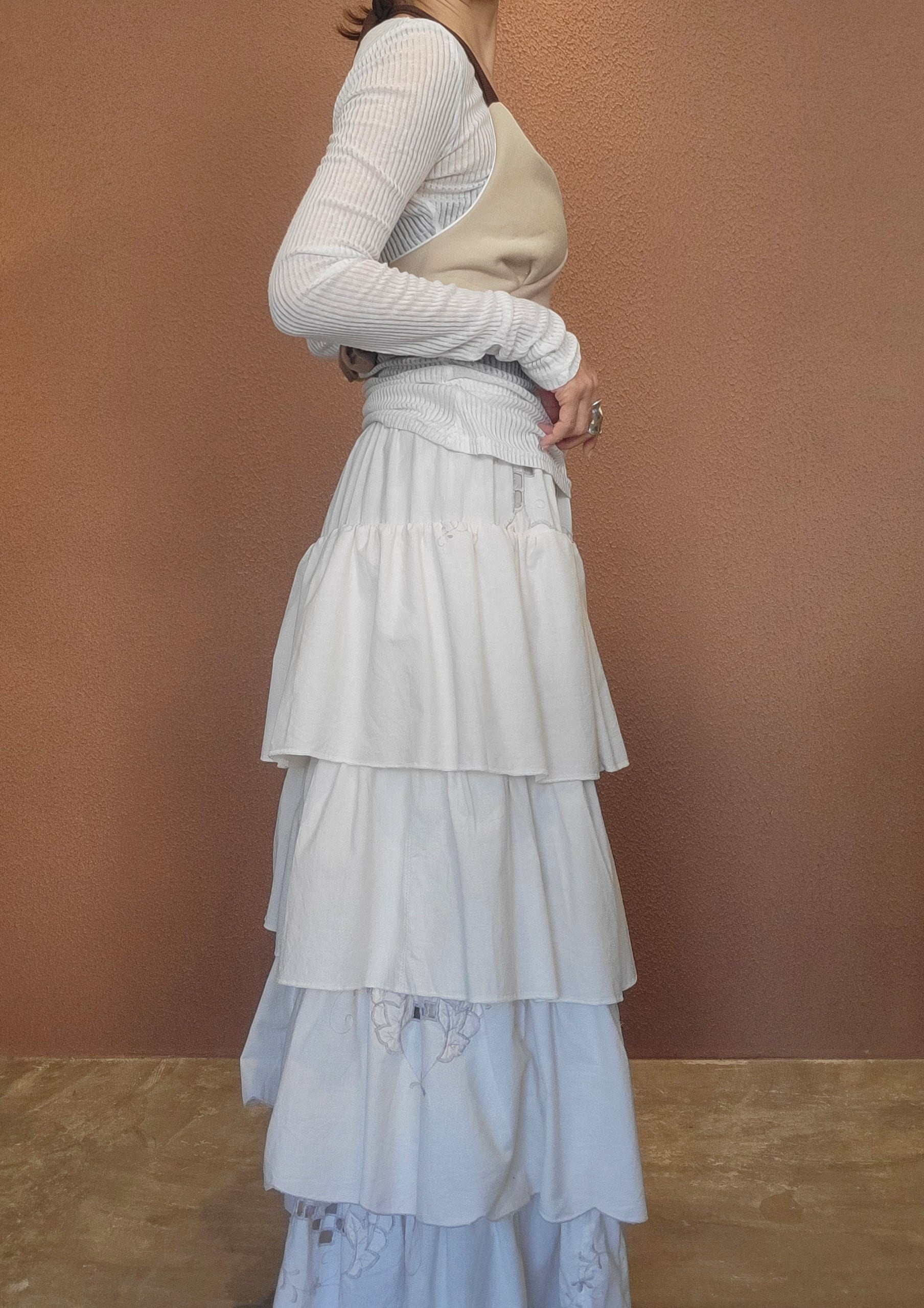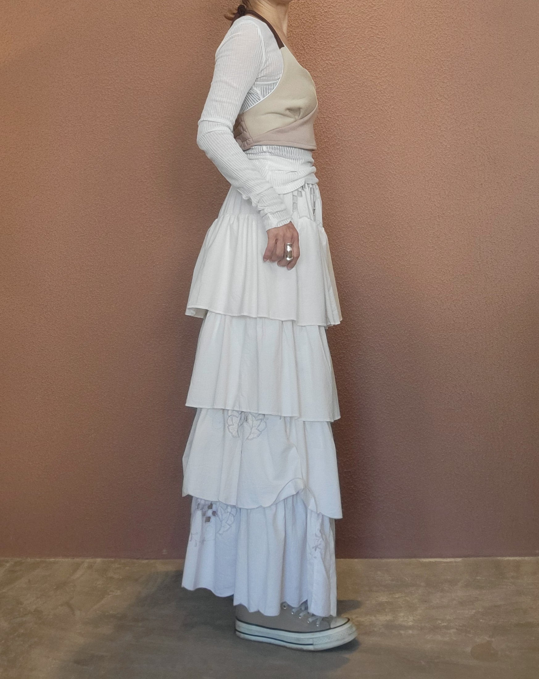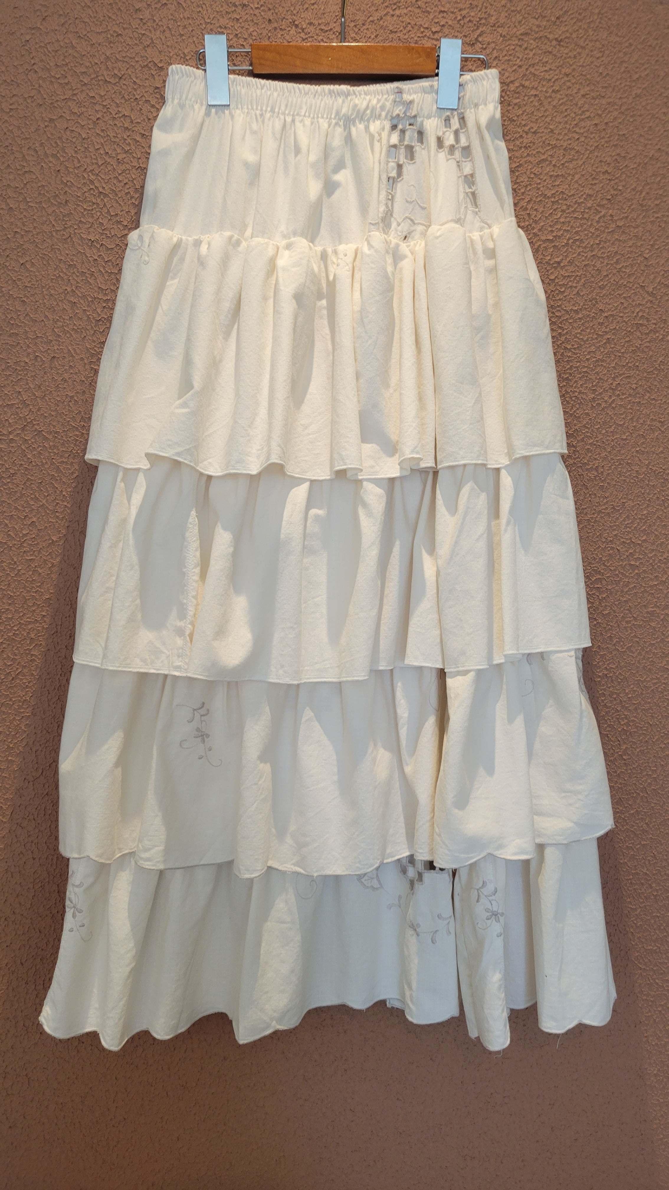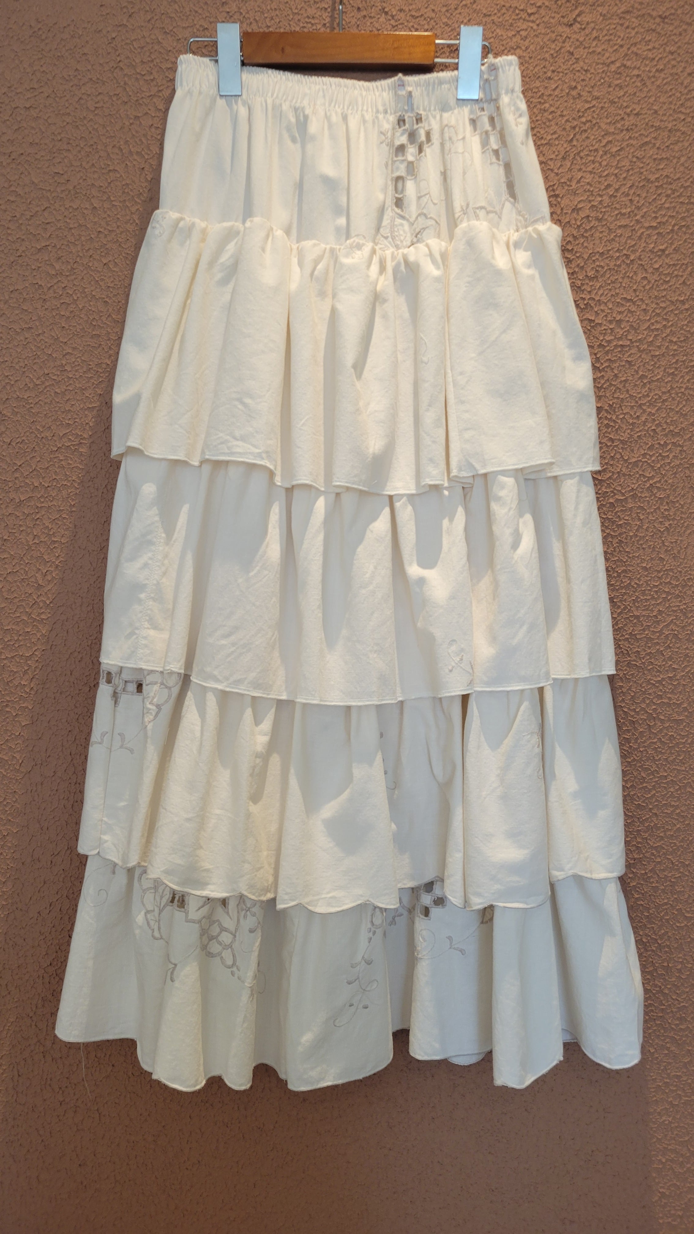 ヴィンテージの刺繍クロスを使用したリメイクスカート。ウエストゴムです。素材表記はありませんがコットンです。ほどよい張り感で着用時にギャザーのふんわり感をキープ。生地自体に透け感はありませんが生地にレース部分があるためペチコートの着用がおすすめです。