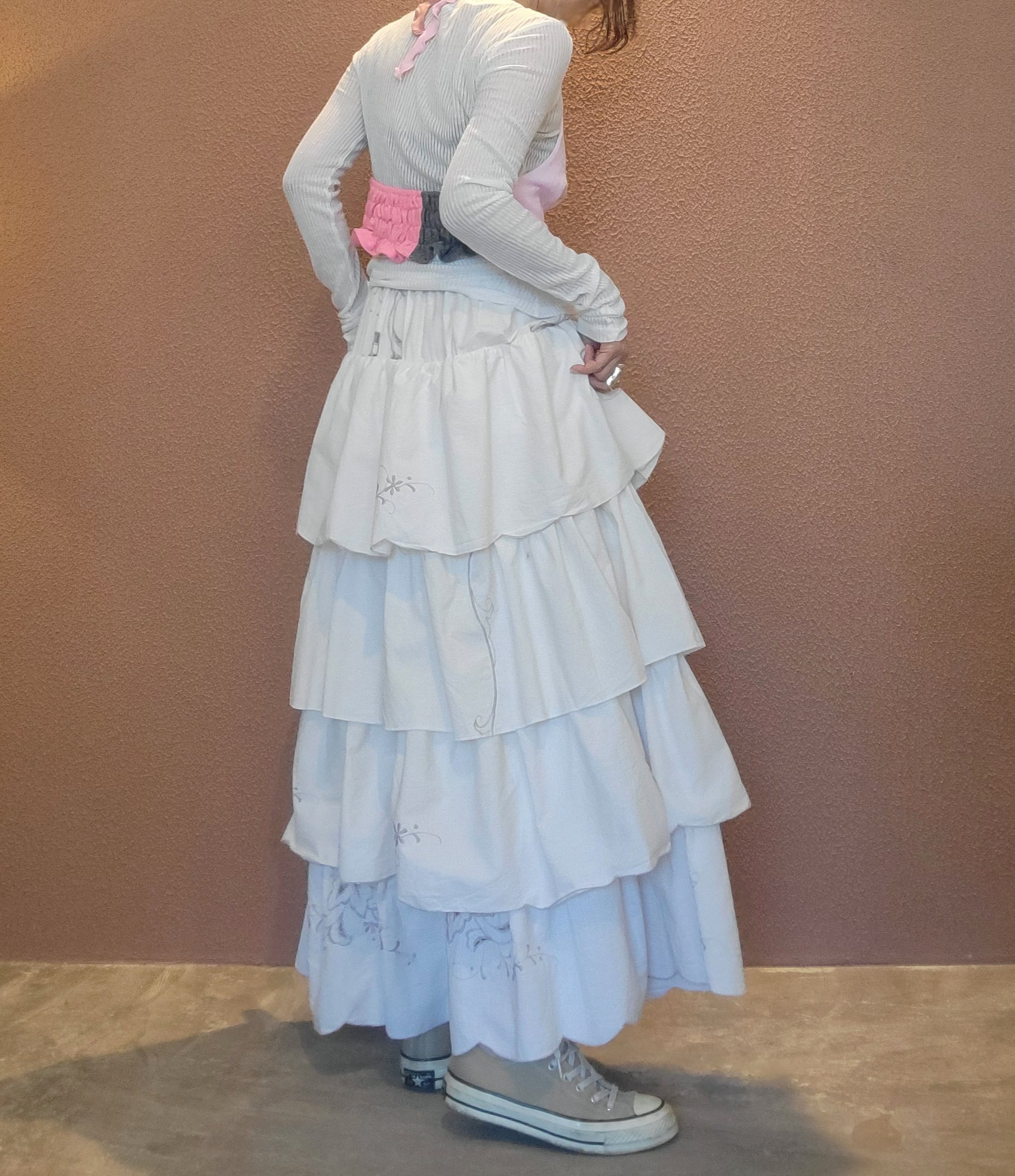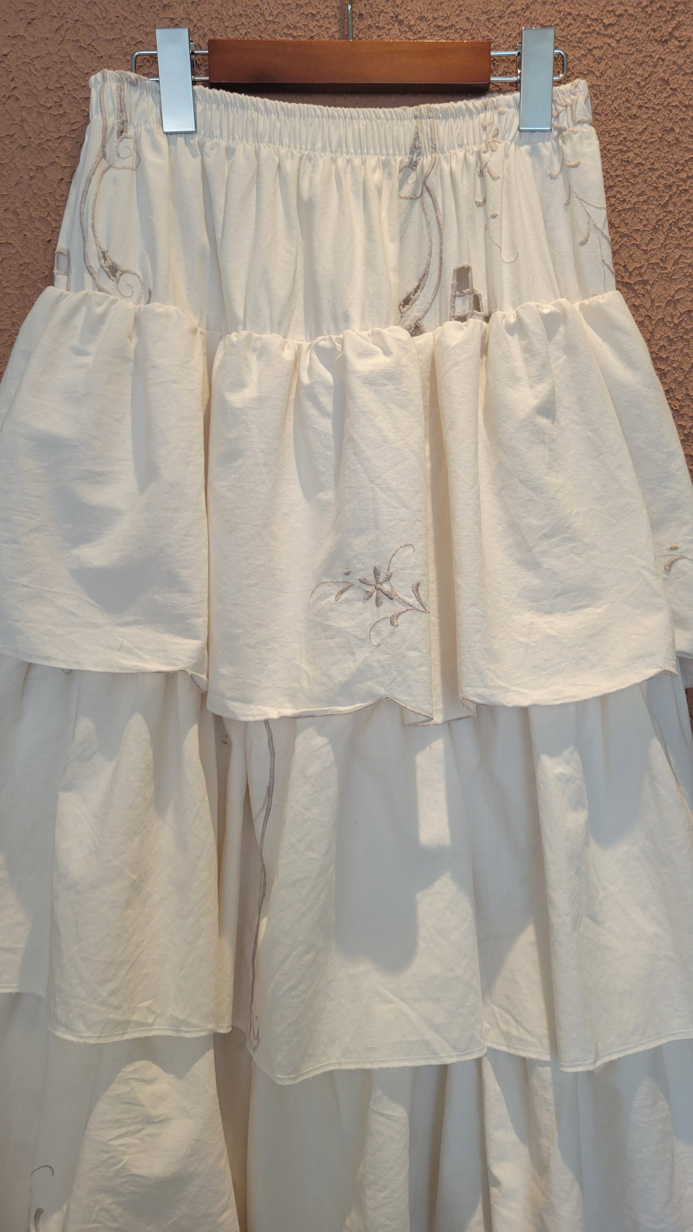 ヴィンテージの刺繍クロスを使用したリメイクスカート。ウエストゴムです。素材表記はありませんがコットンです。ほどよい張り感で着用時にギャザーのふんわり感をキープ。生地自体に透け感はありませんが生地にレース部分があるためペチコートの着用がおすすめです。
