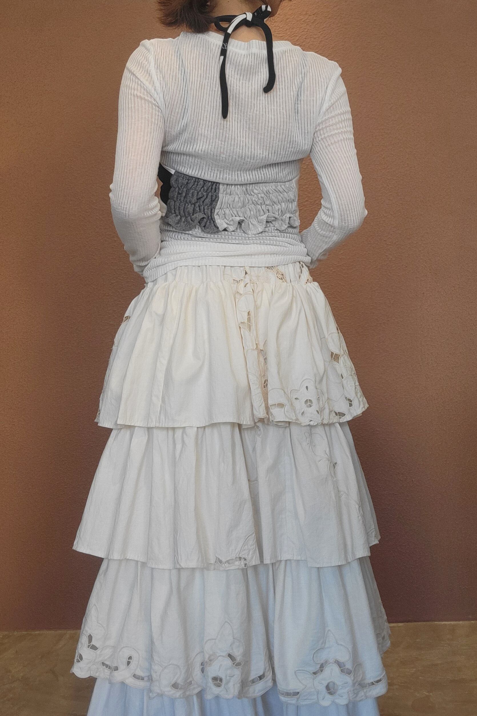 ヴィンテージの刺繍クロスを使用したリメイクスカート。ウエストゴムです。素材表記はありませんがコットンです。ほどよい張り感で着用時にギャザーのふんわり感をキープ。生地自体に透け感はありませんが生地にレース部分があるためペチコートの着用がおすすめです。