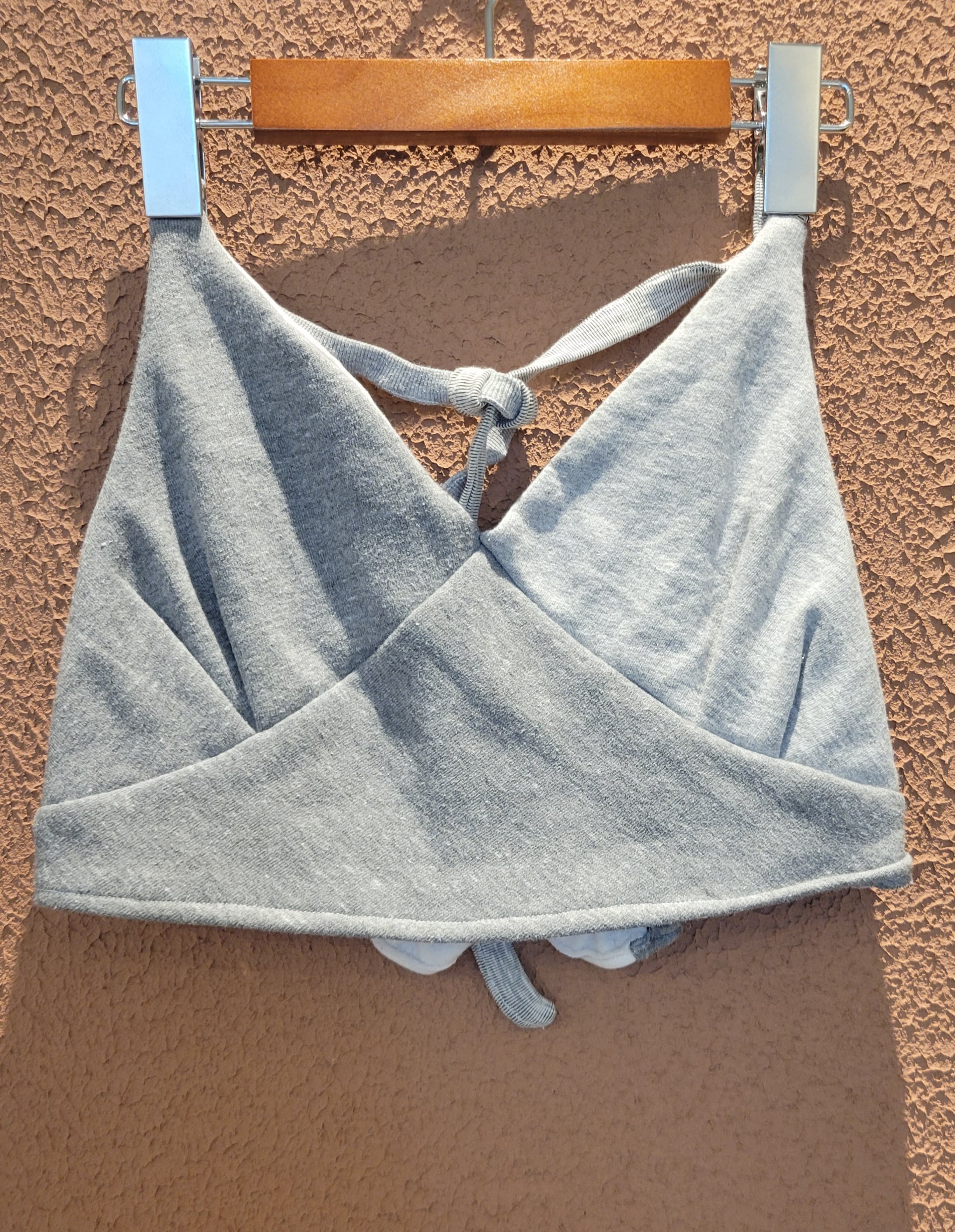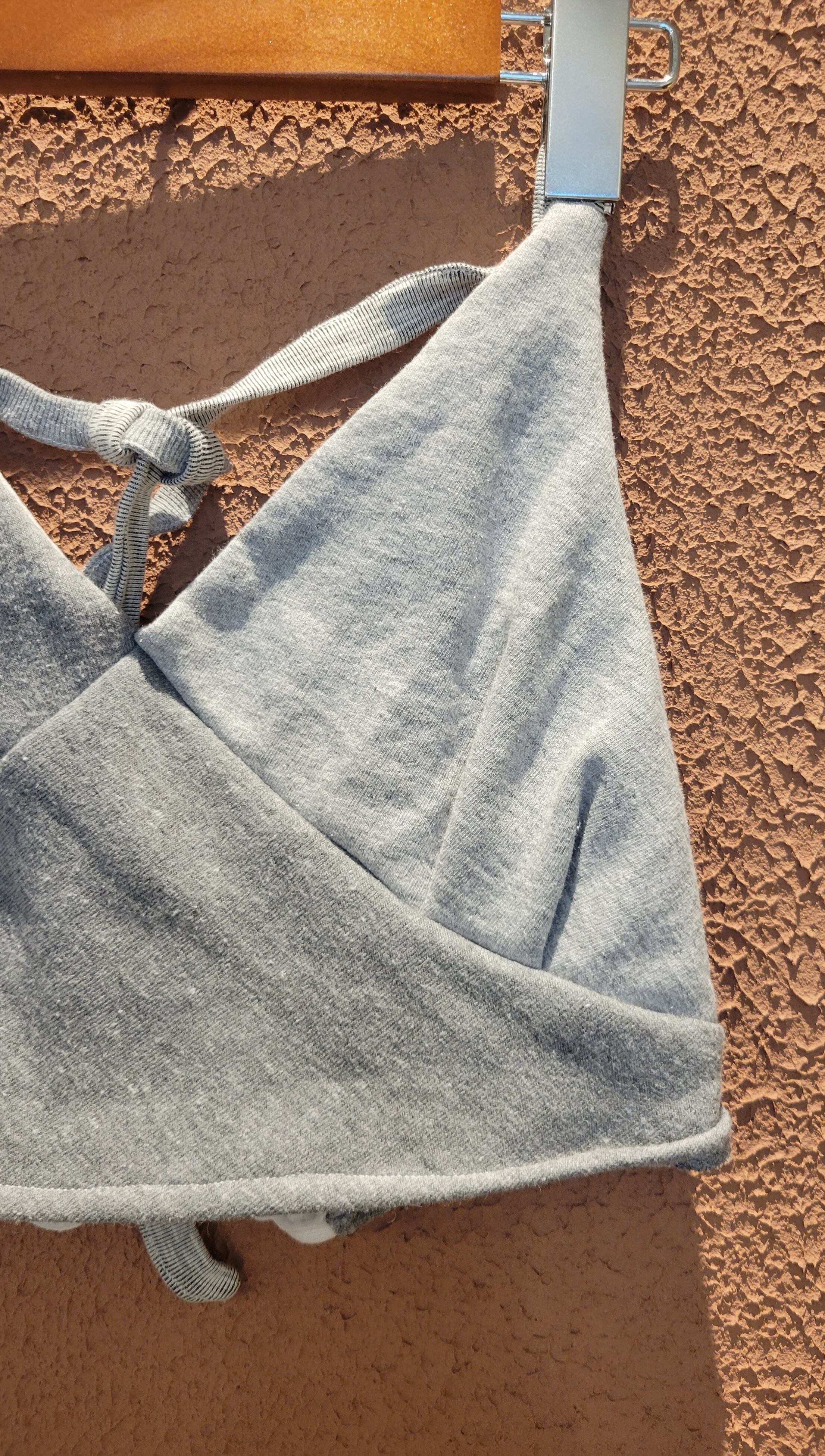 usedのスウェットシャツをパーツに使用したリメイクビスチェ。素材はコットンです。一部裏起毛のパーツが使われているものもあります。ホルターネック、バックは伸縮性のあるシャーリングゴム仕様でフィット感に優れます。