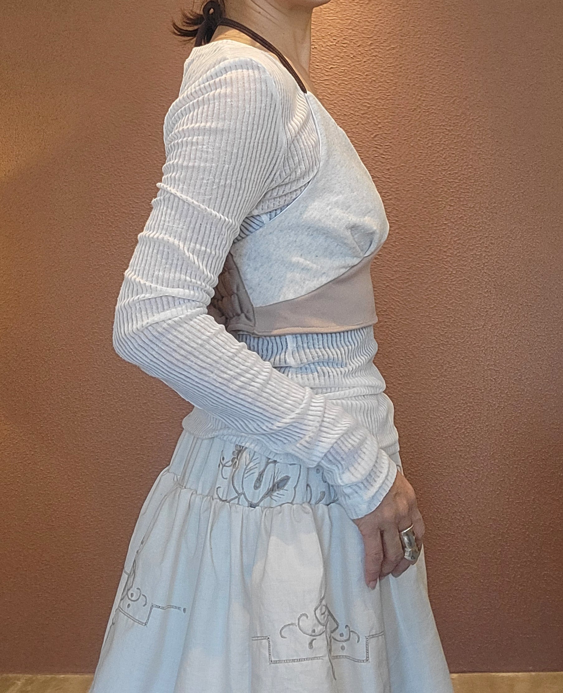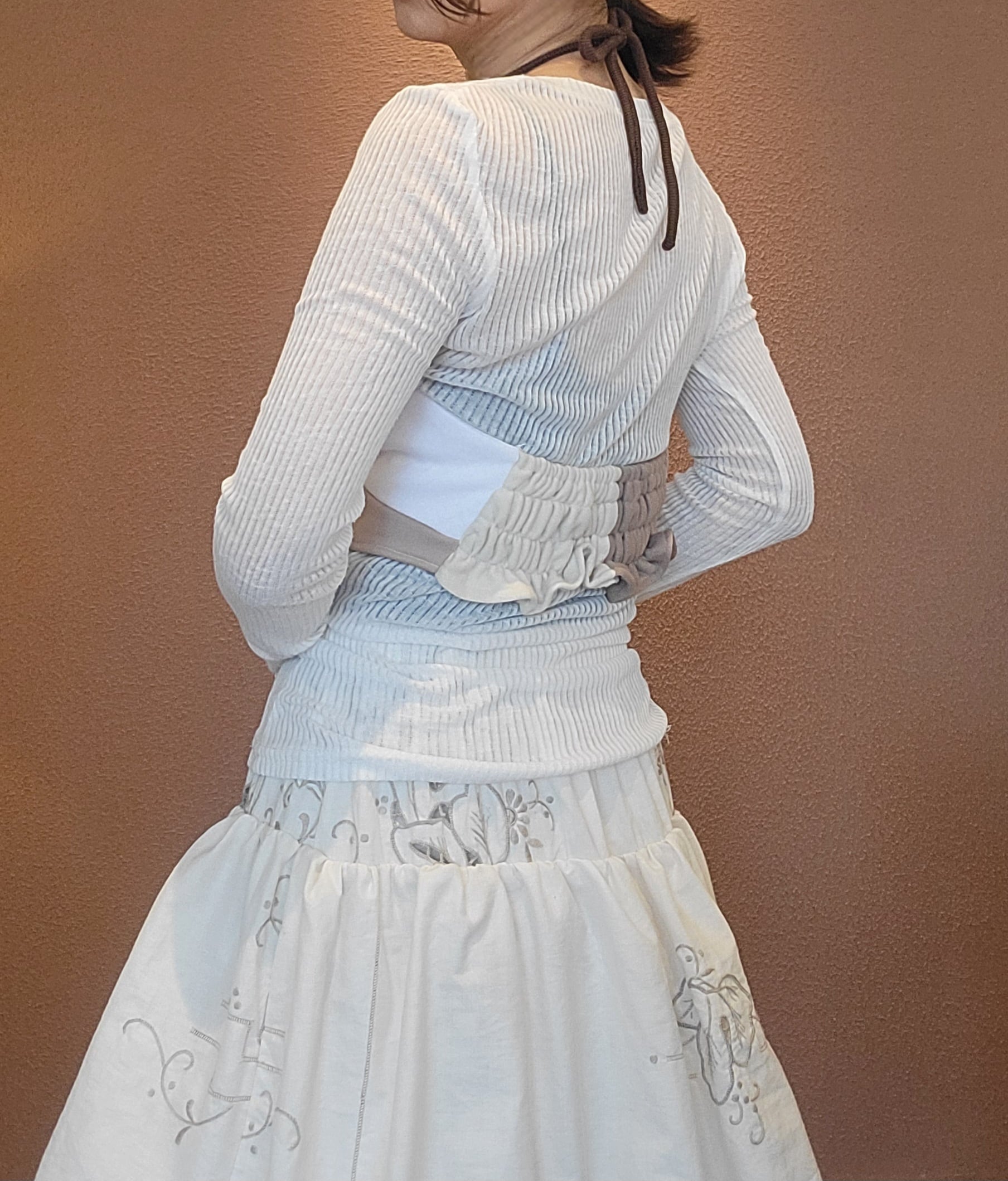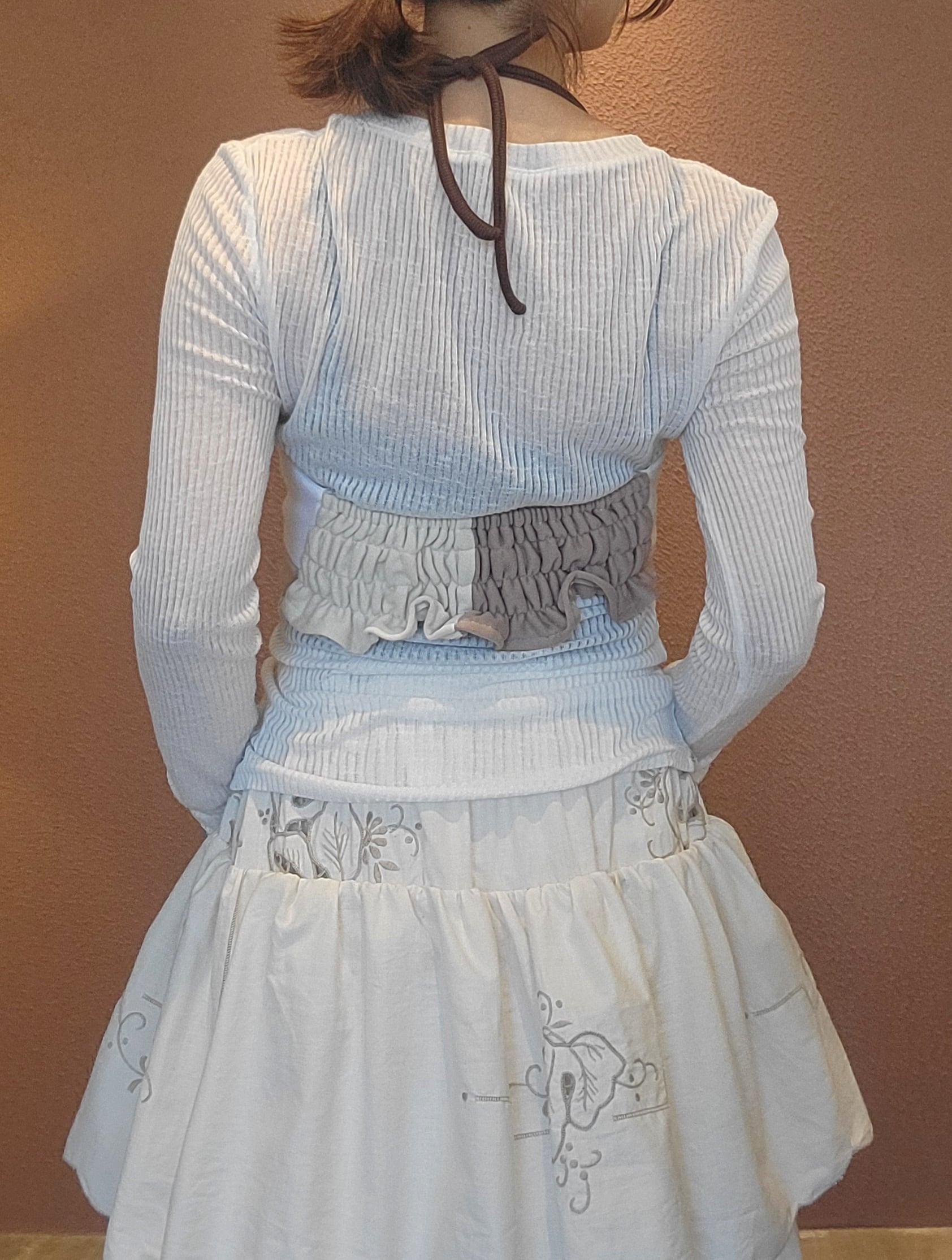 usedのスウェットシャツをパーツに使用したリメイクビスチェ。素材はコットンです。一部裏起毛のパーツが使われているものもあります。ホルターネック、バックは伸縮性のあるシャーリングゴム仕様でフィット感に優れます。
