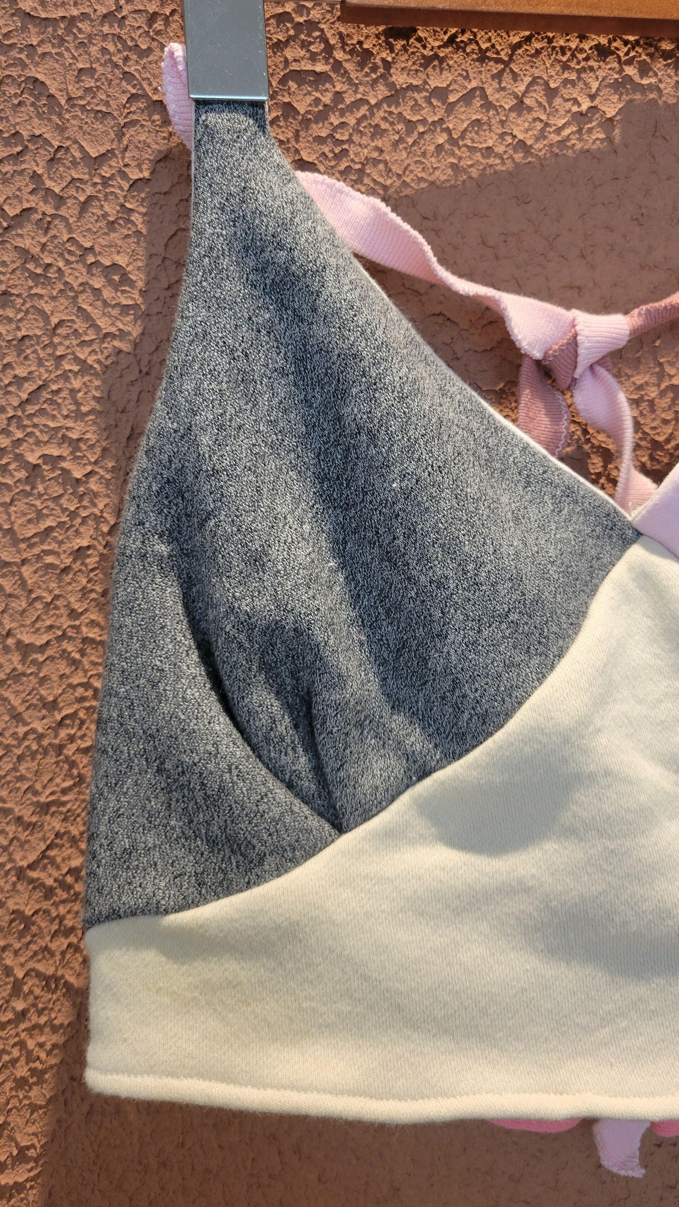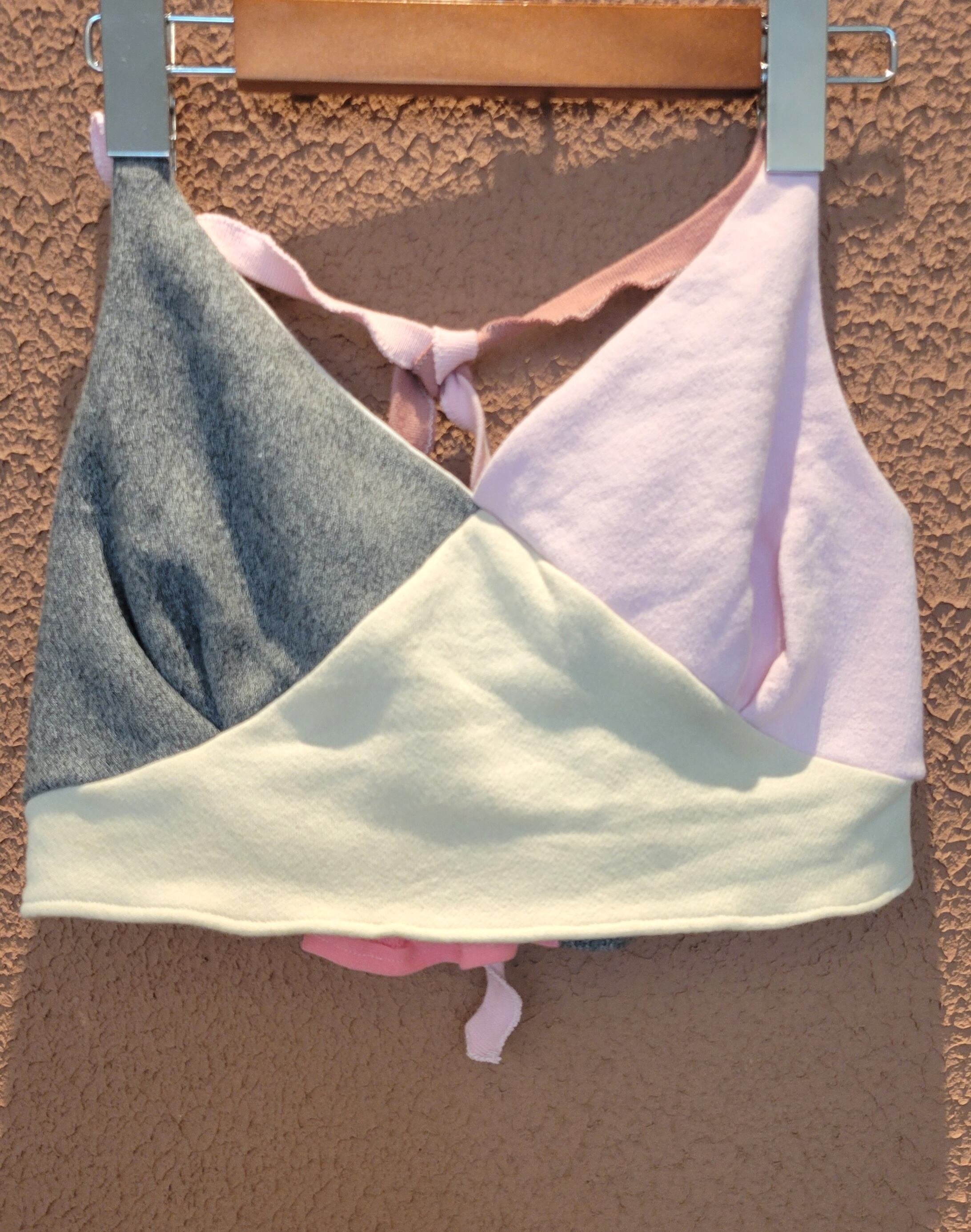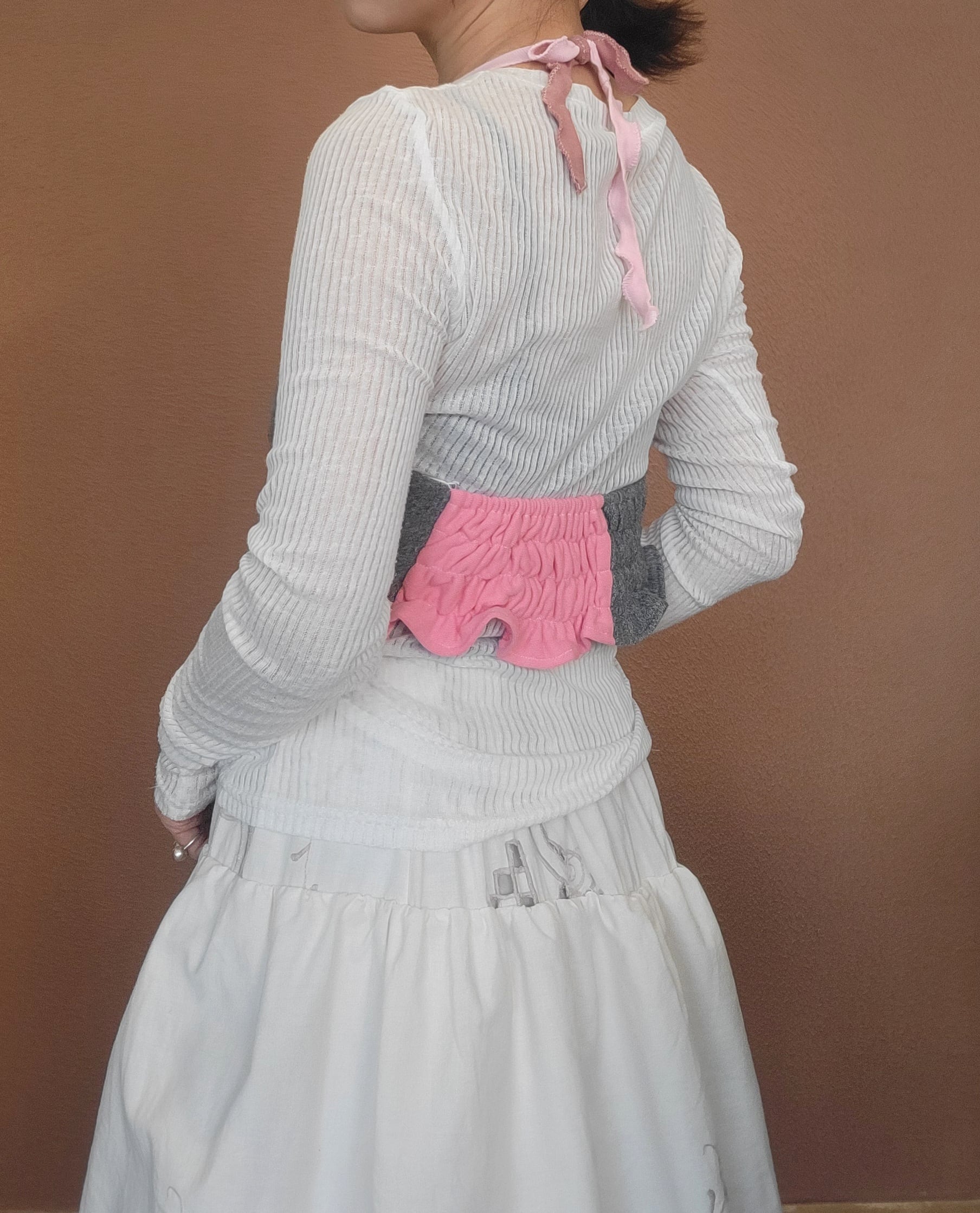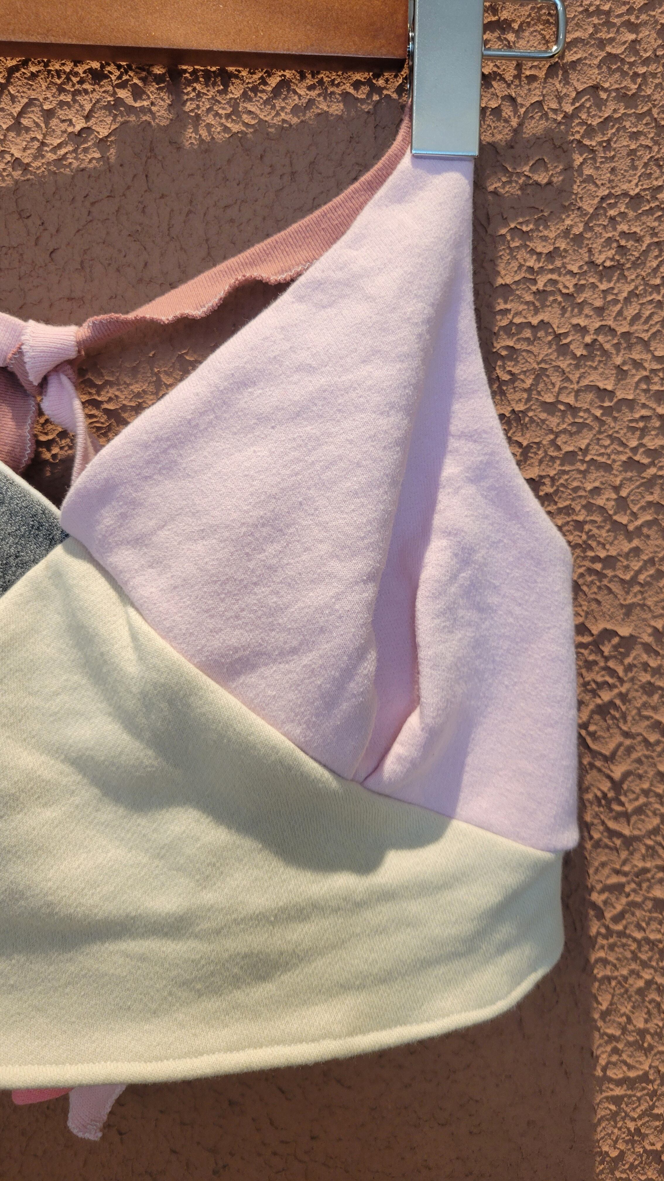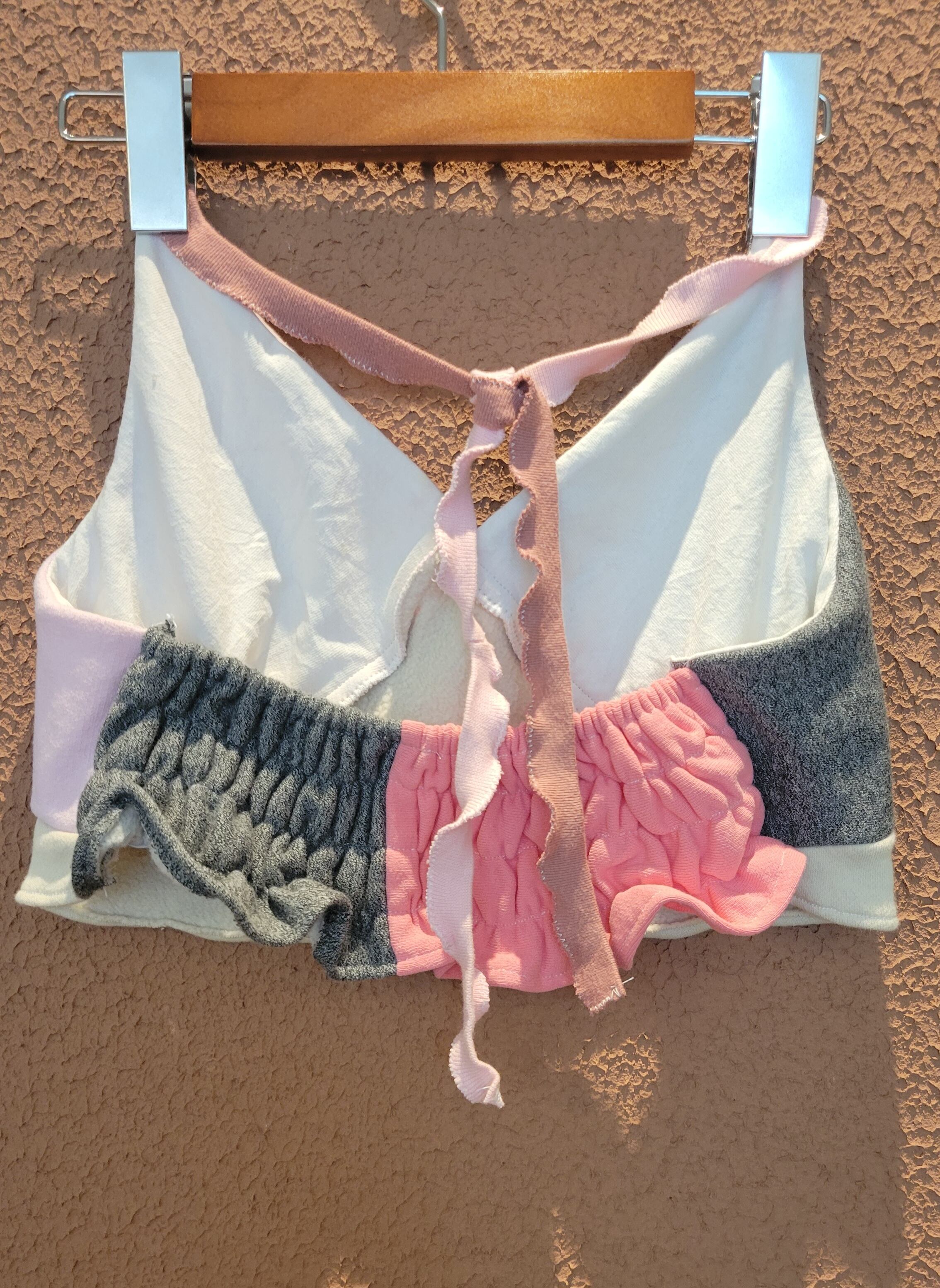 usedのスウェットシャツをパーツに使用したリメイクビスチェ。素材はコットンです。一部裏起毛のパーツが使われているものもあります。ホルターネック、バックは伸縮性のあるシャーリングゴム仕様でフィット感に優れます。