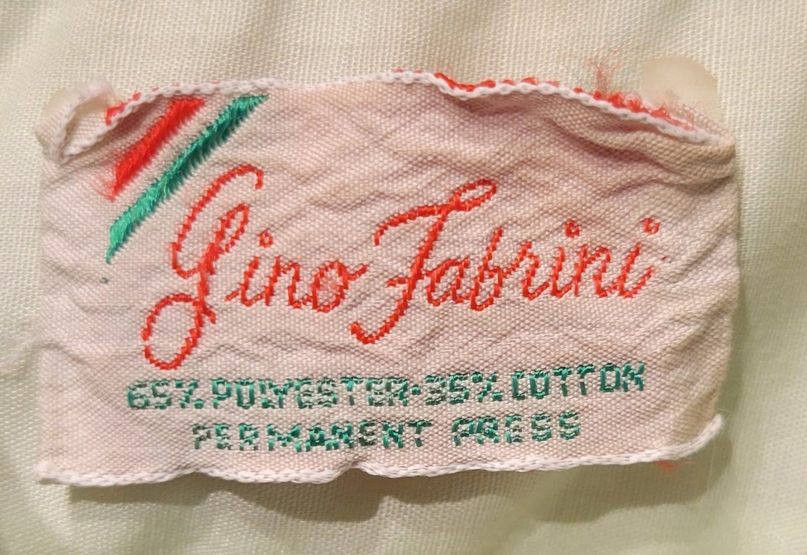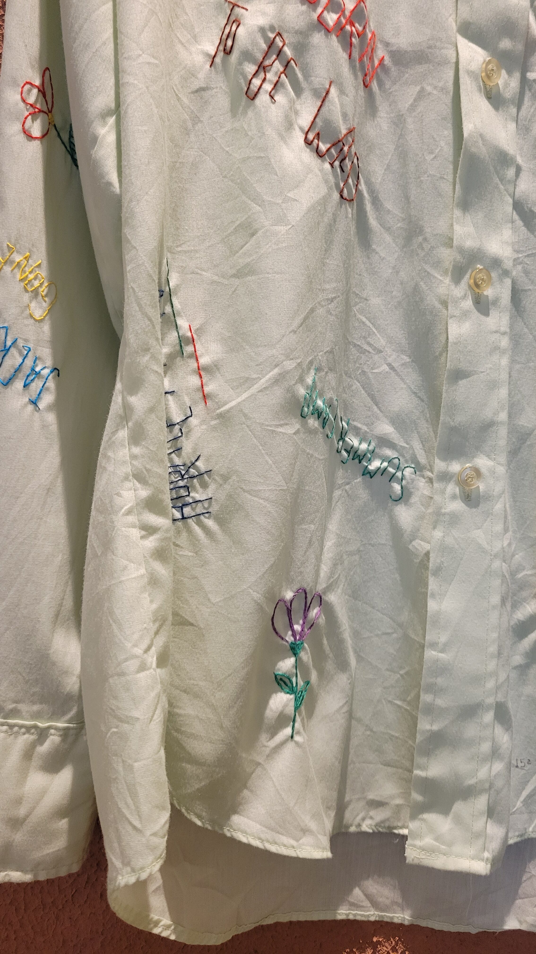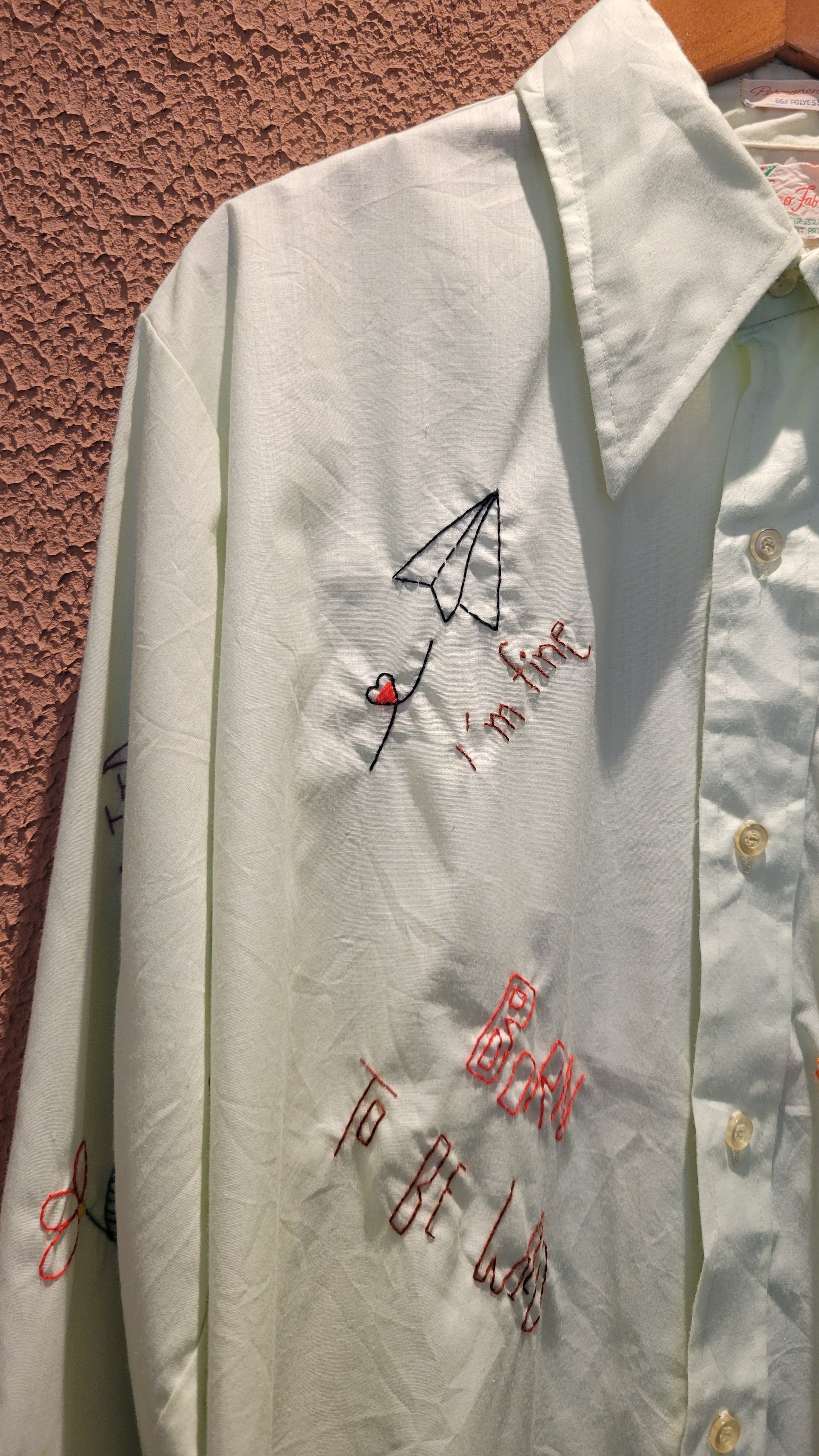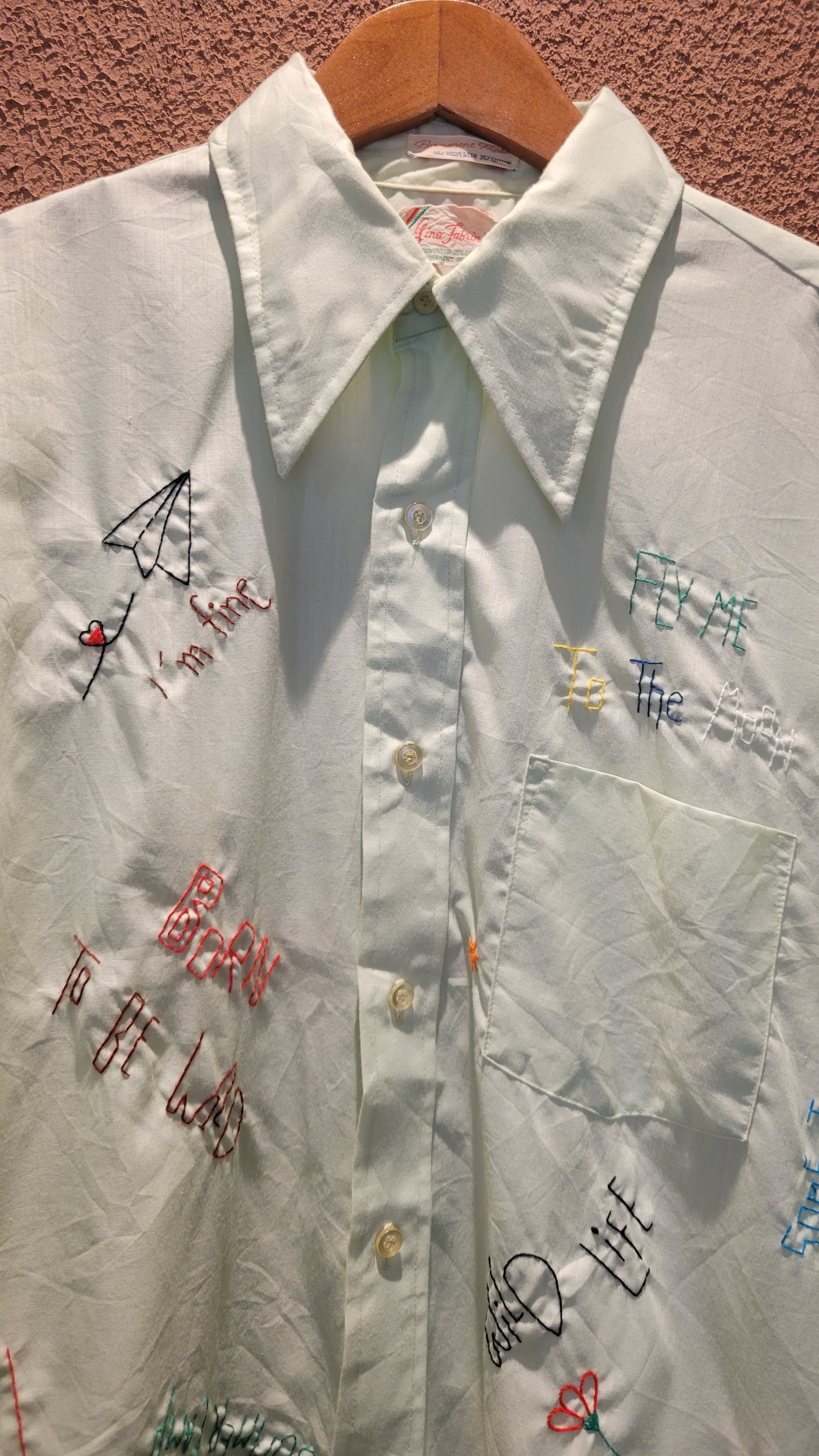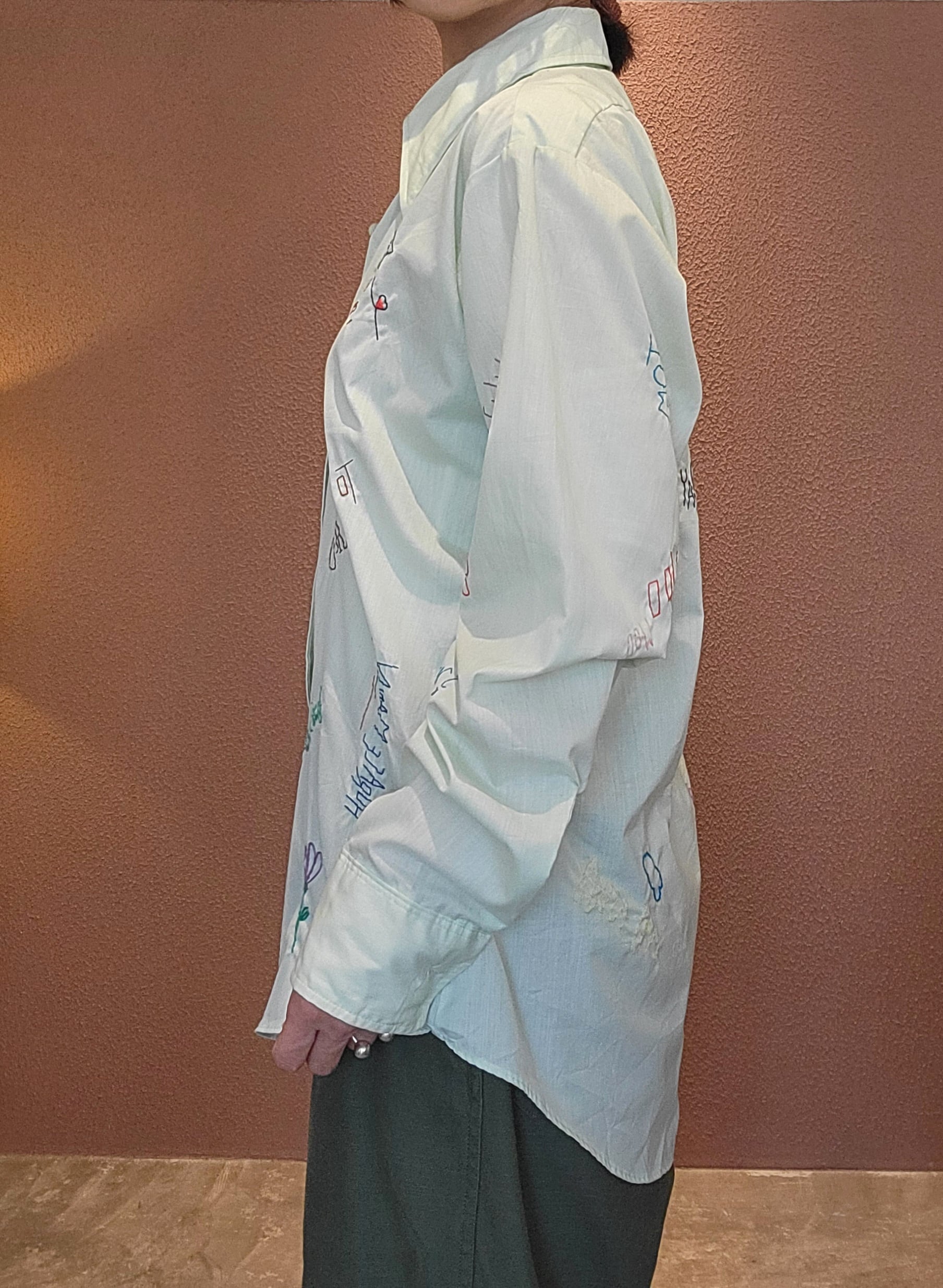70sのメンズシャツに後からハンドステッチを施した刺繍シャツ。素材表記はコットン35% ポリエステル65%の混紡です。ゆるくて可愛いメッセージやモチーフをカラフルな糸でハンドステッチ。手刺繍ならではの味わいのある1枚です。