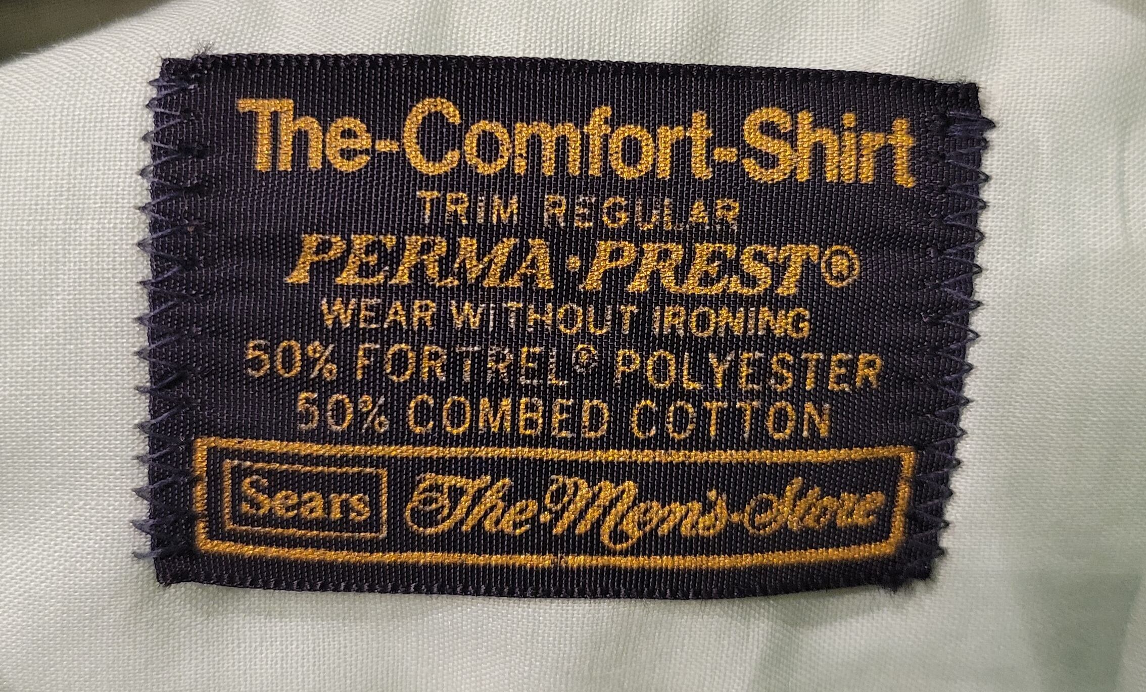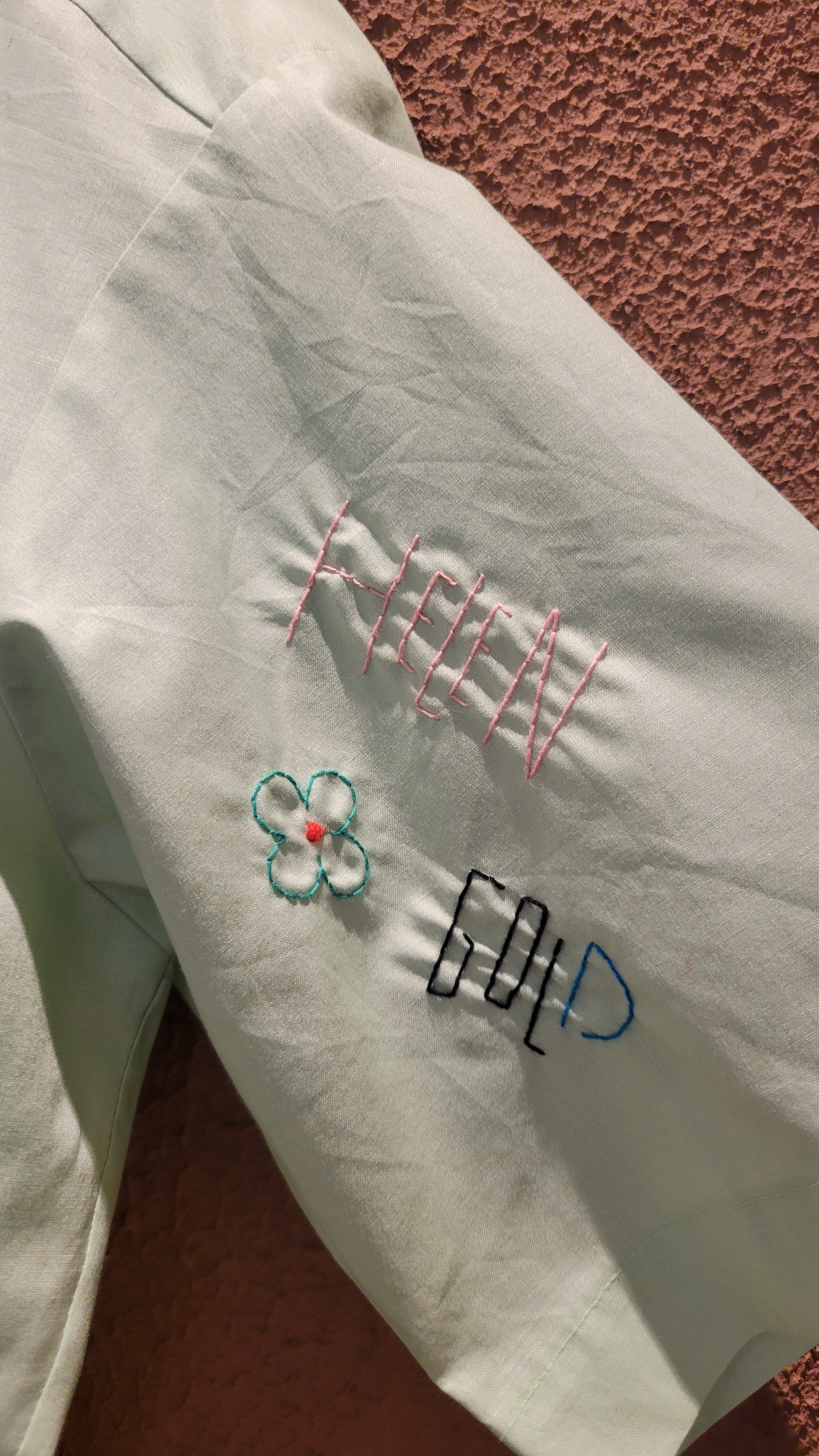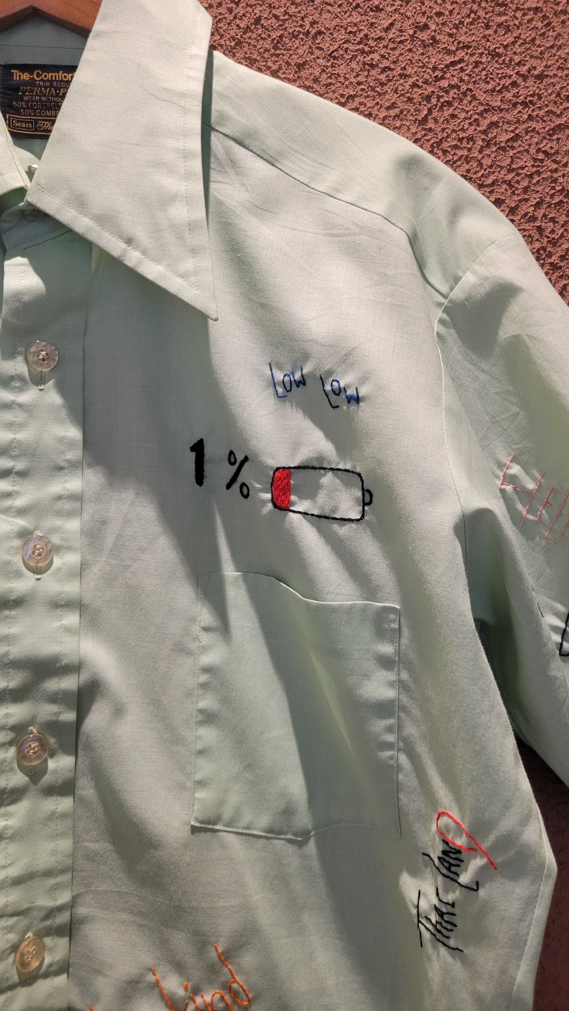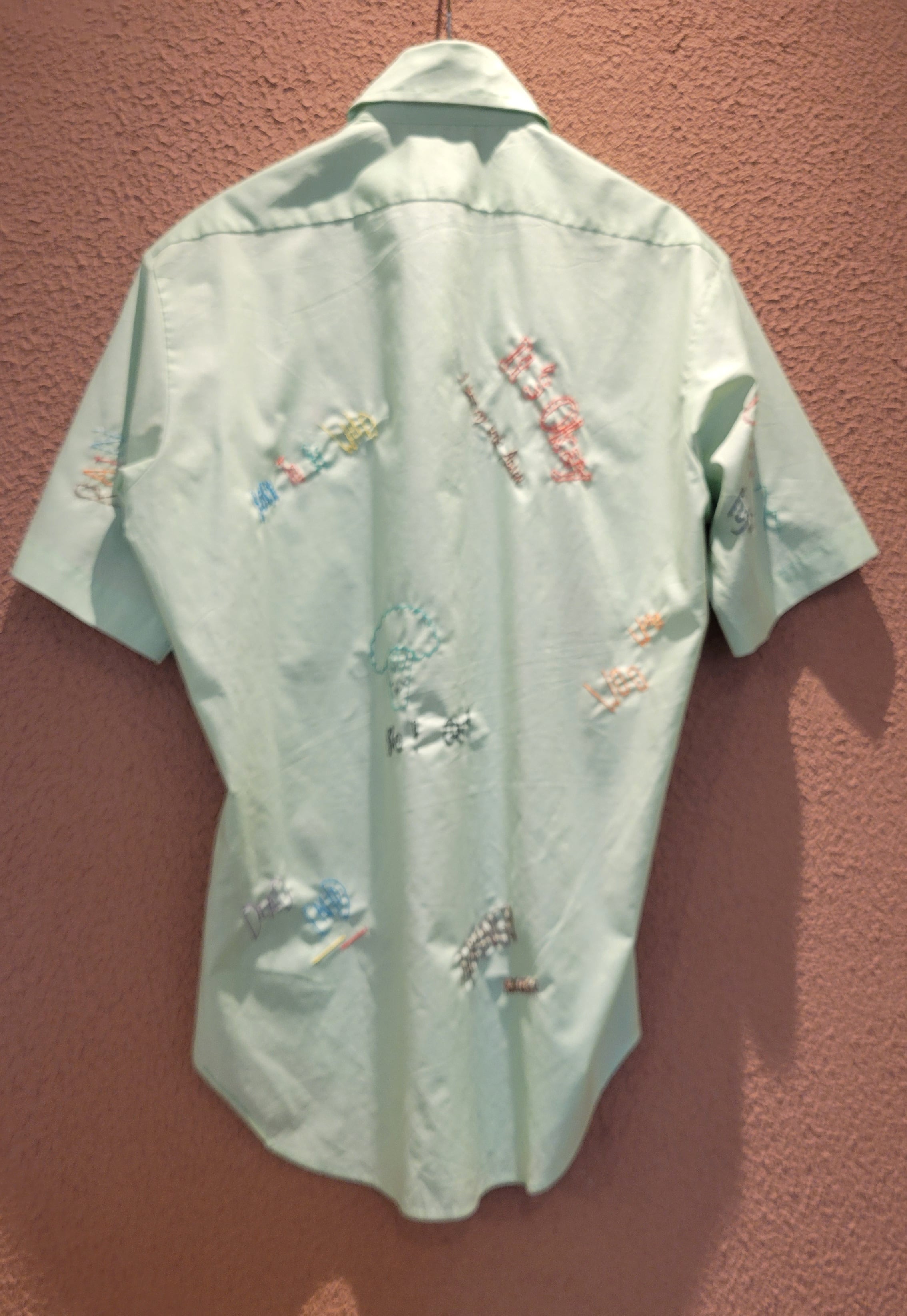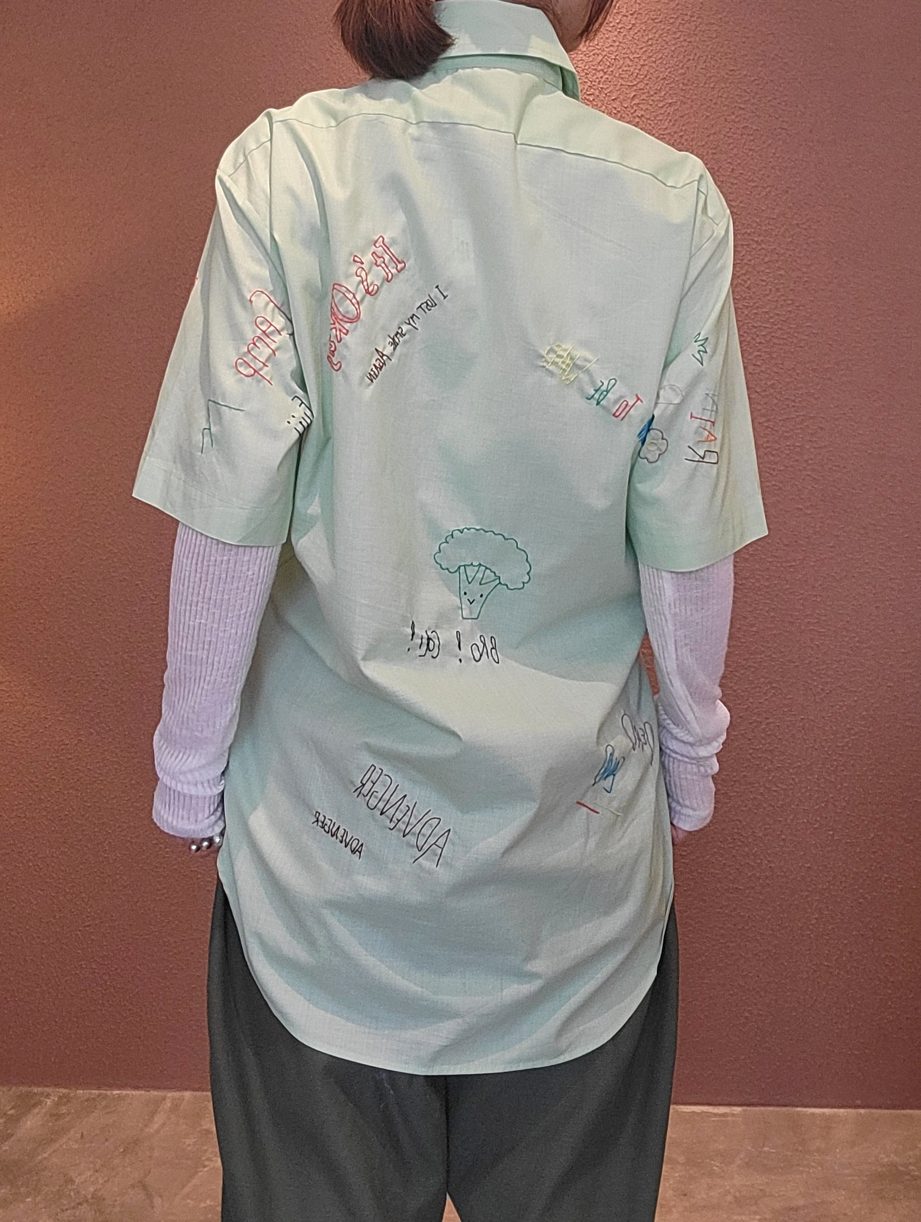 70sのメンズシャツに後からハンドステッチを施した刺繍シャツ。素材表記はコットン50% ポリエステル50%の混紡です。ゆるくて可愛いメッセージやモチーフをカラフルな糸でハンドステッチ。手刺繍ならではの味わいのある1枚です。