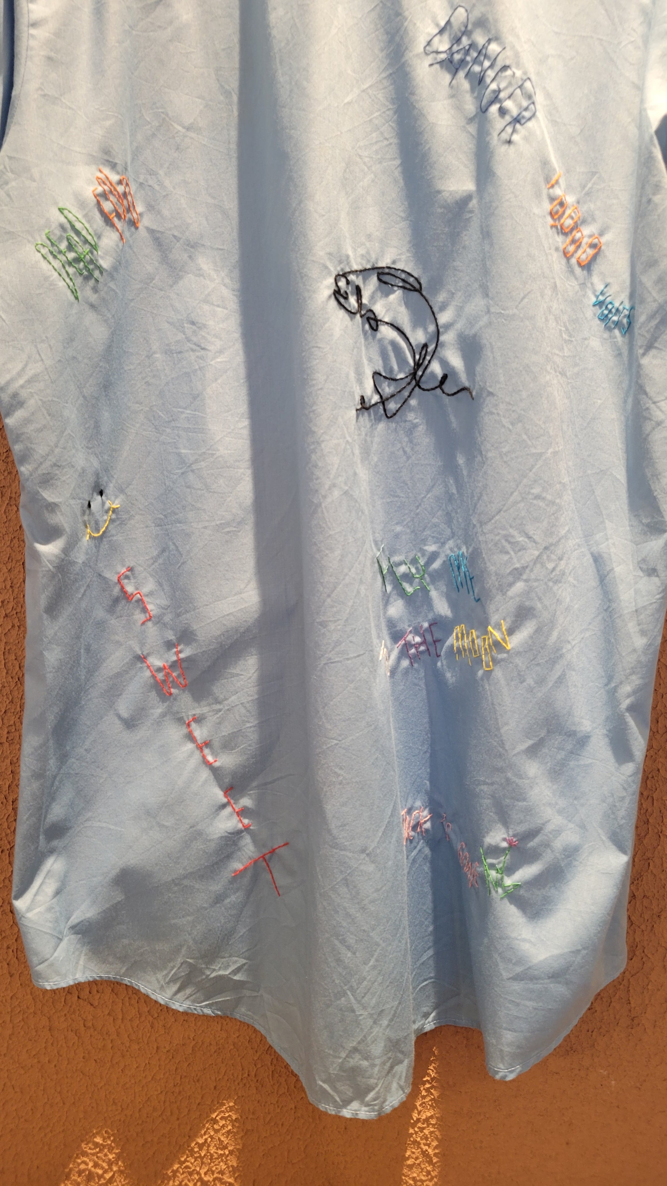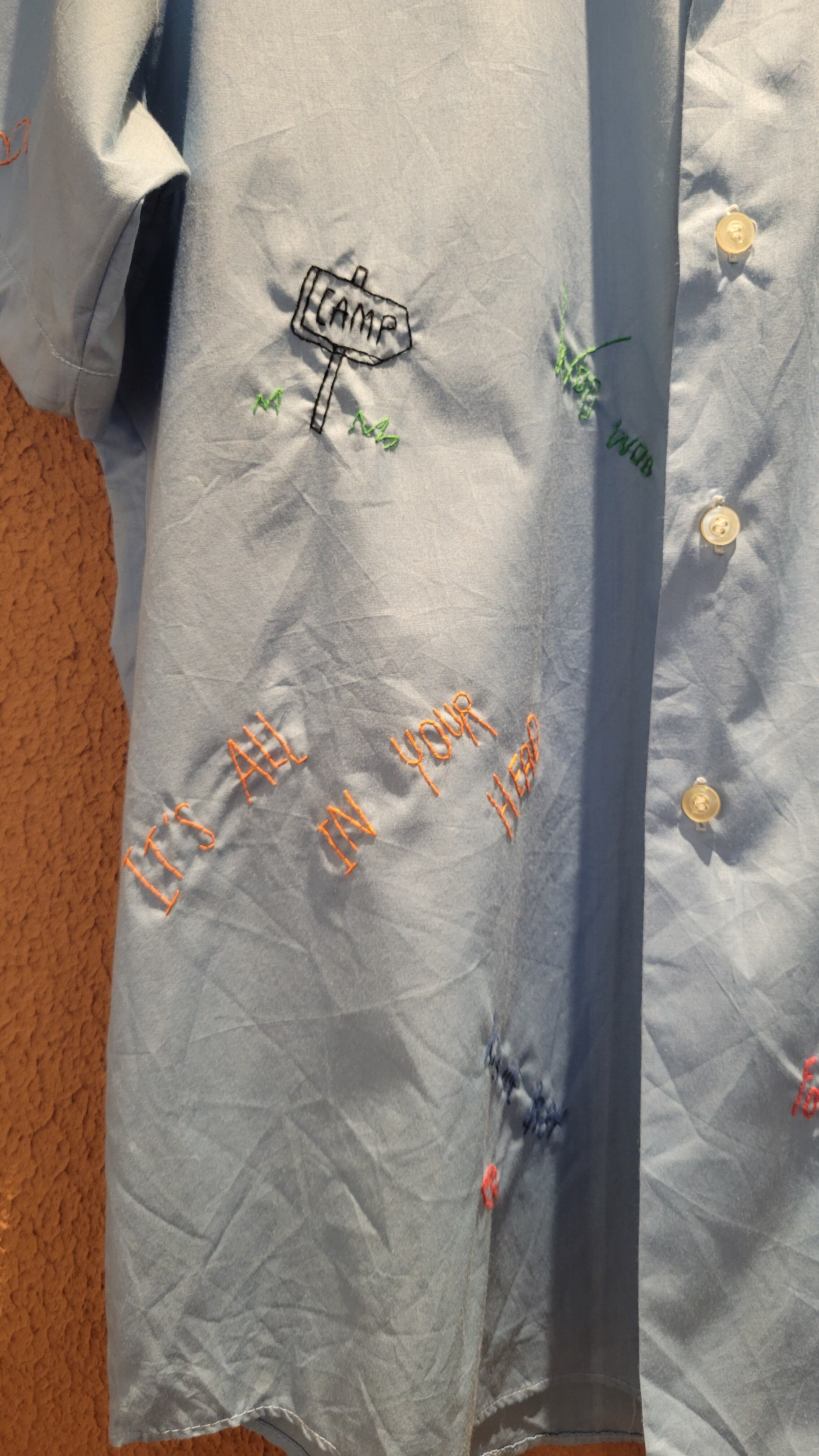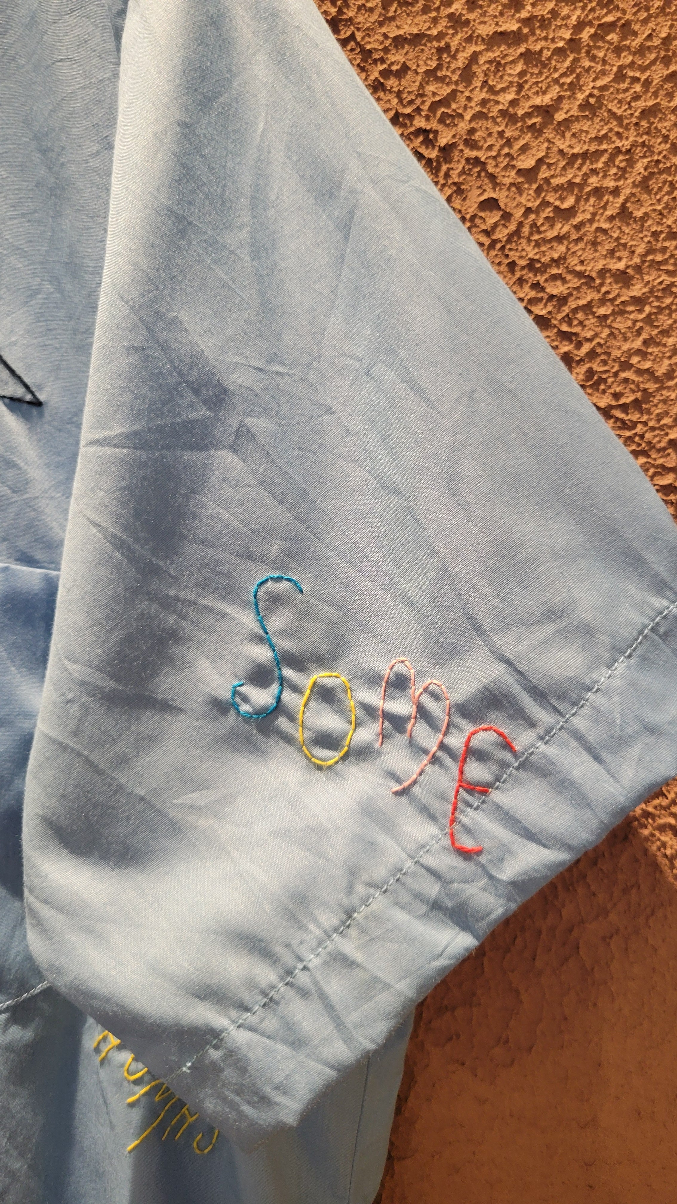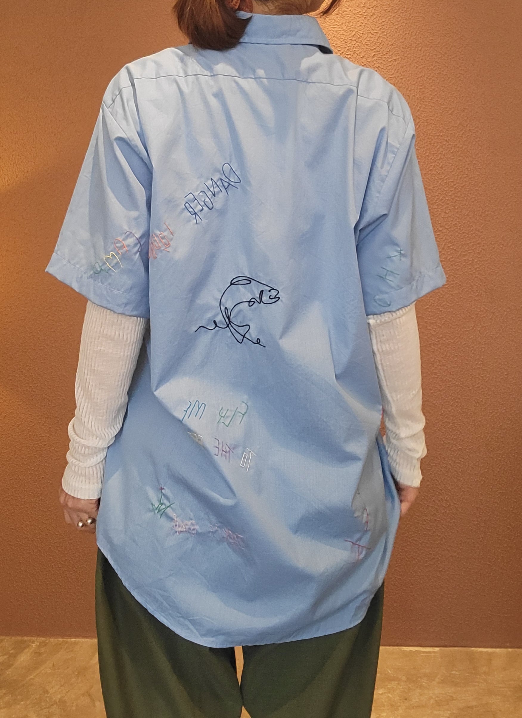 70sのメンズシャツに後からハンドステッチを施した刺繍シャツ。素材表記はコットン35% ポリエステル65%の混紡です。ゆるくて可愛いメッセージやモチーフをカラフルな糸でハンドステッチ。手刺繍ならではの味わいのある1枚です。