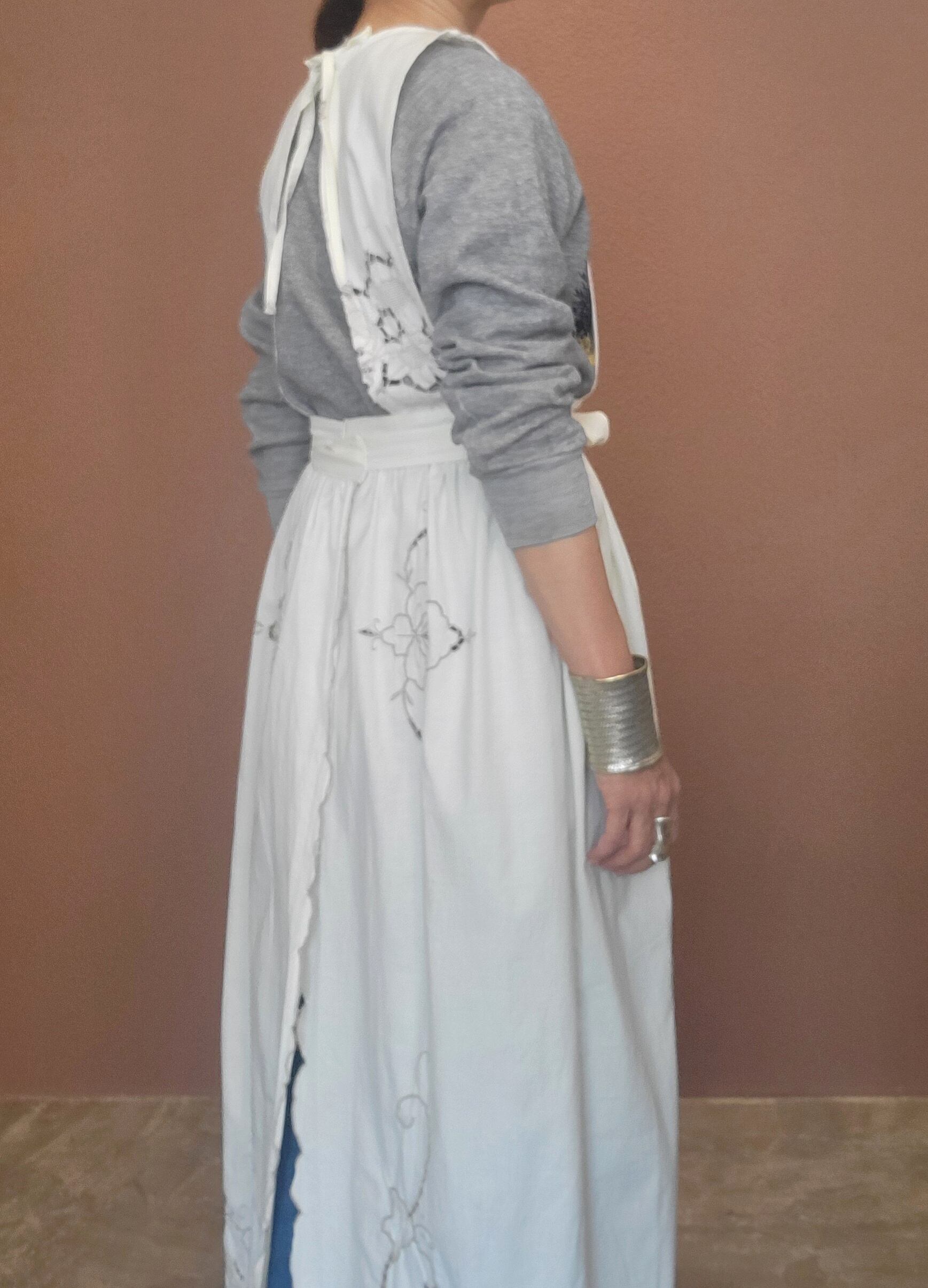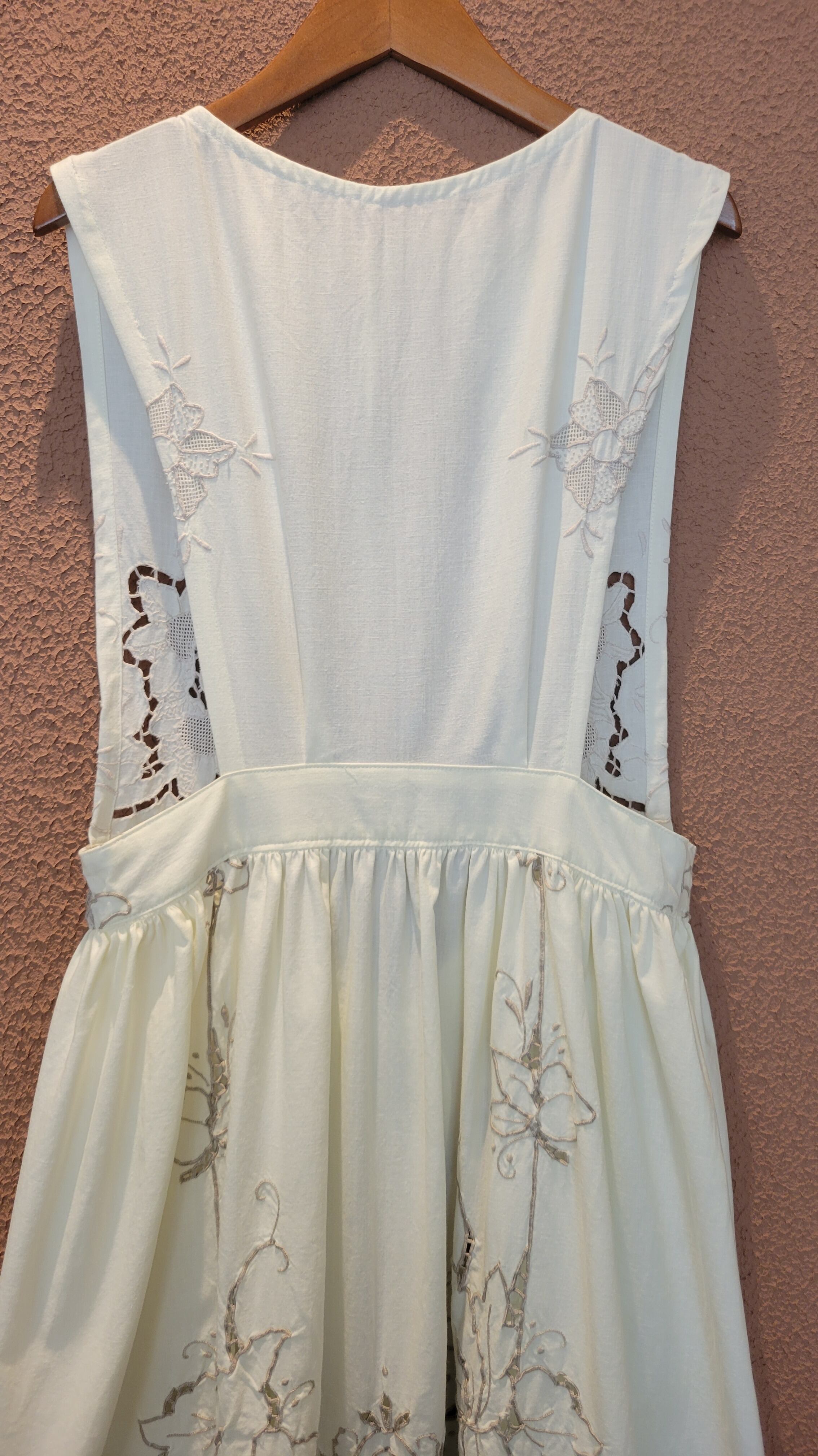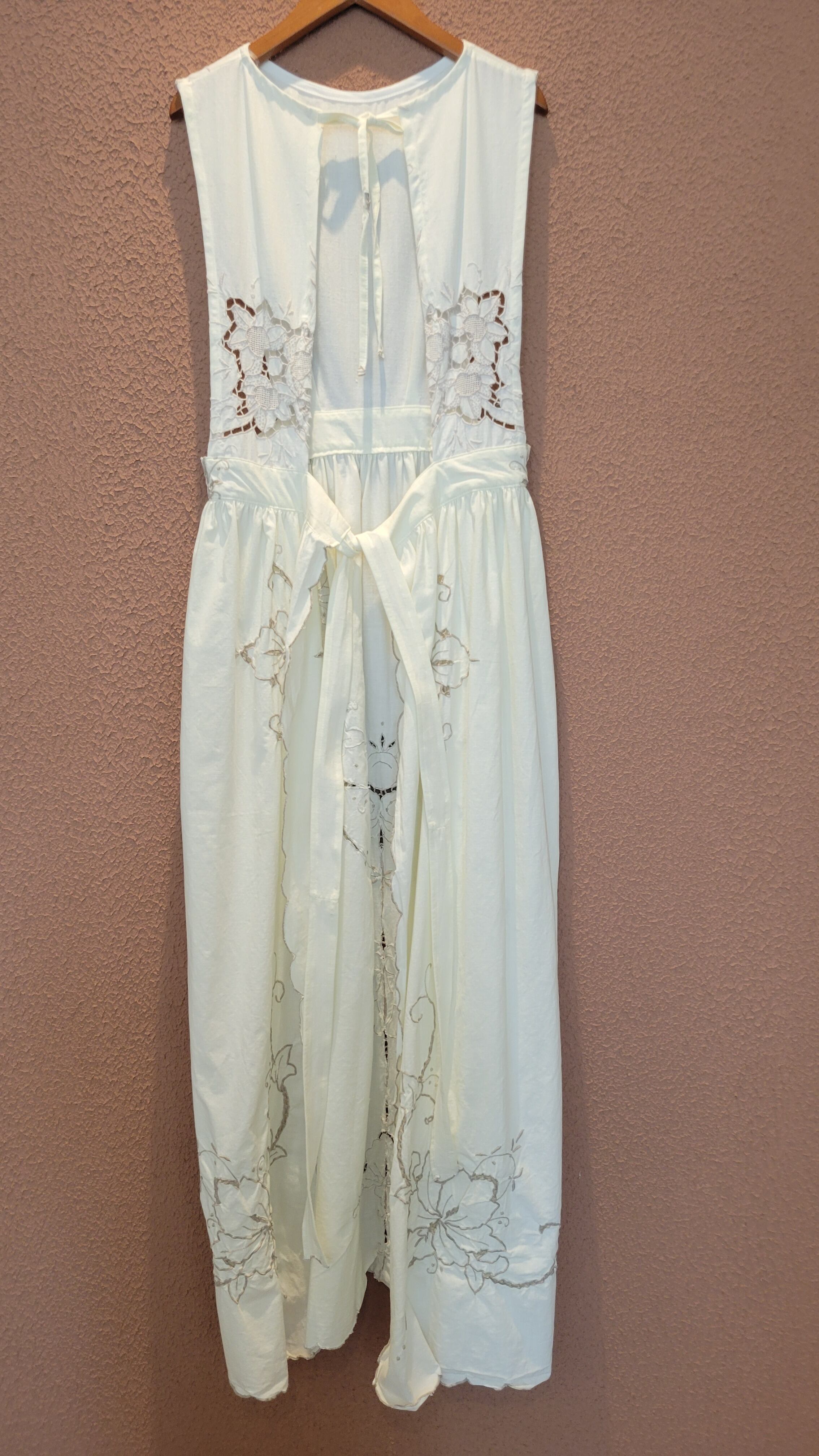 ヴィンテージのカットワーク刺繍クロスを使用したエプロンワンピース。素材表記はありませんがコットンのようです。首後ろとウエストにリボンが付いています。ウエストリボンはぐるっと巻いて前で結んでブラウジングすることができ、若干丈を調節できます。Tシャツ&デニムなど色々なスタイルにレイヤードしてスタイリングをお楽しみいただけます。