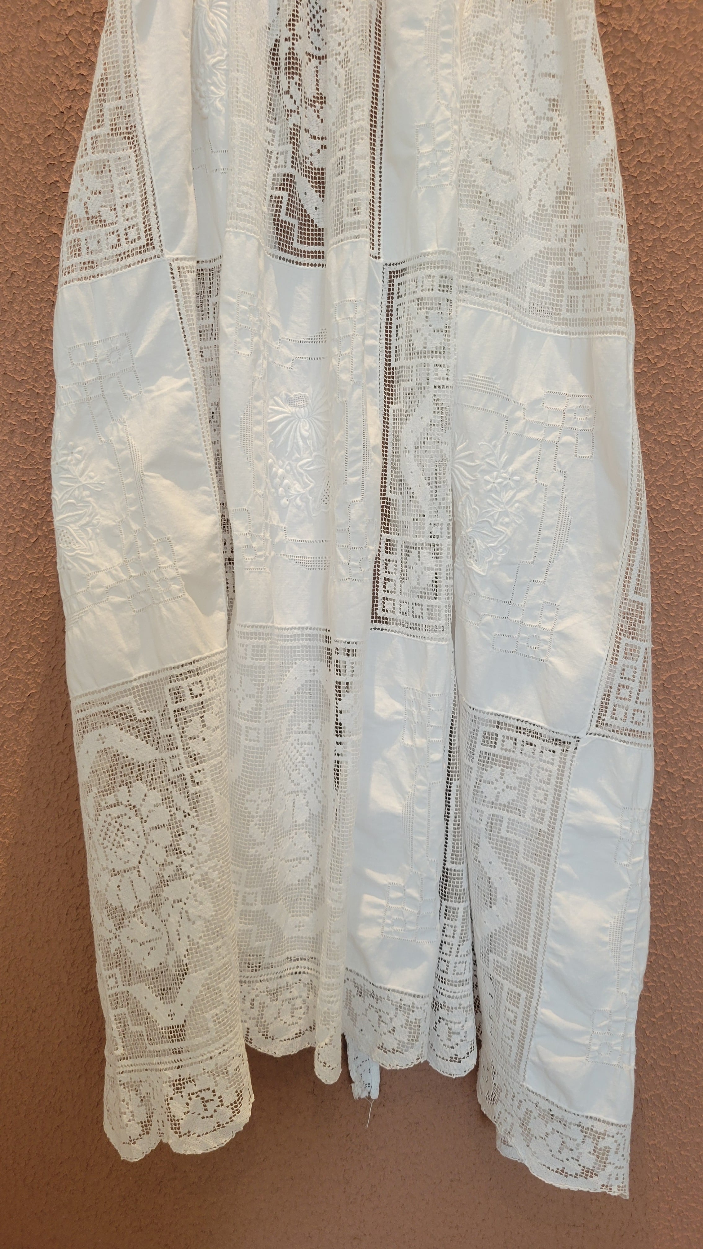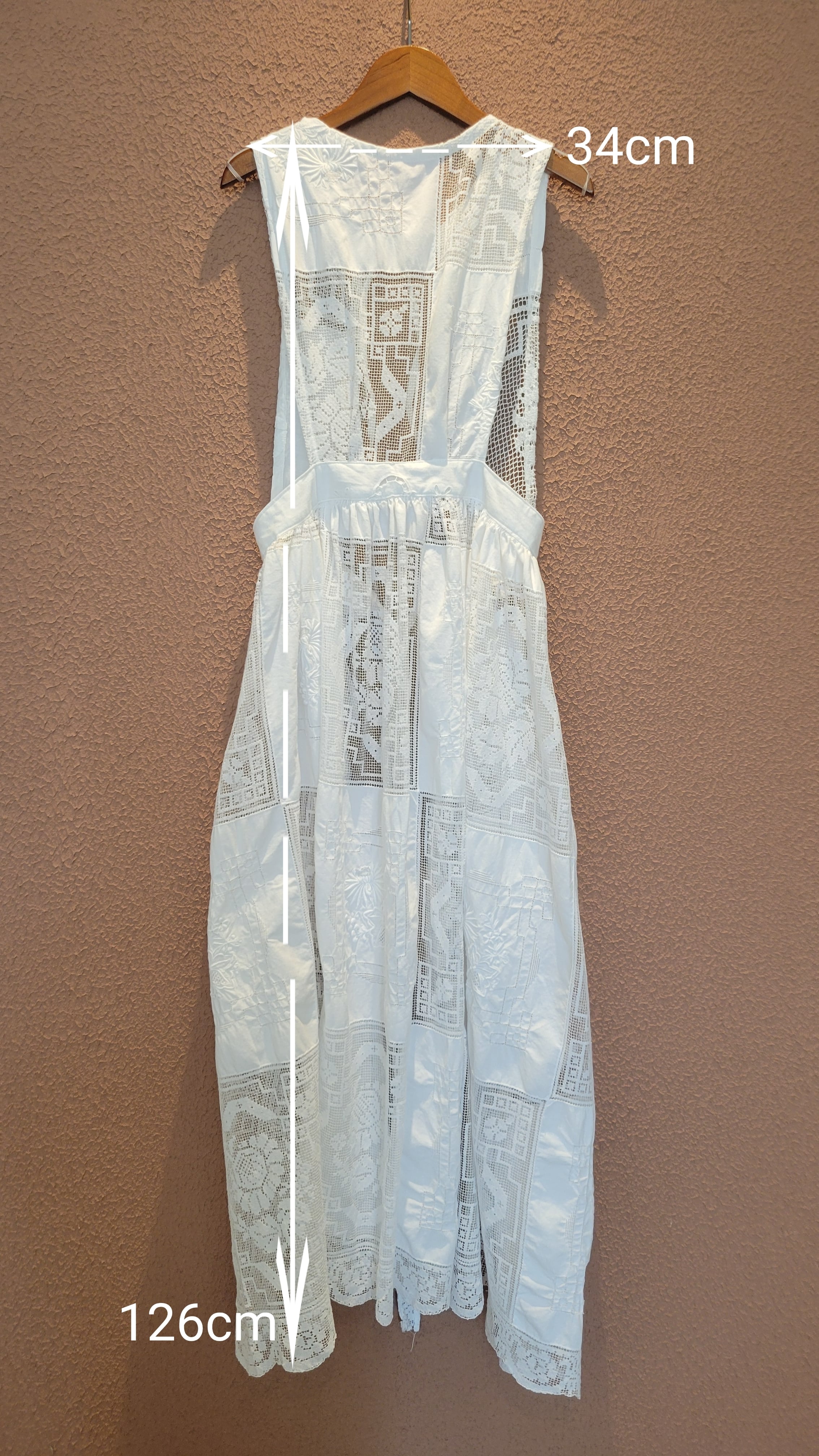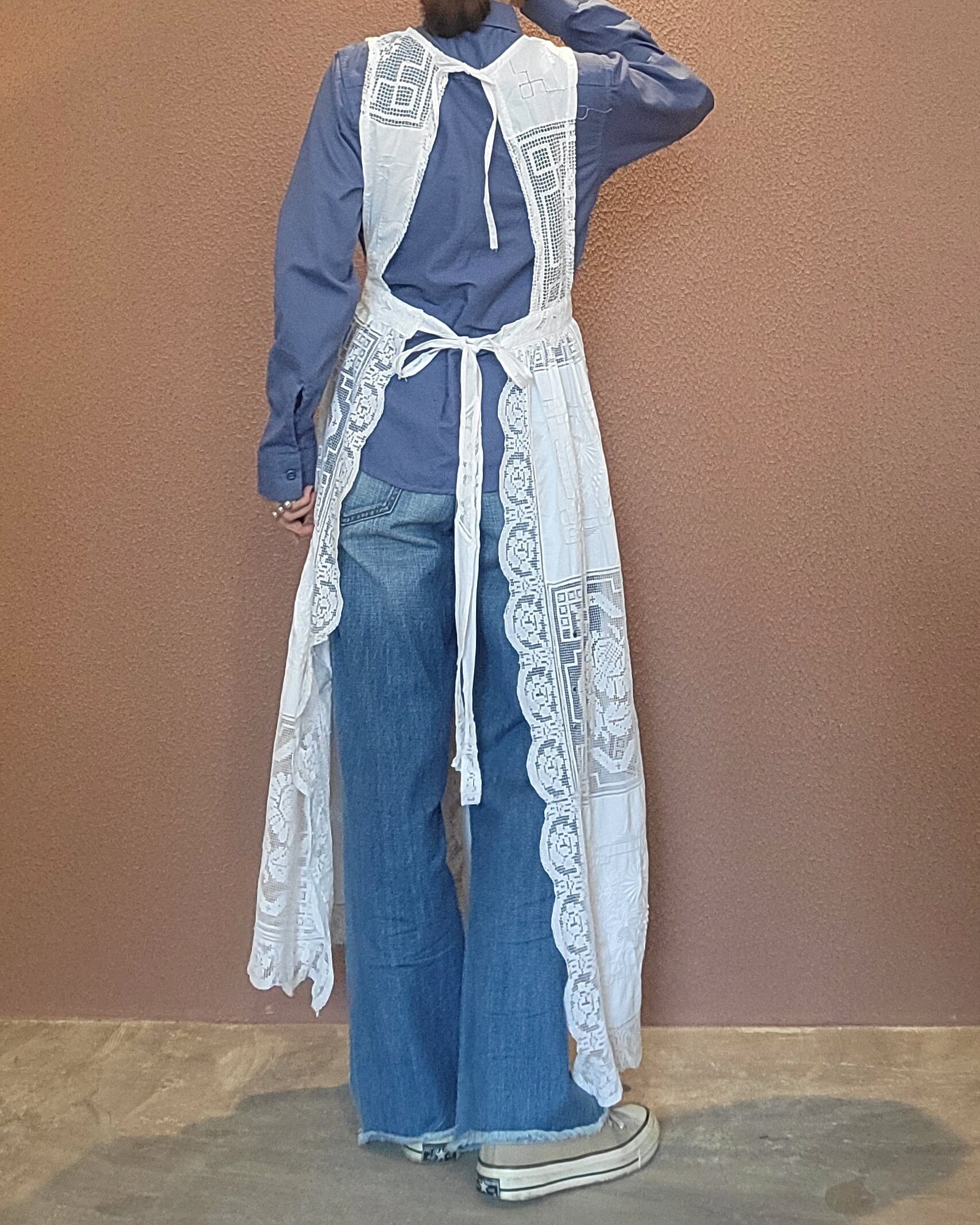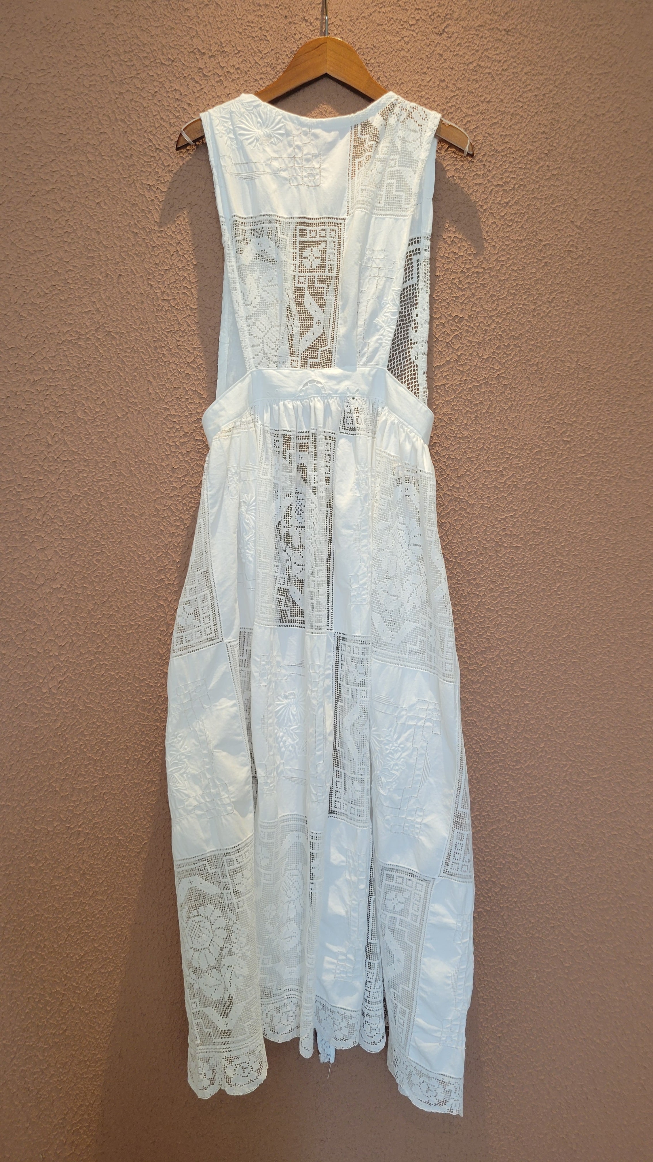 ヴィンテージのレース生地を使用したエプロンワンピース。素材表記はありませんがコットンのようです。首後ろとウエストにリボンが付いています。ウエストリボンはぐるっと巻いて前で結んでブラウジングすることができ、若干丈を調節できます。Tシャツ&デニムなど色々なスタイルにレイヤードしてスタイリングをお楽しみいただけます。