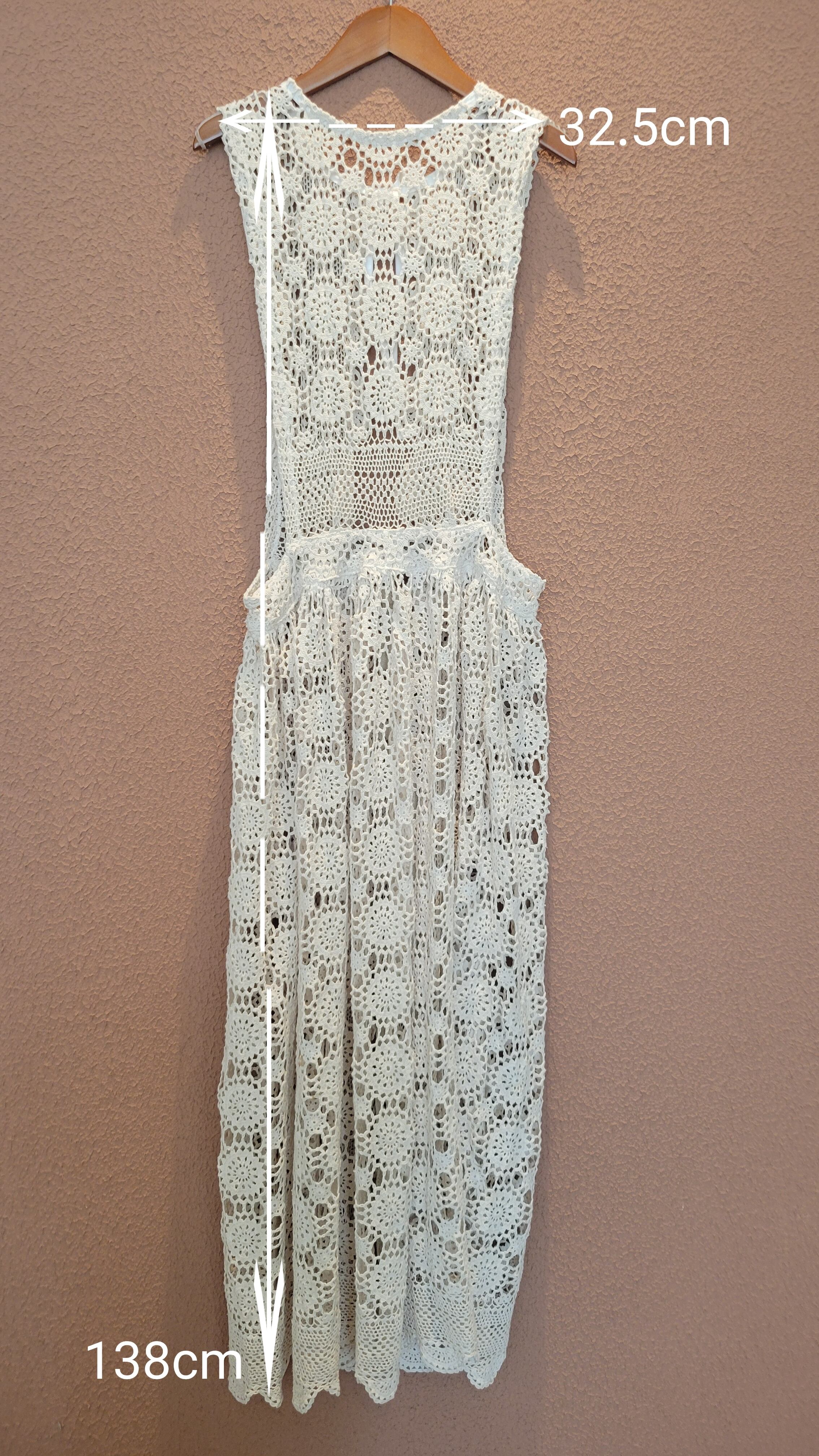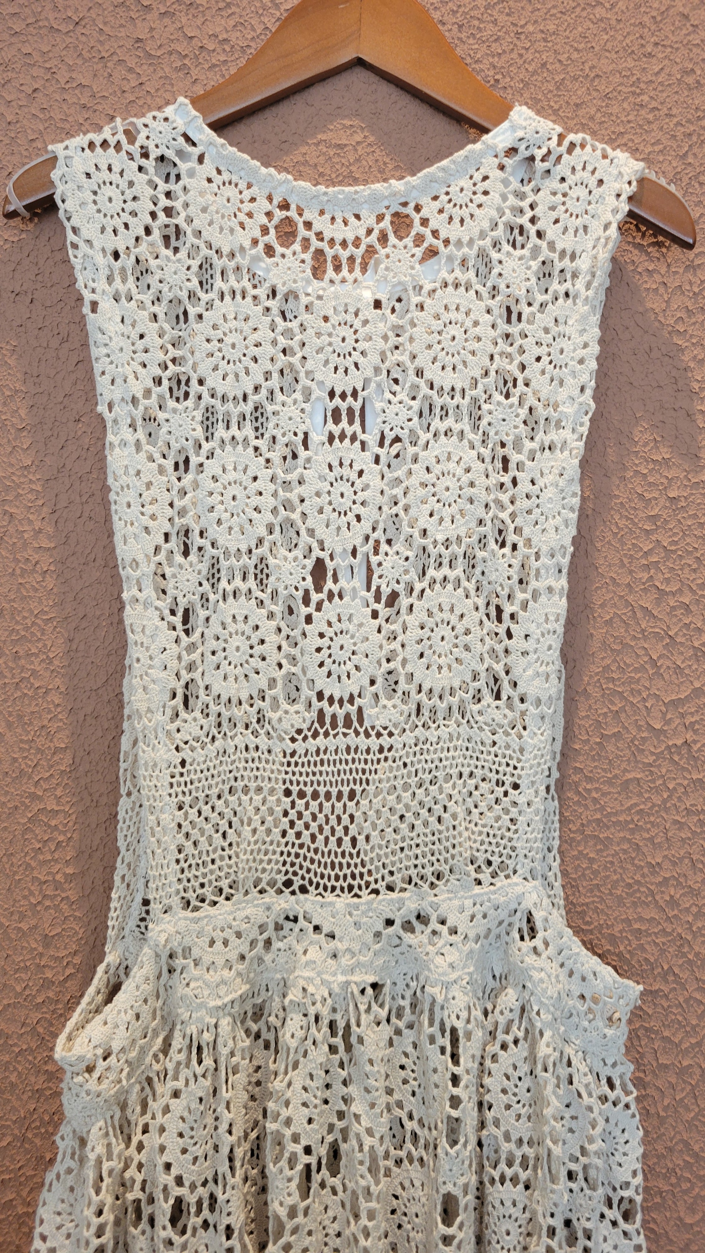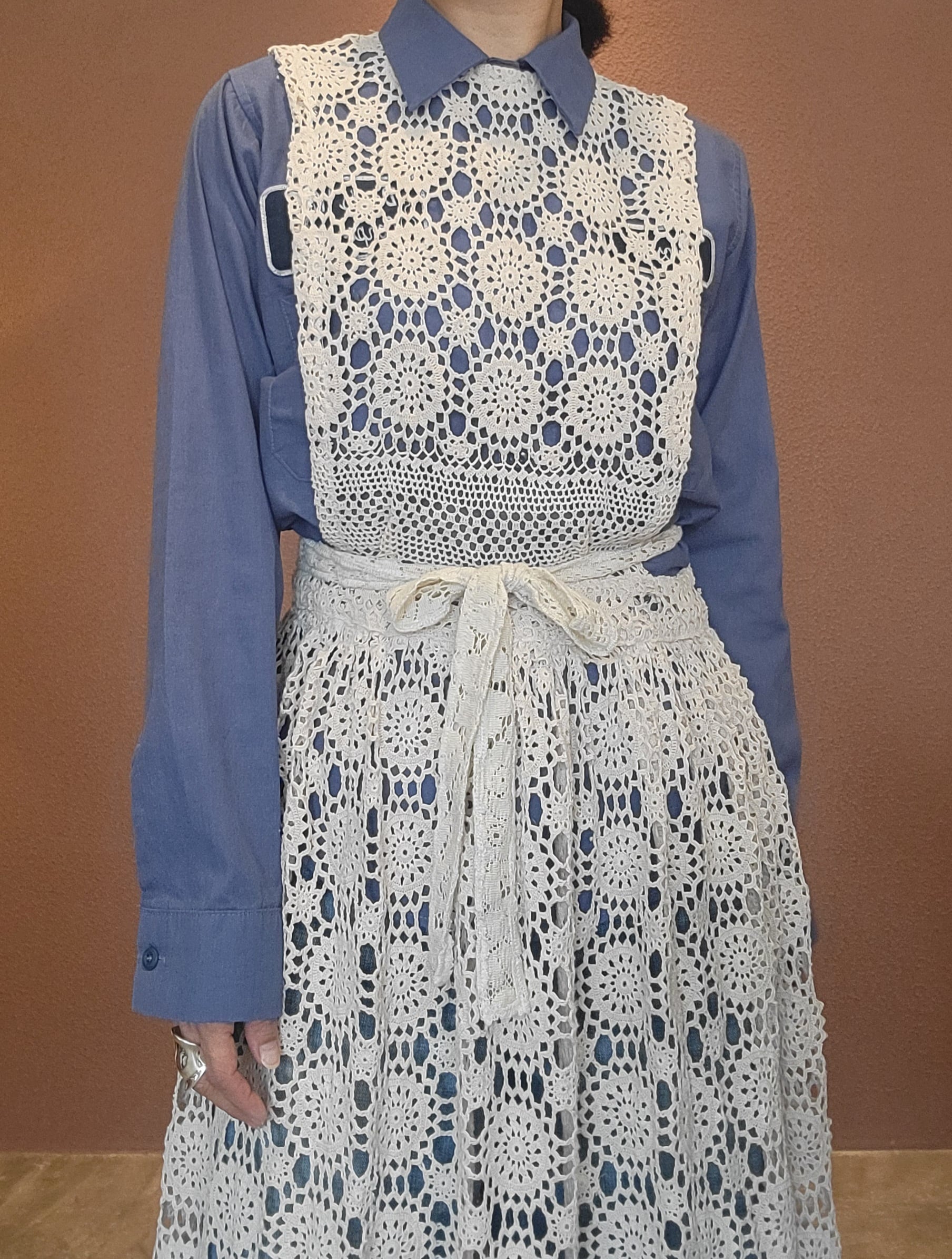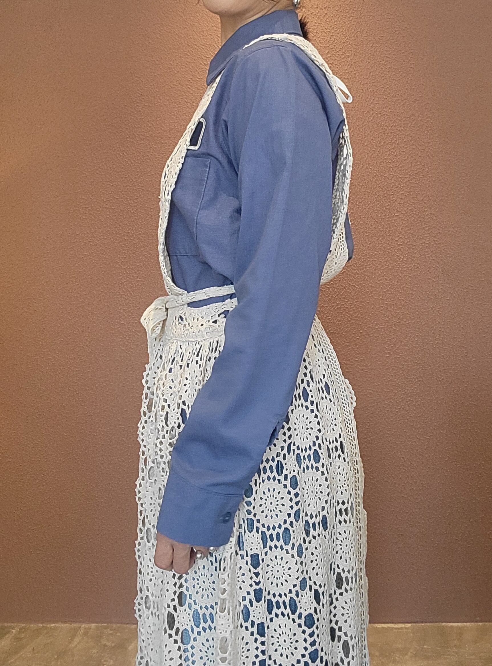 ヴィンテージのクロシェ生地を使用したエプロンワンピース。素材表記はありませんがコットンのようです。首後ろとウエストにリボンが付いています。ウエストリボンはぐるっと巻いて前で結んでブラウジングすることができ、若干丈を調節できます。Tシャツ&デニムなど色々なスタイルにレイヤードしてスタイリングをお楽しみいただけます。
