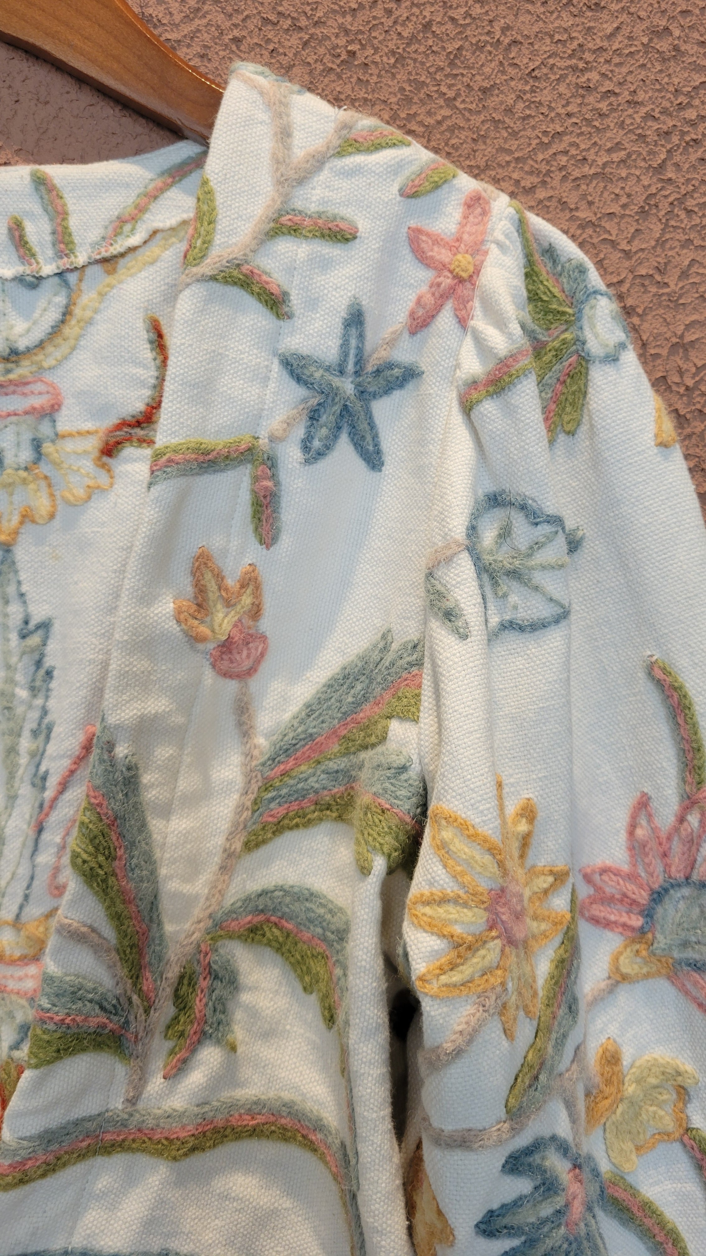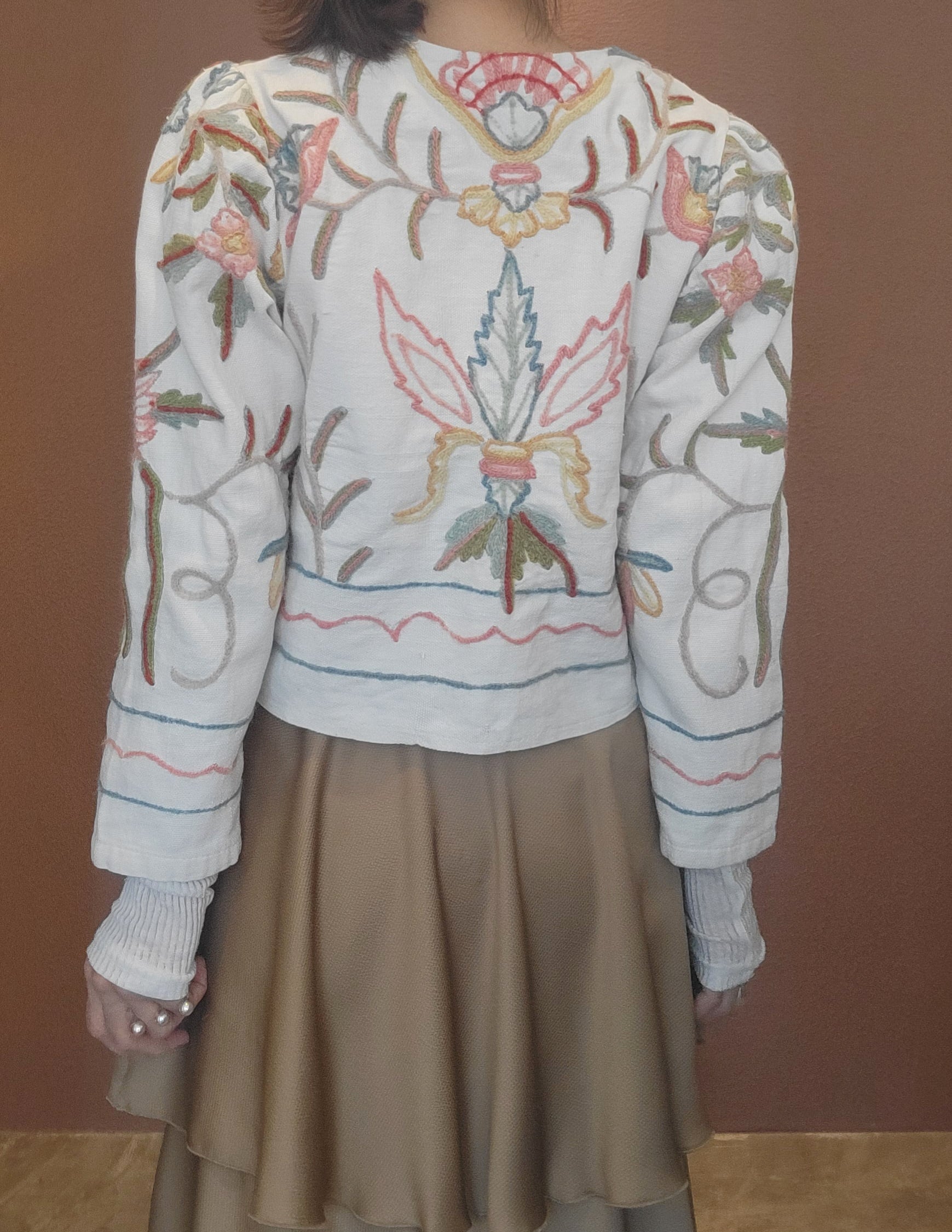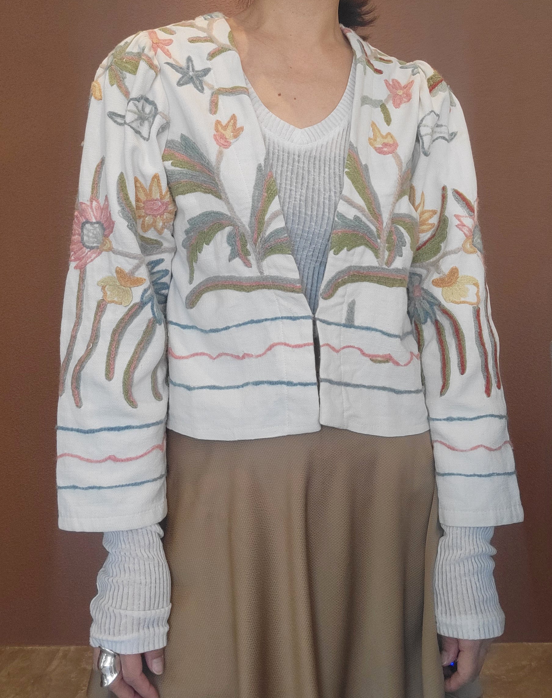 Usedの刺繍クロスを使用したリメイクジャケット。素材表記はありませんがジャケット本体はコットンのようです。刺繍部分は毛羽立ったような起毛した糸です。肩に控えめなギャザーが入っています。フロントにホックがひとつ付いています。優しい色合いの立体感のある刺繍が存在感のある1枚。