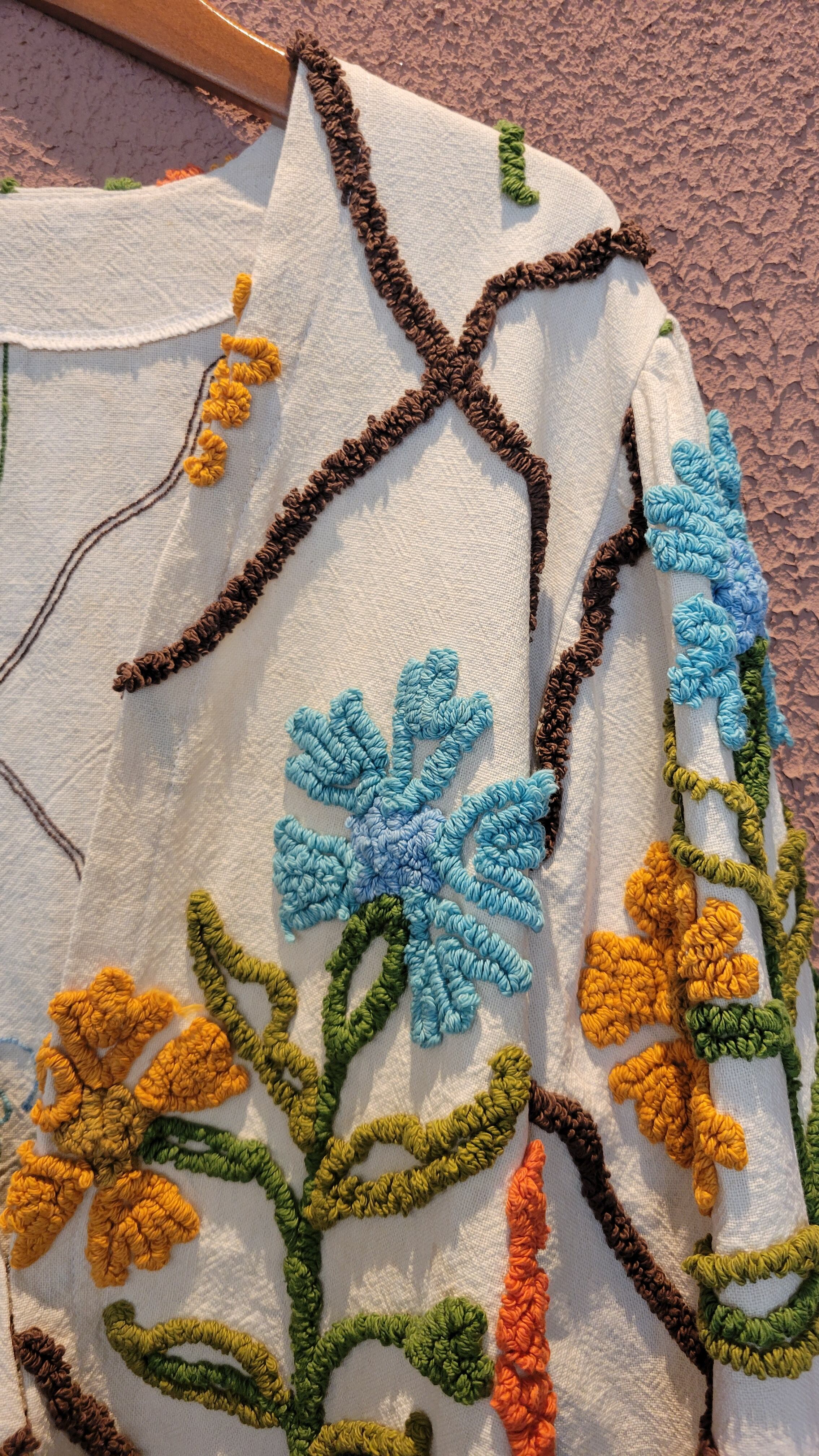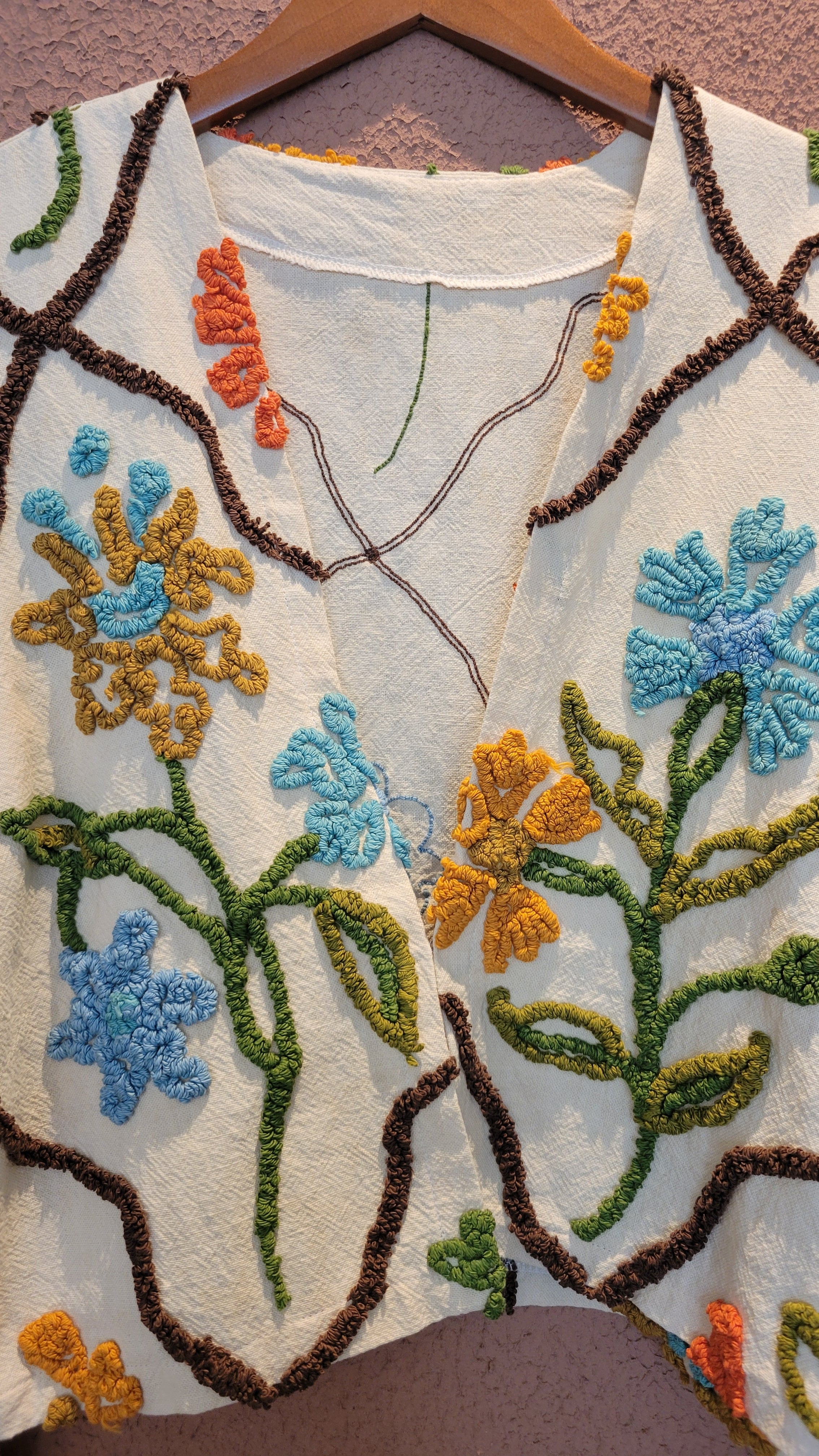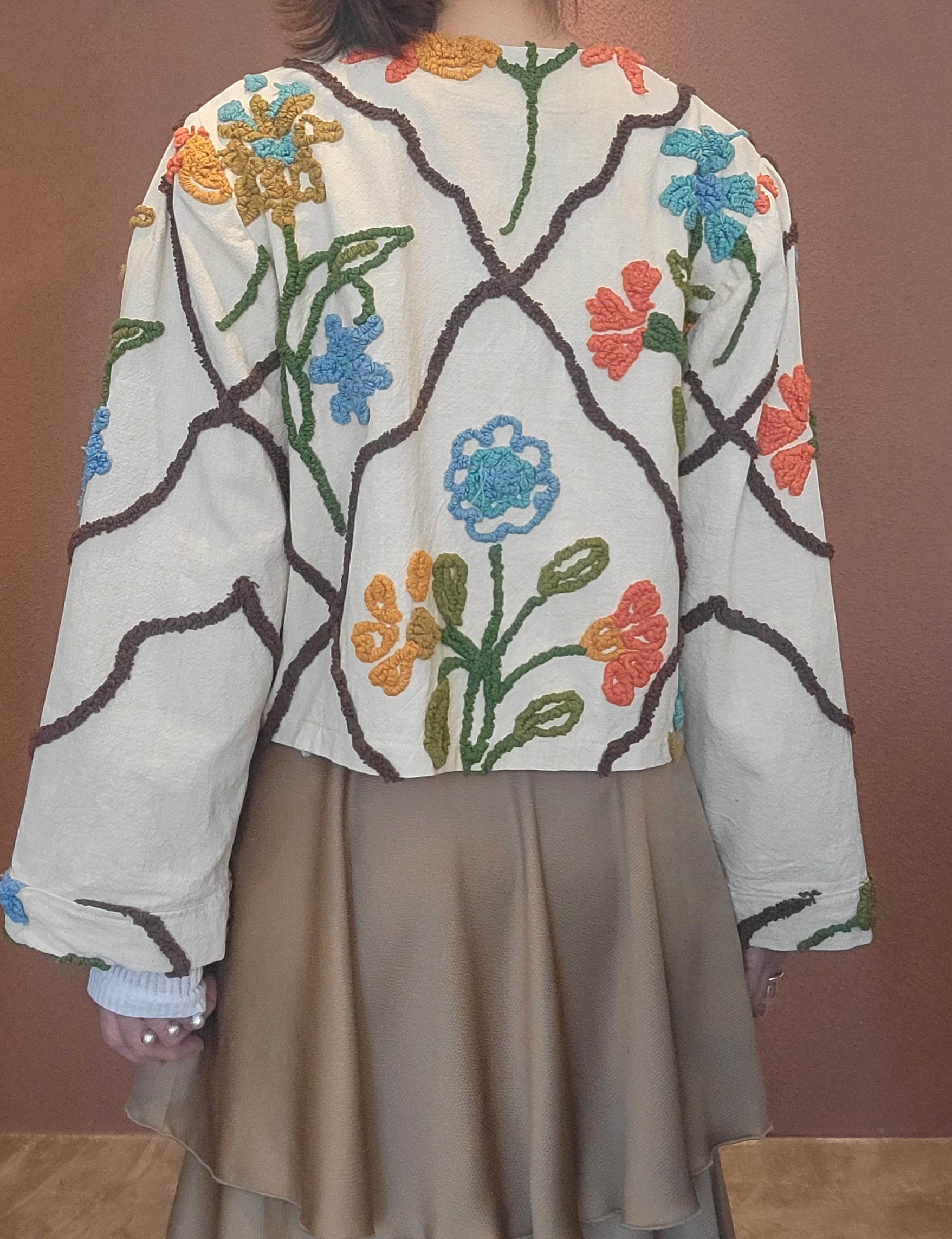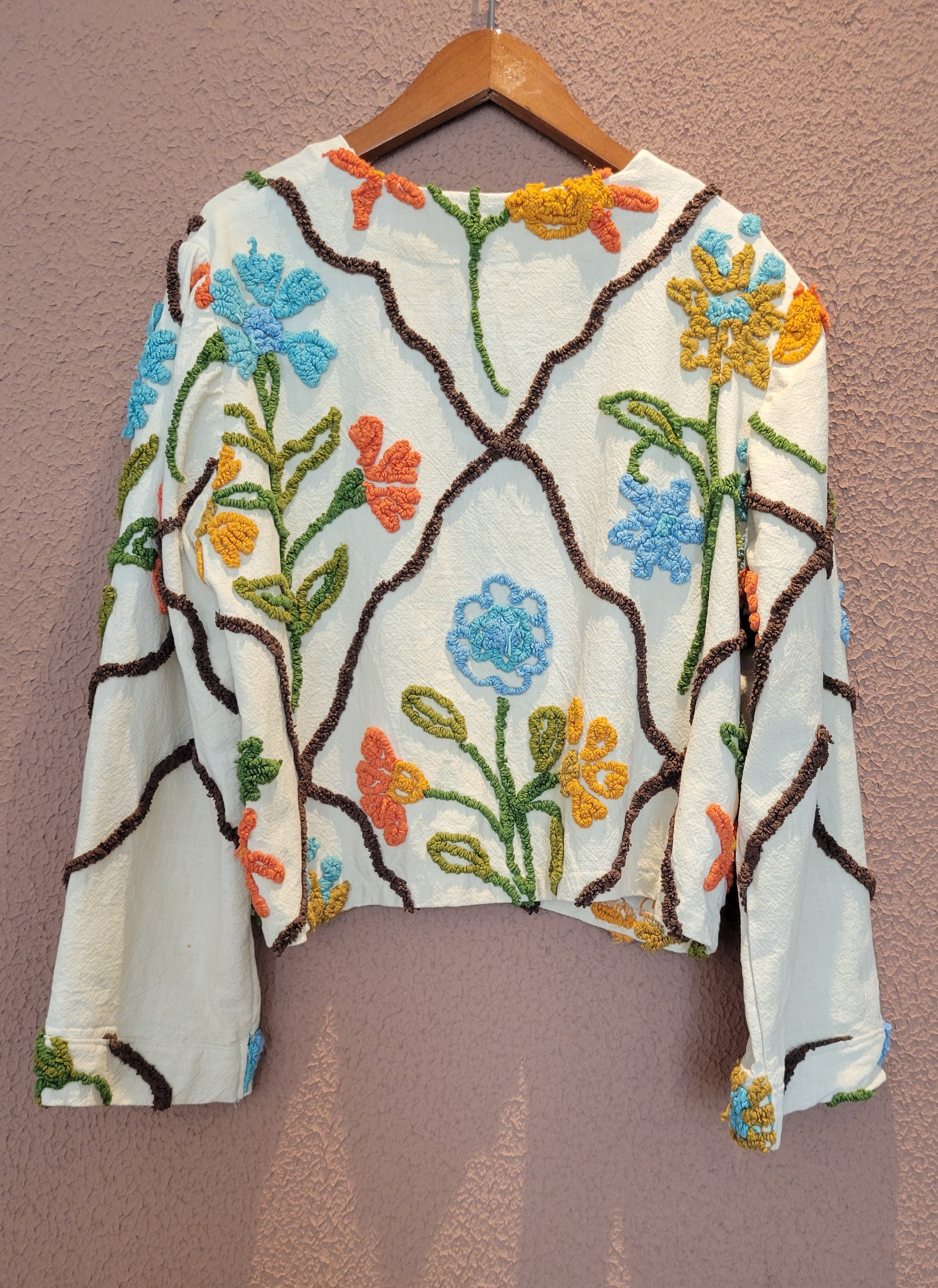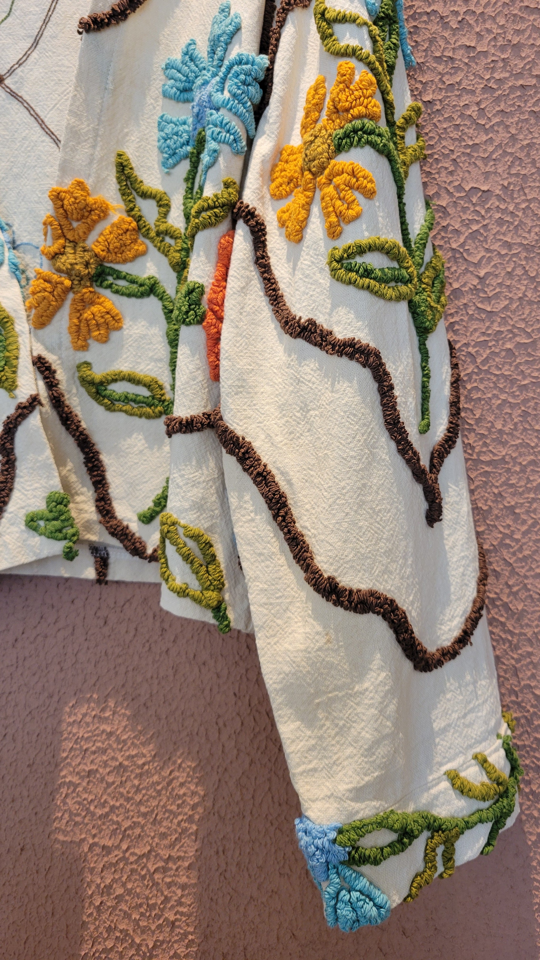 ヴィンテージの刺繍クロスを使用したリメイクジャケット。素材表記はありませんがコットンのようです。肩に控えめなギャザー入り。フロントにホックがひとつ付いています。立体感のあるループステッチと風合いを感じる素材はヴィンテージならでは。