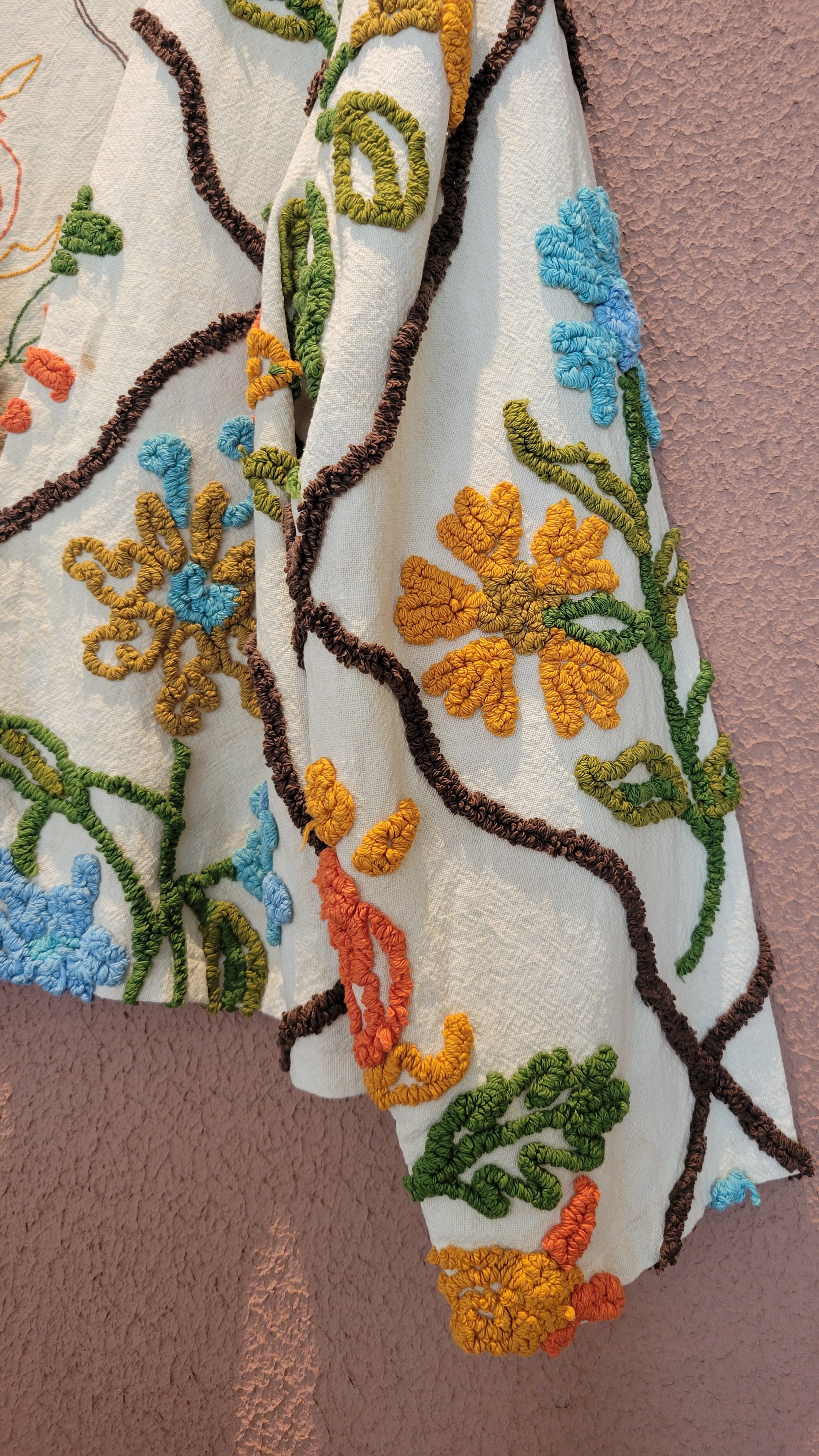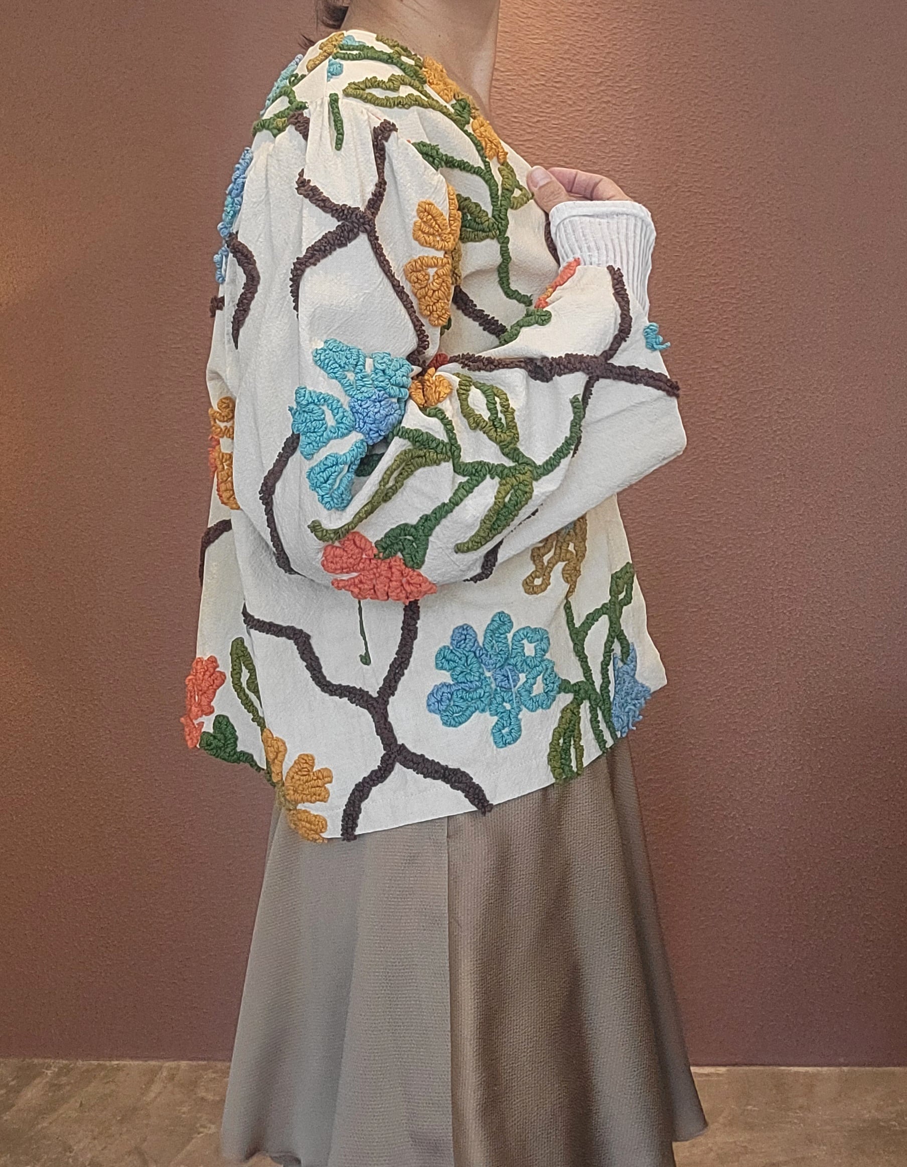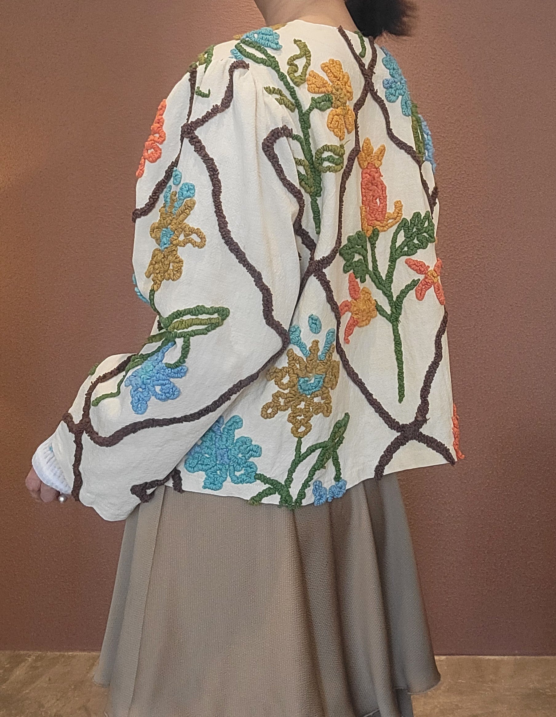 ヴィンテージの刺繍クロスを使用したリメイクジャケット。素材表記はありませんがコットンのようです。肩に控えめなギャザー入り。フロントにホックがひとつ付いています。立体感のあるループステッチと風合いを感じる素材はヴィンテージならでは。