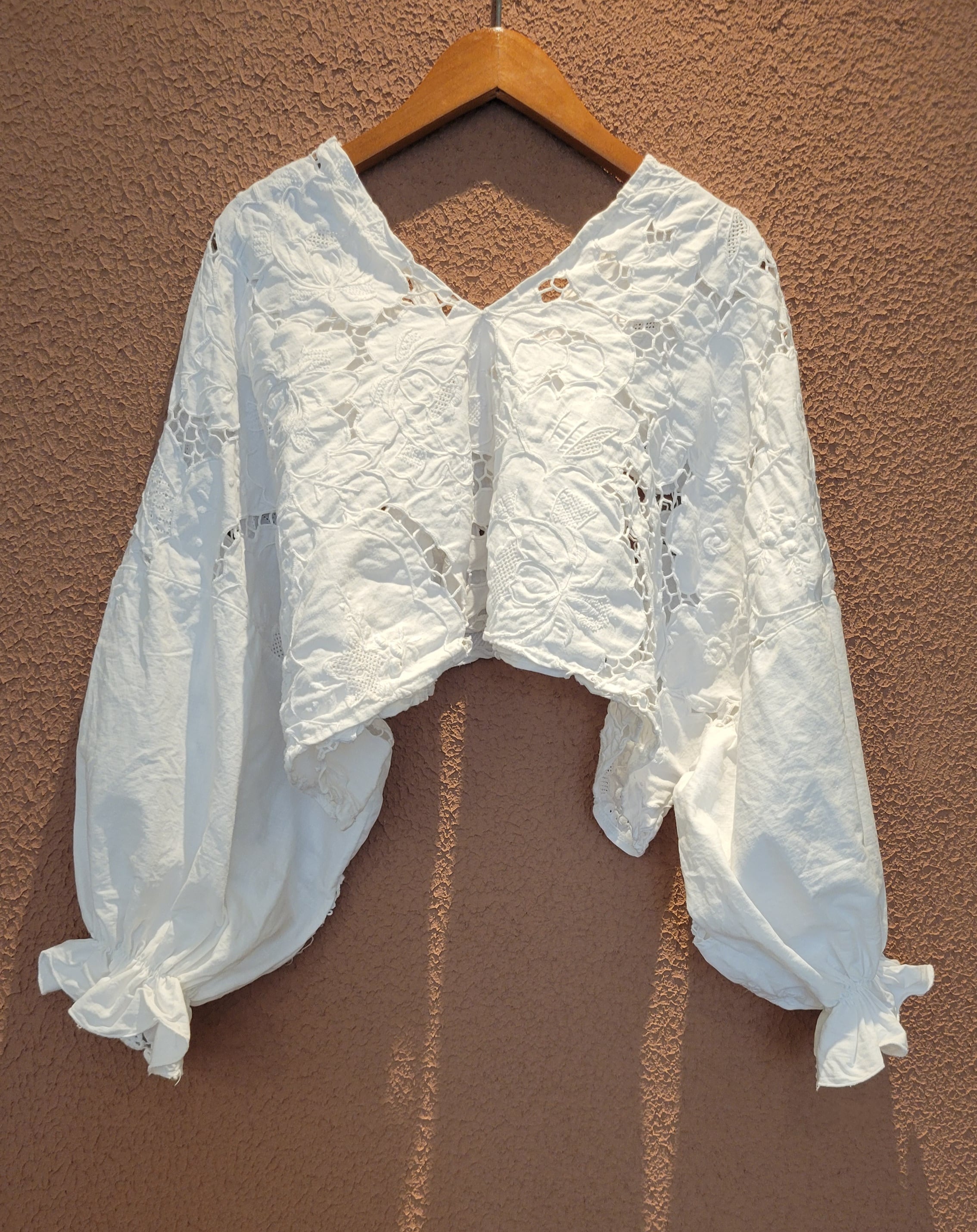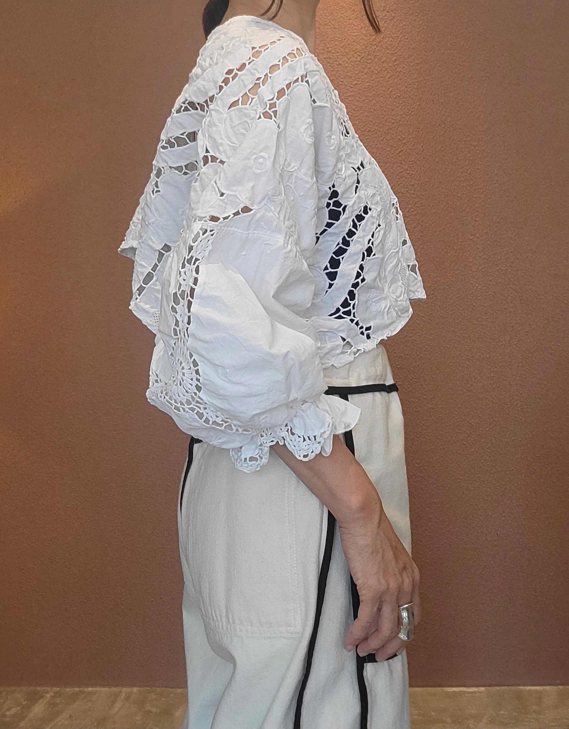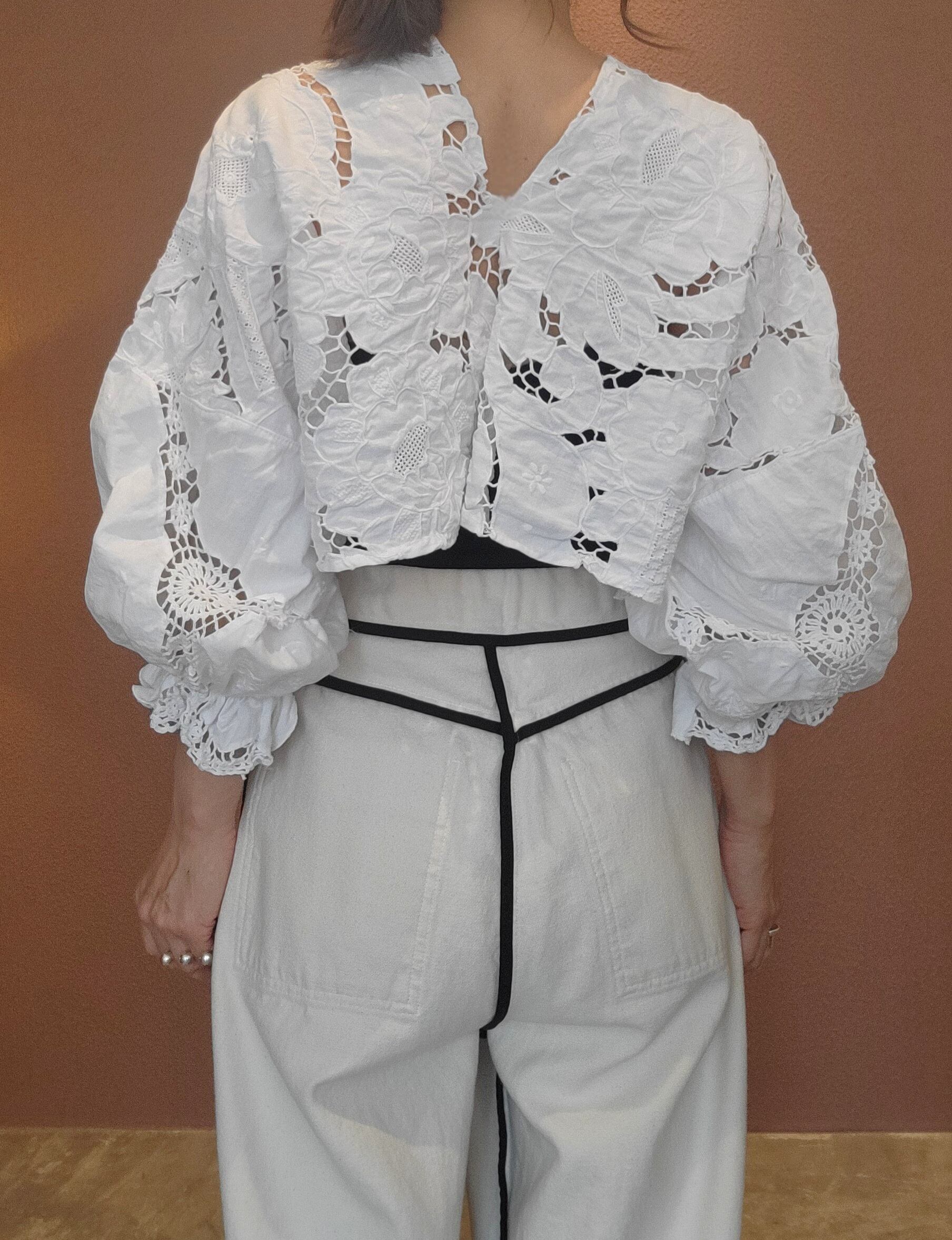 ヴィンテージのカットワーク刺繍クロスを使用したプルオーバートップス。素材表記はありませんがコットンのようです。前後どちらでも着用可能です。袖口ゴムのボリュームスリーブです。レースが透けるためインナーの着用が必要です。ハイウエストボトムやオーバーオールのインナーにも良く合います。