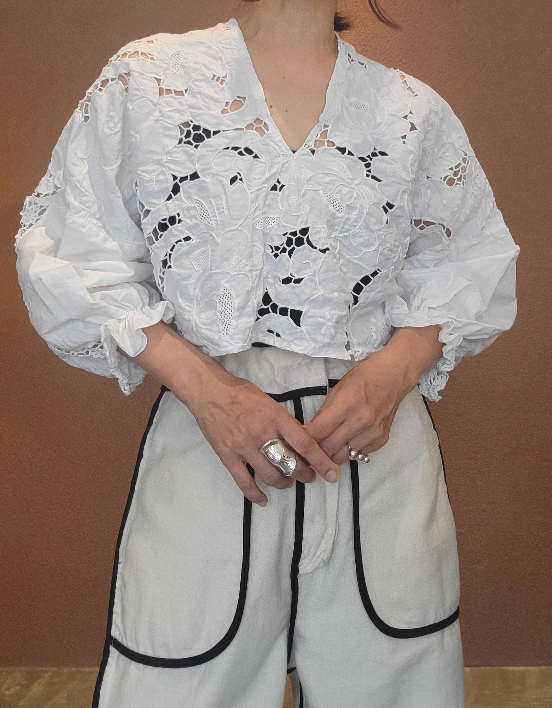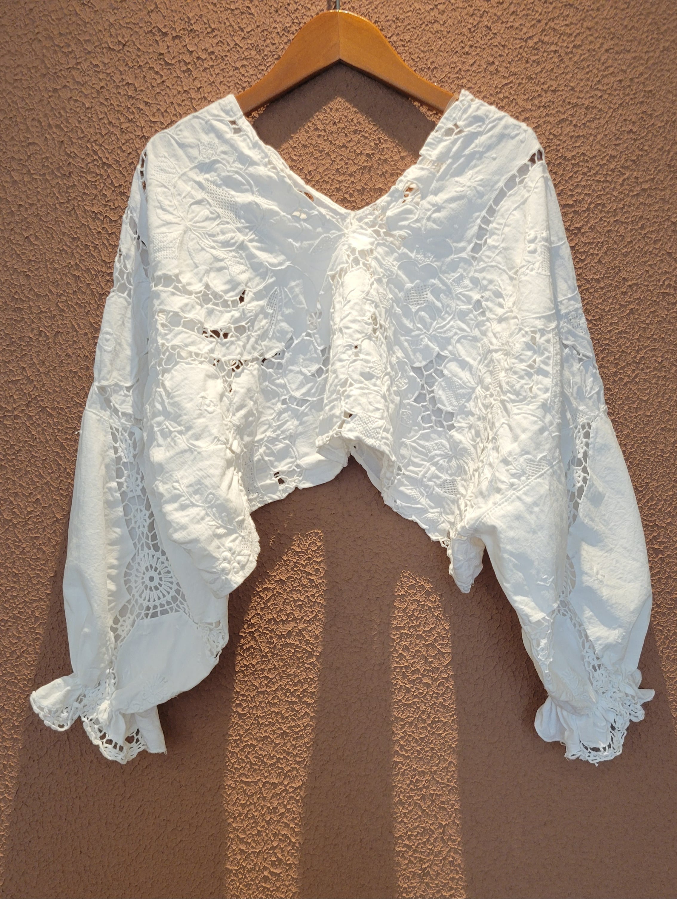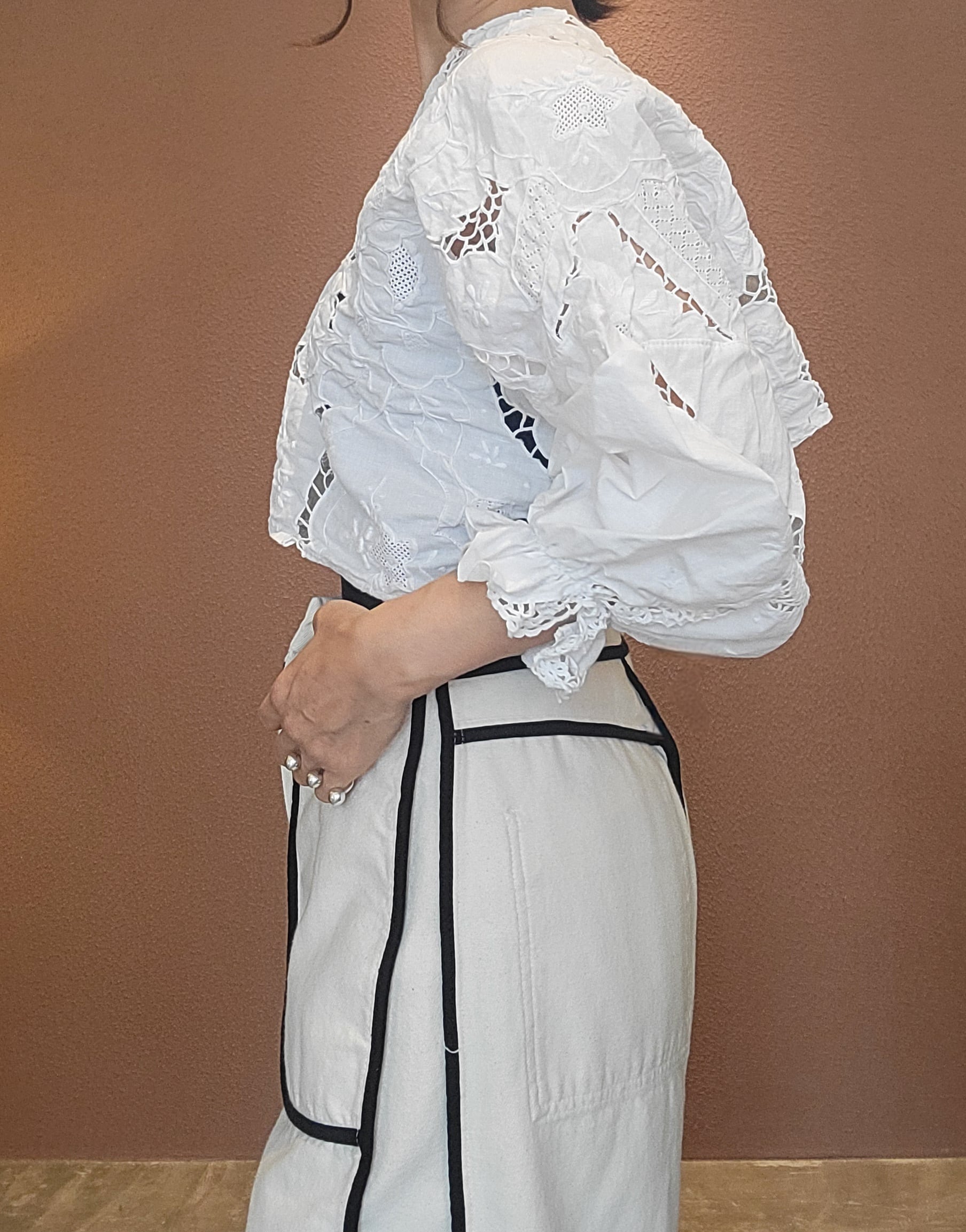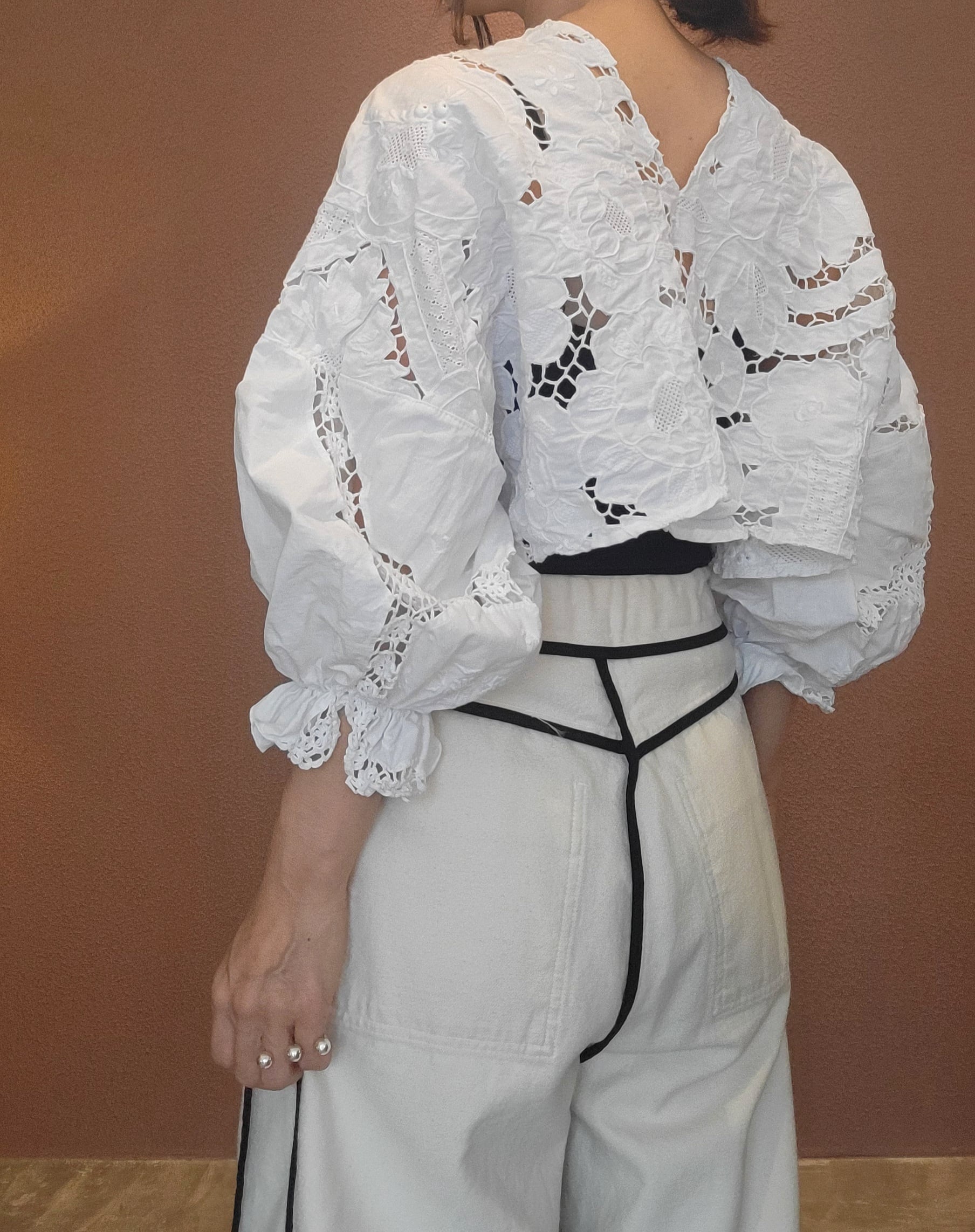 ヴィンテージのカットワーク刺繍クロスを使用したプルオーバートップス。素材表記はありませんがコットンのようです。前後どちらでも着用可能です。袖口ゴムのボリュームスリーブです。レースが透けるためインナーの着用が必要です。ハイウエストボトムやオーバーオールのインナーにも良く合います。