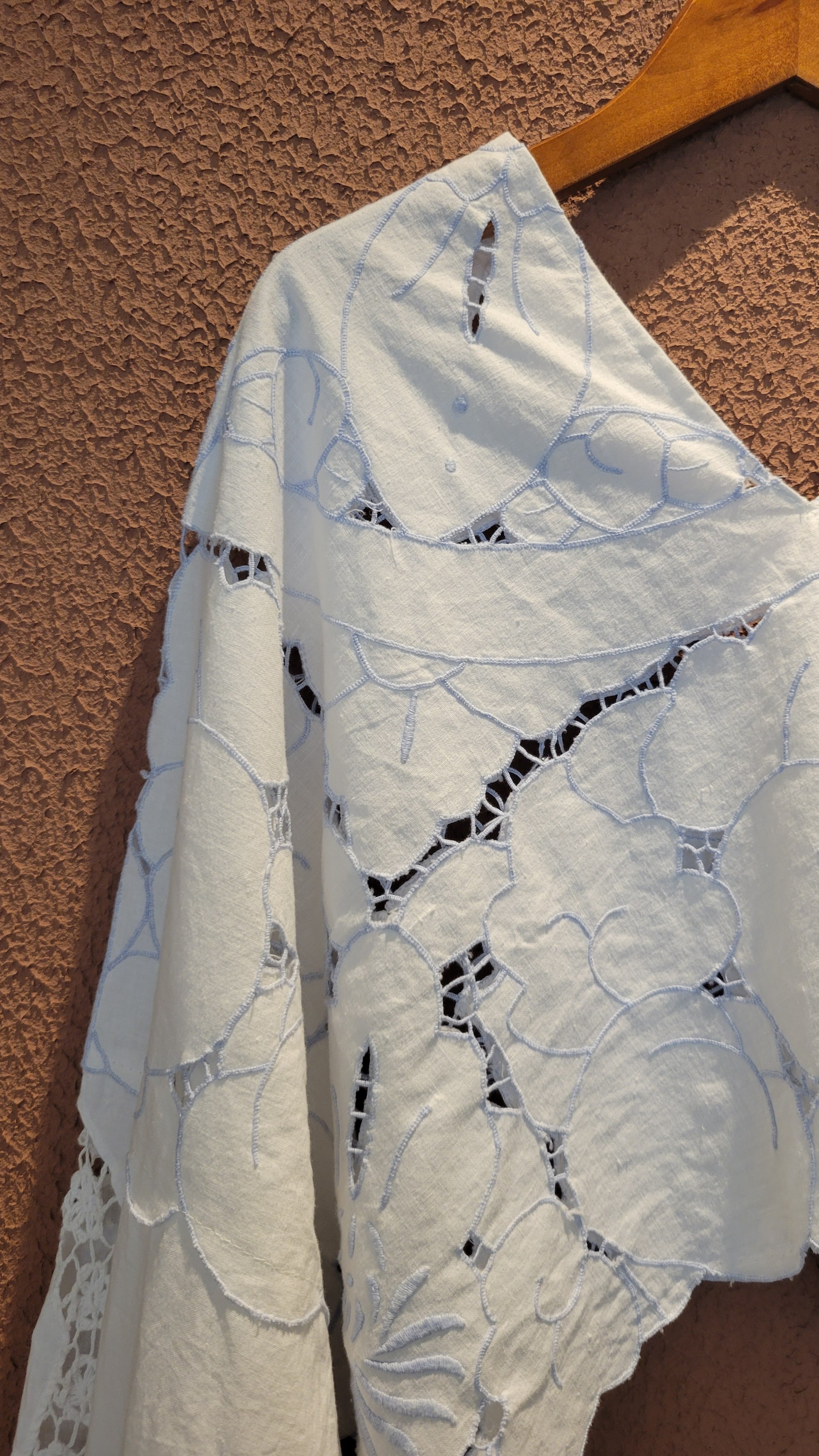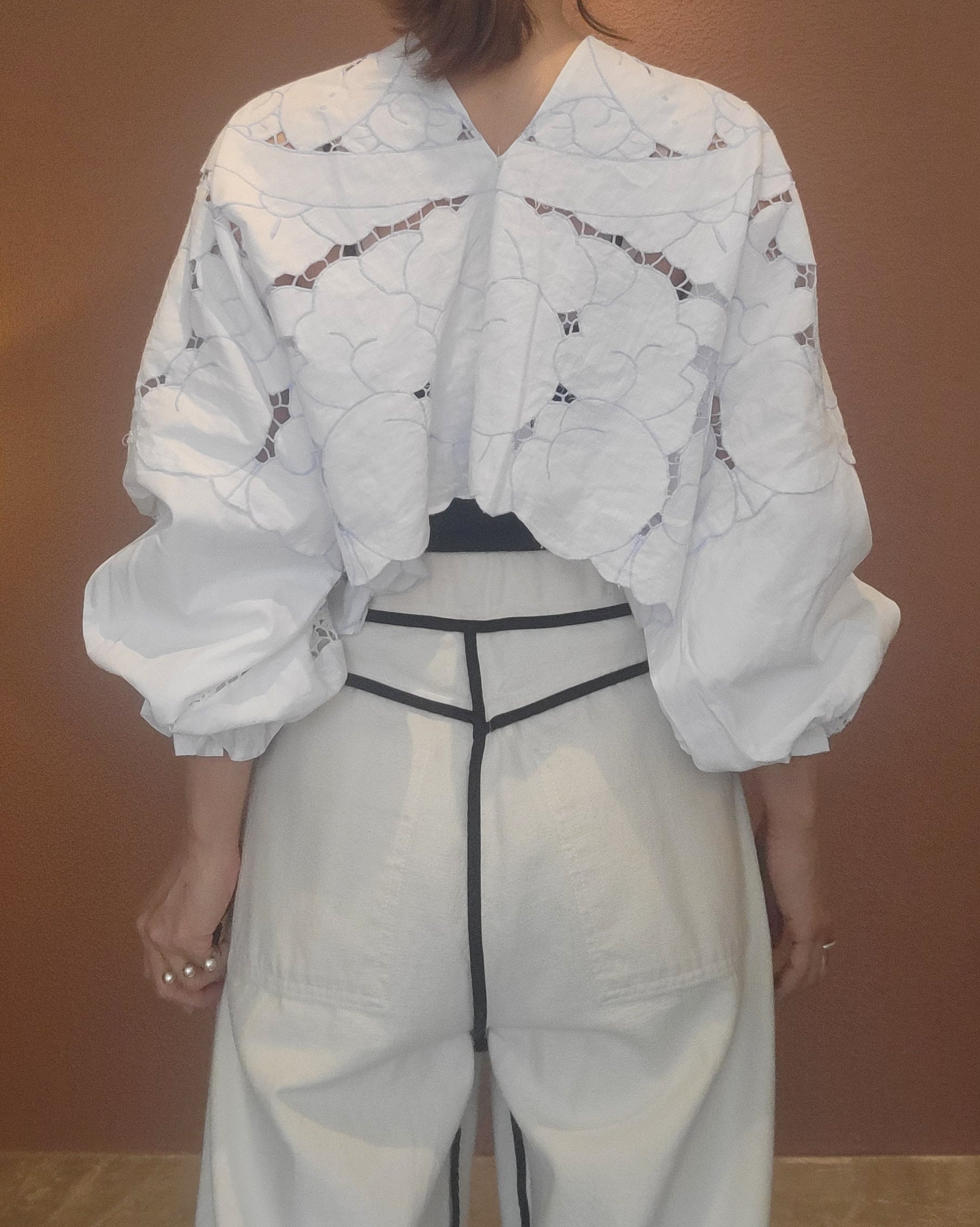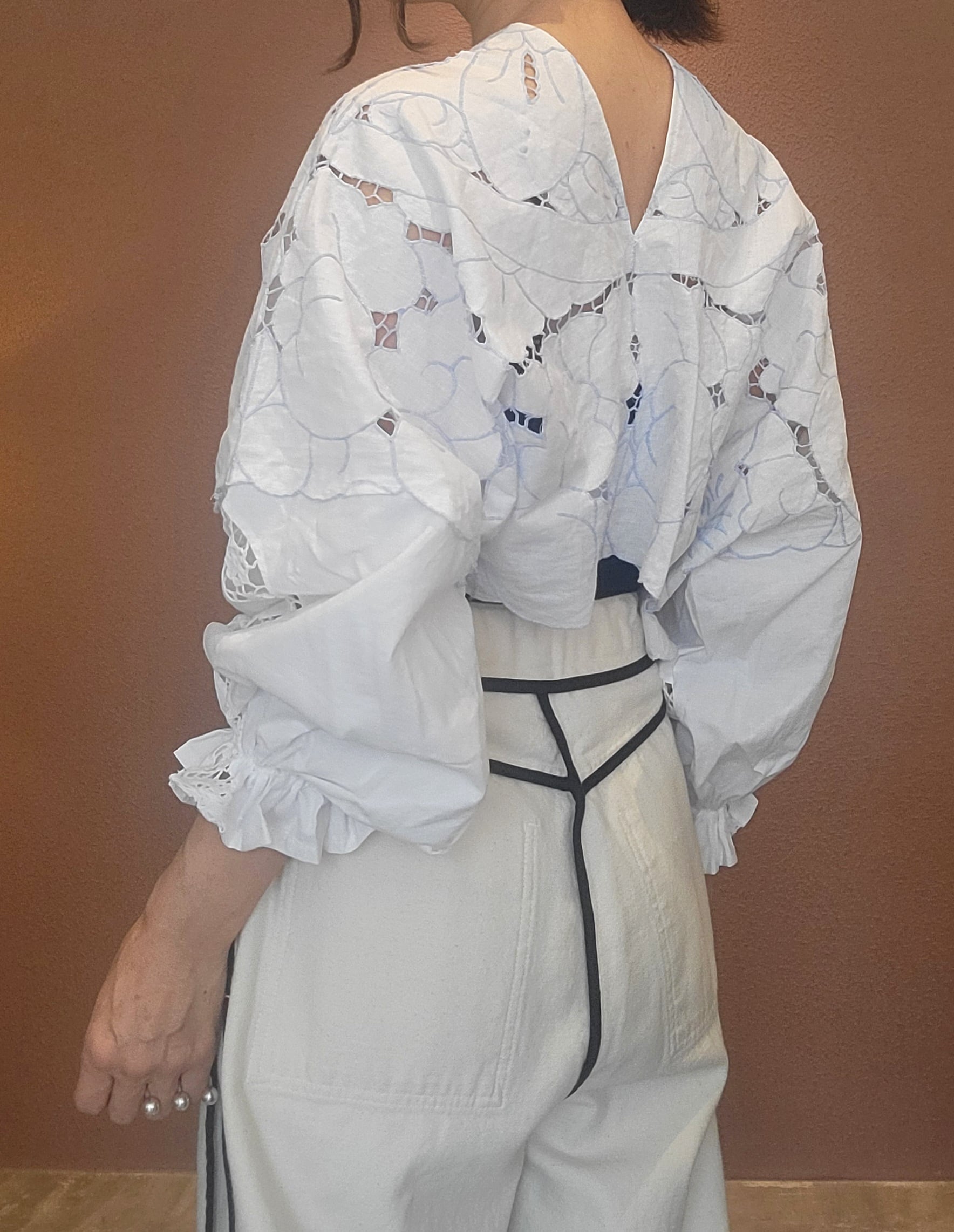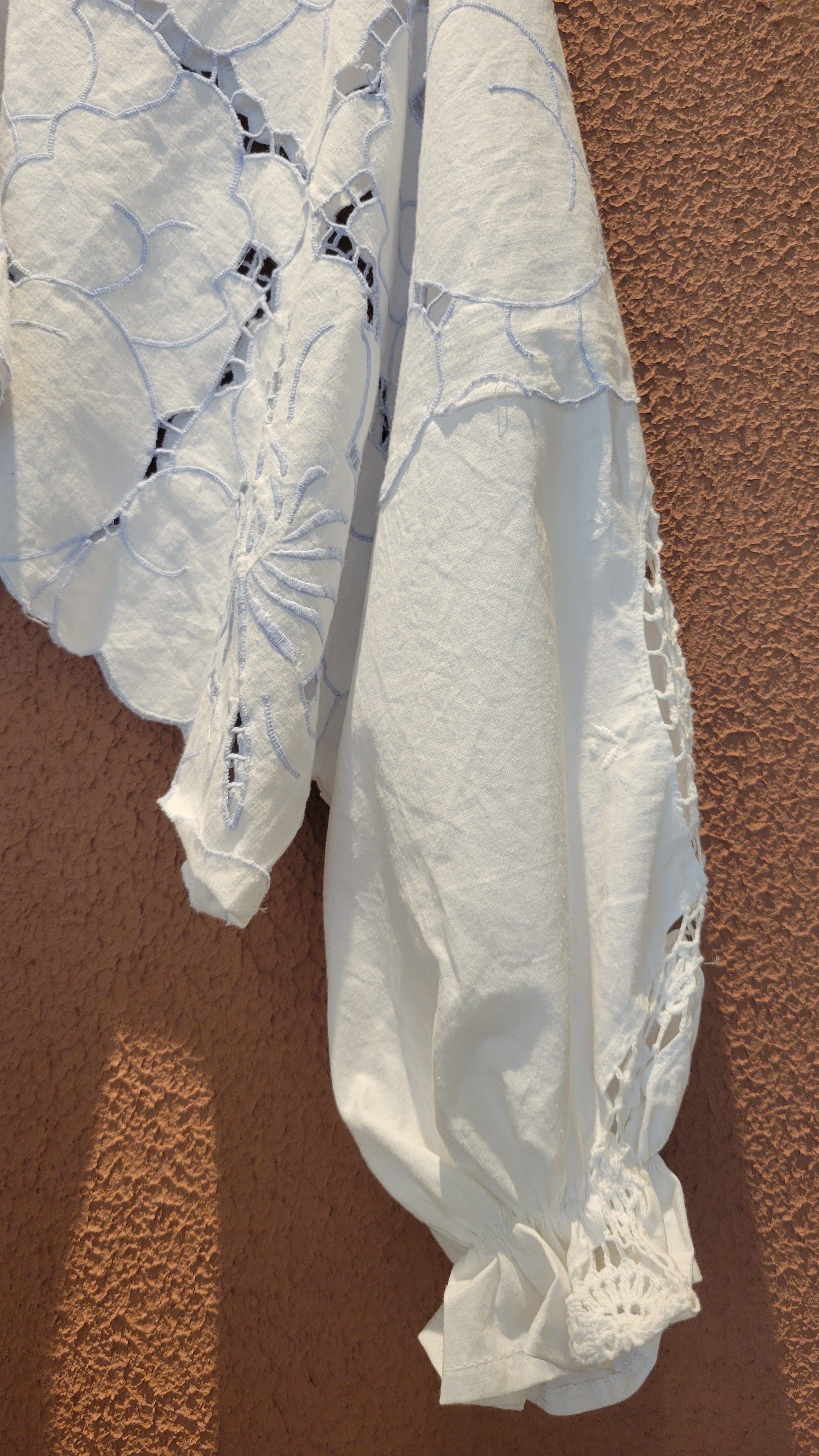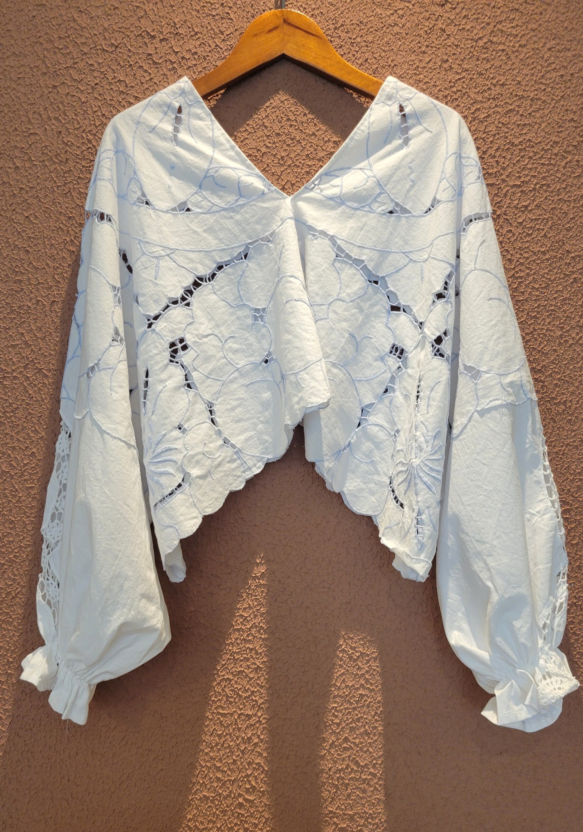 ヴィンテージのカットワーク刺繍クロスを使用したプルオーバートップス。素材表記はありませんがコットンのようです。画像では伝わりにくいですが刺繍糸の色は薄いブルーになります。前後どちらでも着用可能。袖口ゴムのボリュームスリーブです。レースが透けるためインナーの着用が必要です。ハイウエストボトムやオーバーオールのインナーにも良く合います。