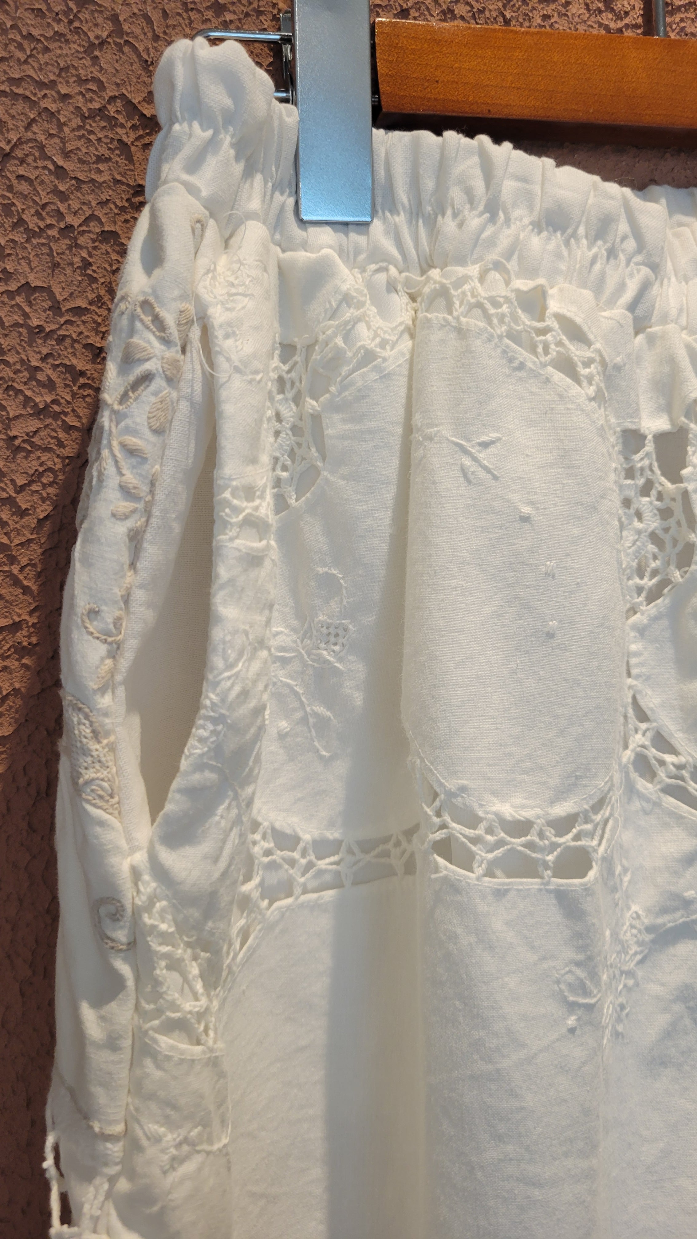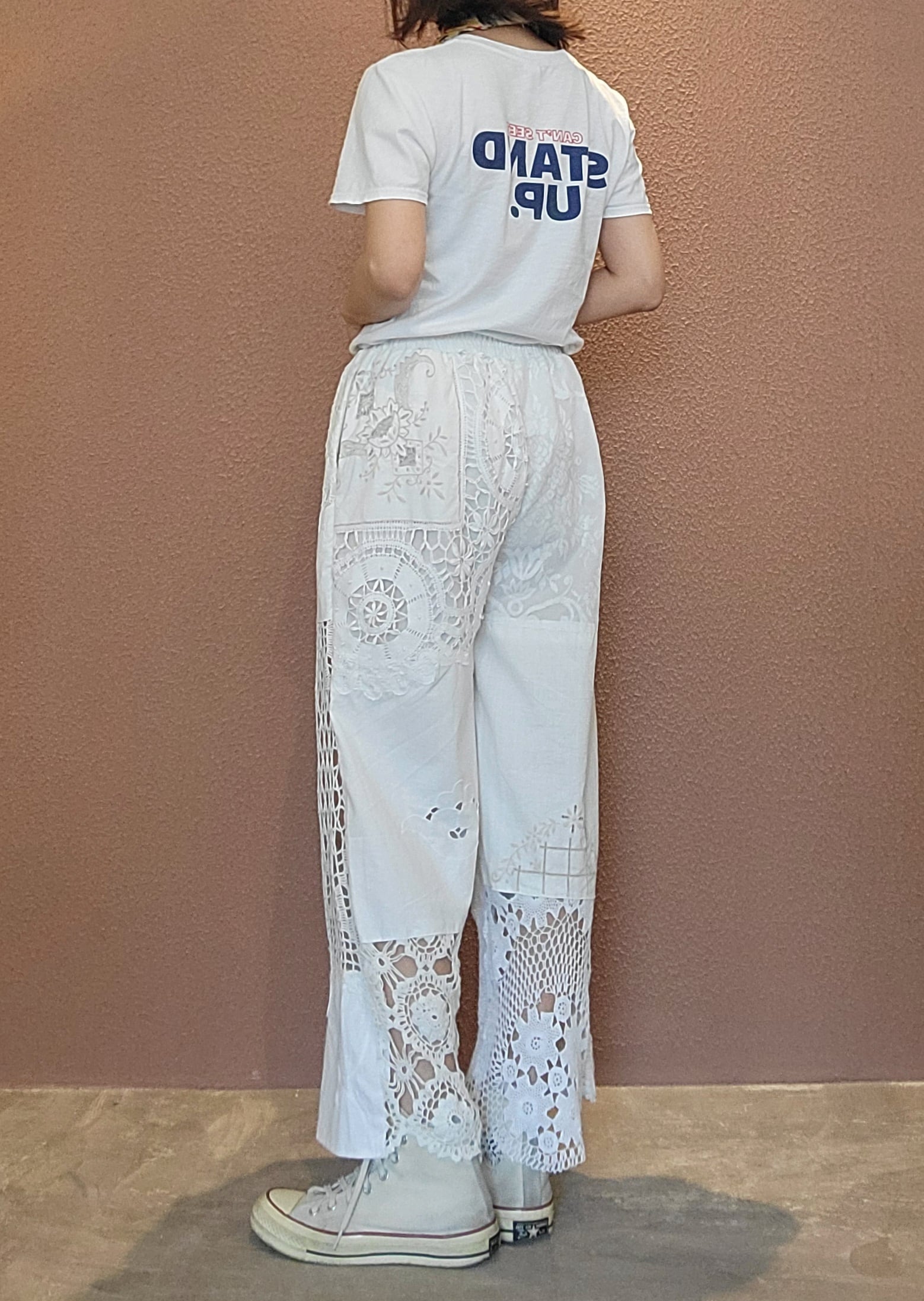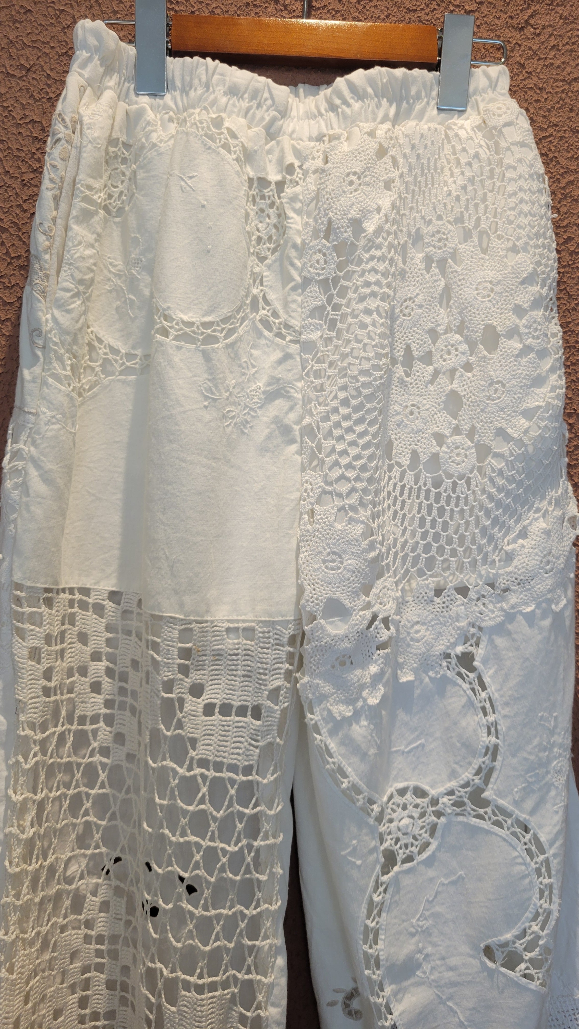 ヴィンテージレースやクロシェの布片を繋ぎ合わせて仕立てたリメイクパンツ。素材はレースのパーツにより異なりコットンや一部ポリエステル混になります。ウエストゴム、左右ポケット、ハーフ丈のライナー付きです。着脱がスムーズ、はき心地も楽なイージーパンツ。1本のパンツに異なる種類のレースがいくつも使用され表情豊かです。
