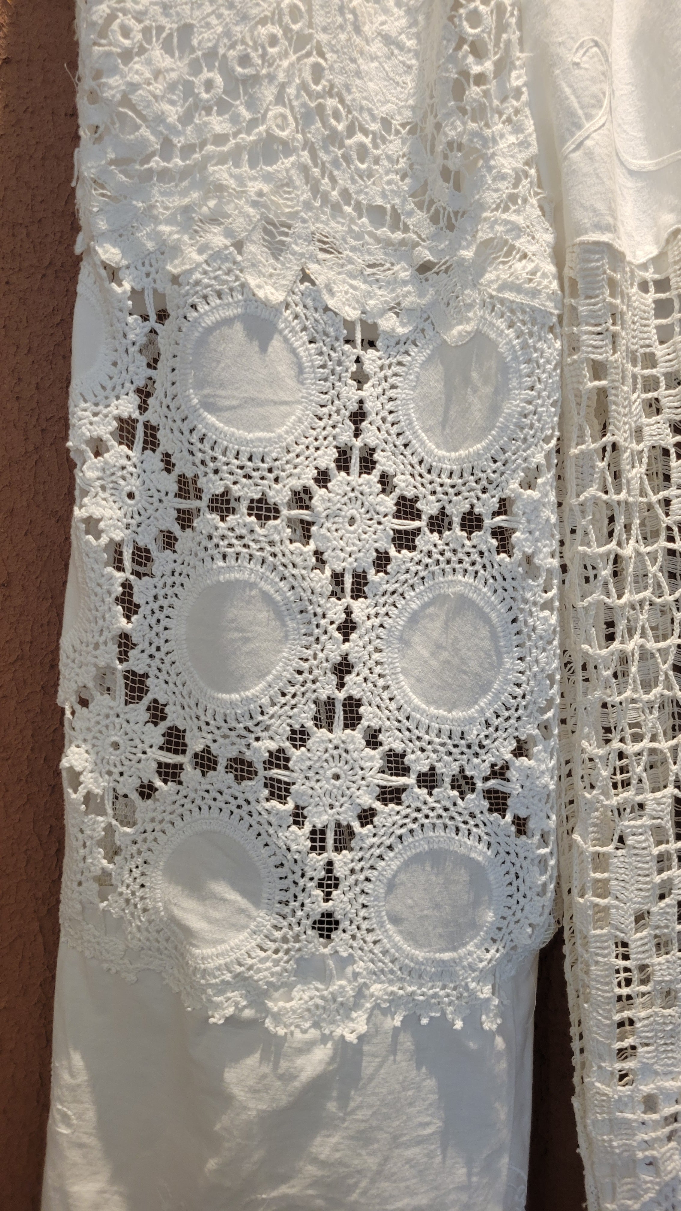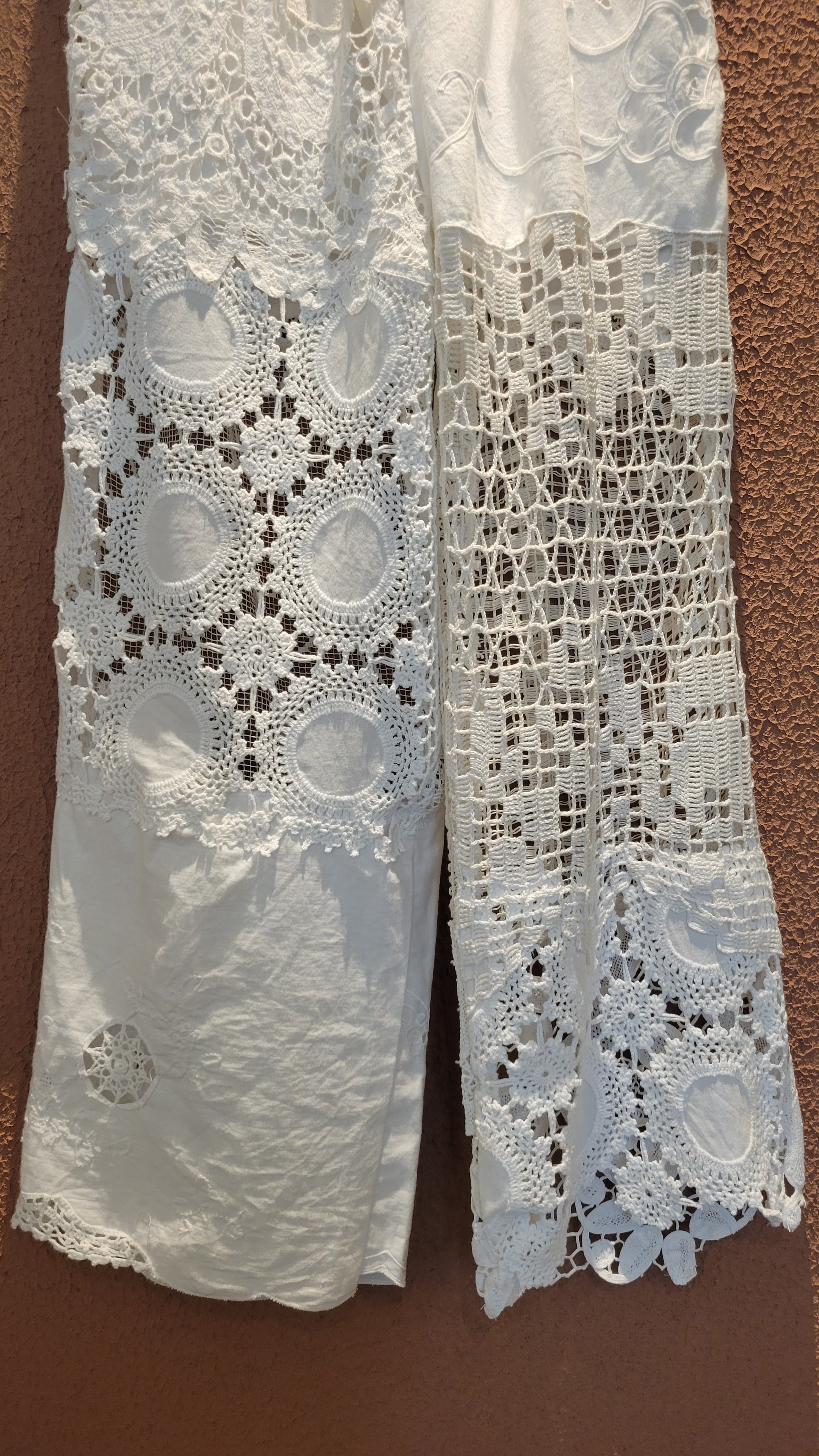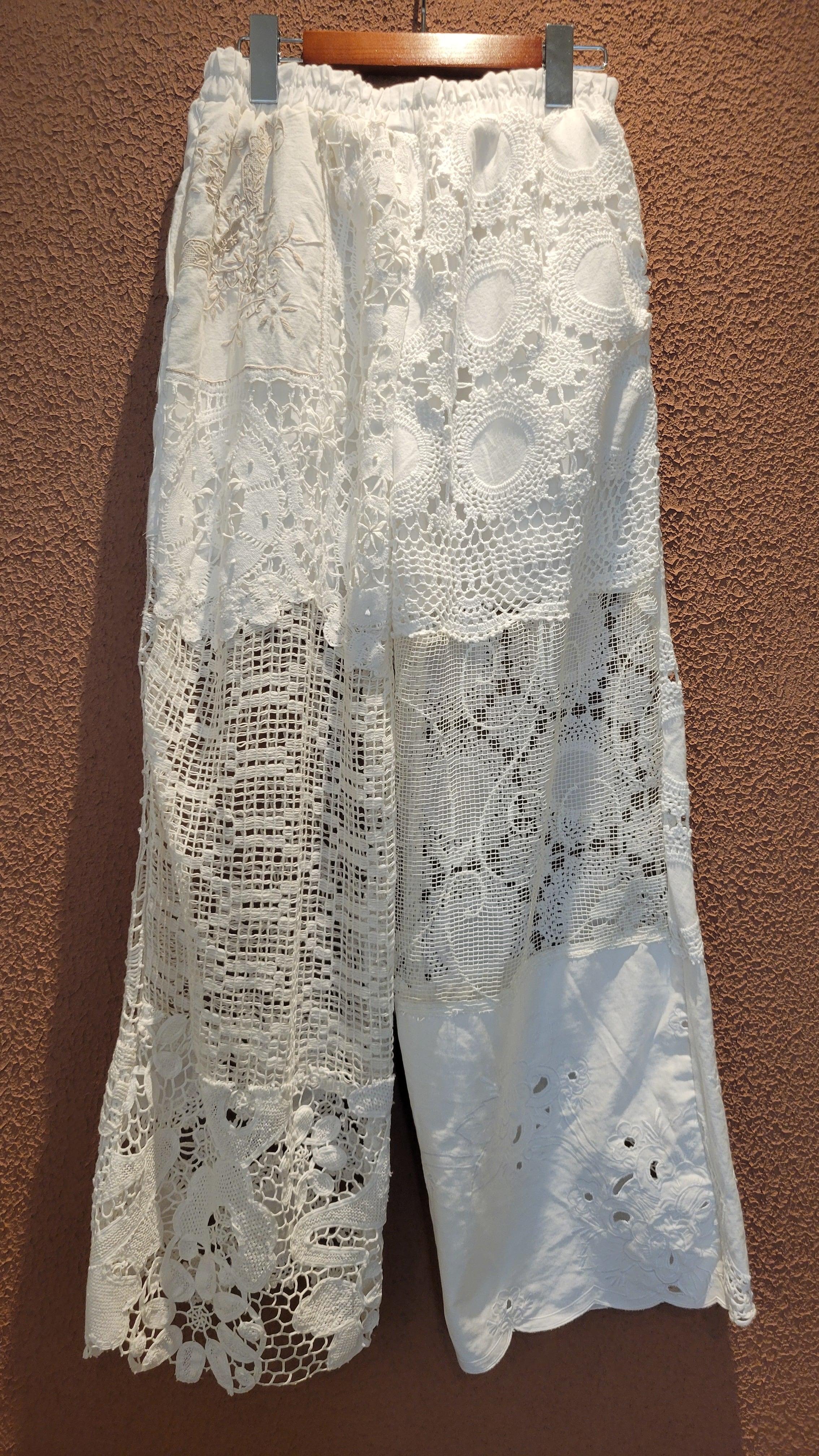 ヴィンテージレースやクロシェの布片を繋ぎ合わせて仕立てたリメイクパンツ。素材はレースのパーツにより異なりコットンや一部ポリエステル混になります。ウエストゴム、左右ポケット、ハーフ丈のライナー付きです。着脱がスムーズ、はき心地も楽なイージーパンツ。1本のパンツに異なる種類のレースがいくつも使用されており表情豊かです。