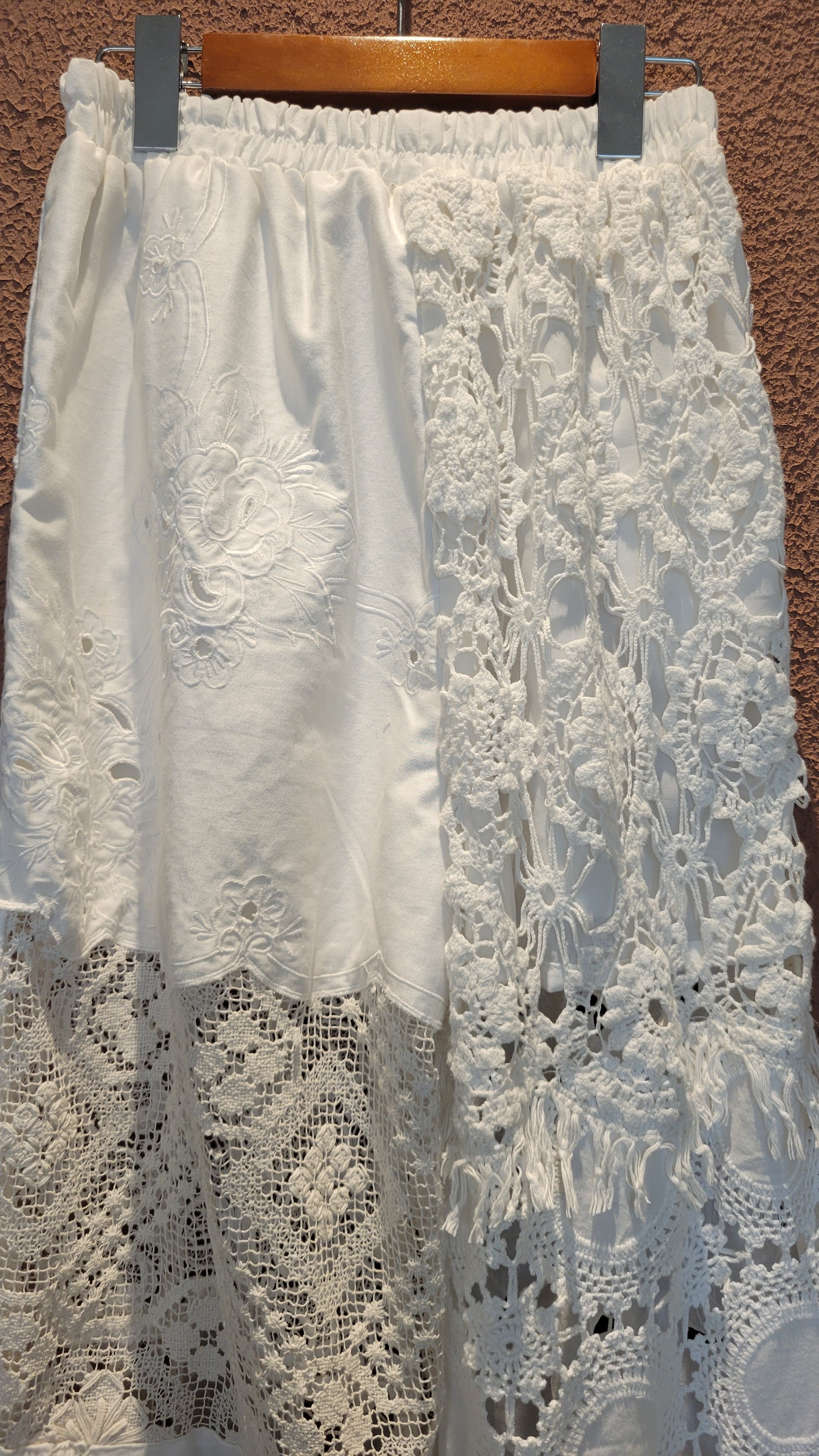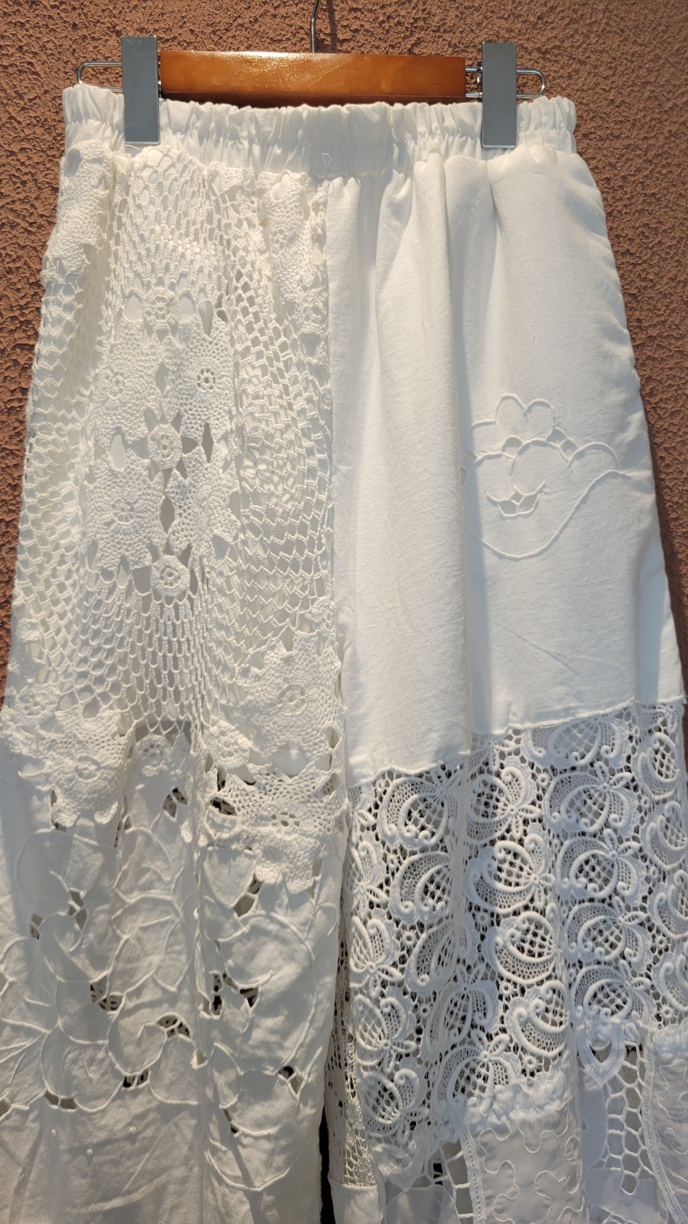 ヴィンテージレースやクロシェの布片を繋ぎ合わせて仕立てたリメイクパンツ。素材はレースのパーツにより異なりコットンや一部ポリエステル混になります。ウエストゴム、左右ポケット、ハーフ丈のライナー付きです。着脱がスムーズ、はき心地も楽なイージーパンツ。1本のパンツに異なる種類のレースがいくつも使用されており表情豊かです。