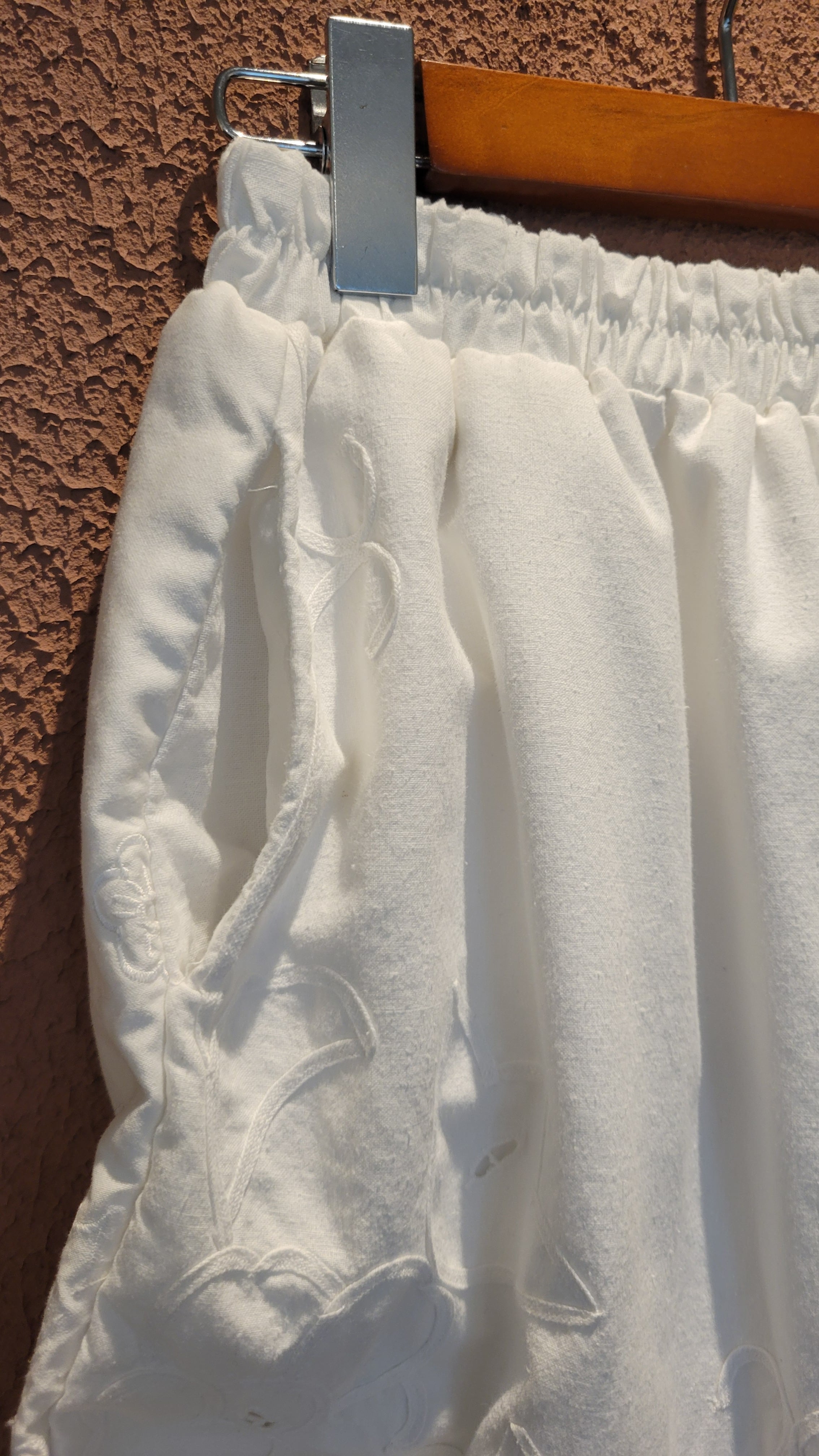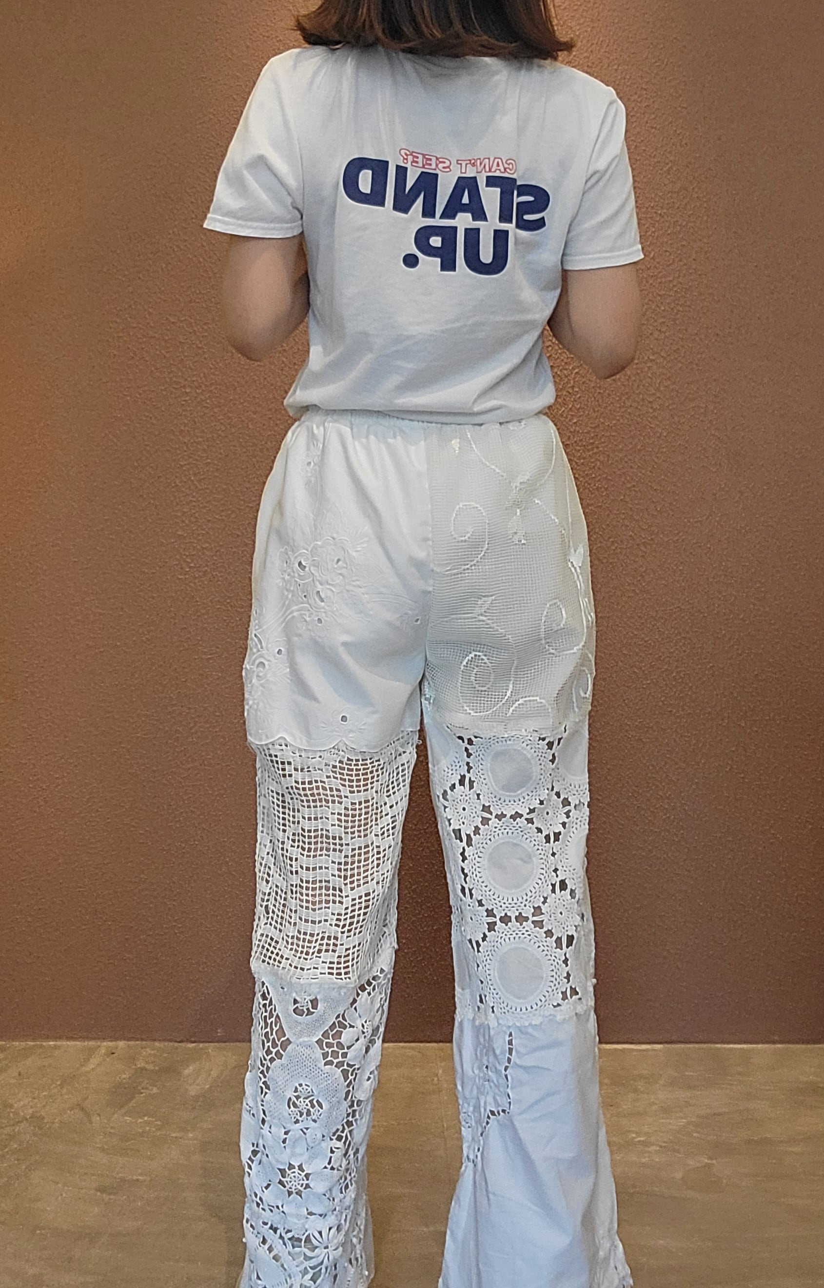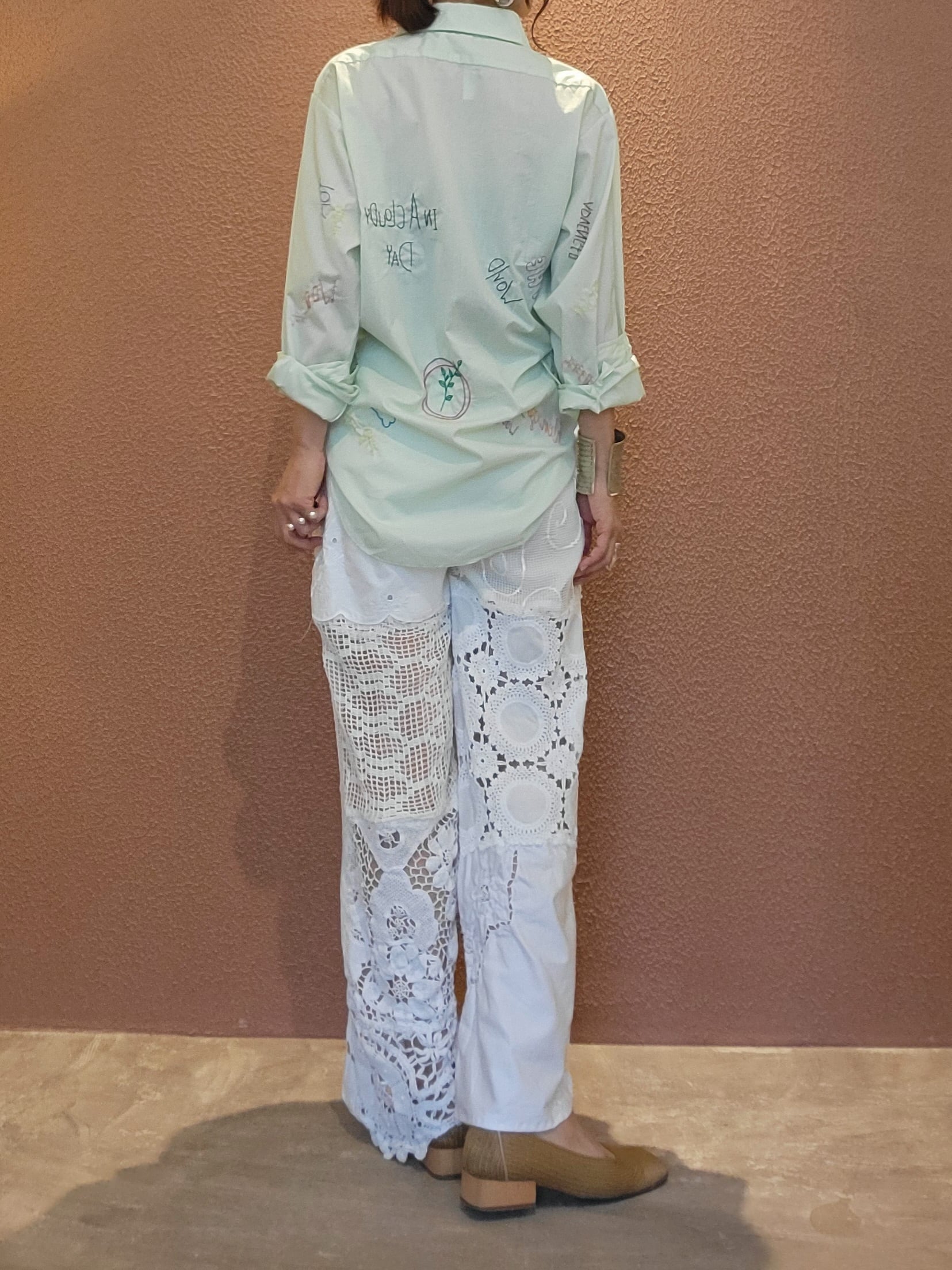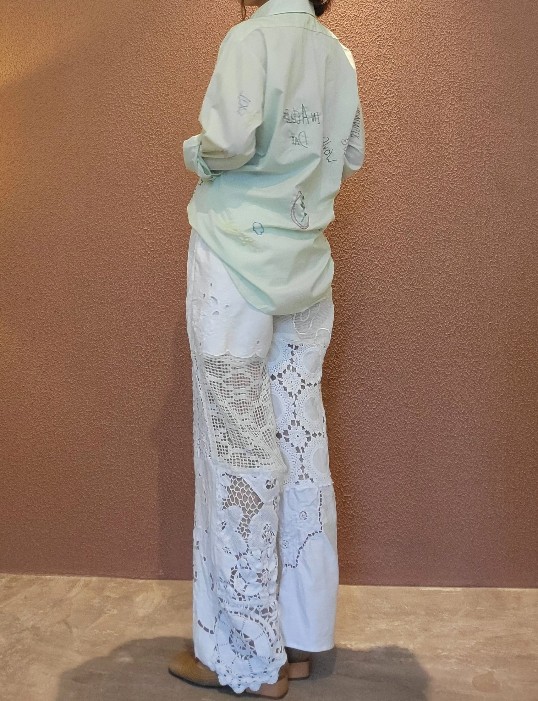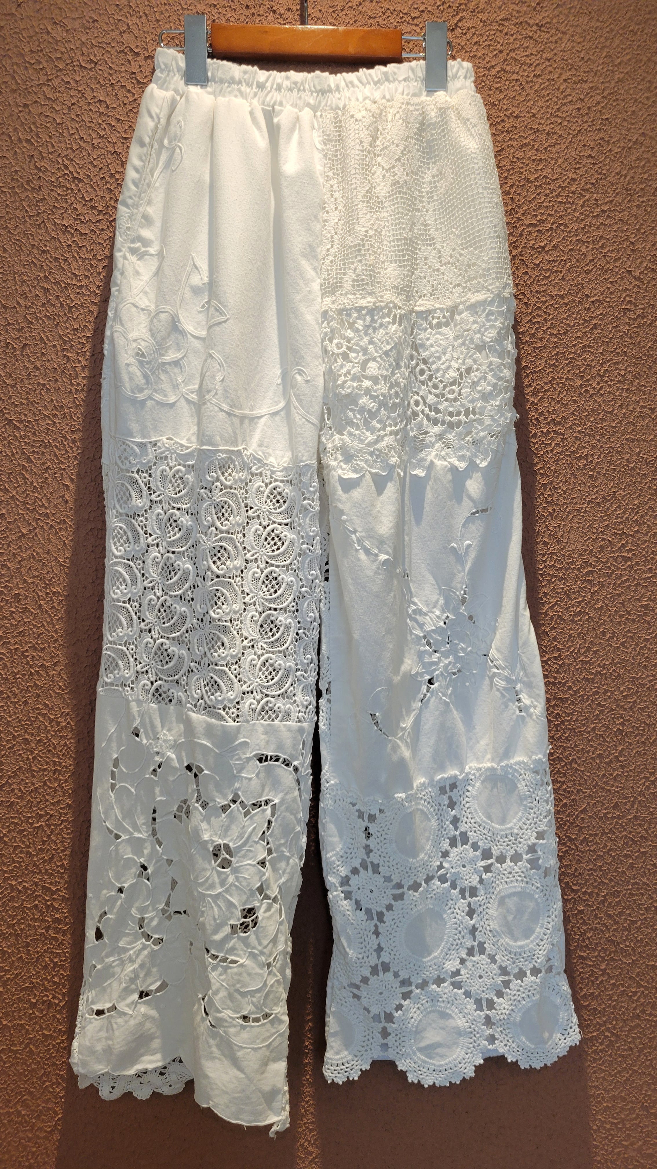 ヴィンテージレースやクロシェの布片を繋ぎ合わせて仕立てたリメイクパンツ。素材はレースのパーツにより異なりコットンや一部ポリエステル混になります。ウエストゴム、左右ポケット、ハーフ丈のライナー付きです。着脱がスムーズ、はき心地も楽なイージーパンツ。1本のパンツに異なる種類のレースがいくつも使用されており表情豊かです。