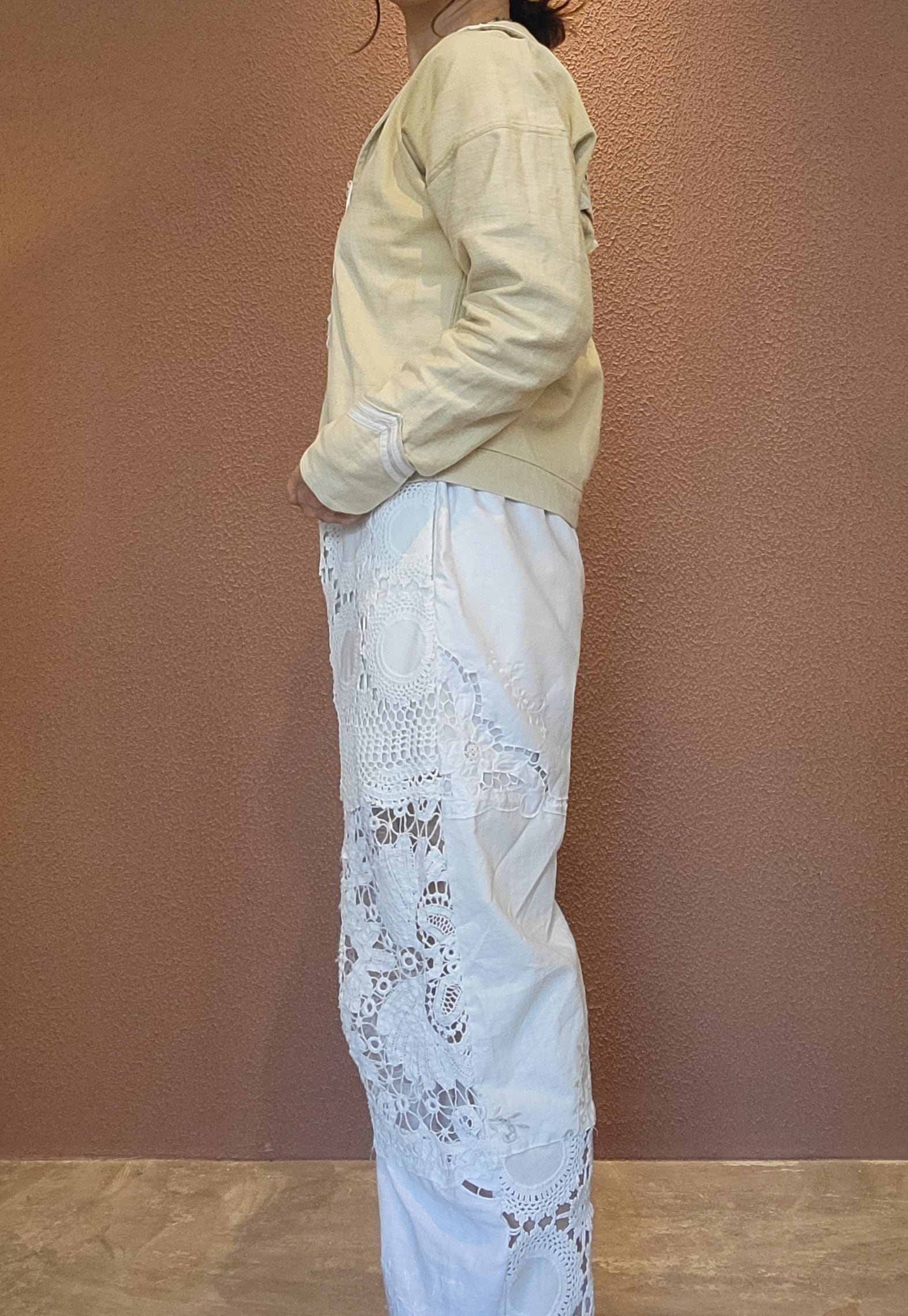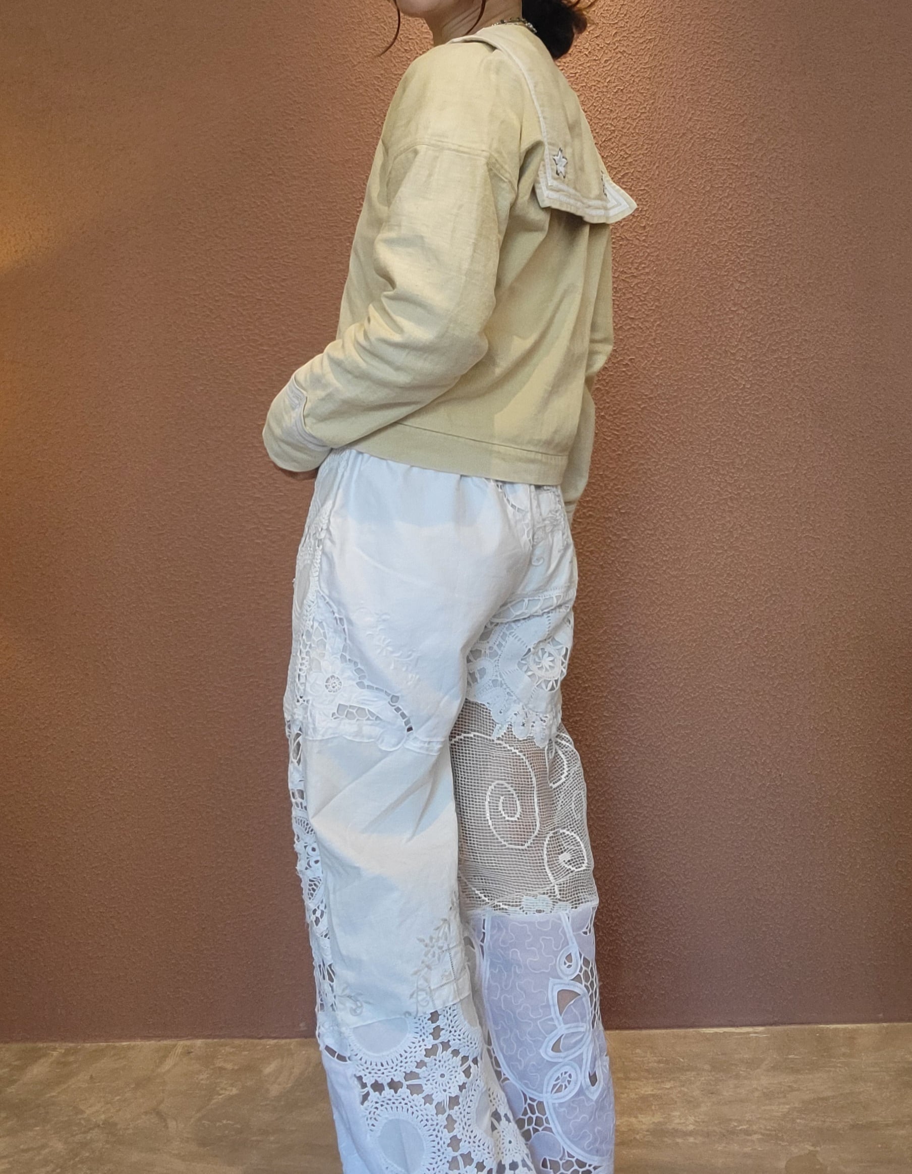 ヴィンテージレースやクロシェの布片を繋ぎ合わせて仕立てたリメイクパンツ。素材はレースのパーツにより異なりコットンや一部ポリエステル混になります。ウエストゴム、左右ポケット、ハーフ丈のライナー付きです。着脱がスムーズ、はき心地も楽なイージーパンツ。1本のパンツに異なる種類のレースがいくつも使用されており表情豊かです。