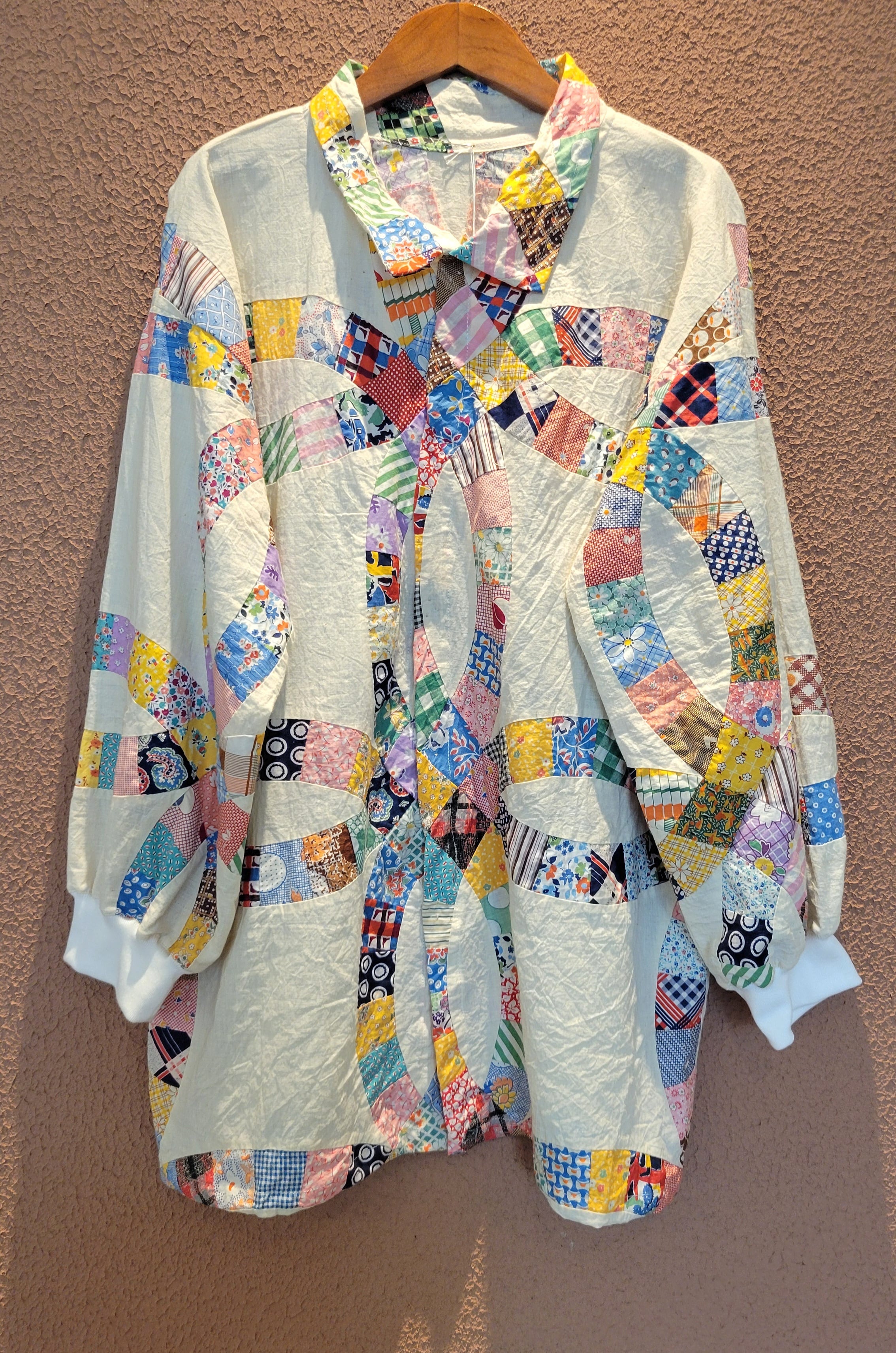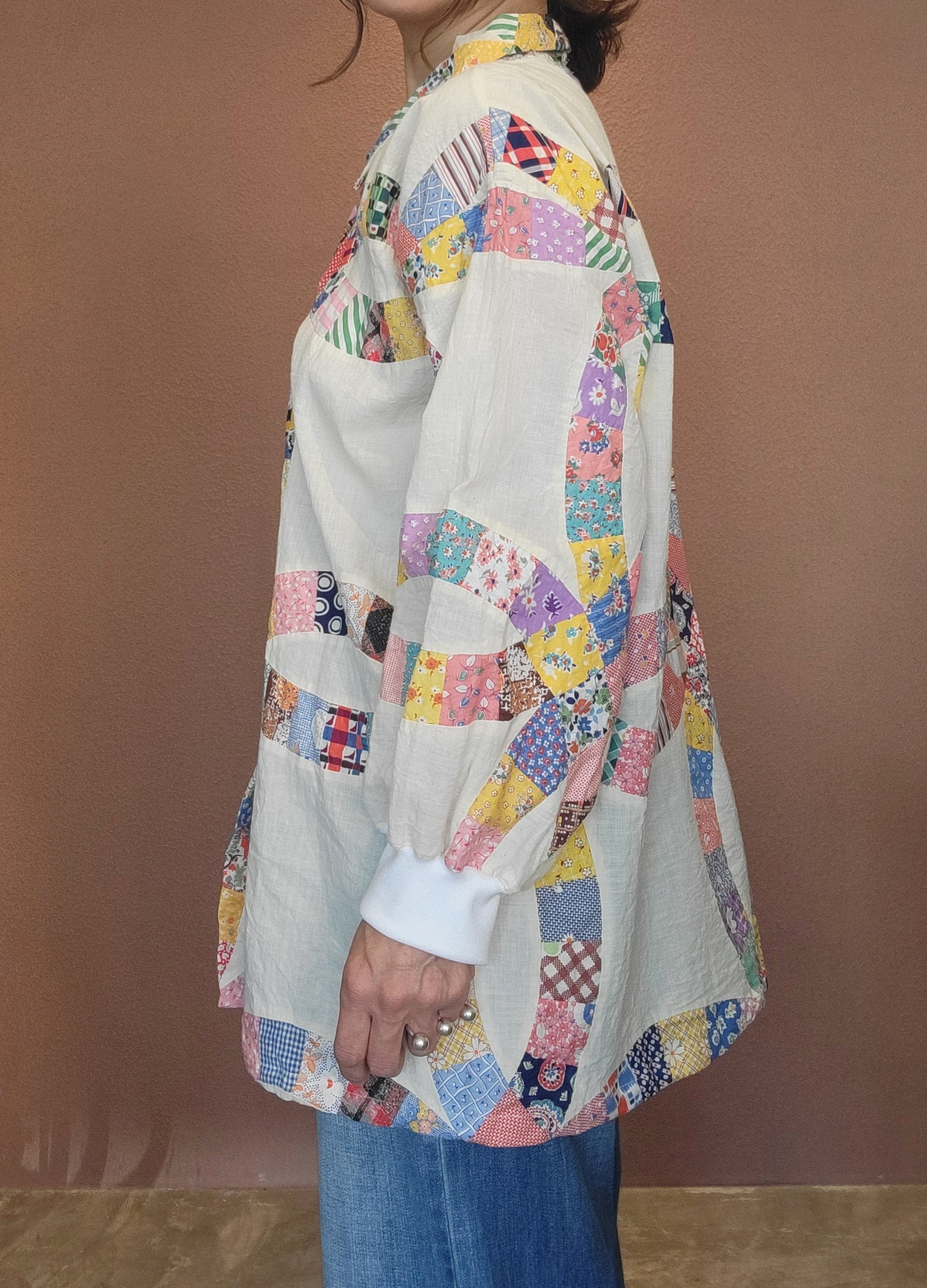 ヴィンテージのパッチワークキルト生地を使用したリメイクトップス。素材表記はありませんが薄手のさらりとしたコットンです。裏地は付いていません。フロントはスナップボタン、カフスはリブ仕様です。大きなダブルウェディングリングのモチーフがバランス良く配置されどの角度から見てもヴィンテージキルトの雰囲気と魅力を堪能できる1着です。