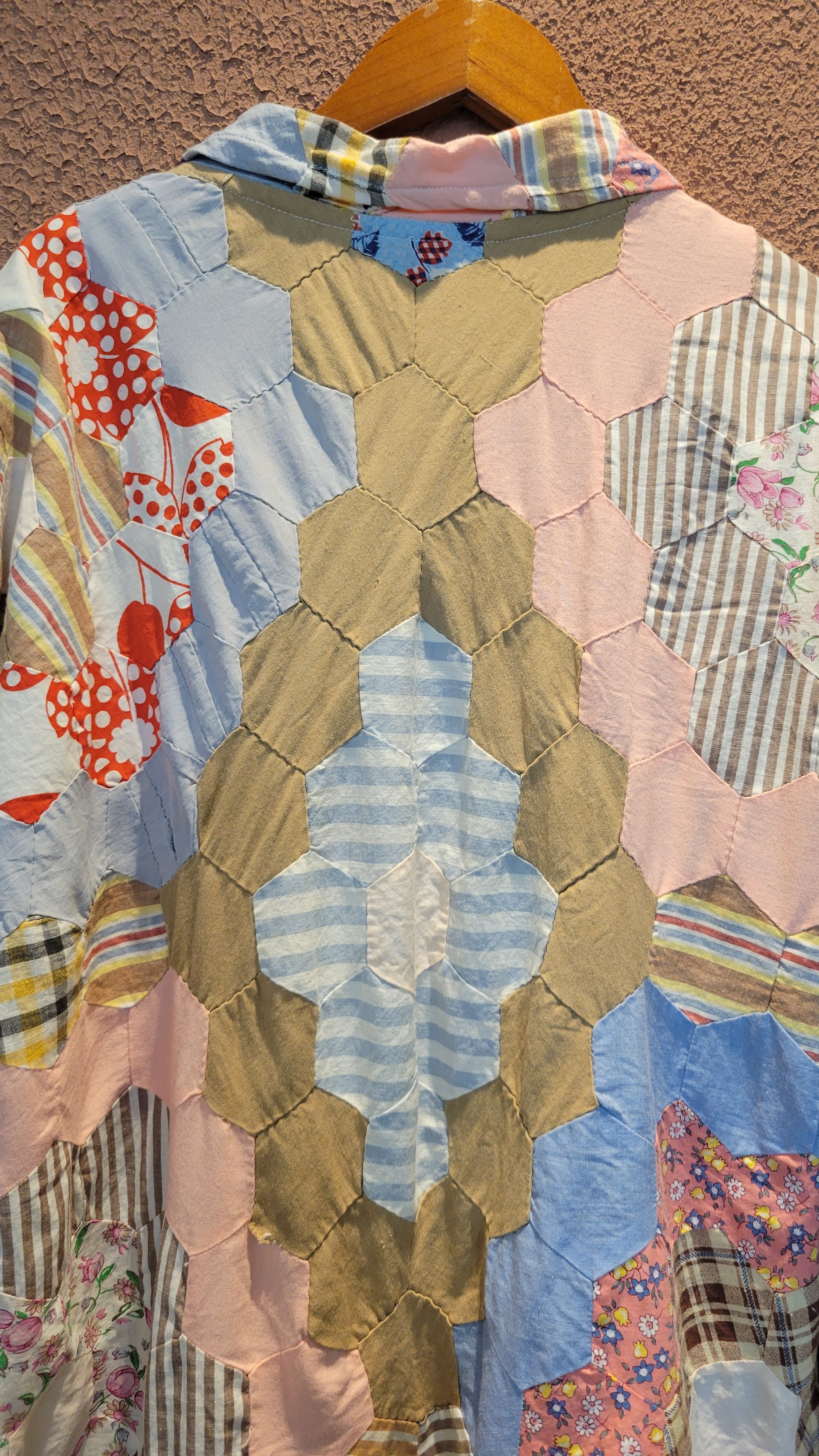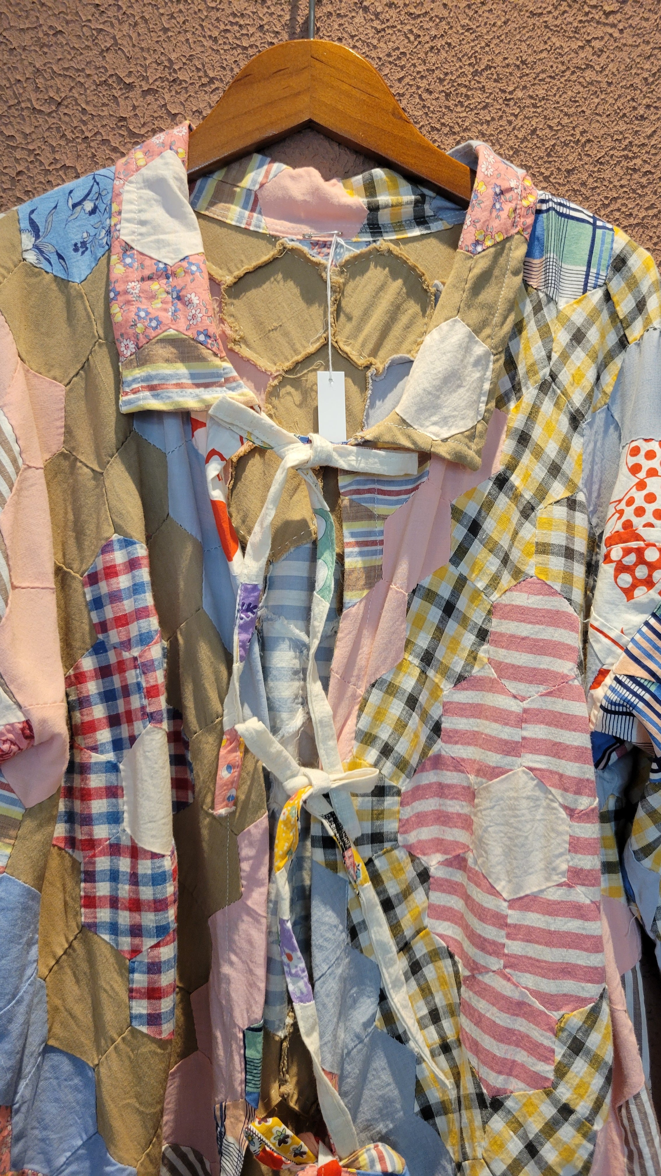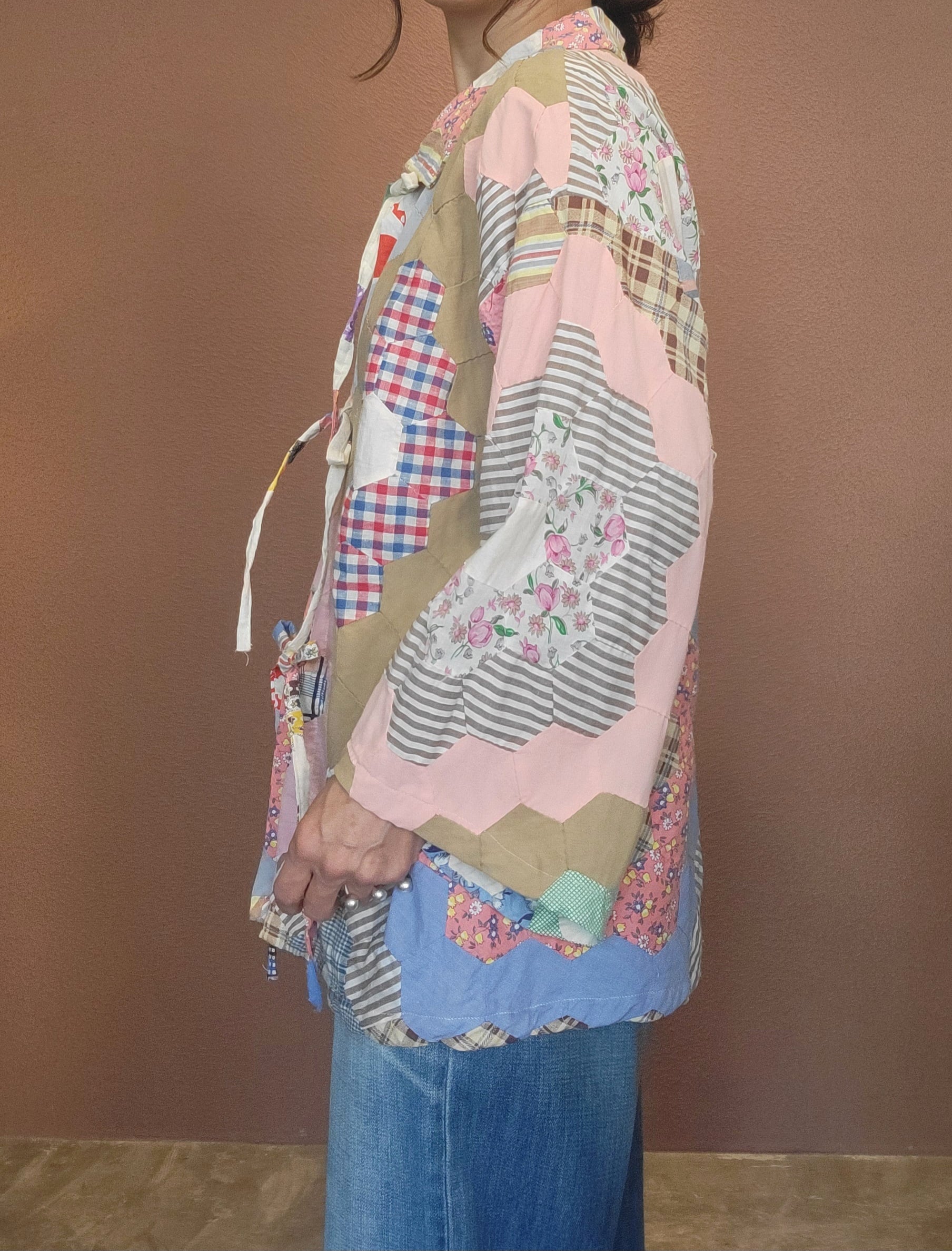 ヴィンテージのパッチワークキルト生地を使用したリメイクトップス。素材表記はありませんが薄手のさらりとしたコットンです。裏地は付いていません。フロントのリボンは結んでも、結ばず垂らしてフロントオープンでの着用も可愛いです。六角形のパーツを繋ぎ合わせたフラワーガーデンパターンがバランス良く配置されどの角度から見てもヴィンテージキルトの雰囲気と魅力を堪能できる1着です。