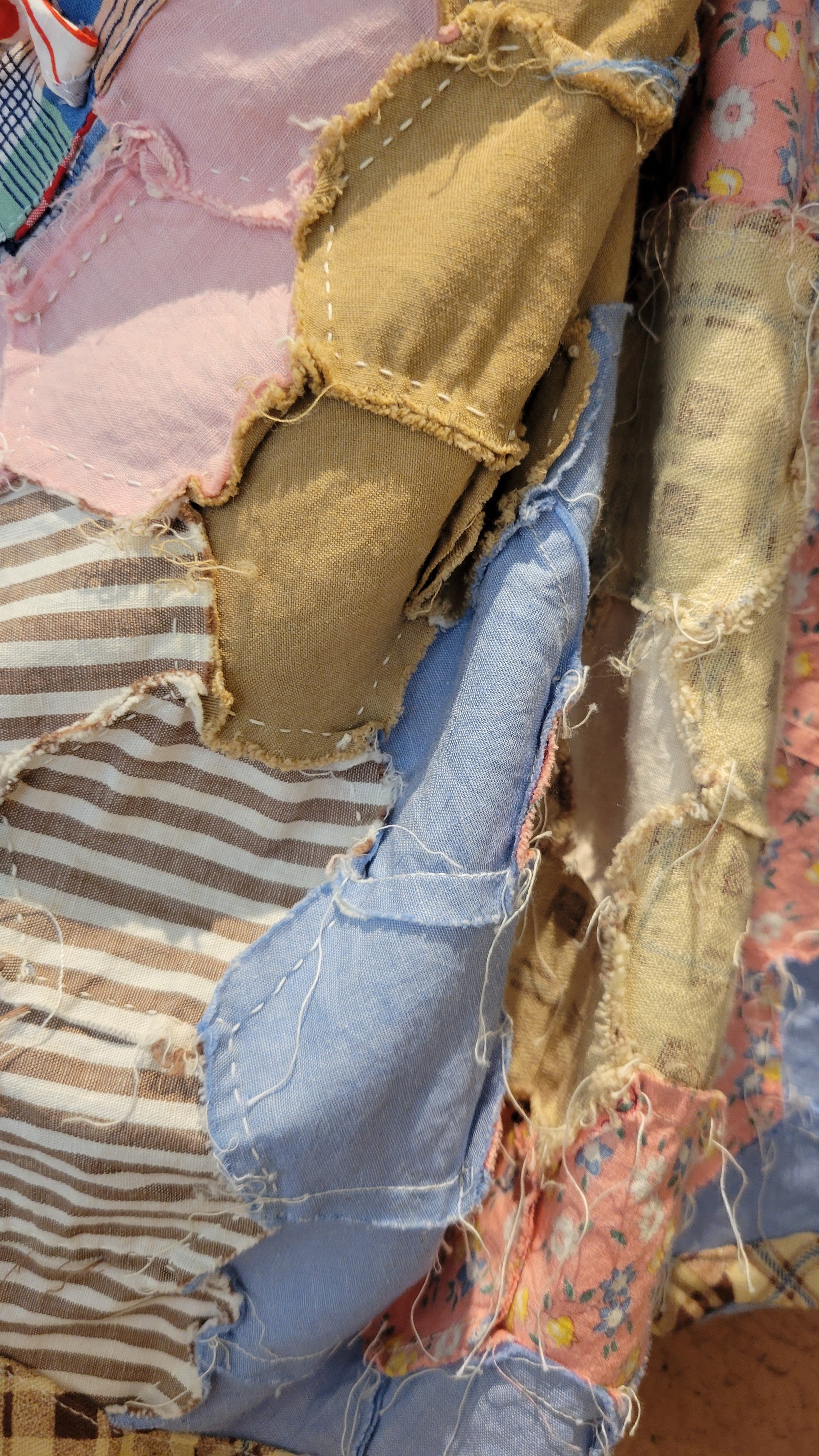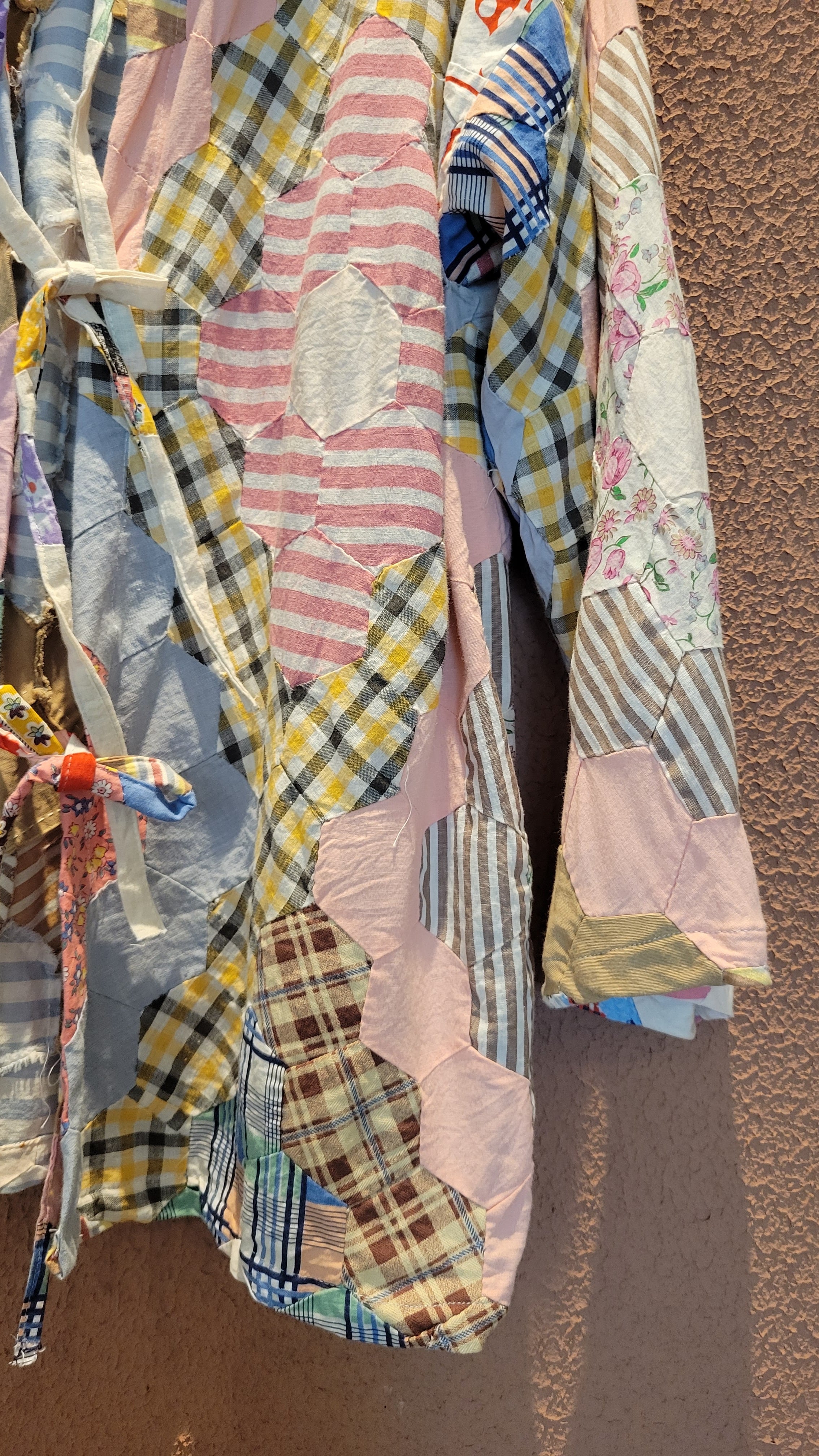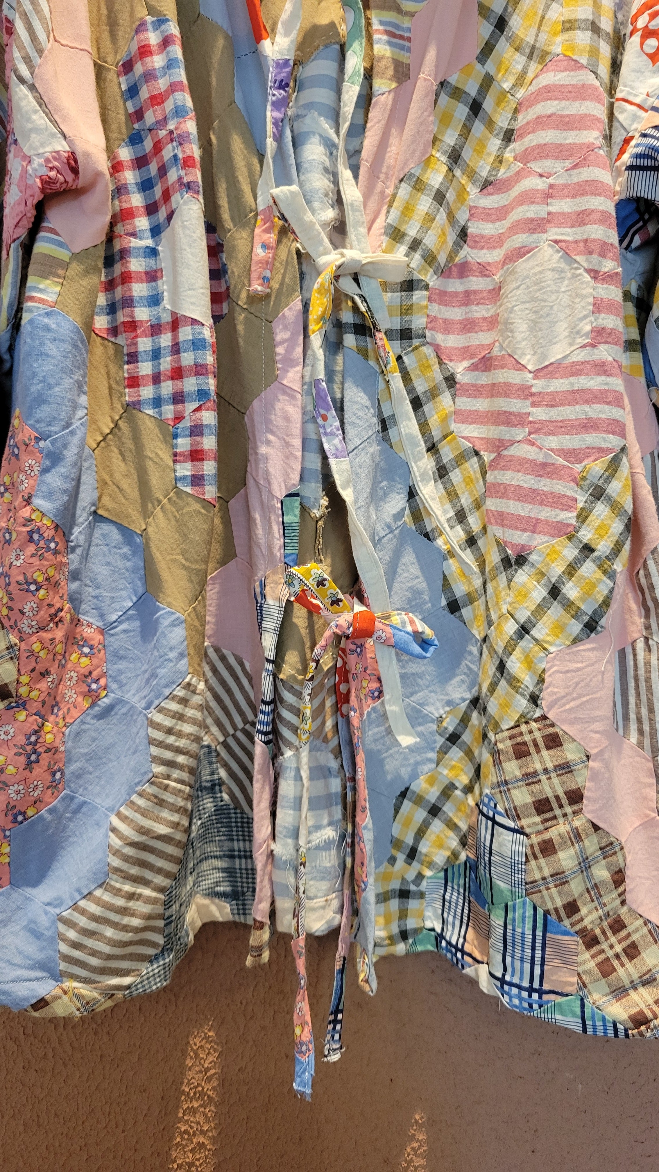 ヴィンテージのパッチワークキルト生地を使用したリメイクトップス。素材表記はありませんが薄手のさらりとしたコットンです。裏地は付いていません。フロントのリボンは結んでも、結ばず垂らしてフロントオープンでの着用も可愛いです。六角形のパーツを繋ぎ合わせたフラワーガーデンパターンがバランス良く配置されどの角度から見てもヴィンテージキルトの雰囲気と魅力を堪能できる1着です。