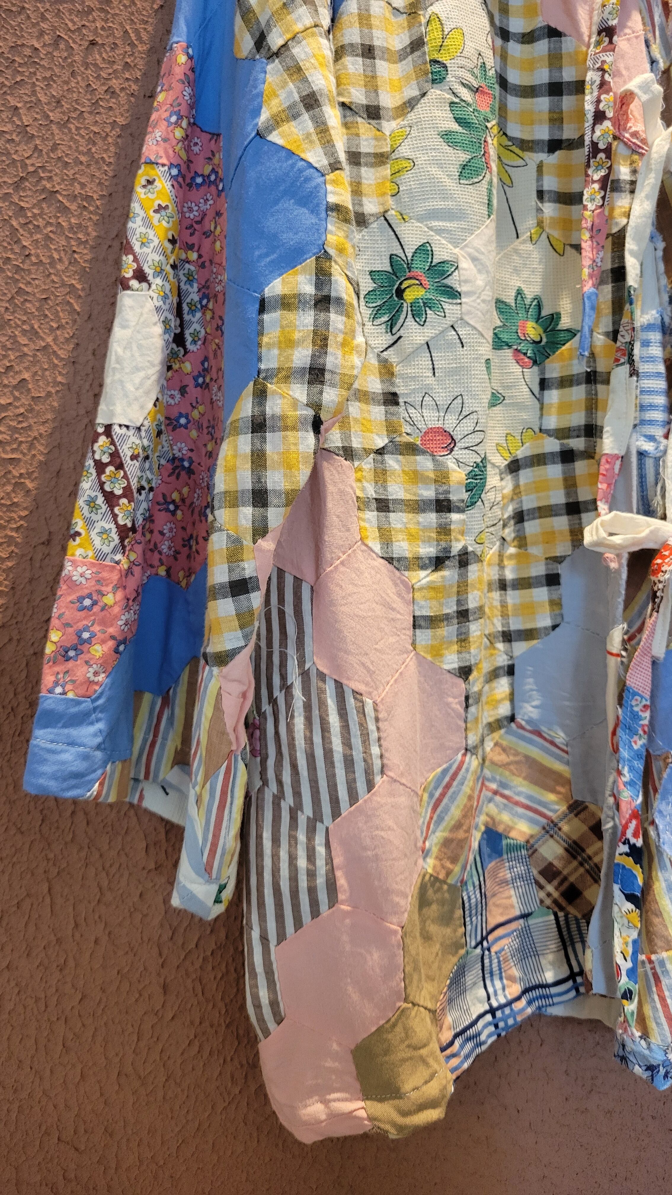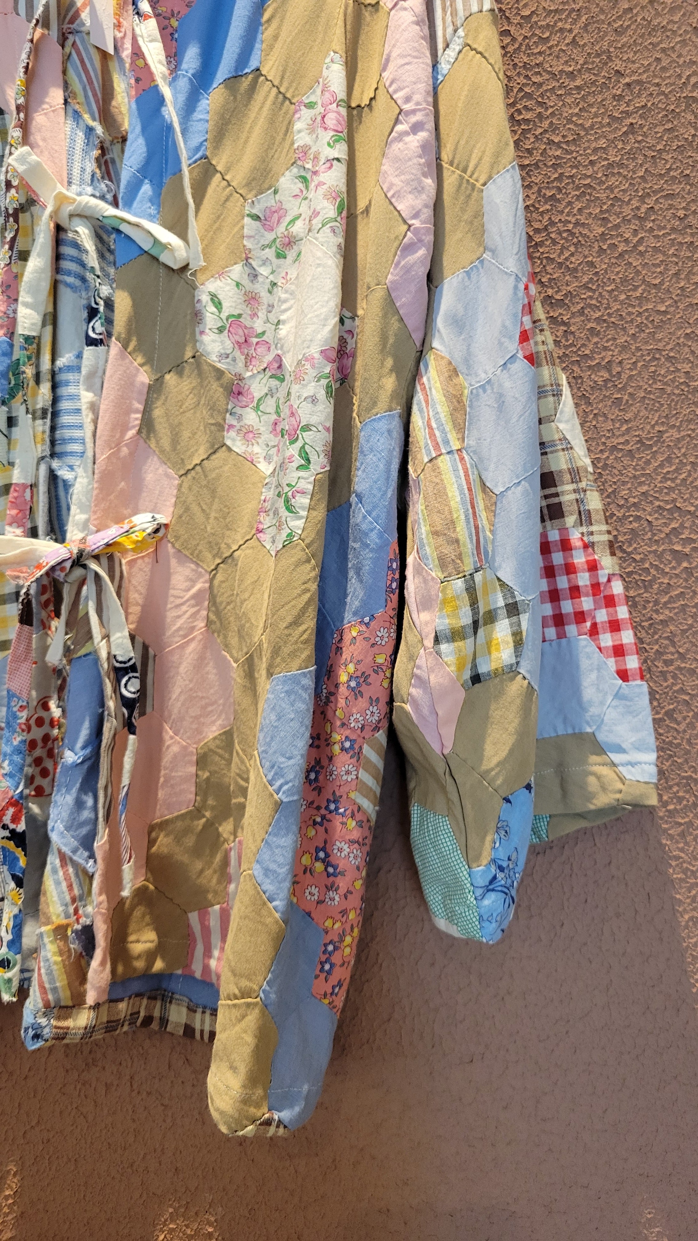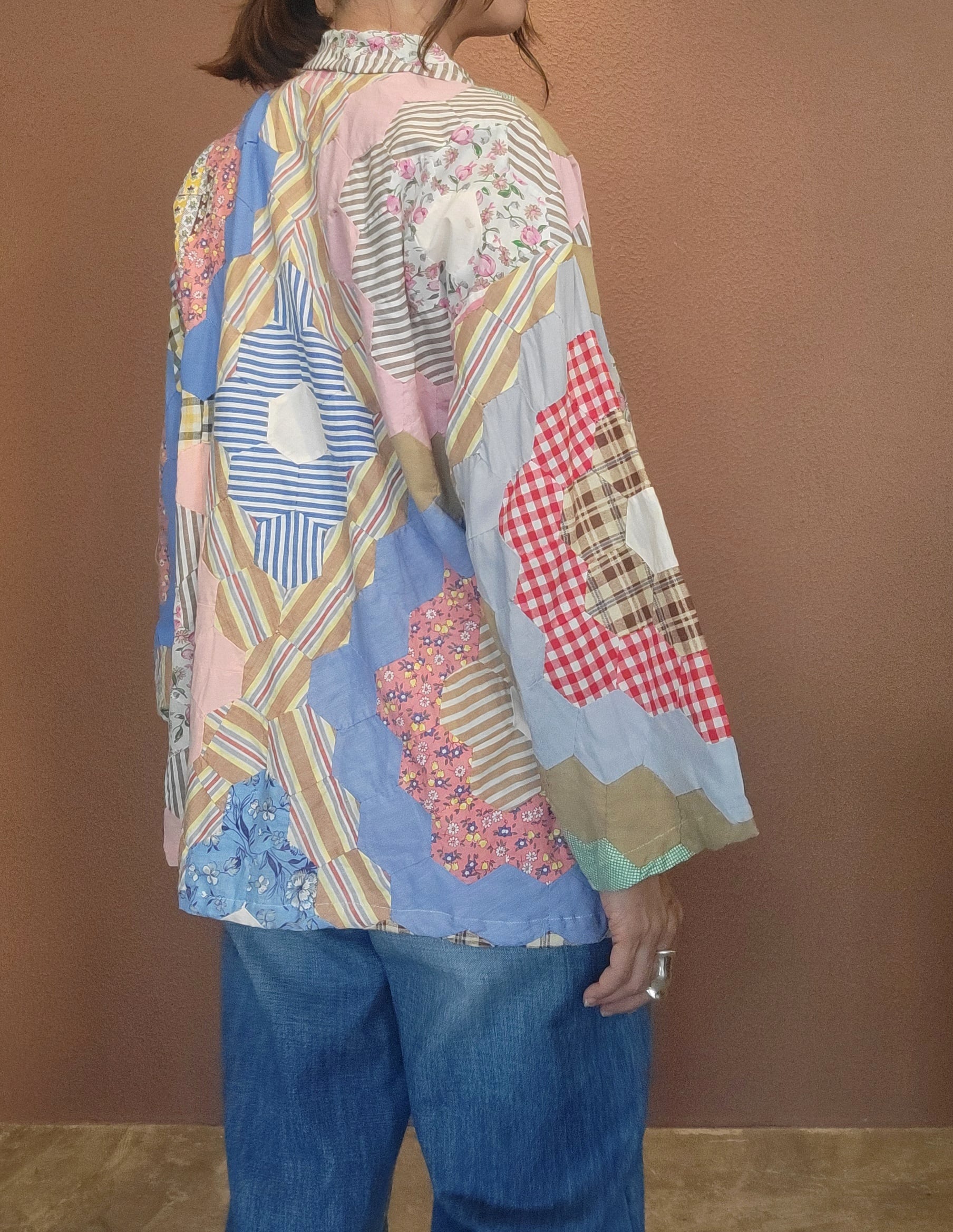 ヴィンテージのパッチワークキルト生地を使用したリメイクトップス。素材表記はありませんが薄手のさらりとしたコットンです。裏地は付いていません。フロントのリボンは結んでも、結ばず垂らしてフロントオープンでの着用も可愛いです。六角形のパーツを繋ぎ合わせたフラワーガーデンパターンがバランス良く配置されどの角度から見てもヴィンテージキルトの雰囲気と魅力を堪能できる1着です。