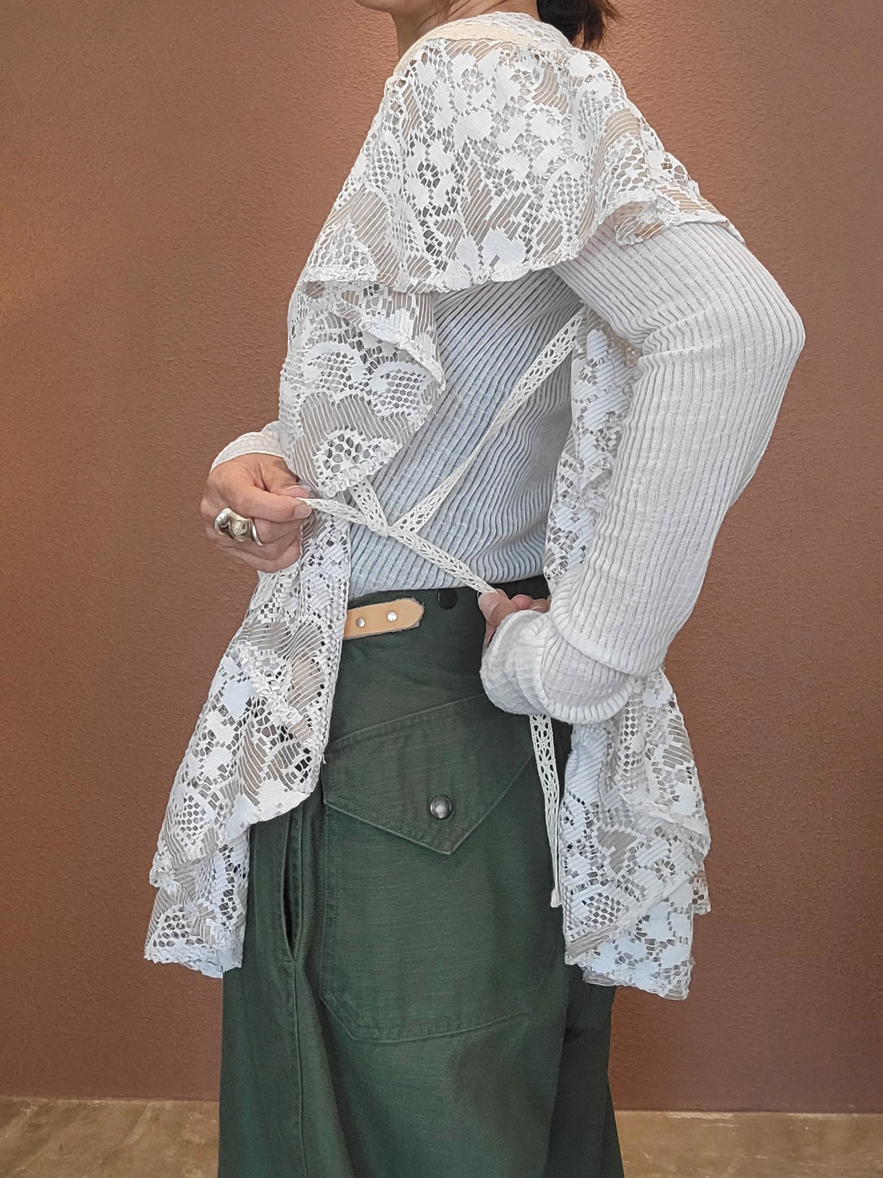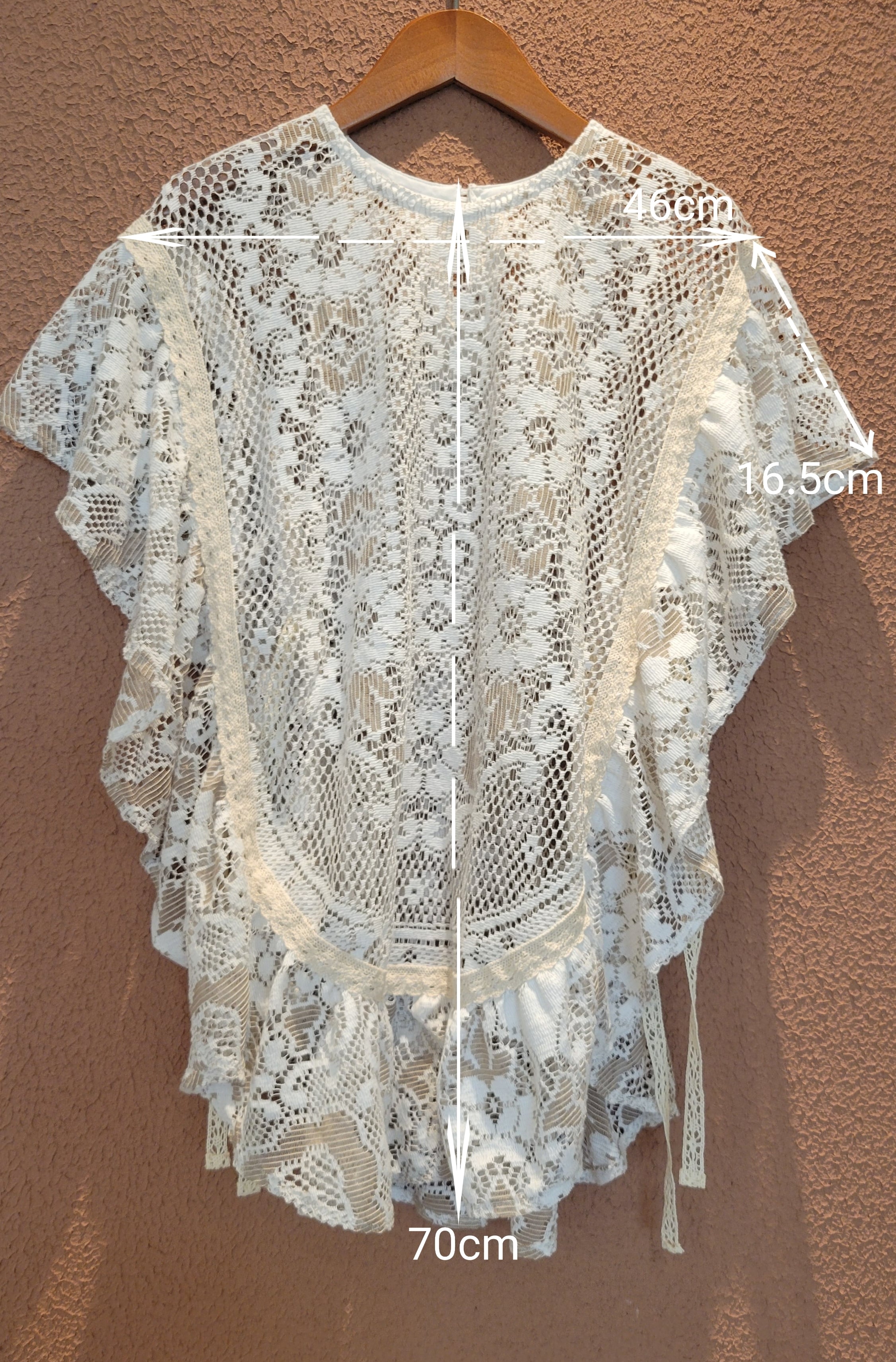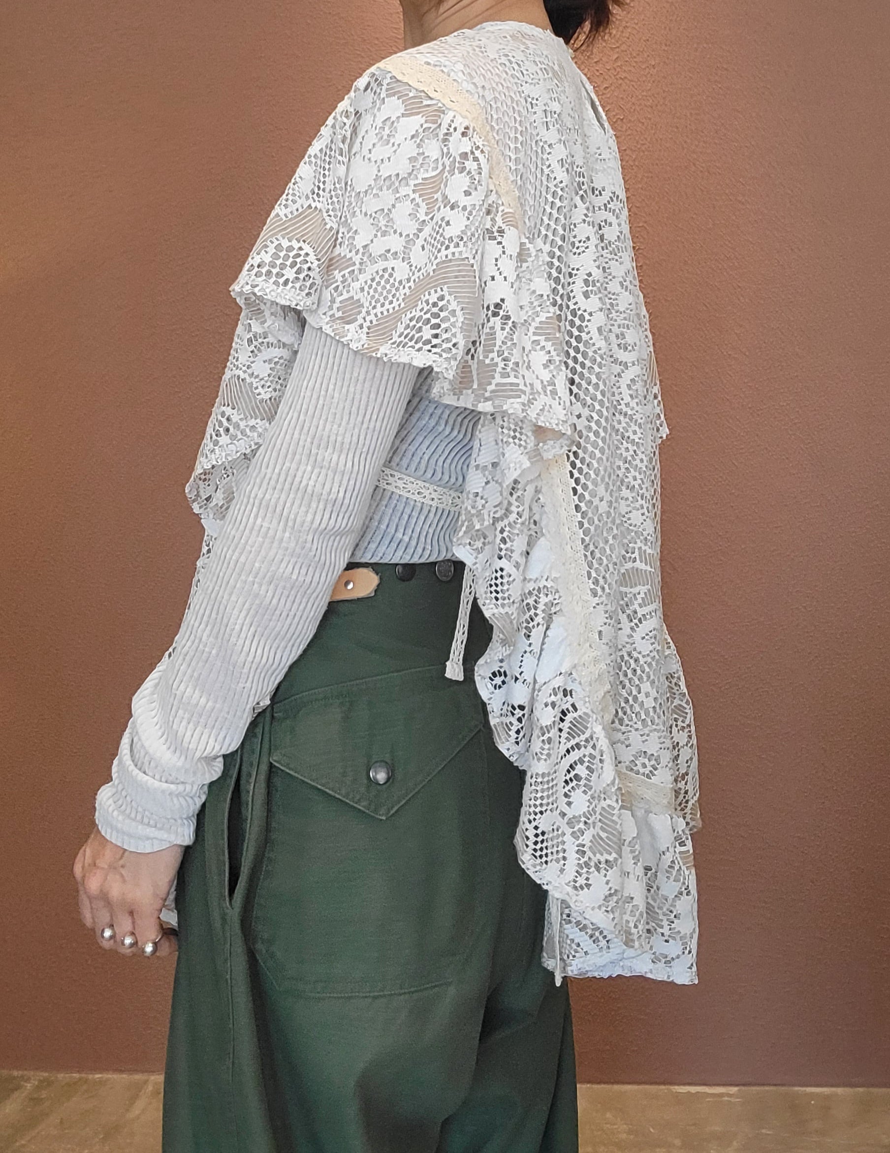 ヴィンテージレースを使用した2wayリメイクトップス。素材表記はありませんがポリエステルとコットンの混紡素材のようです。軽くて柔らかい素材感です。ポンチョのように頭から被るようにして着用します。どちらの向きで着用する場合もサイドリボンを結ぶことで安定感を保てます。横向き(丈が短くなる方)で着る場合は袖下に付いているスナップボタンを留めるとより安定感が増します。通気の良いレースで涼しく着られ、肌の露出もほどよく抑えてくれるので夏の羽織としてもぴったりです。