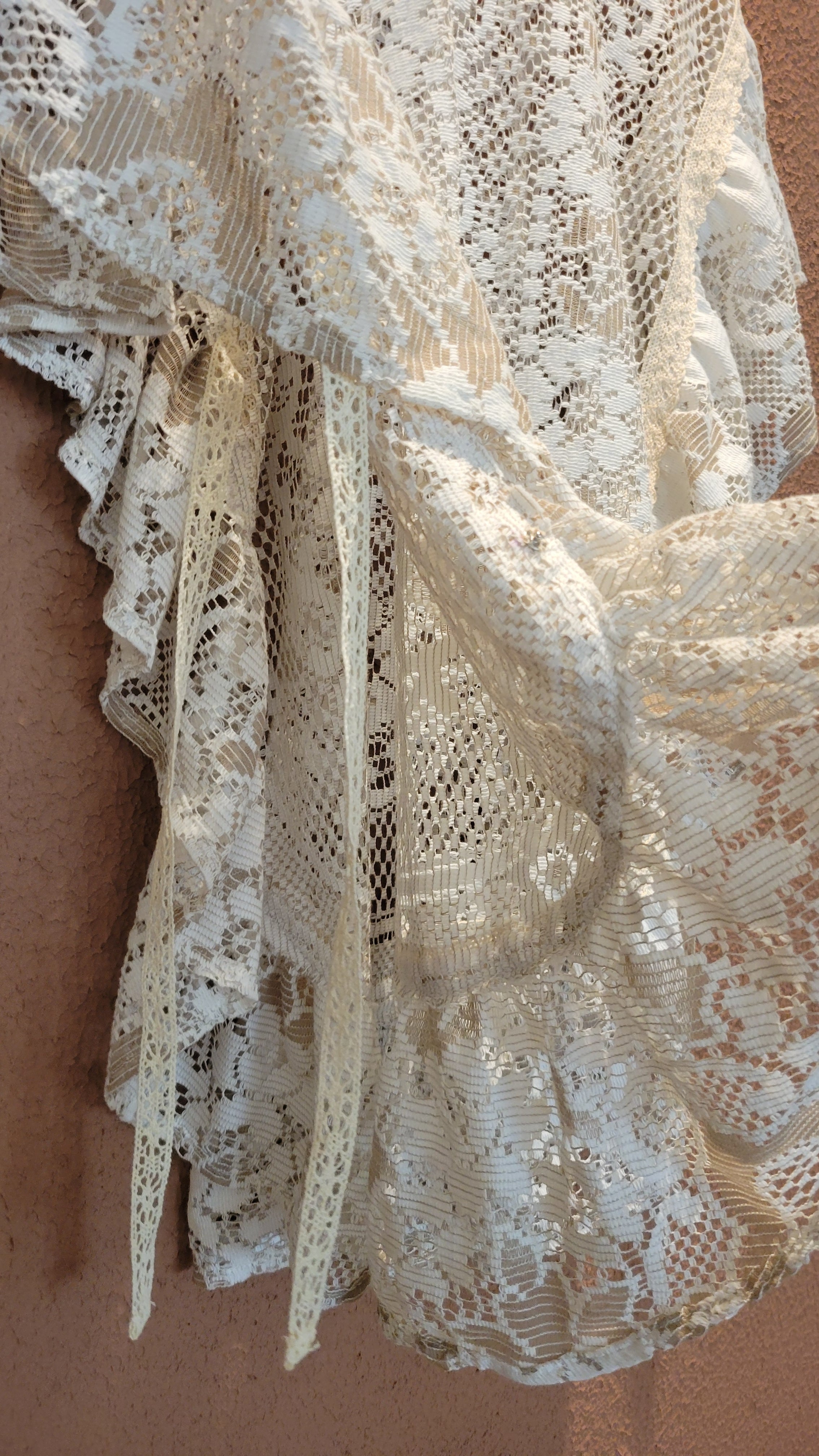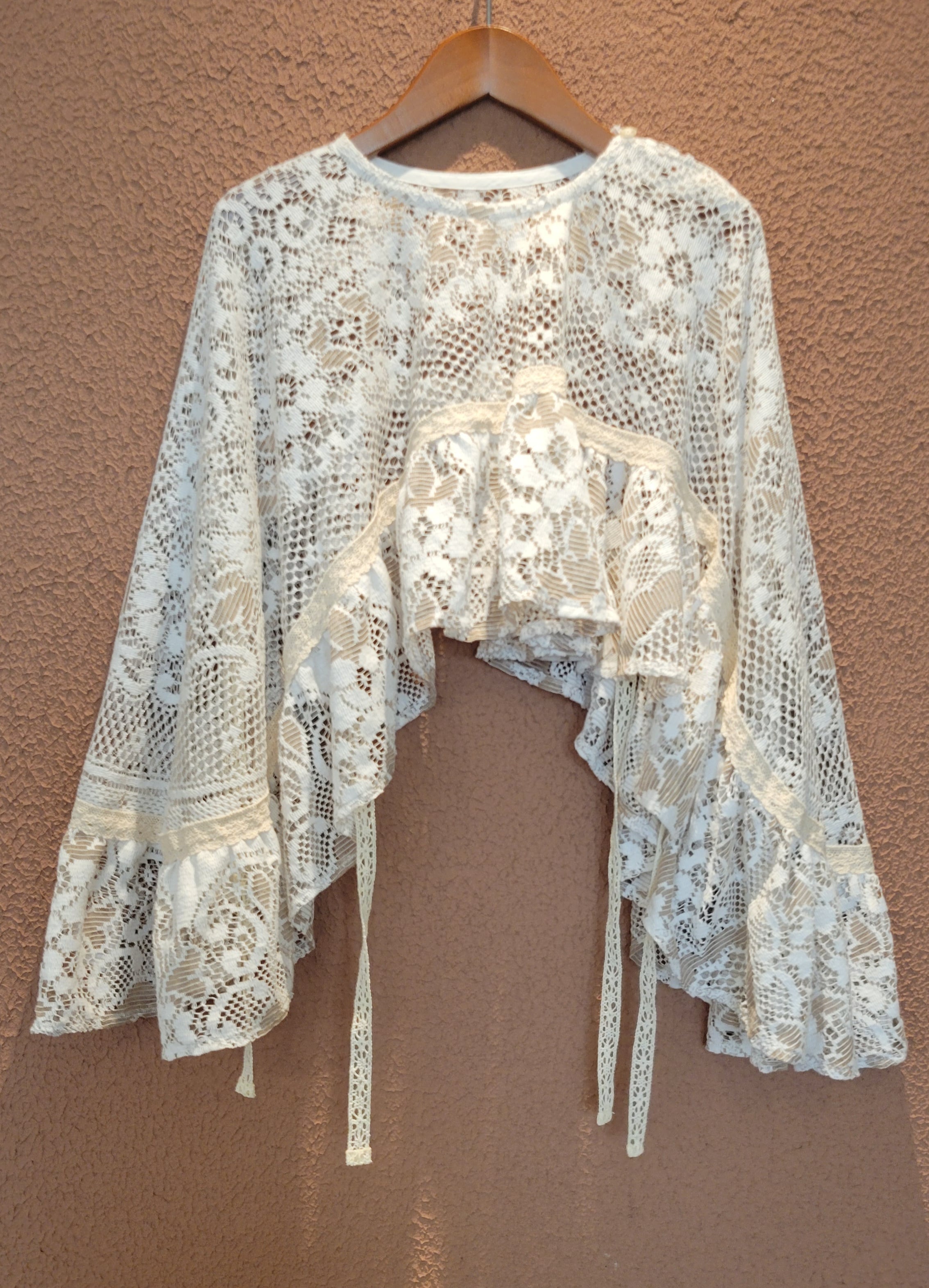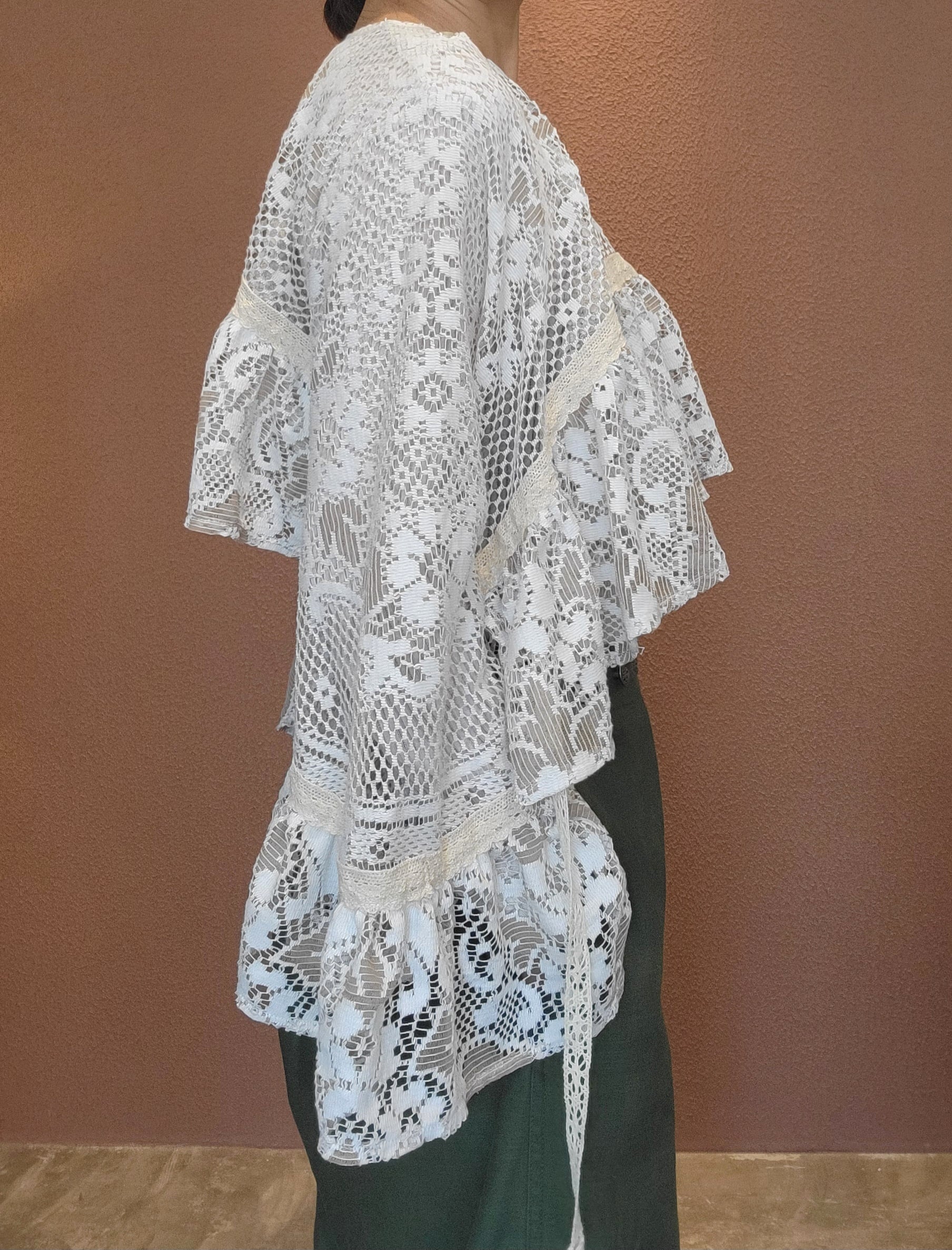 ヴィンテージレースを使用した2wayリメイクトップス。素材表記はありませんがポリエステルとコットンの混紡素材のようです。軽くて柔らかい素材感です。ポンチョのように頭から被るようにして着用します。どちらの向きで着用する場合もサイドリボンを結ぶことで安定感を保てます。横向き(丈が短くなる方)で着る場合は袖下に付いているスナップボタンを留めるとより安定感が増します。通気の良いレースで涼しく着られ、肌の露出もほどよく抑えてくれるので夏の羽織としてもぴったりです。