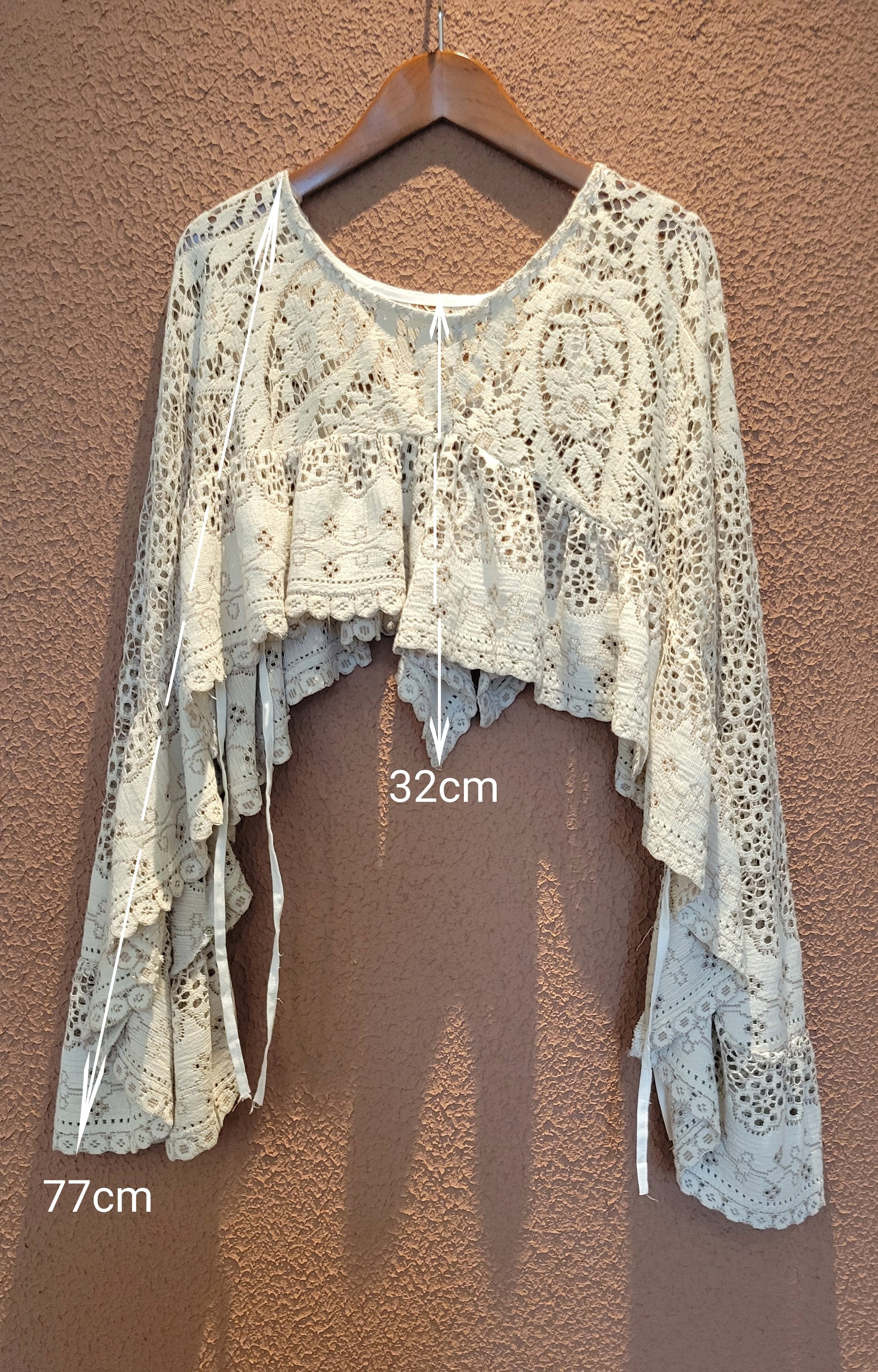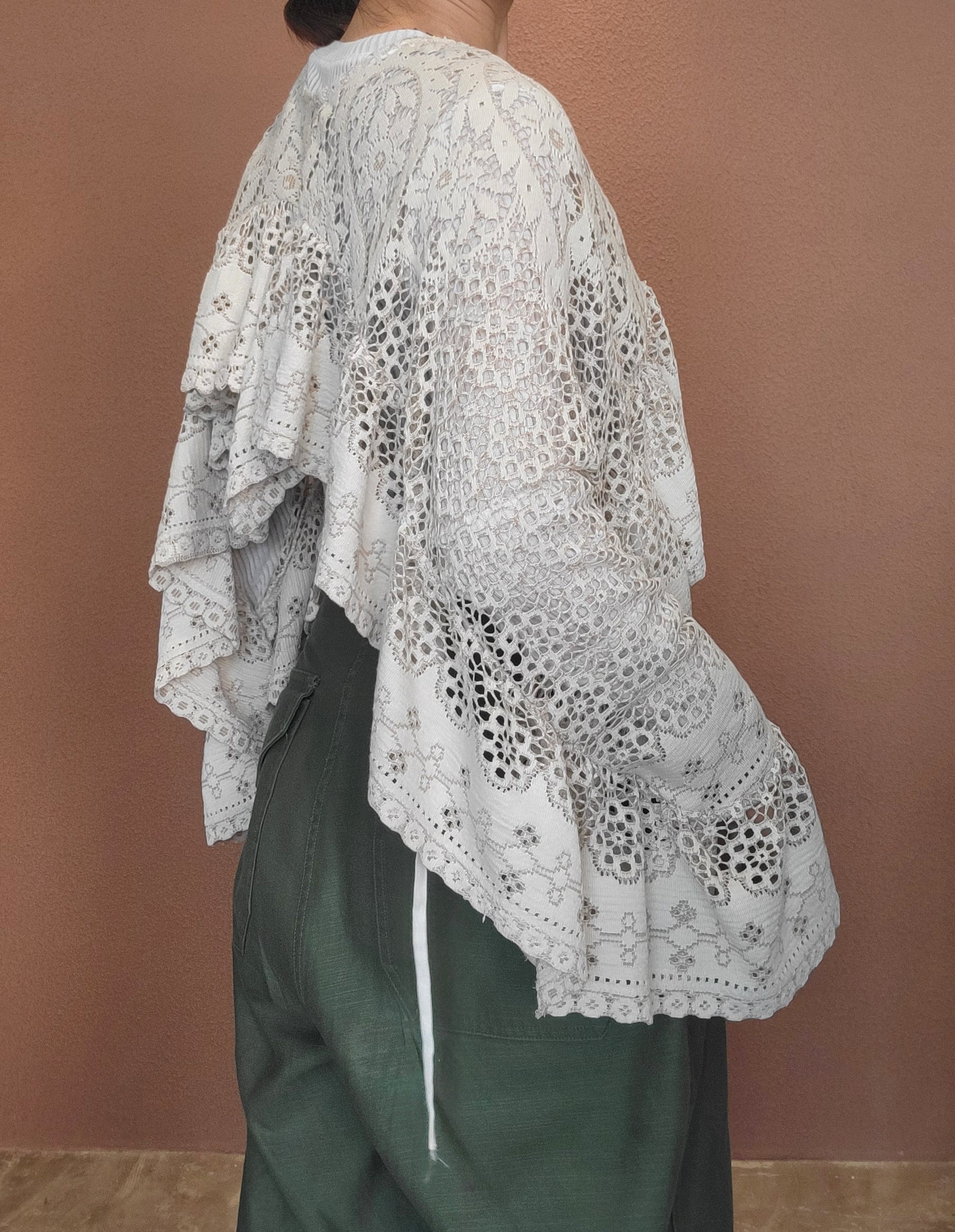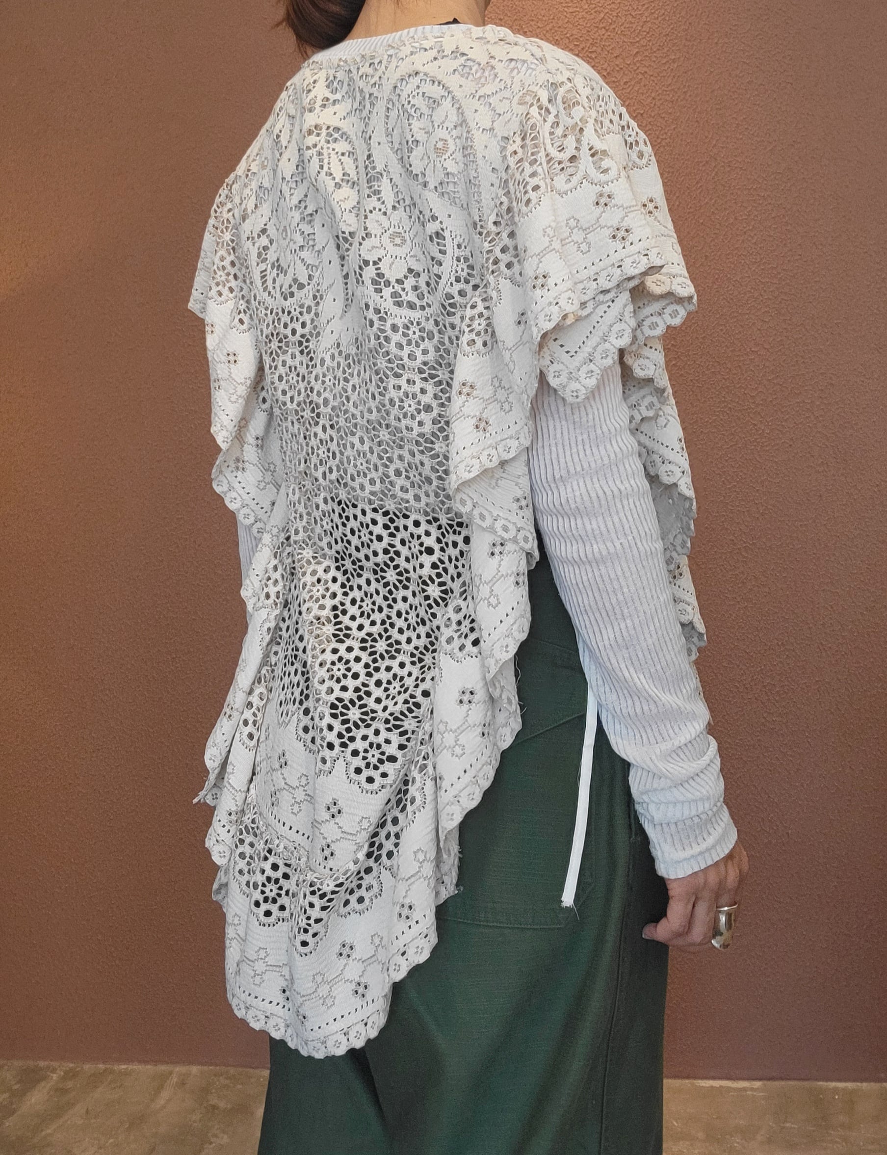 ヴィンテージレースを使用した2wayリメイクトップス。素材表記はありませんがポリエステルとコットンの混紡素材ようです。軽くて柔らかい素材感です。ポンチョのように頭から被るようにして着用します。どちらの向きで着用する場合もサイドリボンを結ぶことで安定感を保てます。横向き(丈が短くなる方)で着る場合は袖下に付いているスナップボタンを留めるとより安定感が増します。通気の良いレースで涼しく着られ、肌の露出もほどよく抑えてくれるので夏の羽織としてもぴったりです。