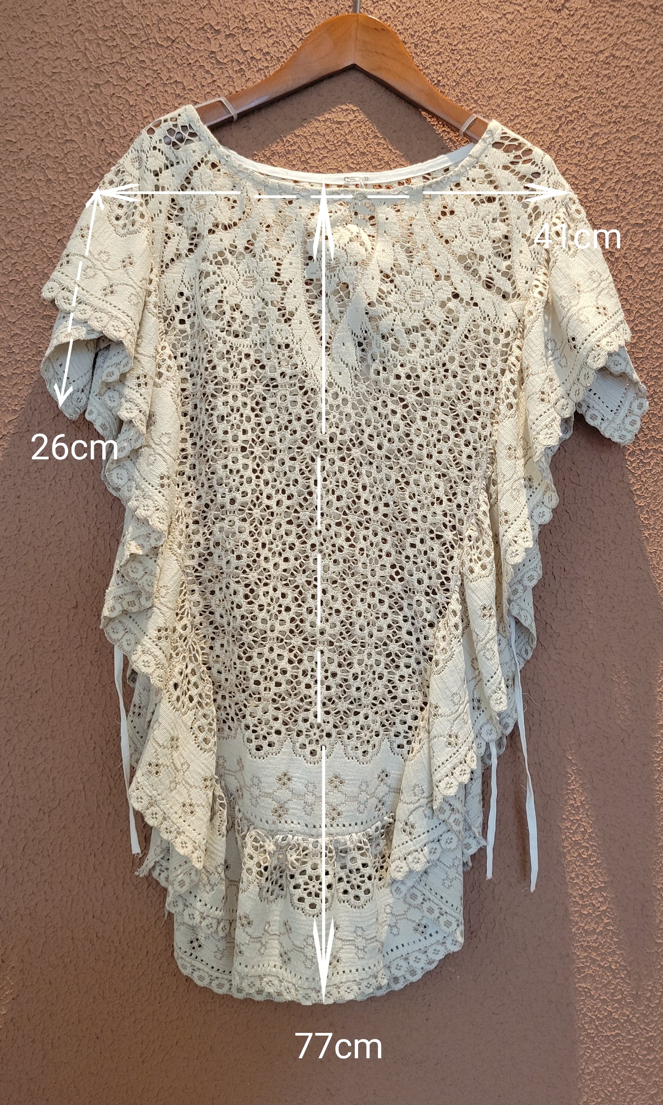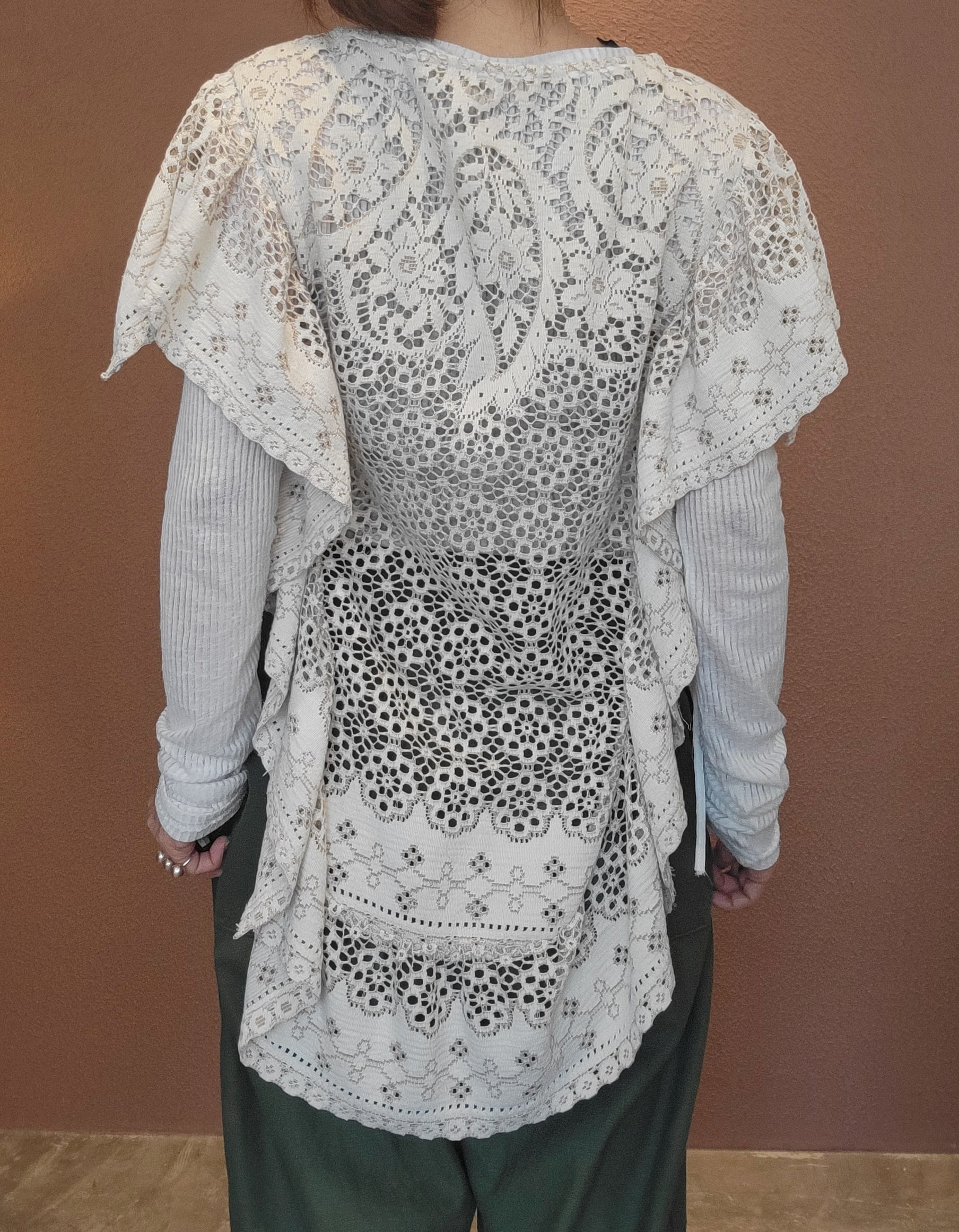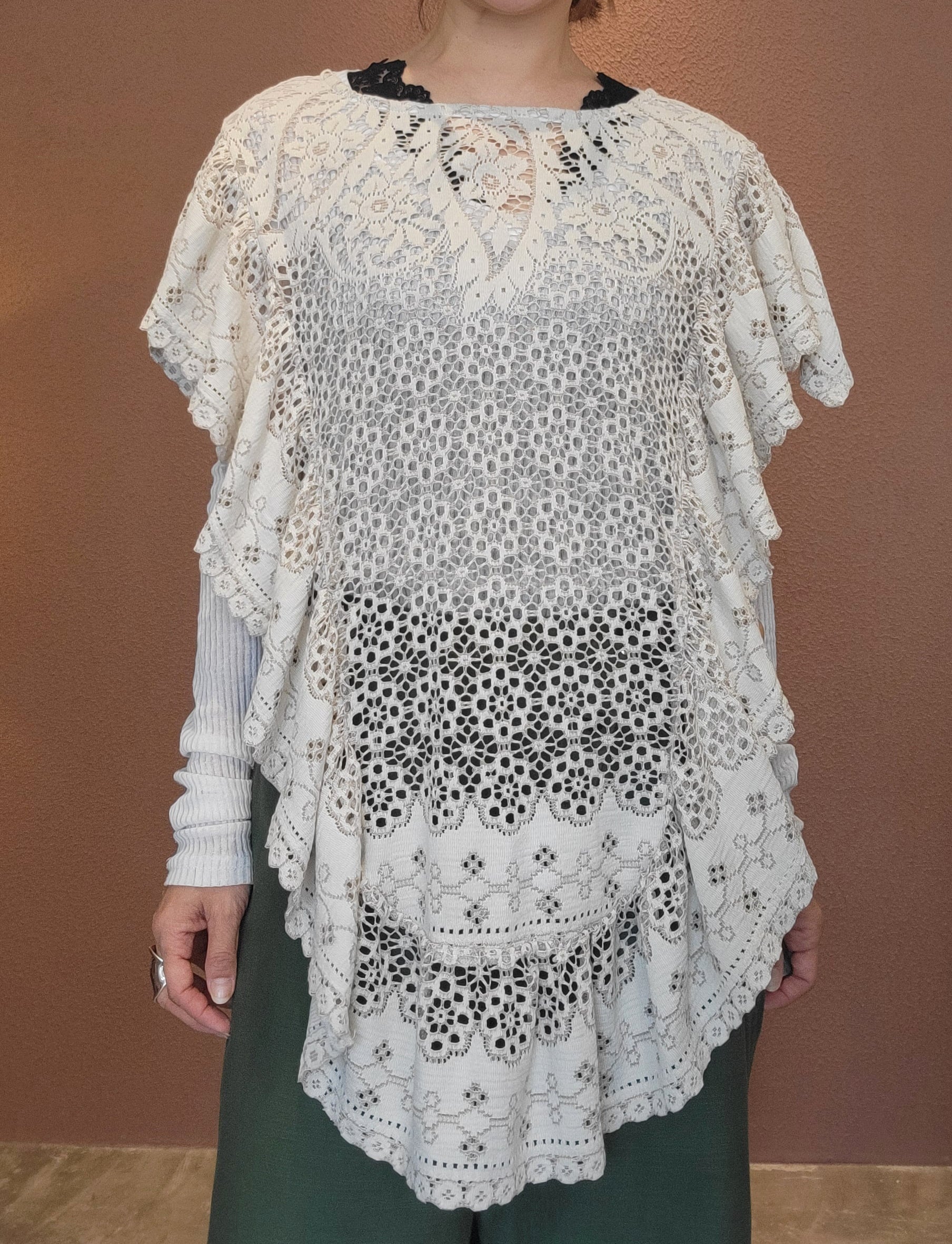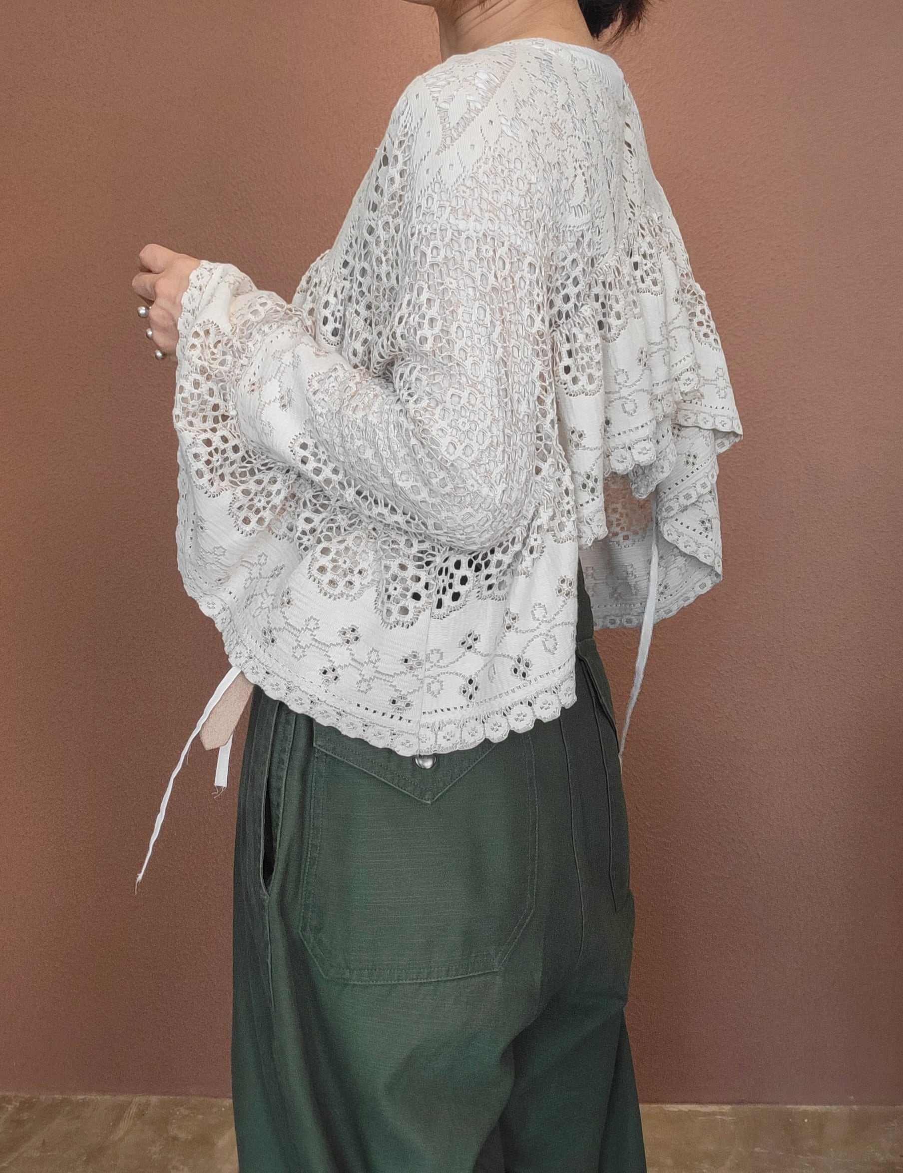 ヴィンテージレースを使用した2wayリメイクトップス。素材表記はありませんがポリエステルとコットンの混紡素材ようです。軽くて柔らかい素材感です。ポンチョのように頭から被るようにして着用します。どちらの向きで着用する場合もサイドリボンを結ぶことで安定感を保てます。横向き(丈が短くなる方)で着る場合は袖下に付いているスナップボタンを留めるとより安定感が増します。通気の良いレースで涼しく着られ、肌の露出もほどよく抑えてくれるので夏の羽織としてもぴったりです。