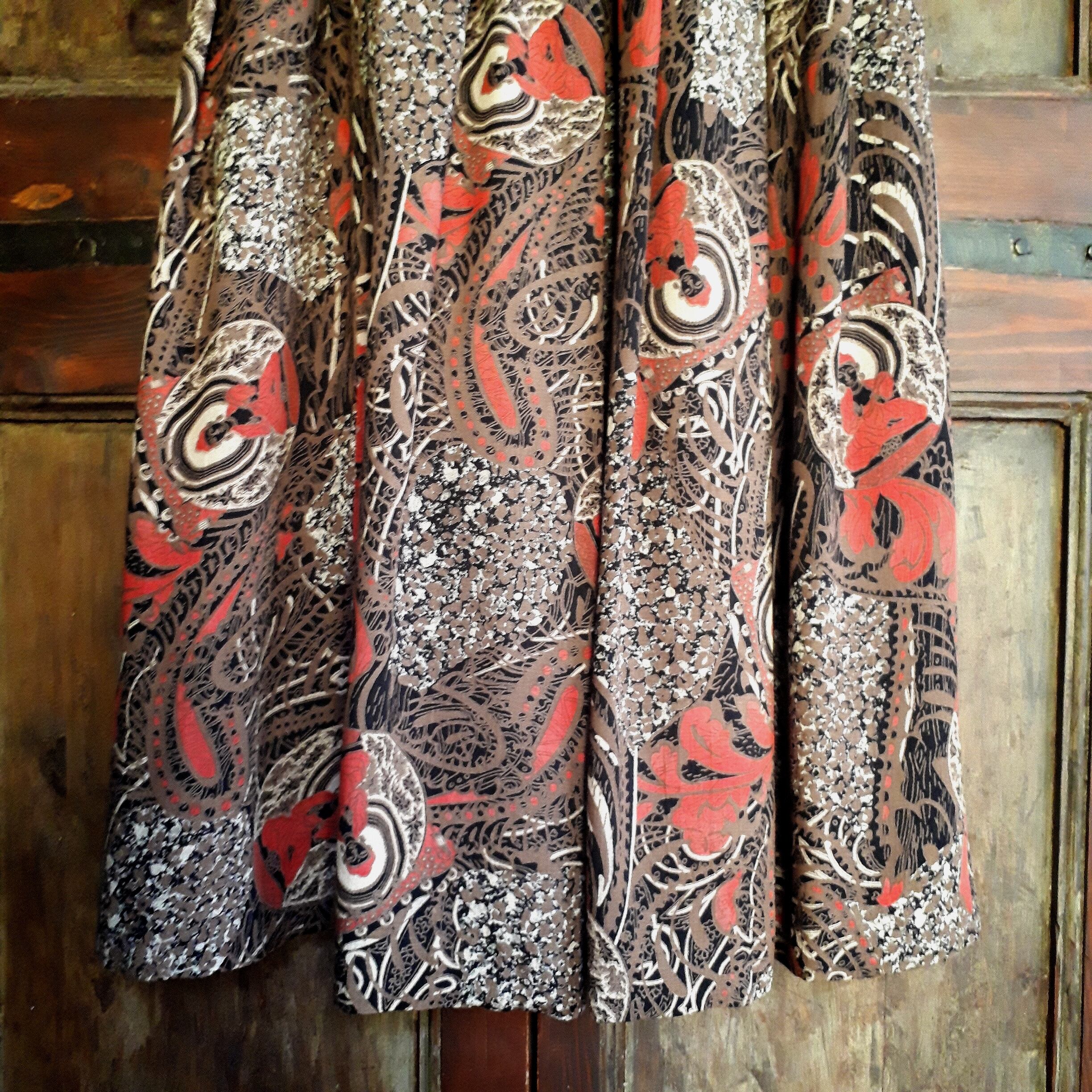 BUDDAプリントが個性的なヴィンテージの総柄ギャザースカート。100%ビスコース素材。ウエストはゴム仕様、左右両サイドにポケット付きです。個性的なプリントながらも落ち感のある素材と落ち着きある色合いが大人っぽい1枚です。