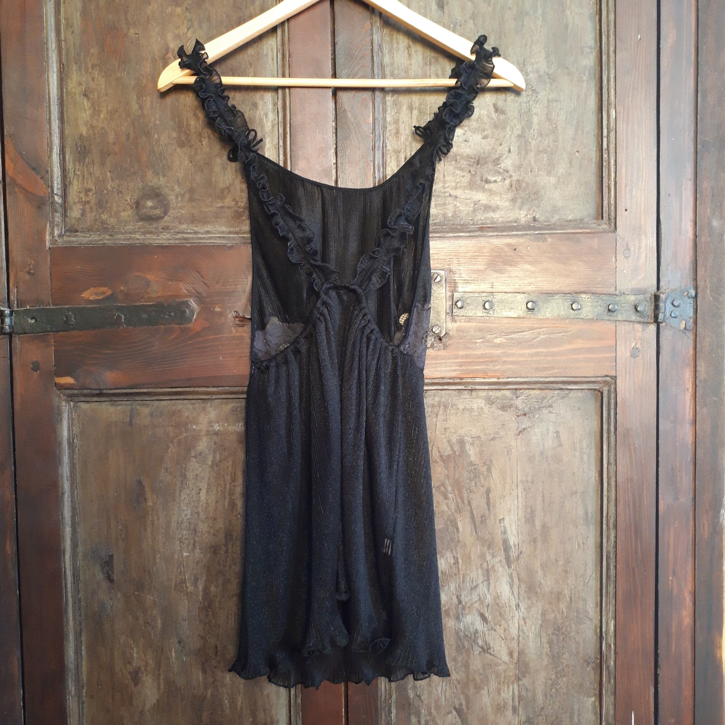 ウエスト周りの繊細なレースと肩紐のフリルが素敵なシアーキャミソール。ユーロヴィンテージです。下に着るものによって色んなスタイリングを楽しめる1枚です。バックスタイルも個性的でおすすめです。