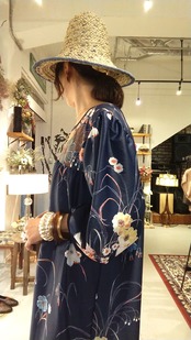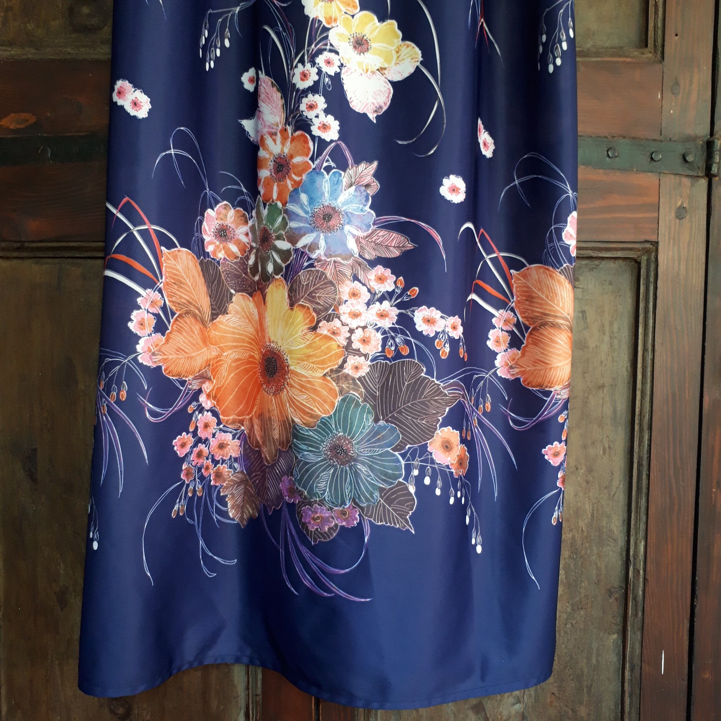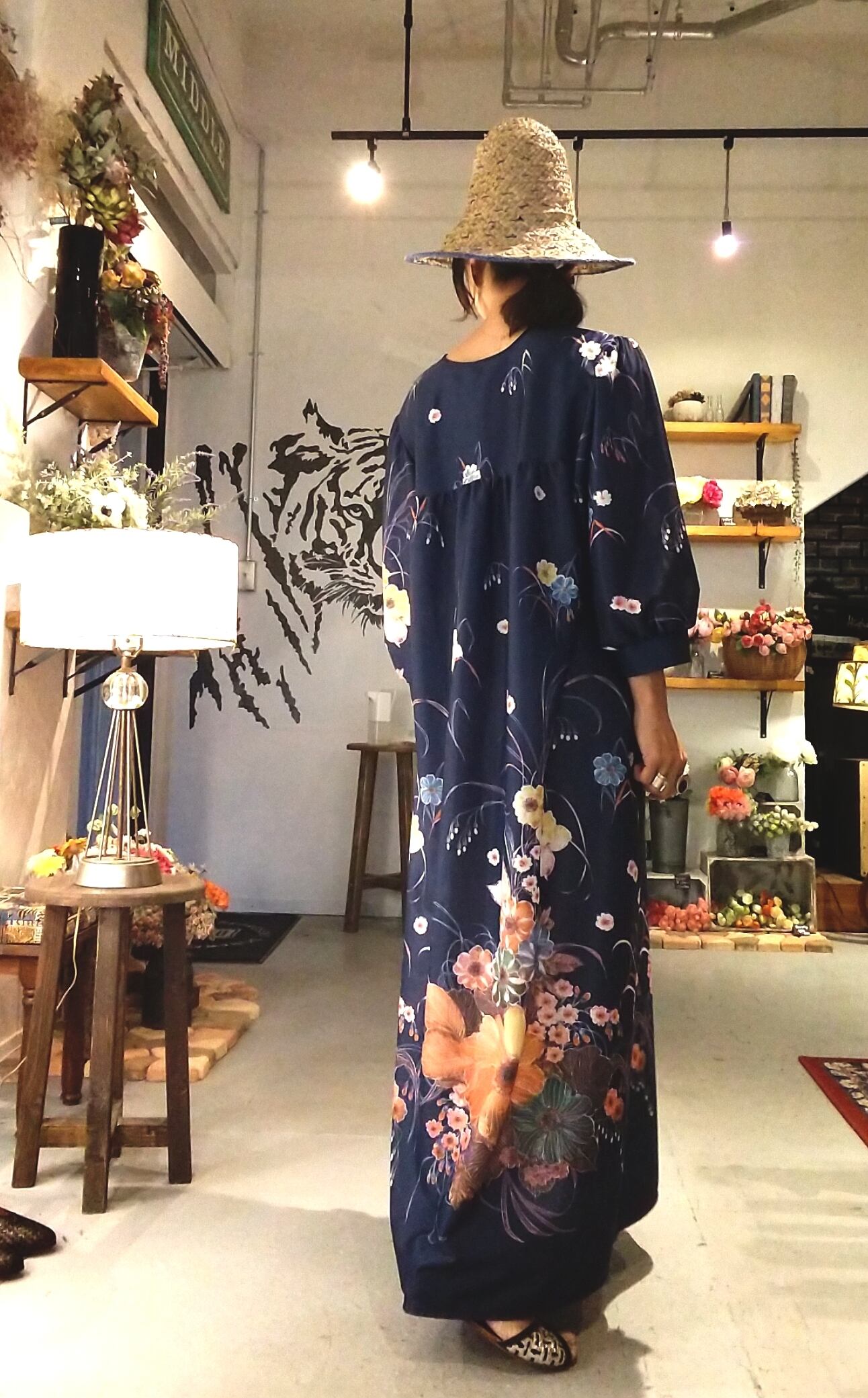 ネイビーの地に大柄の花が映えるヴィンテージマキシワンピース。素材表記はありませんがポリエステルのようです。透け感はありません。ボリュームスリーブに締め付け感のないゆったりしたシルエットでリラクシングな雰囲気が漂います。