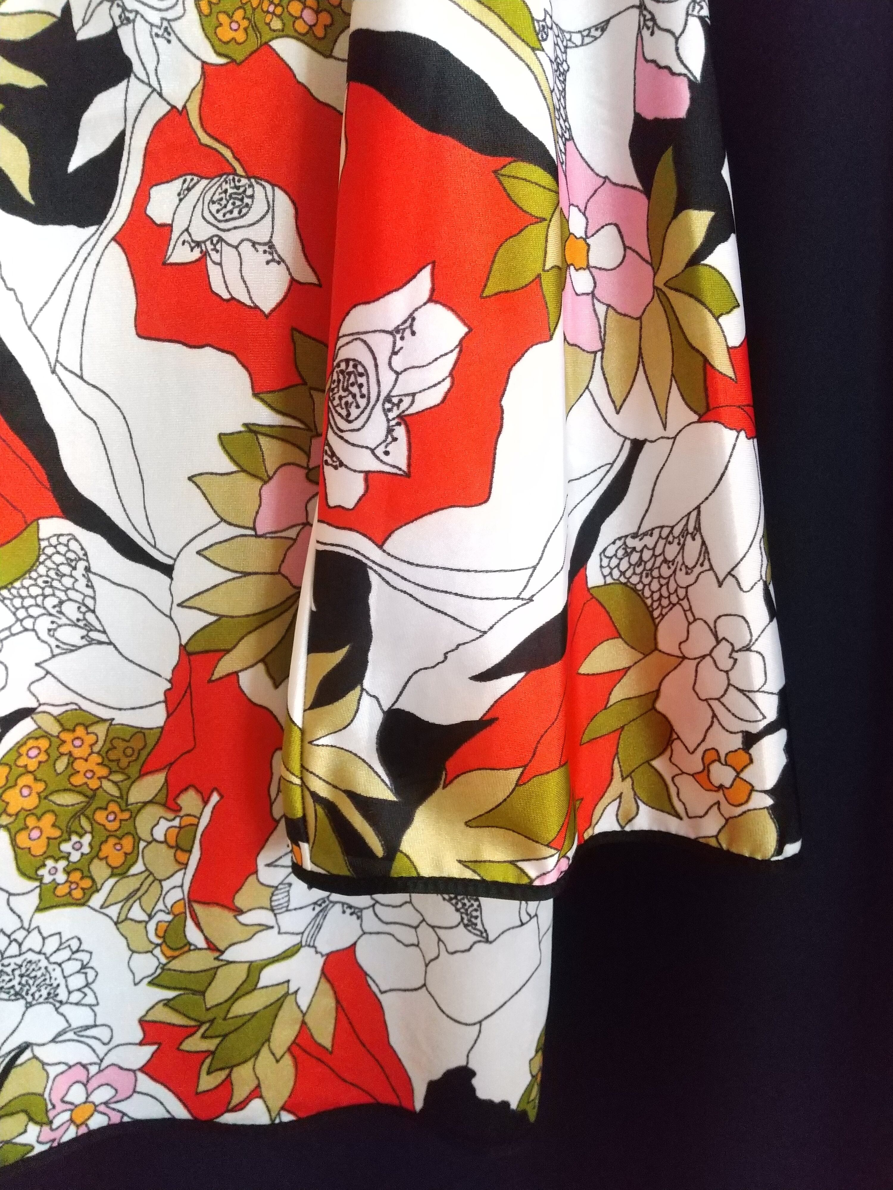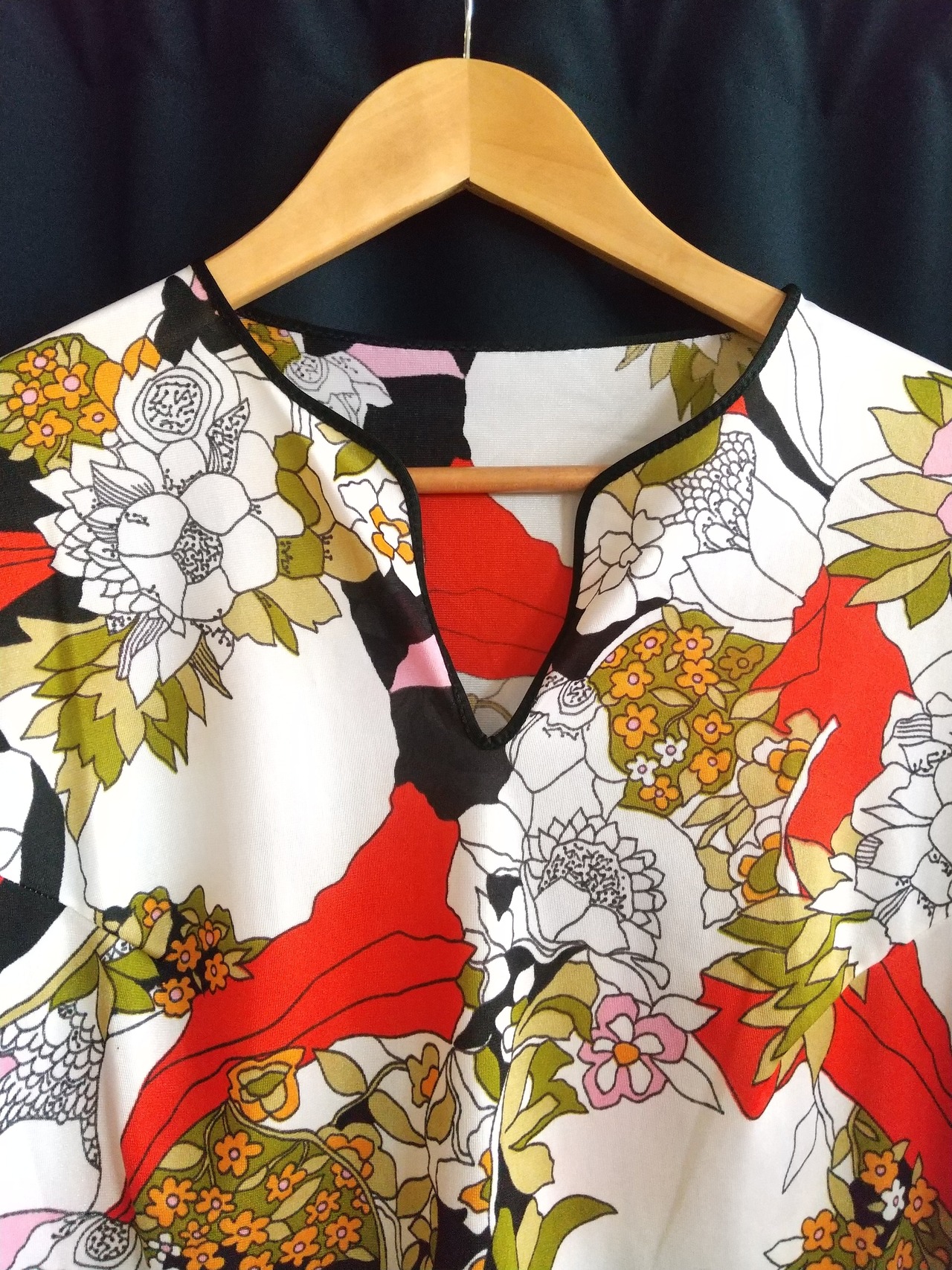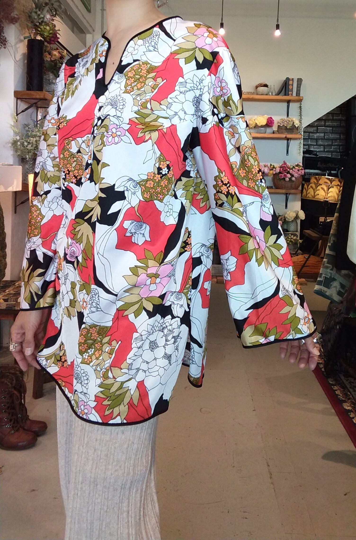大柄のプリントトップス。素材表記はありませんが薄手のポリエステルのようです。若干の透け感があります(ほとんどありません)。黒のパイピングに太めの袖がオリエンタルな雰囲気。おしりの隠れる長さです。合わせるボトムによってカジュアルにもエレガントにも仕上がる1枚。