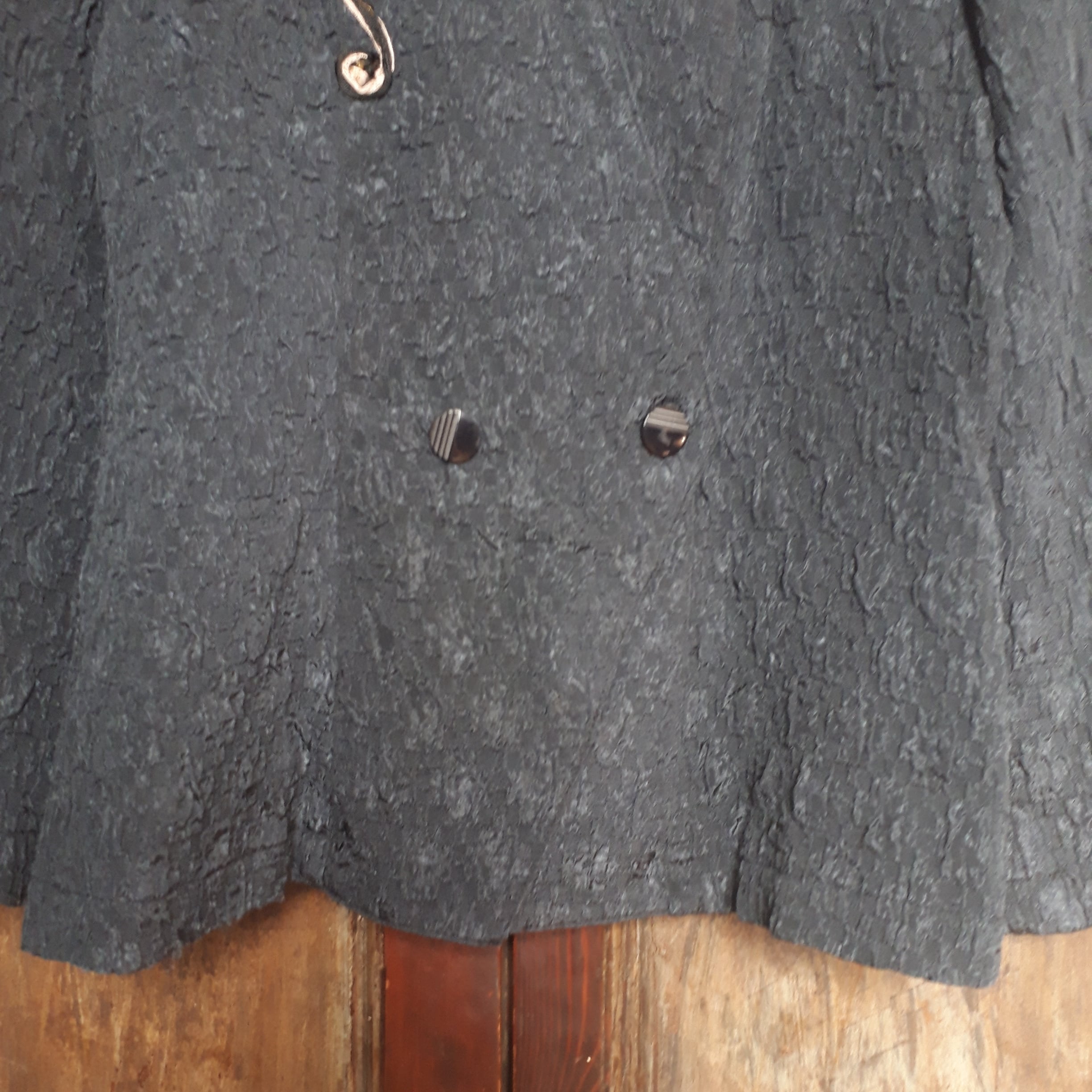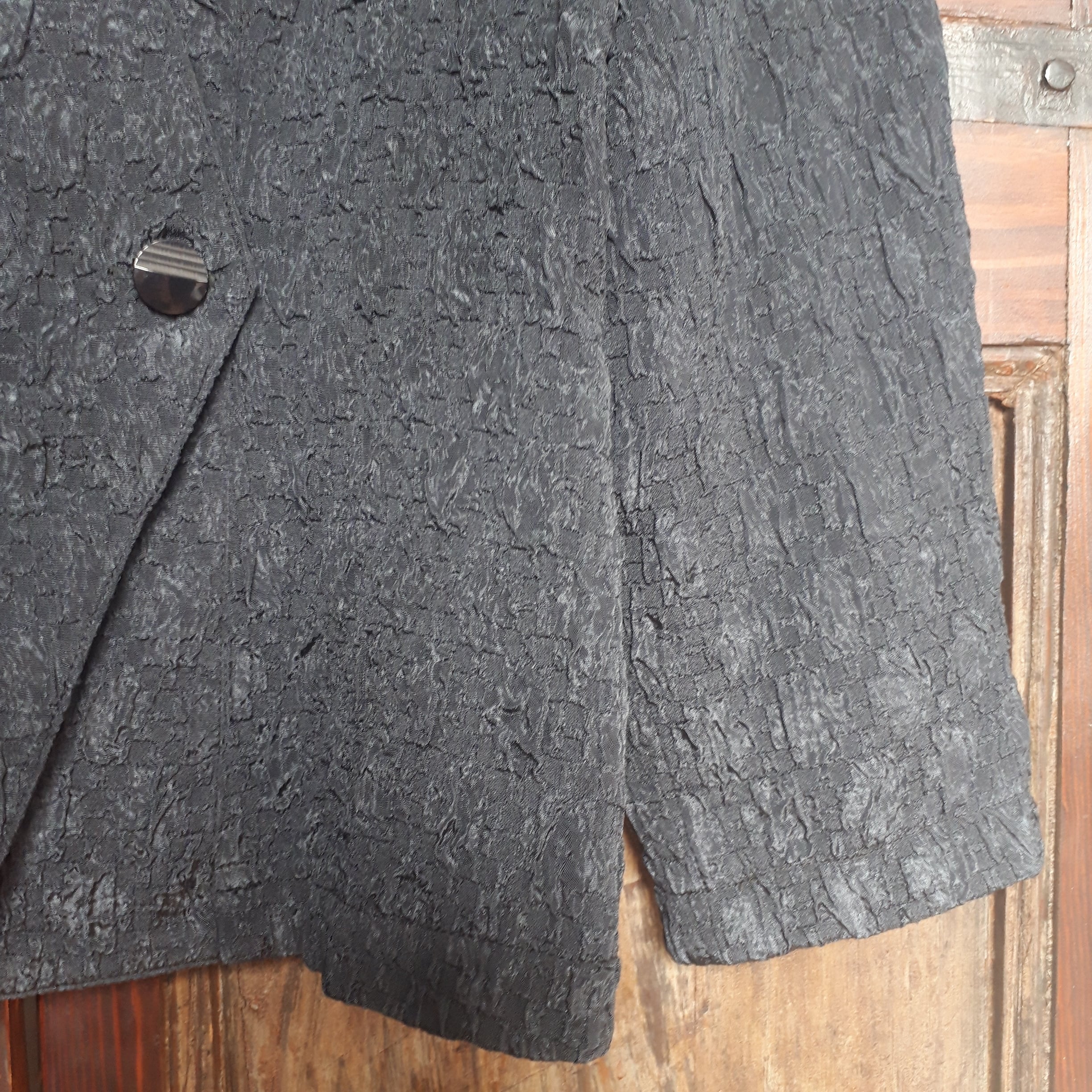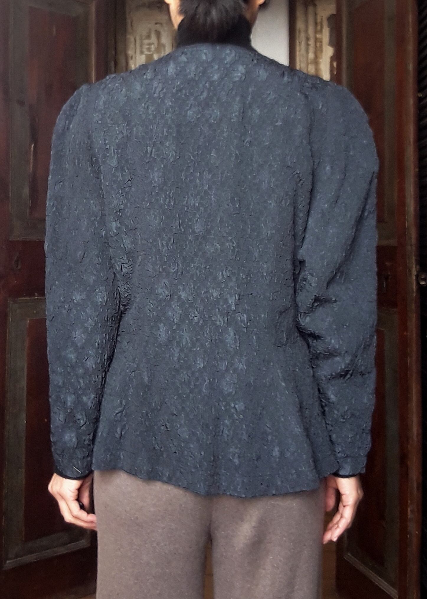 浮き出る地模様に肩の流れるような刺繍がエレガントなフランス製ヴィンテージジャケット。素材はレーヨンです(裏地はポリエステル)。ノーカラー、黒地、軽量のため気負わずカジュアルに使えるジャケットです。