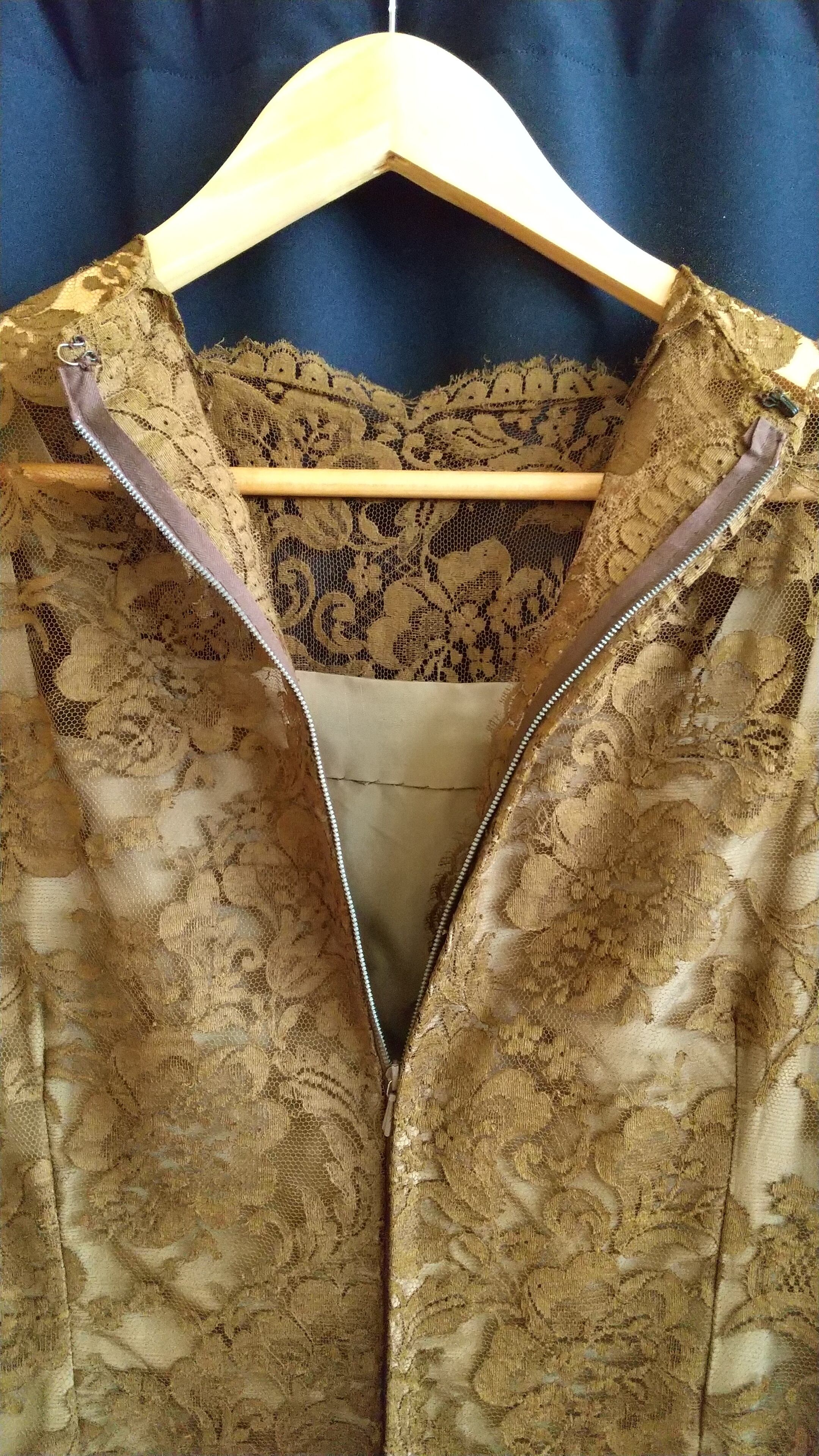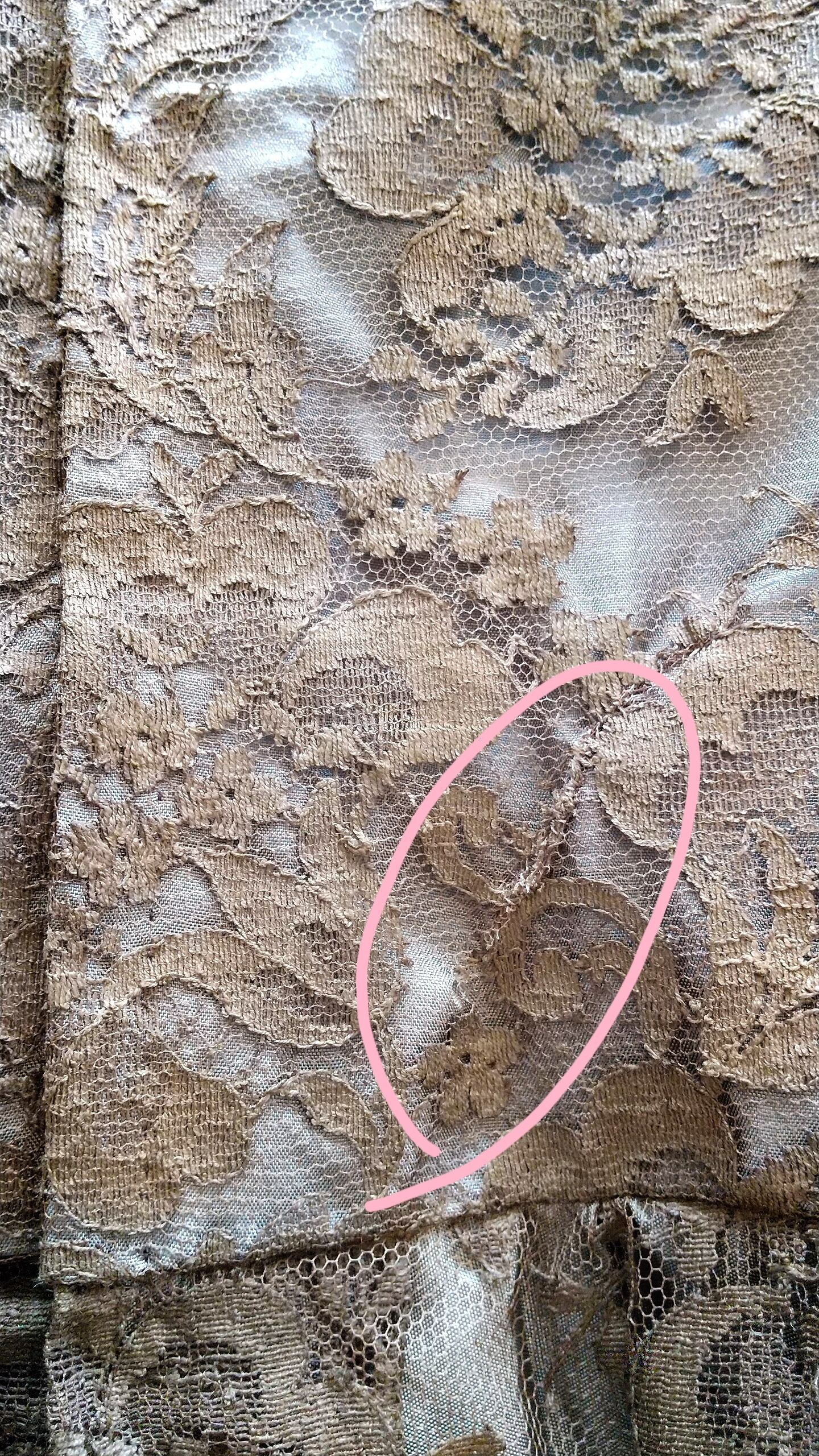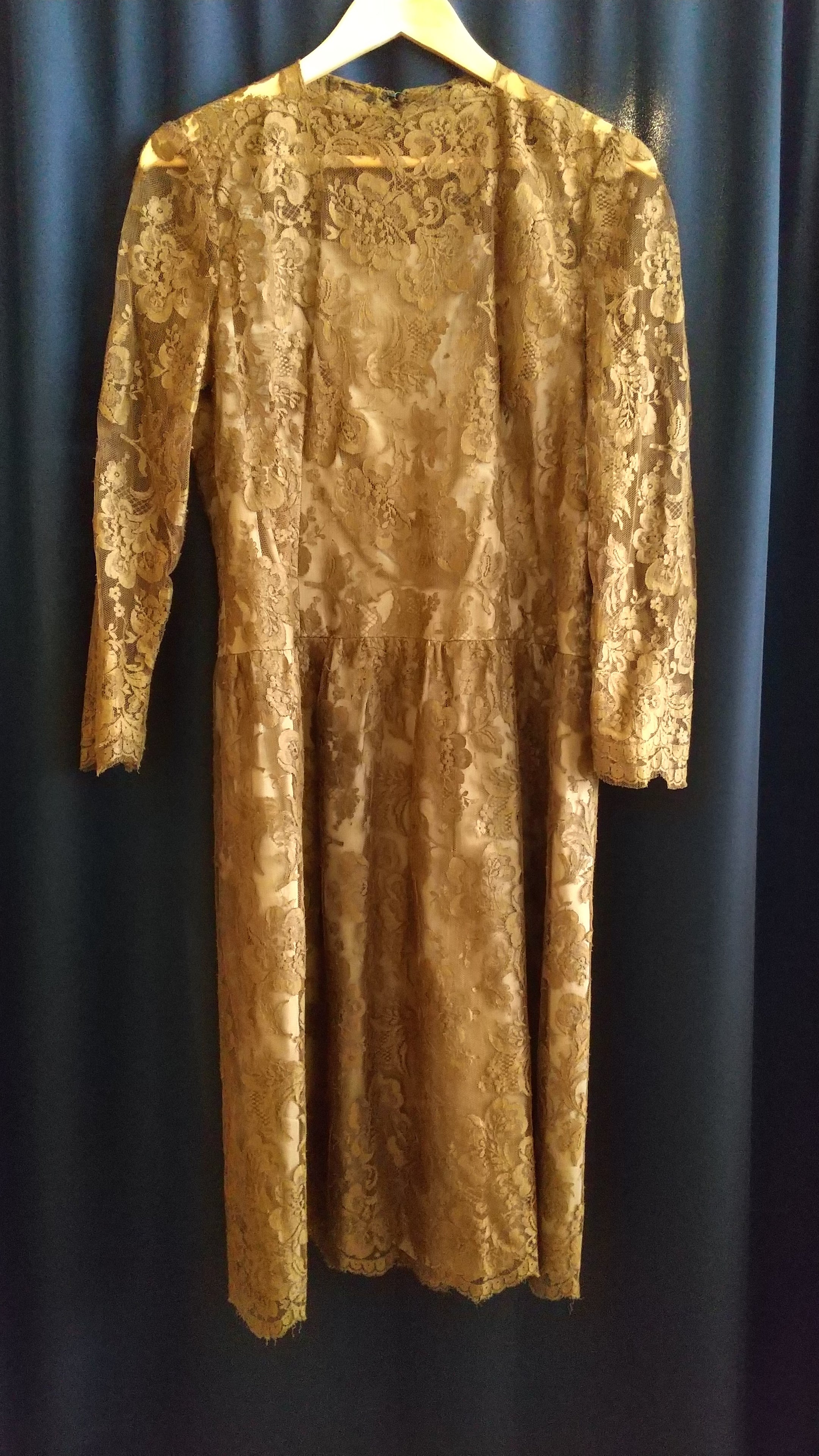落ち着いたブラウンカラーの総レースヴィンテージワンピース。素材表記はありませんがややゴワつき感のある張りのあるレースです。身ごろに裏地付きで1枚で着られます。デコルテと袖に裏地は無くレースの上品な透け感が楽しめます。*後ろ身ごろ中央腰あたりに3cmほどの修繕跡があります。画像にてご確認ください。ほとんど目立ちませんがヴィンテージへのご理解をいただける方へおすすめいたします。