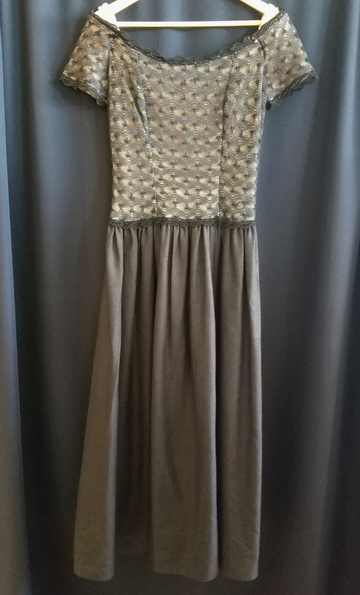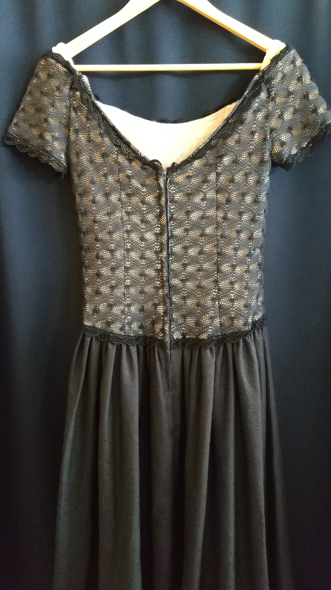 クラシカルなヴィンテージブラックドレス。アメリカの古き良き50年代の雰囲気を纏う美しいドレスです。上半身部分にはメッシュの裏地付き。デコルテ周りと上半身の裏地4箇所に縦にワイヤーが通っておりウエスト周りに生地のたるみが出ないよう凝った作りになっています。そのため着用時のシルエットが非常に綺麗に保たれます。