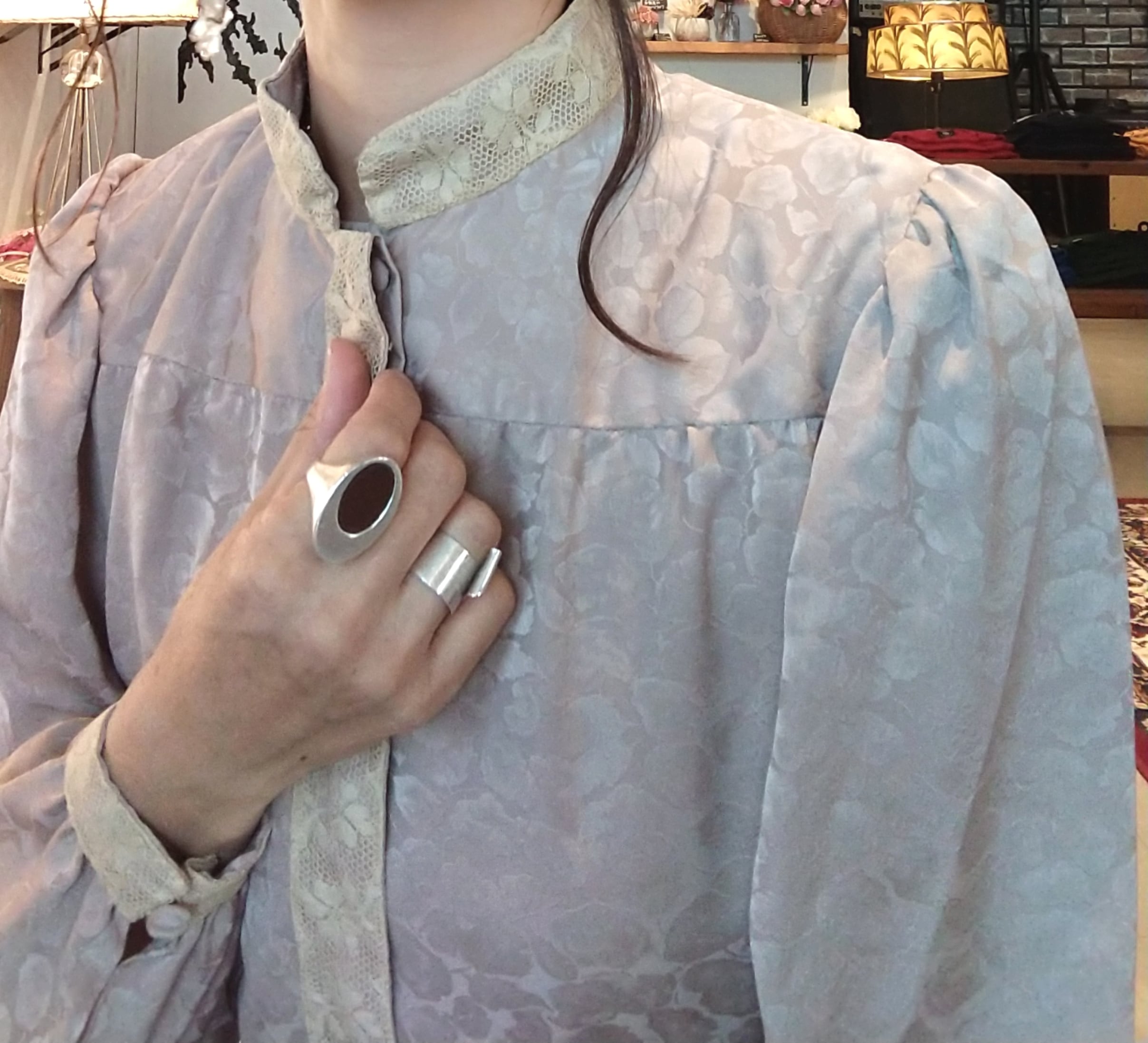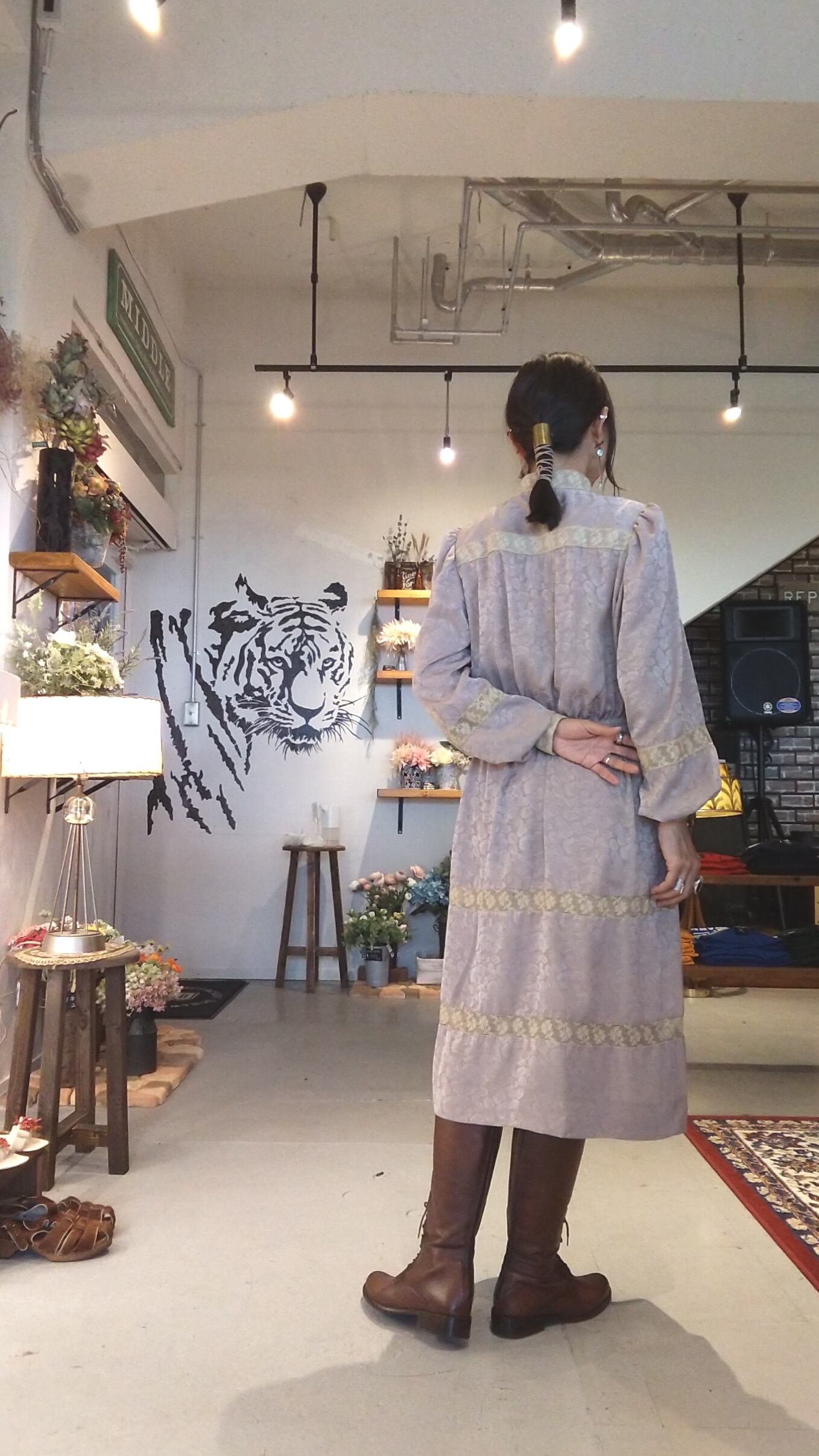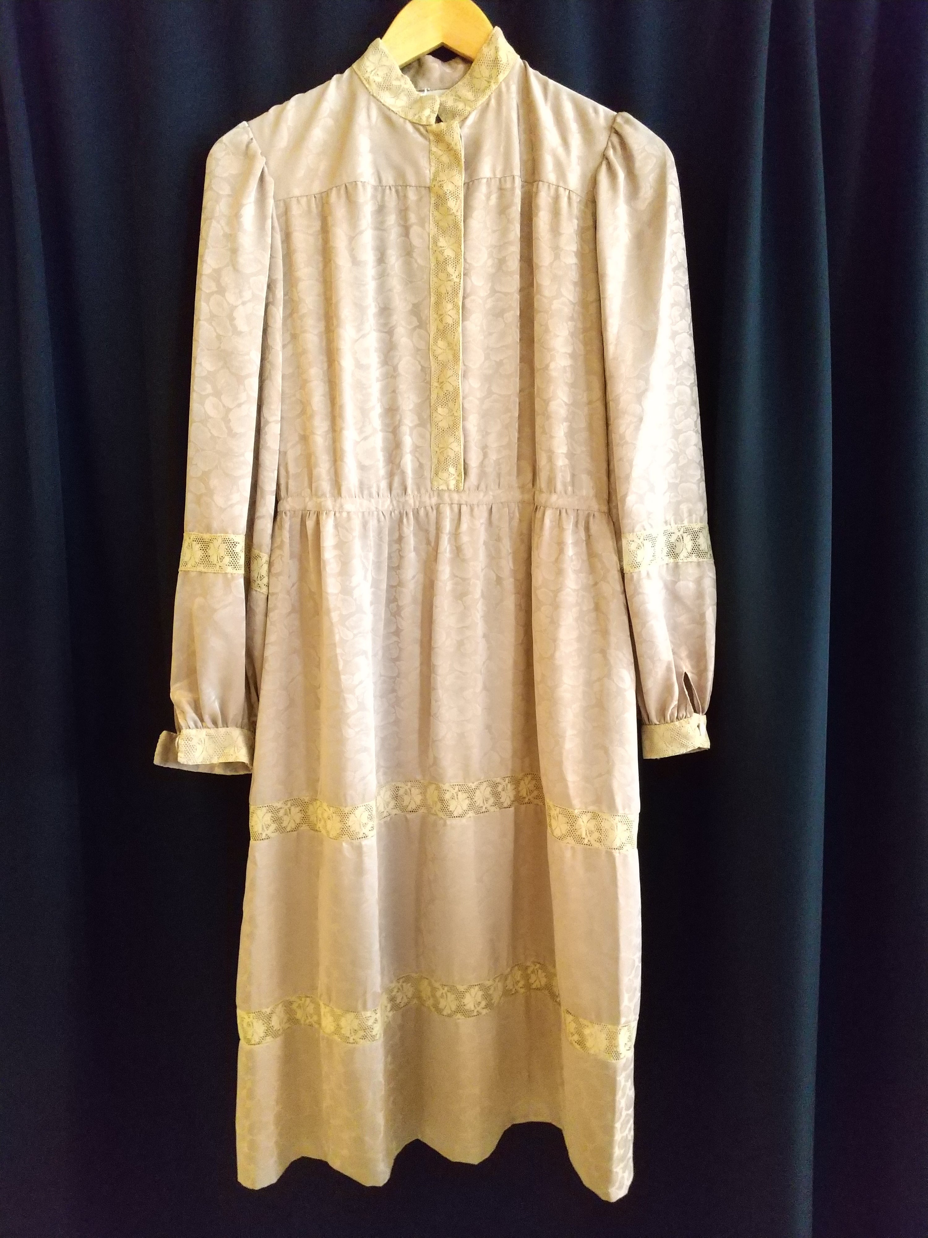 ピンクベージュが優しい印象のヴィンテージワンピース。素材表記はありませんがポリエステルのようです。ポイント使いのレースとやや光沢のある織り柄入りのテキスタイルが華やかさを添えます。