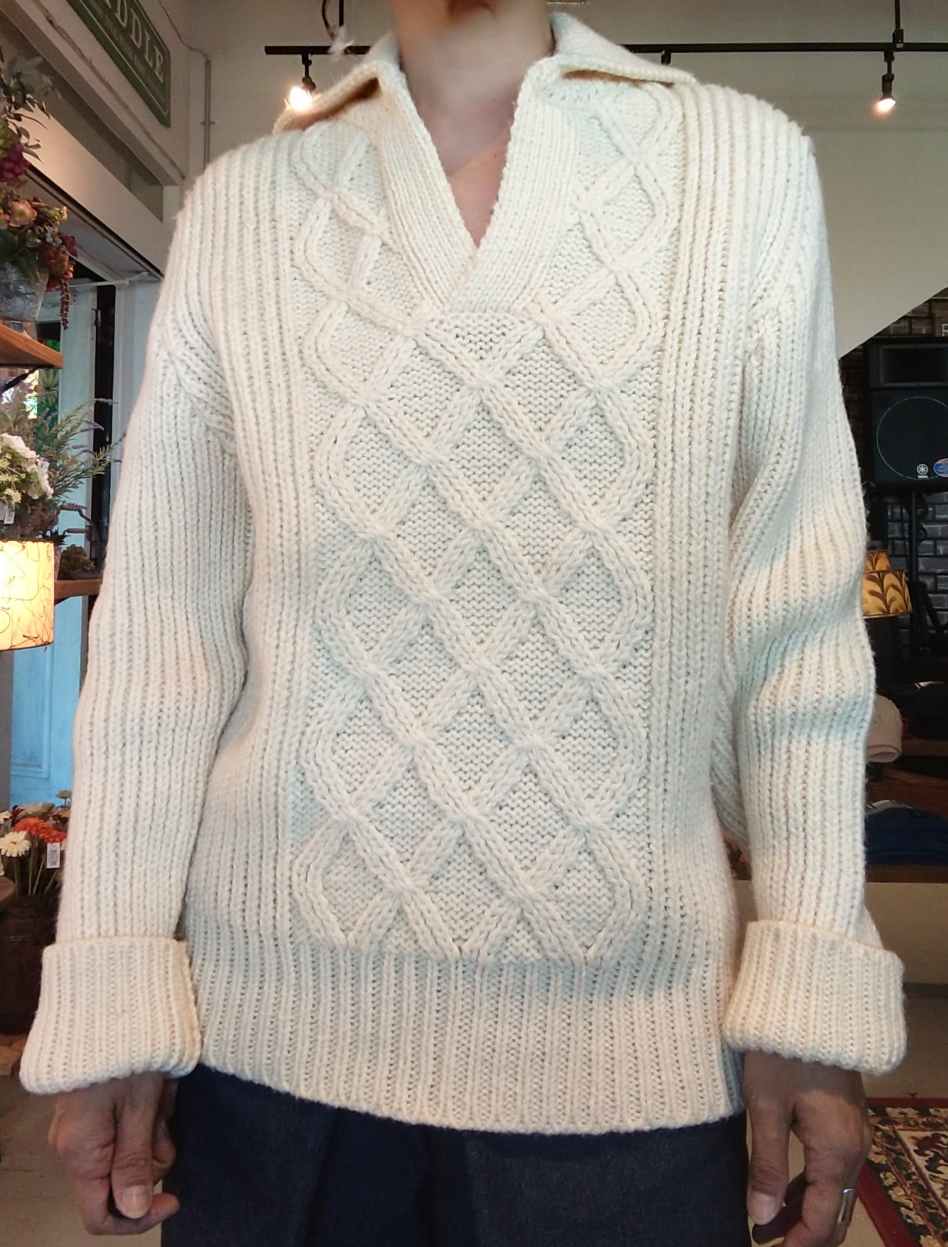 スペイン製のアランニットセーター。セーラーカラーのような珍しい襟付きタイプです。フロントにのみダイヤモンド編みのシンプルデザイン。サイズ感の割には身幅が細めなのですっきりした印象です。