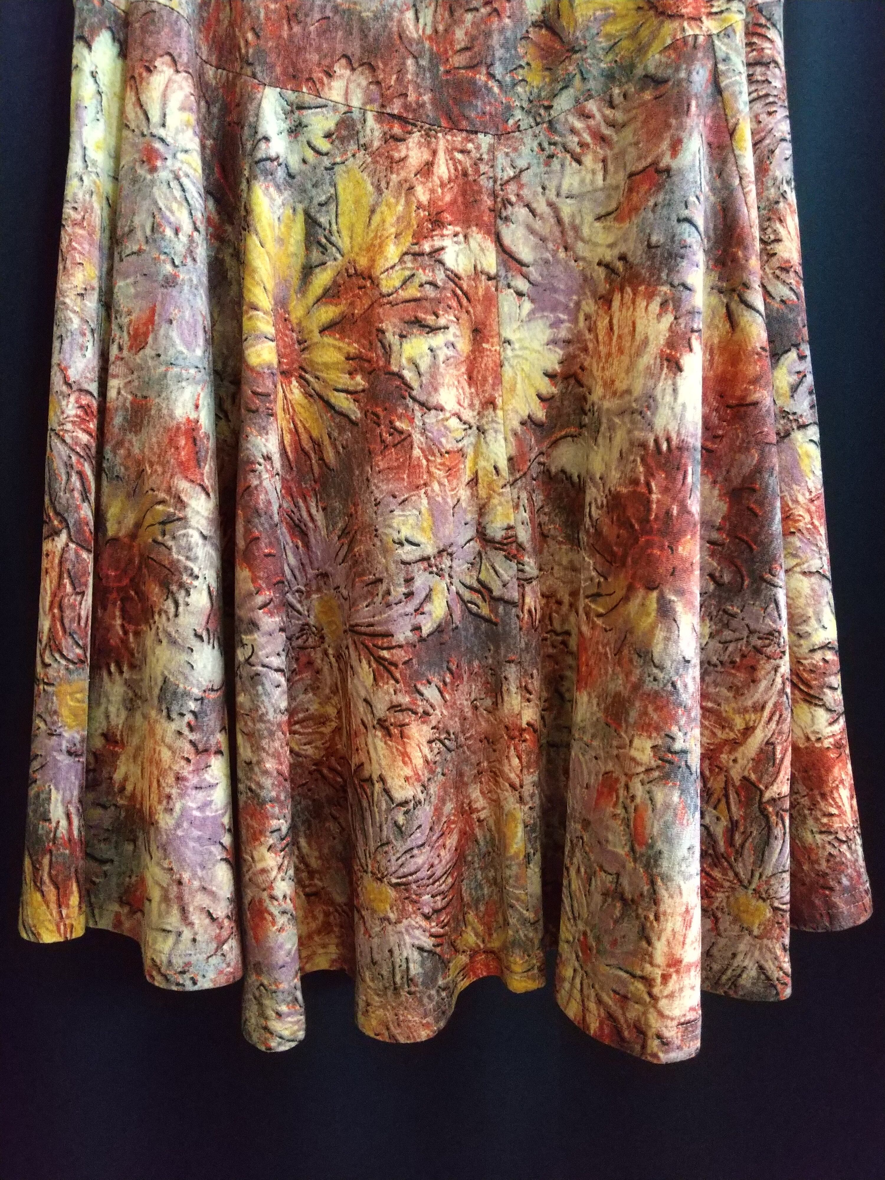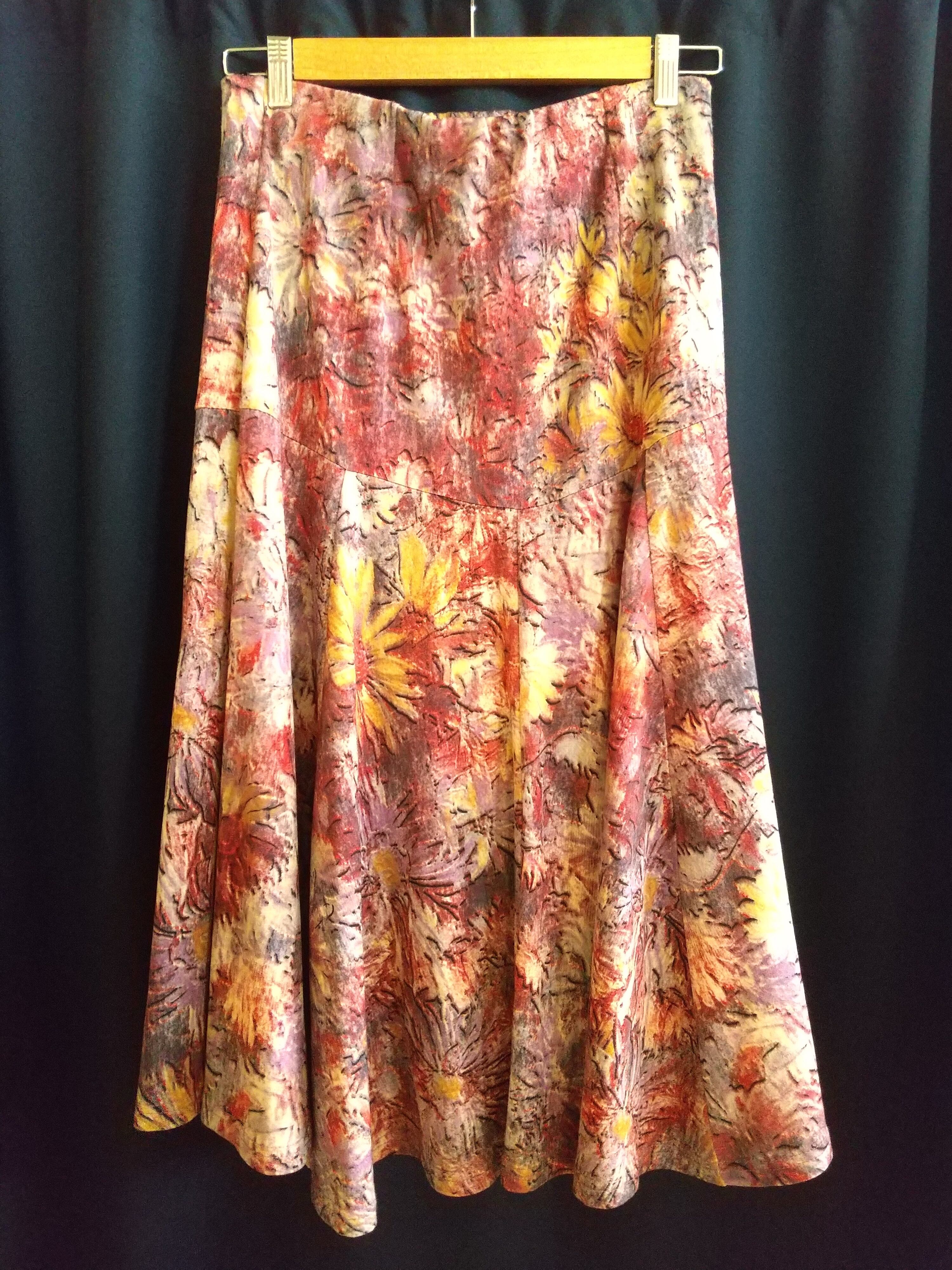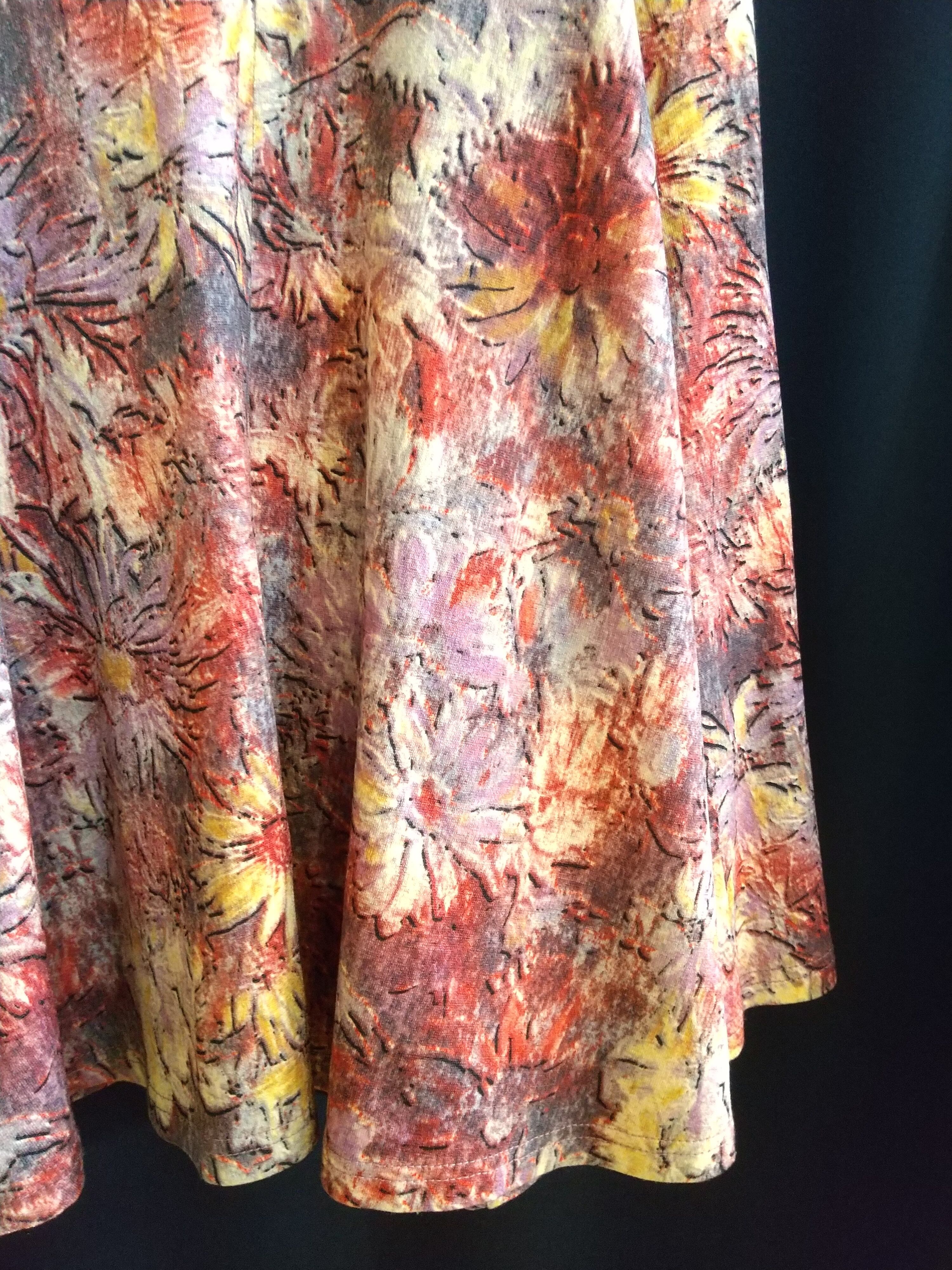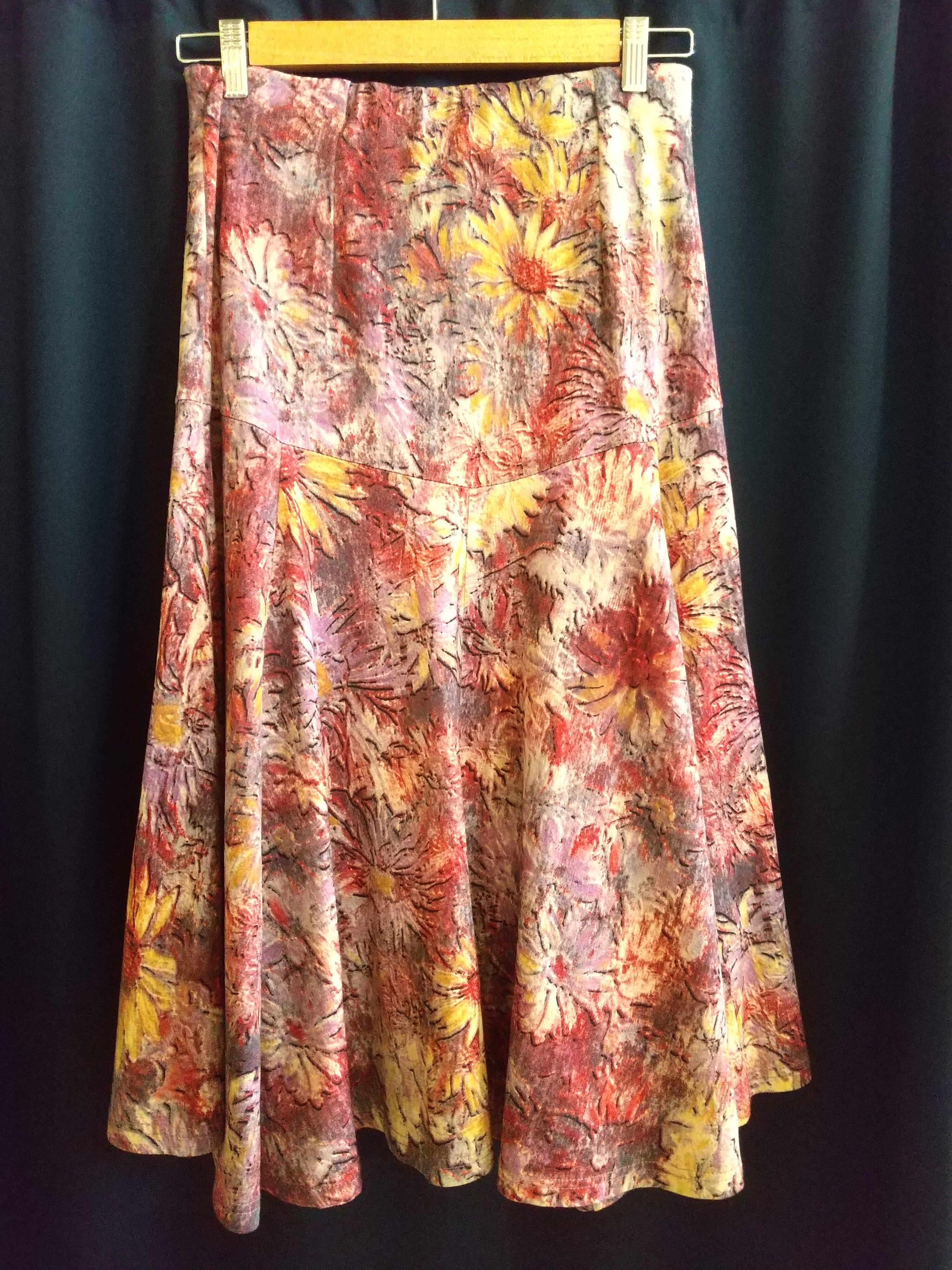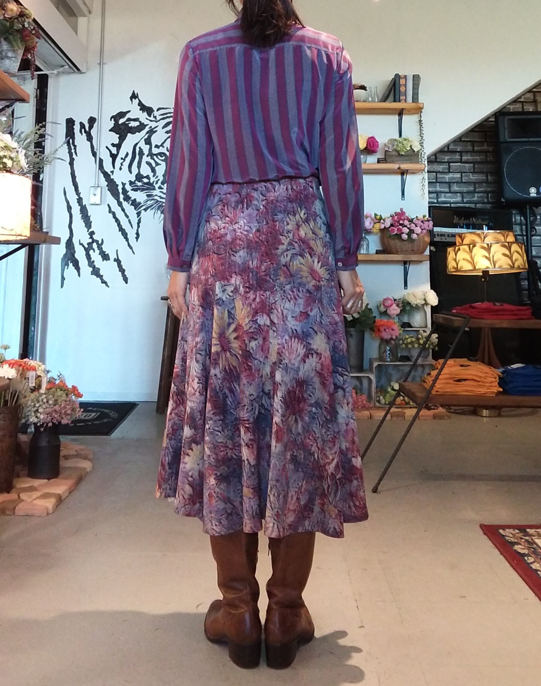 肌触りの優しい起毛ピーチスキンファブリックを使用したヴィンテージフレアスカート。素材表記はありませんが伸縮性のある柔らかなジャージー素材です。ウエストはゴム仕様です。裏地付き。8枚ハギのたっぷりフレアの揺れる様が綺麗です。