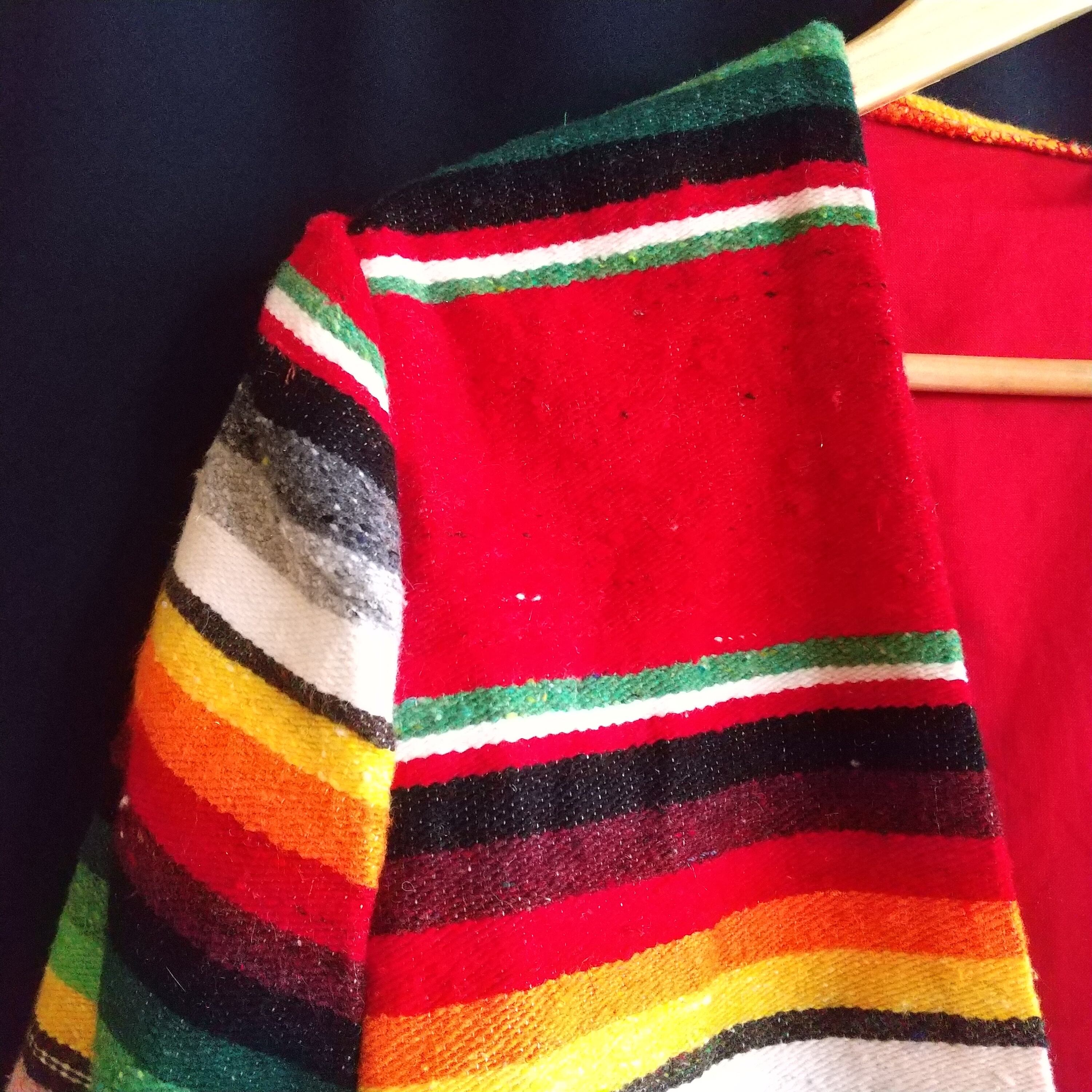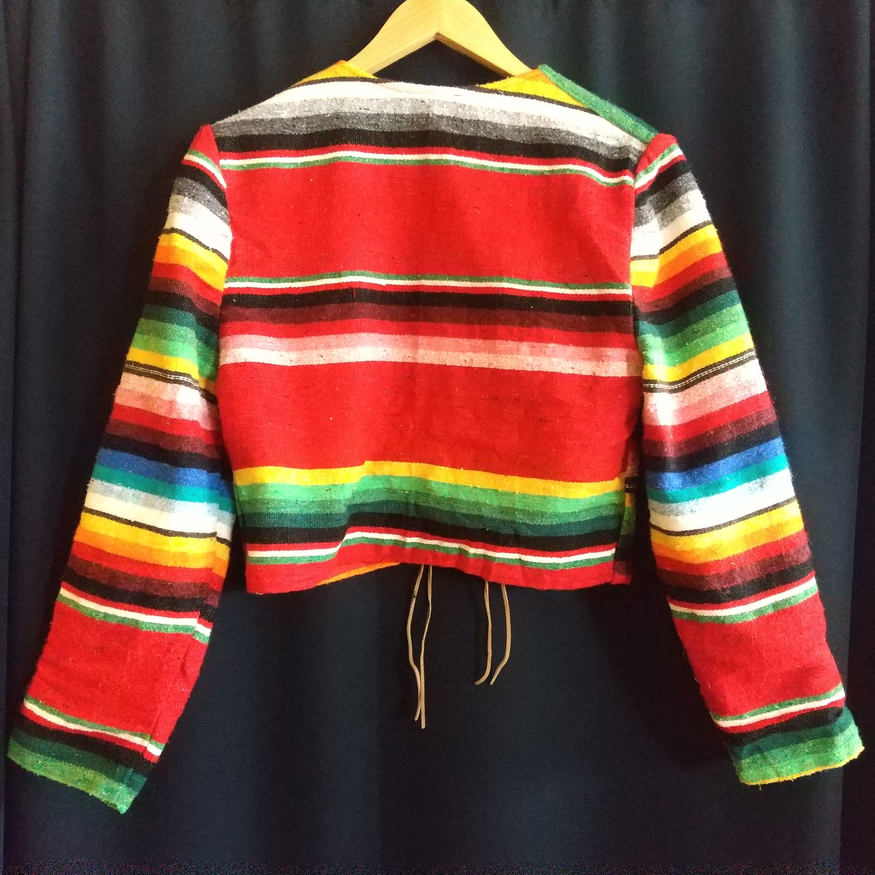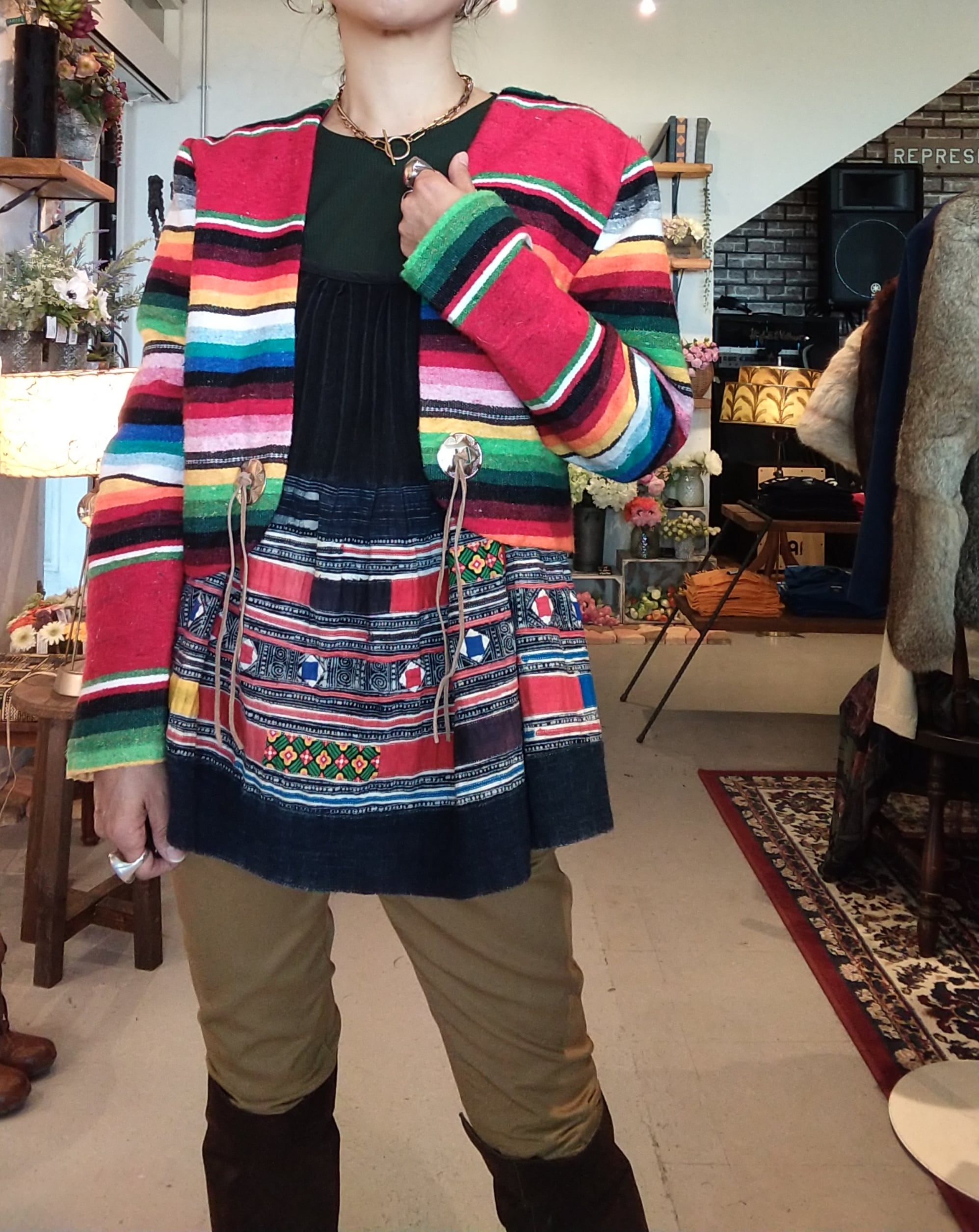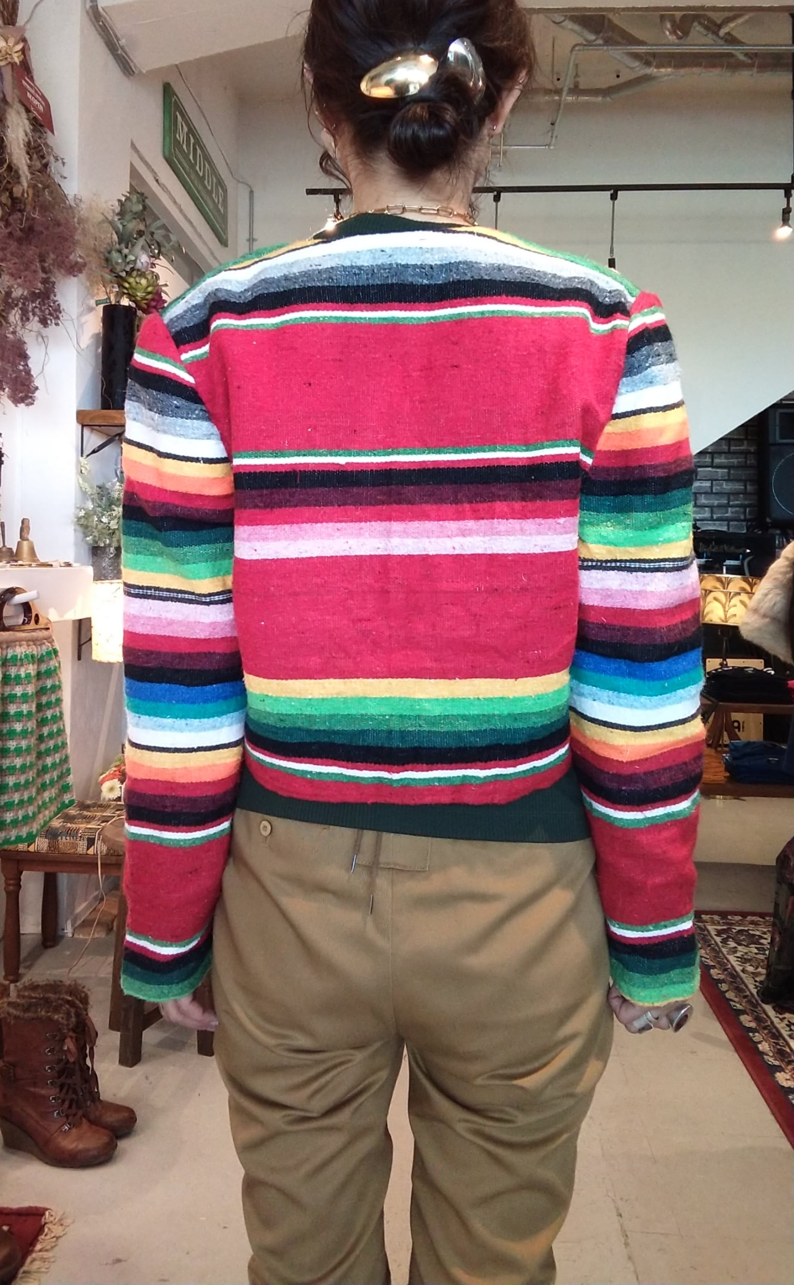 カラフルなボーダーが楽しげなヴィンテージショートジャケット。素材表記はありませんがやや厚手のコットンのようです。裏地は赤の単色。コンチョボタン+レザーストリングがサウスウエスタン風。ハイウエストボトムとの相性抜群です。
