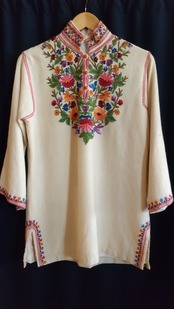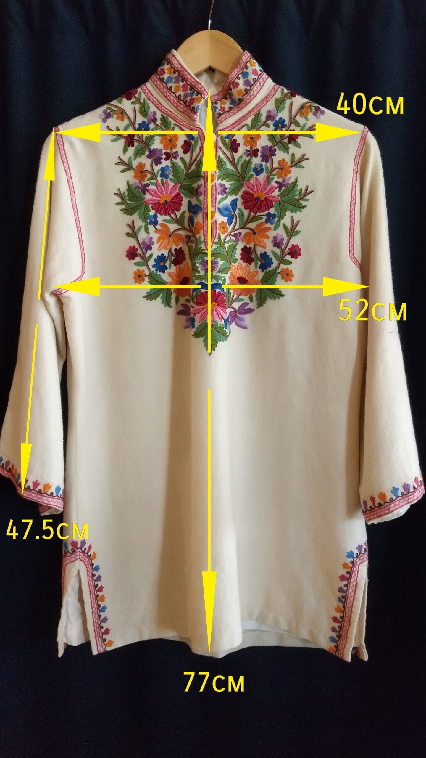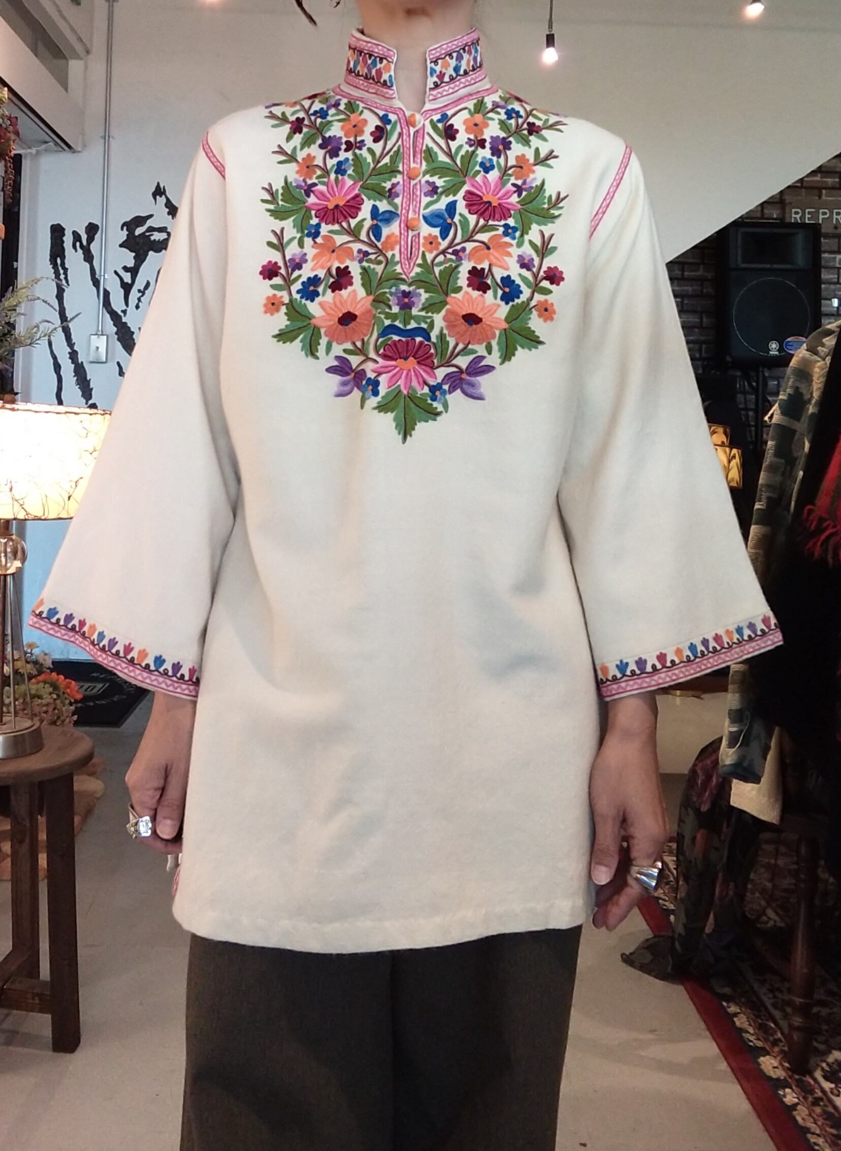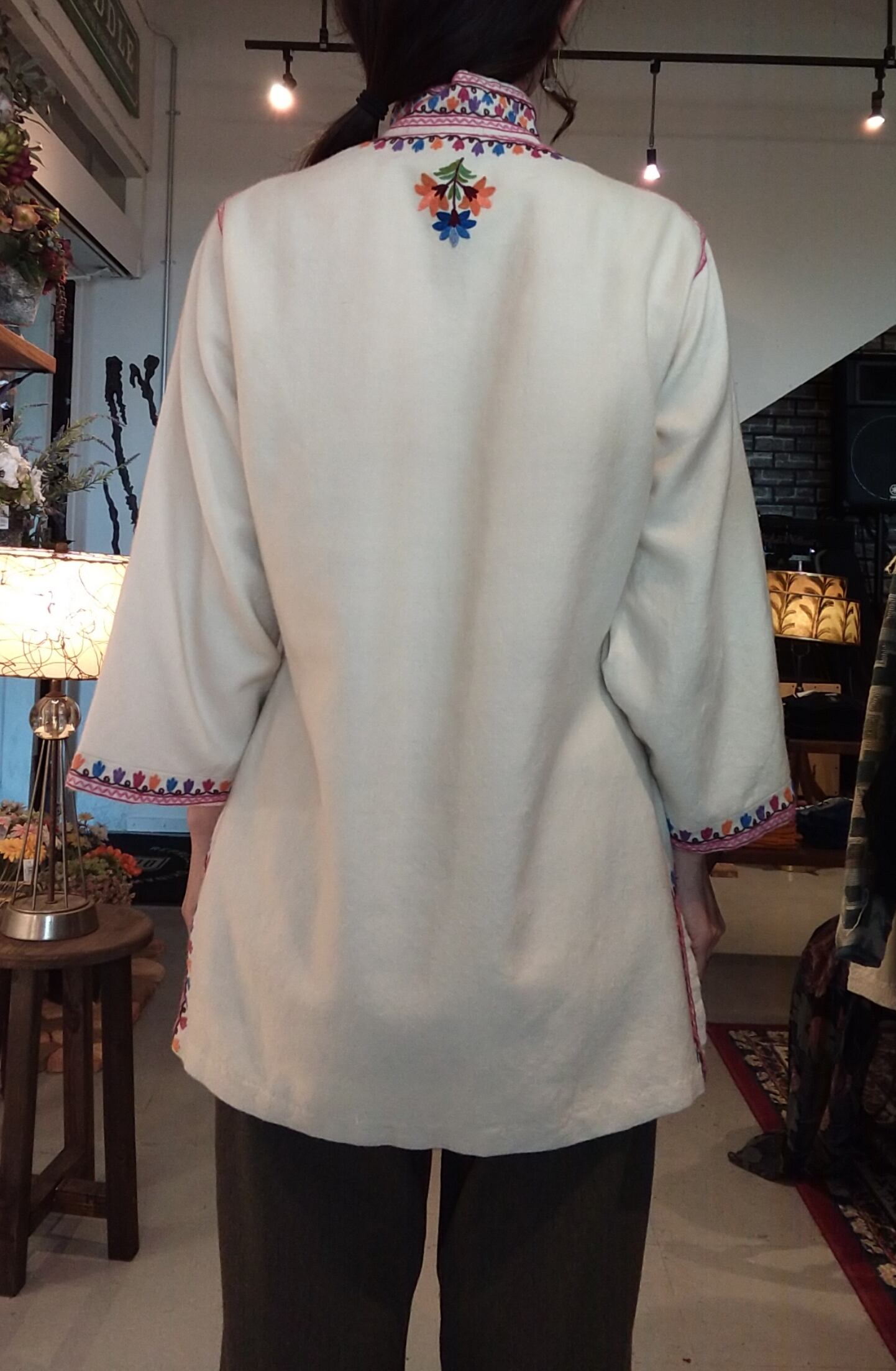 美しい刺繍が魅力のヴィンテージトップス。インドのカシミール地方伝統の古い手刺繍です。素材表記はありませんが非常に肌触りの柔らかなウールのようです。裏地付きで着脱も簡単です。右肩に2cmほどのリペア跡があります。画像にてご確認ください。