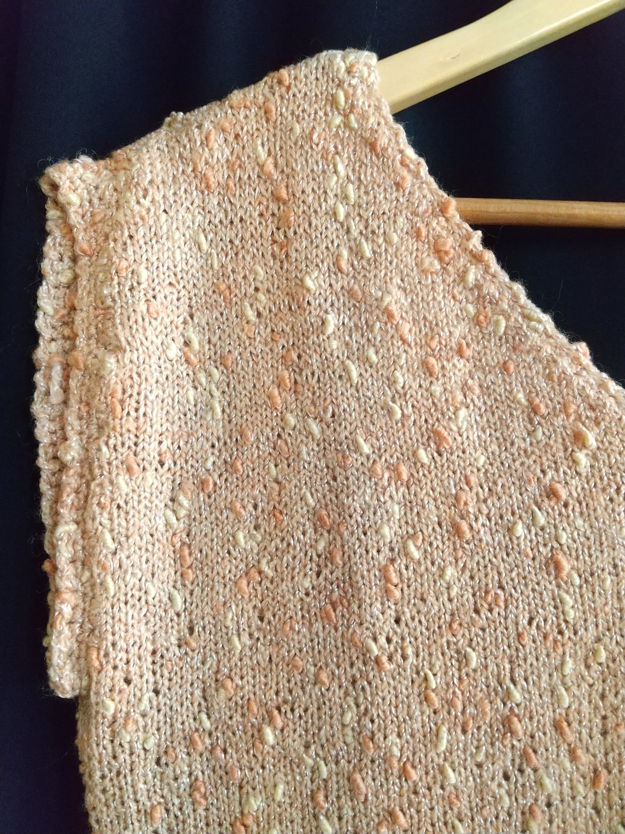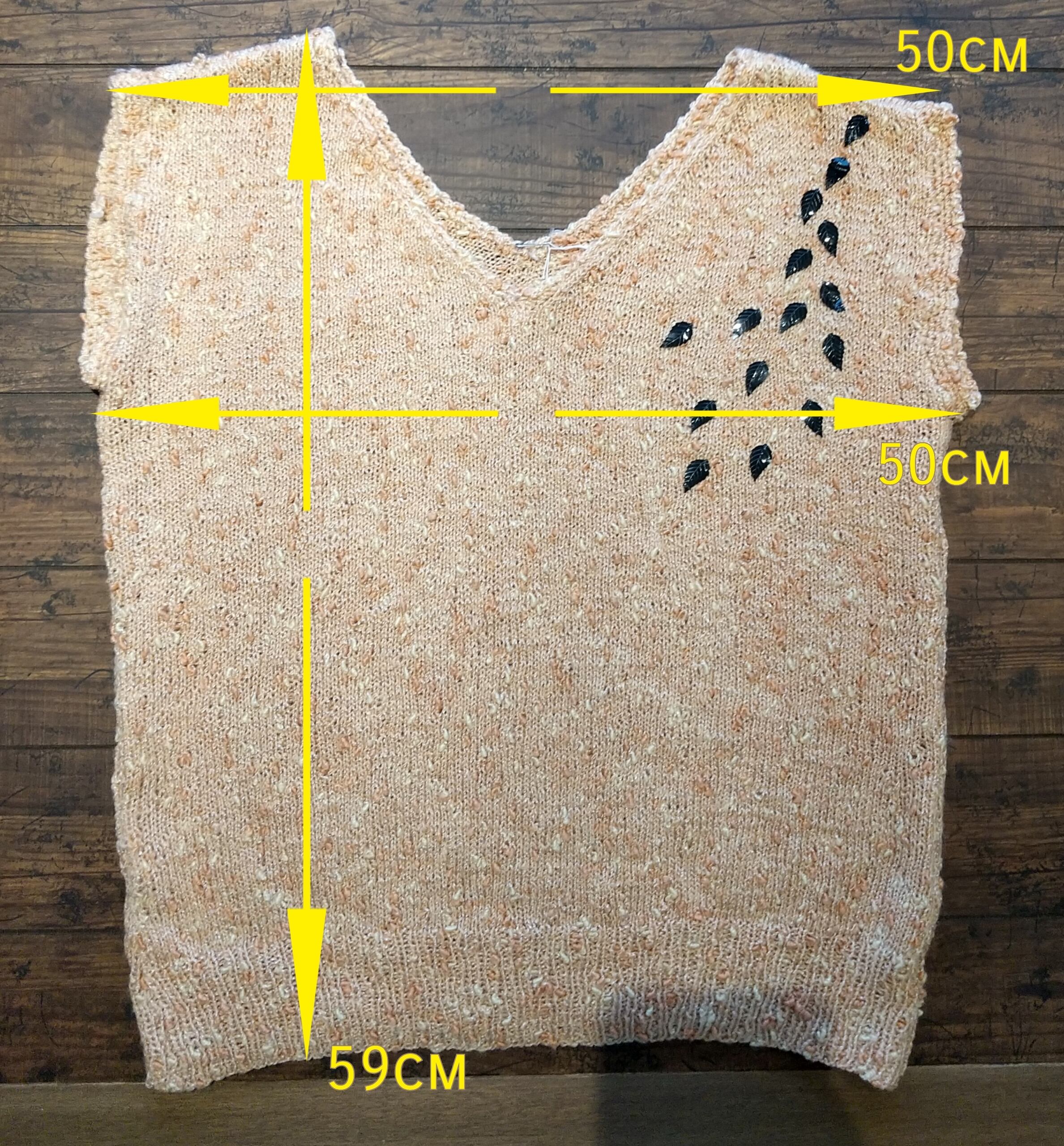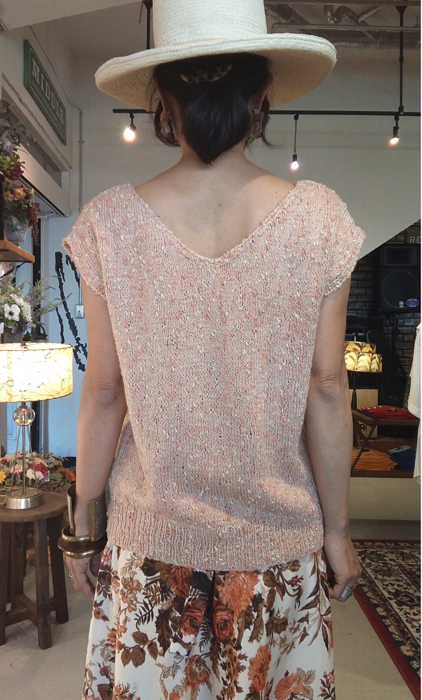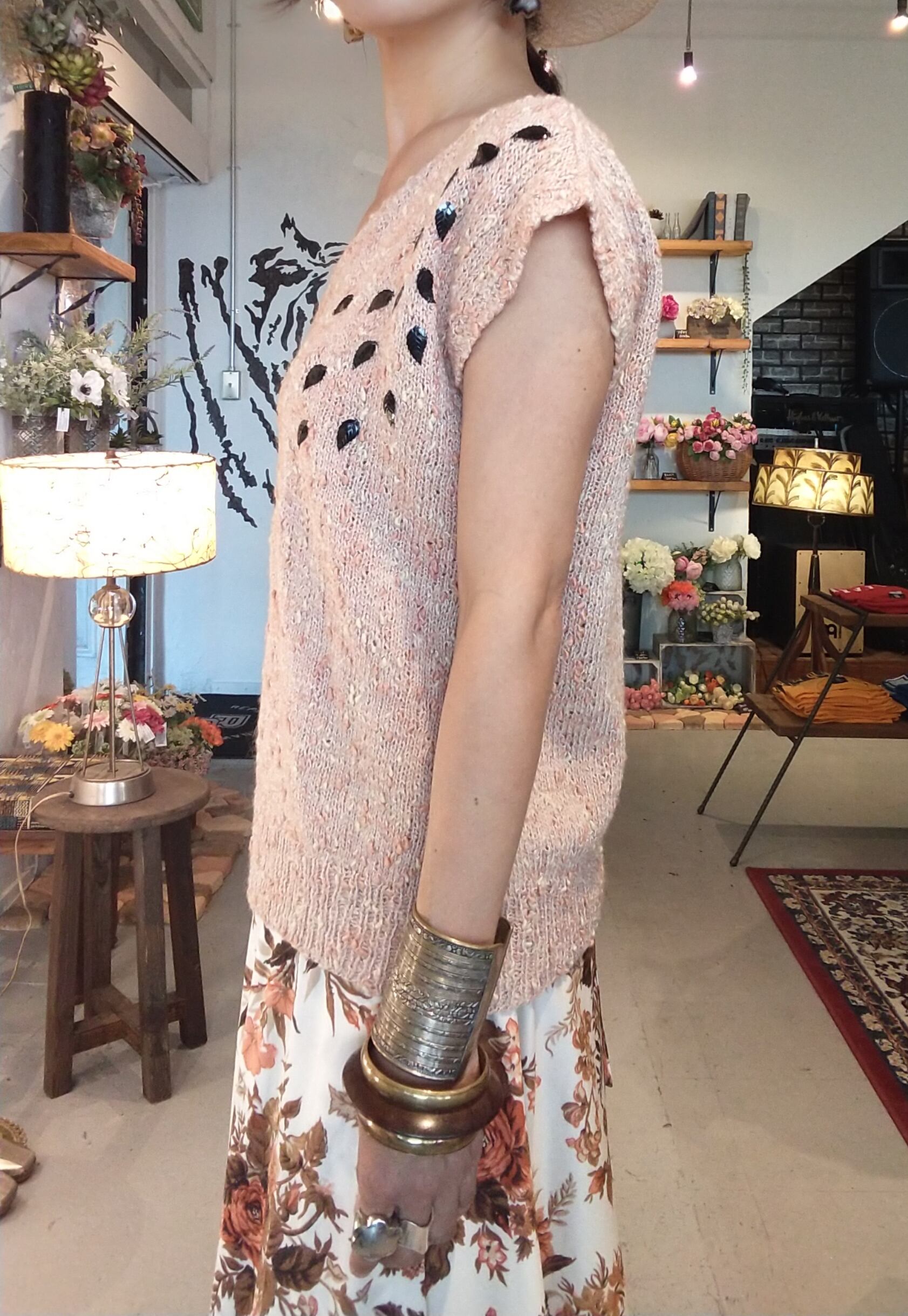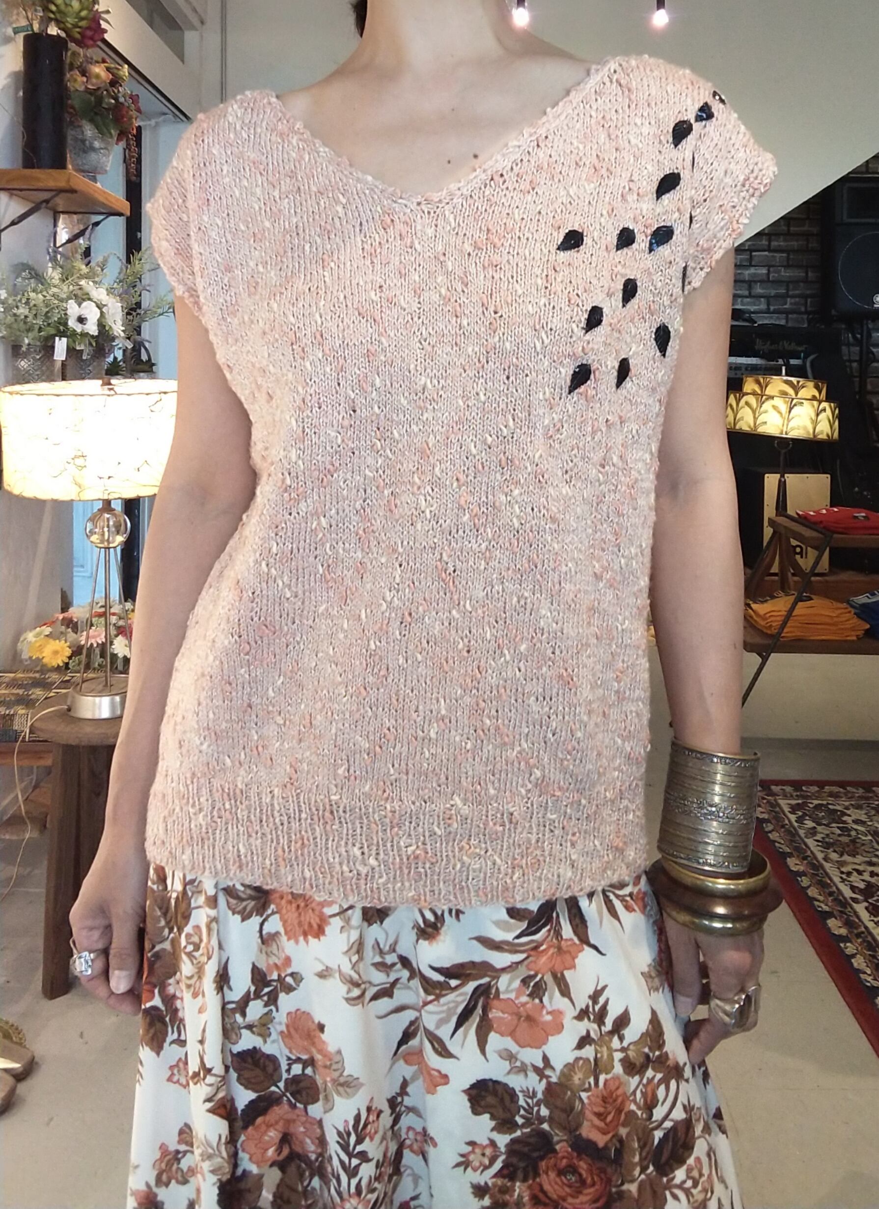 リーフモチーフのスパンコールが縫い付けられたヴィンテージサマーニット。素材表記はありませんがコットンニットのようです。前後のVネックの開きがお顔周りをすっきり見せてくれます。肌なじみの良いカラーで着やすい1枚です。