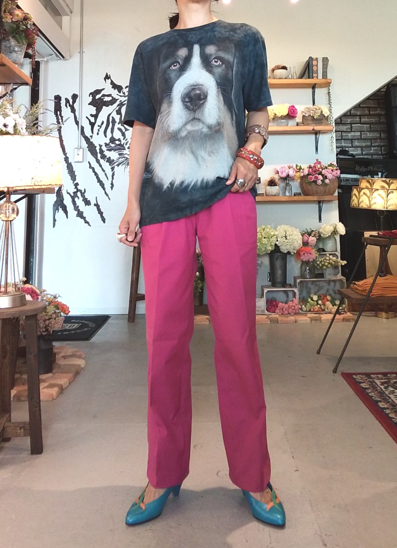 インパクト大のアニマルプリントのユーズドTシャツ。しっかりめのコットン素材です。ボディはタイダイ染めで後染めのようです。程よい使用感があり雰囲気があります。
