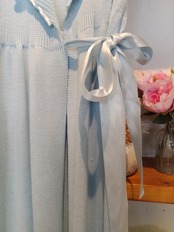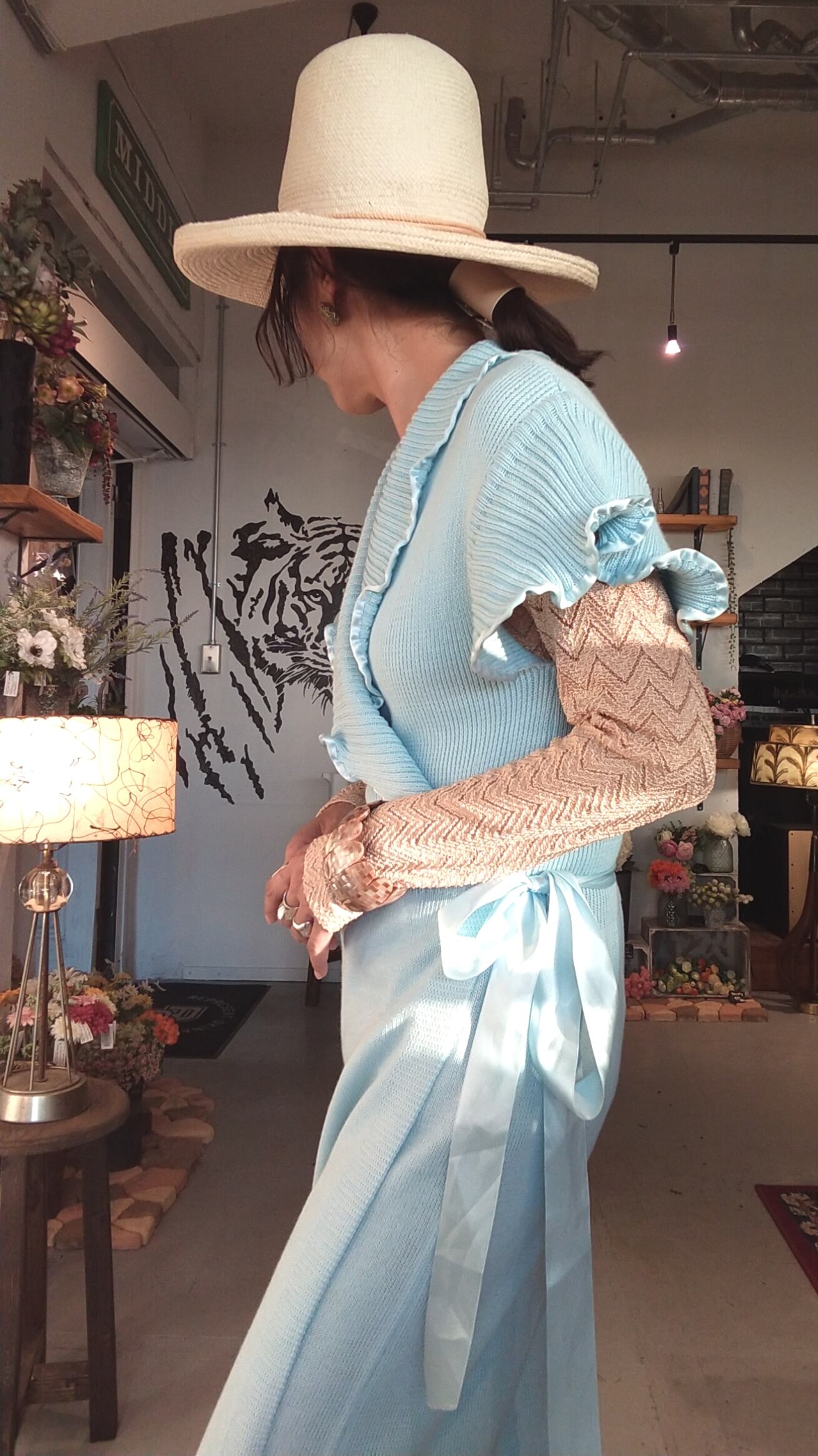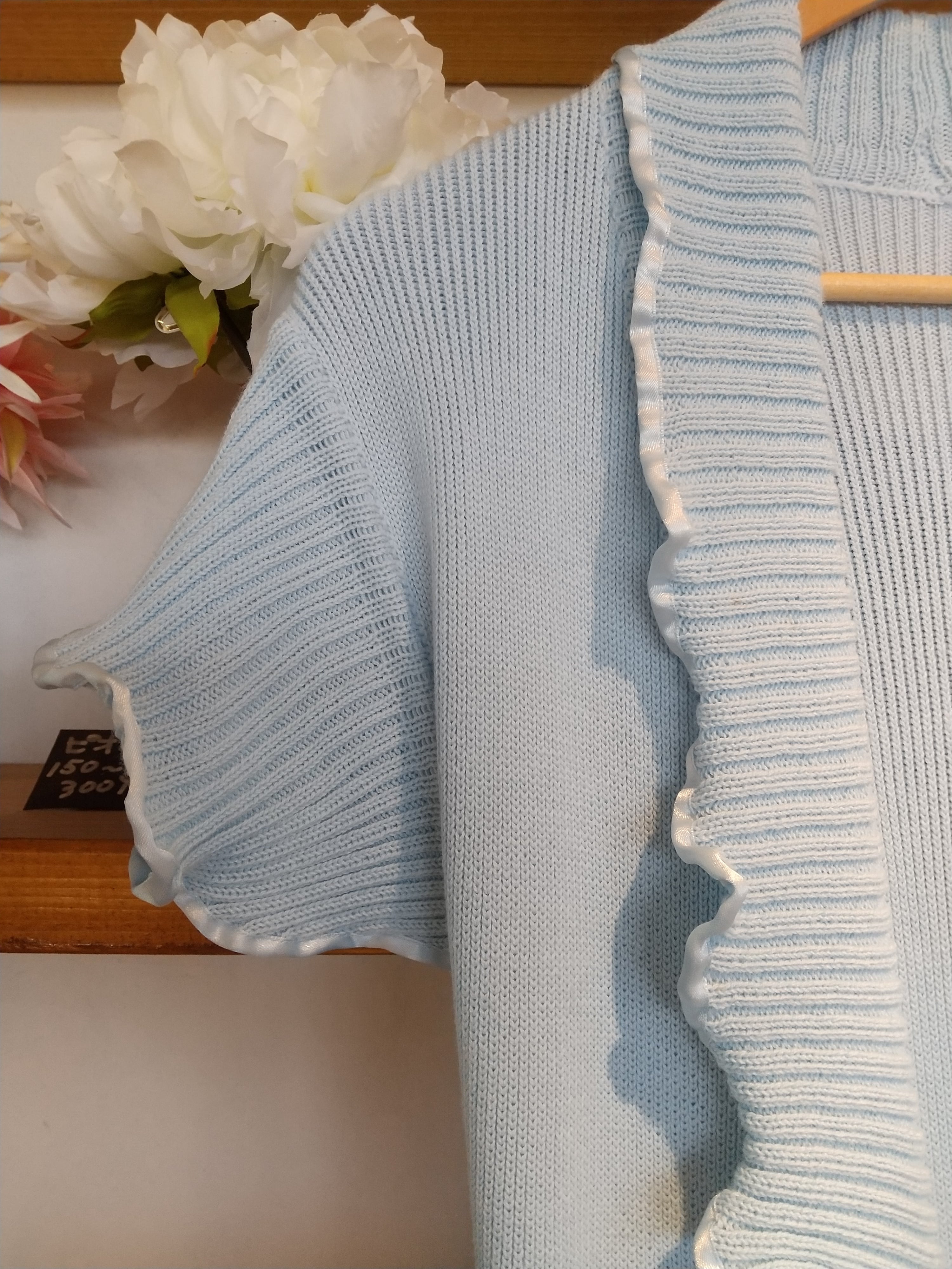 優しいベビーブルーのヴィンテージニットガウン。素材表記はありませんがコットンニットのようです。伸縮性があります。カシュクールタイプのため身幅とウエストはサイズフリー。フロントオープンで羽織りとしても、リボンをサイドで結んでドレス風にも着られます。フリル襟と袖が可愛い1枚です。