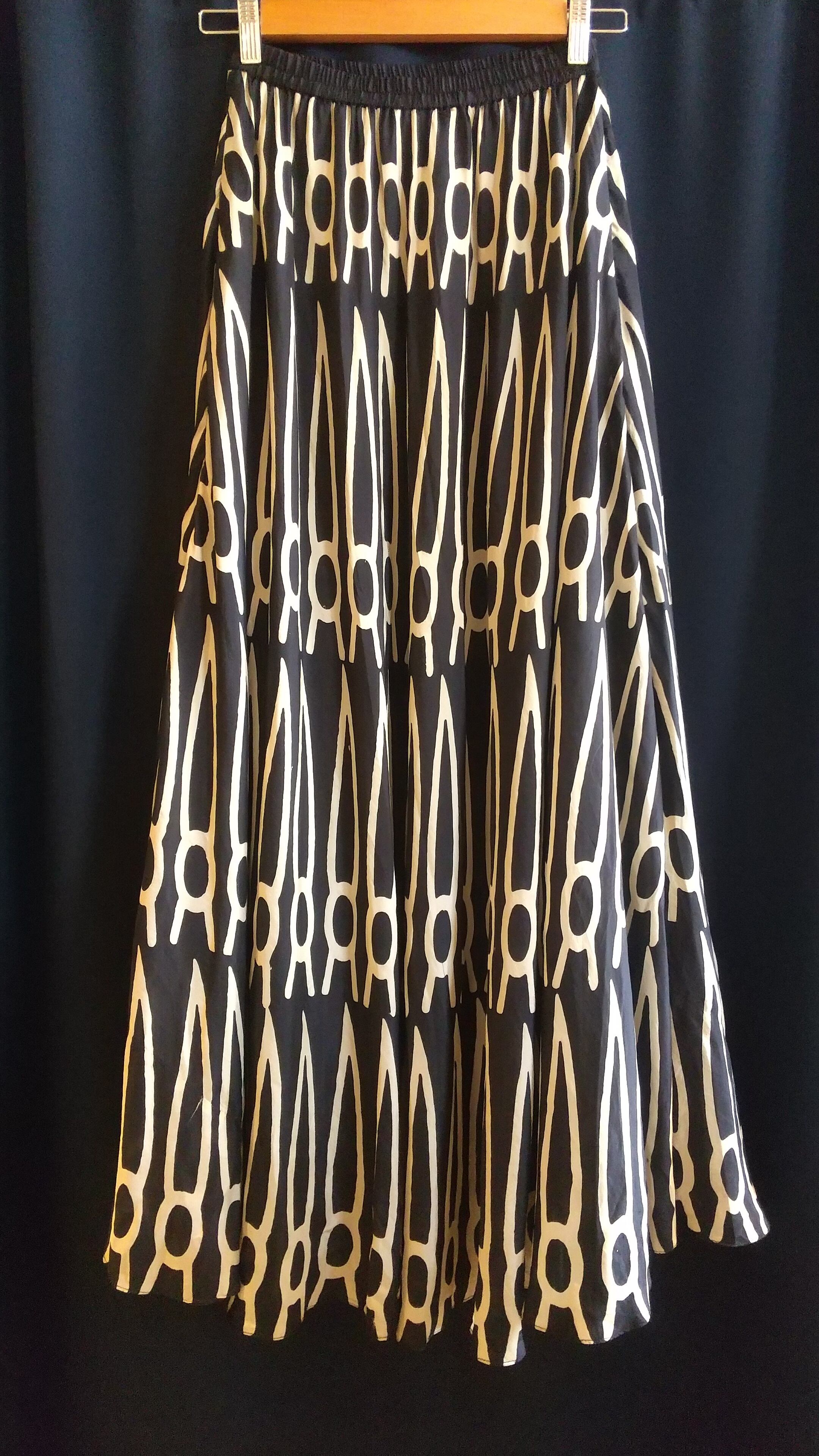 インディアンシルク100%のヴィンテージマキシスカート。裏地付きです。たっぷりの生地量で動きに合わせてゆれるフレアの様が素敵です。どこか土着的な雰囲気を纏う柄が個性的な1枚です。