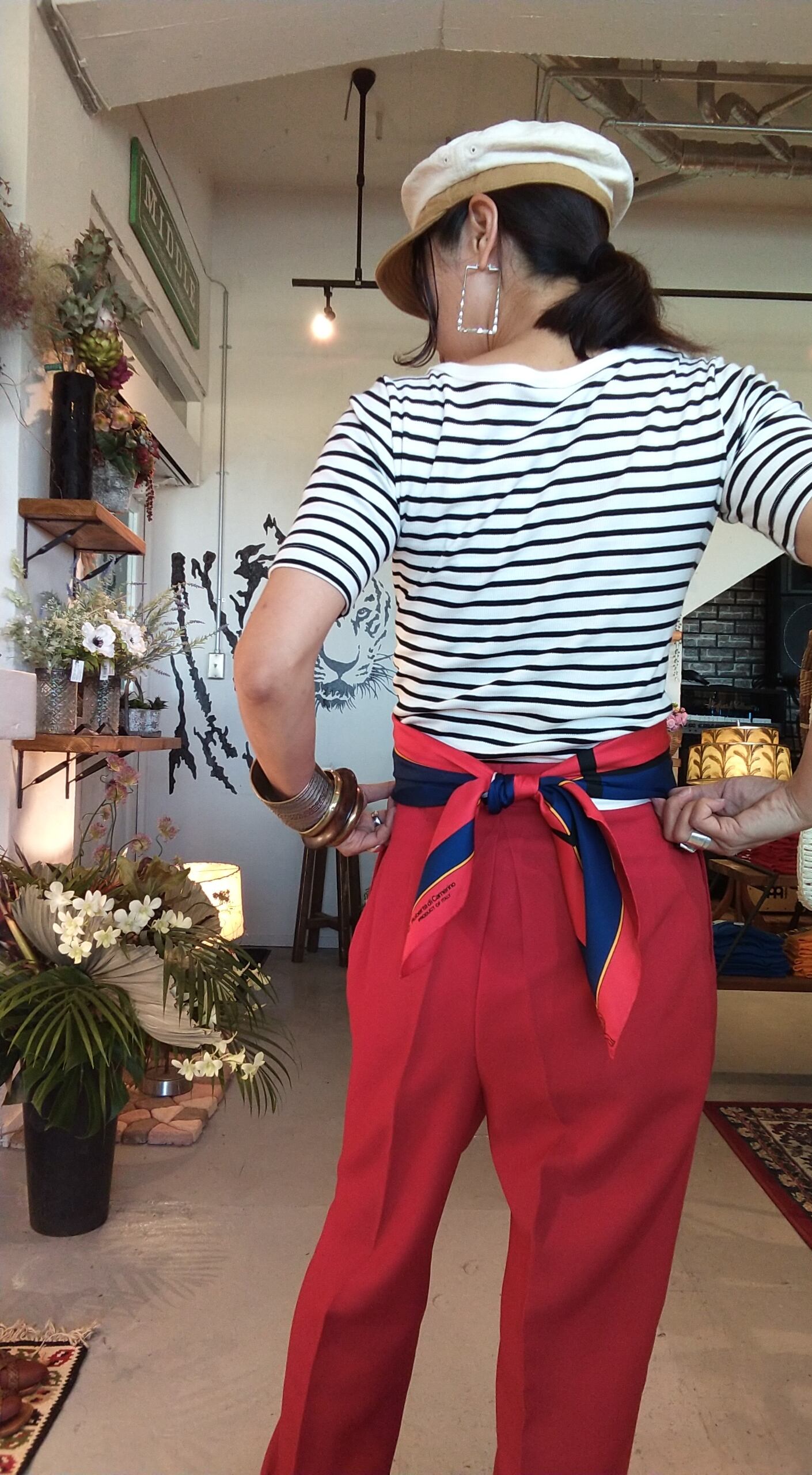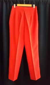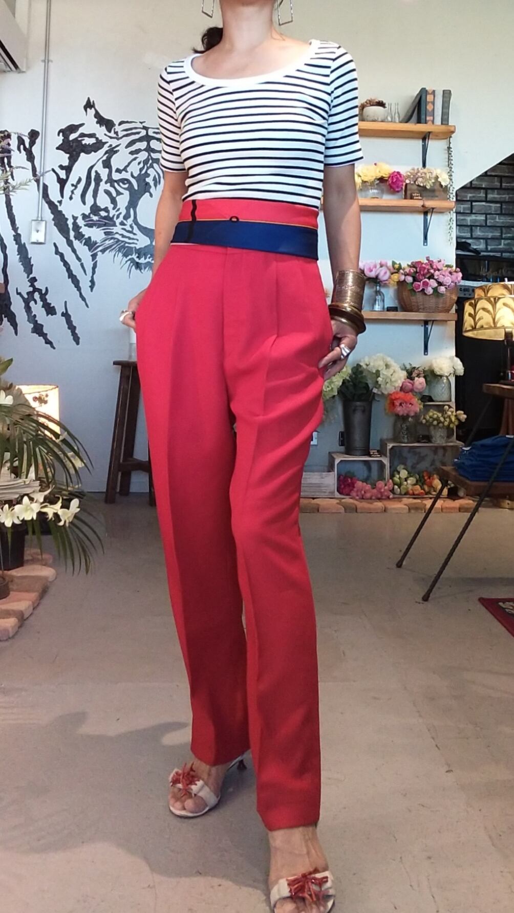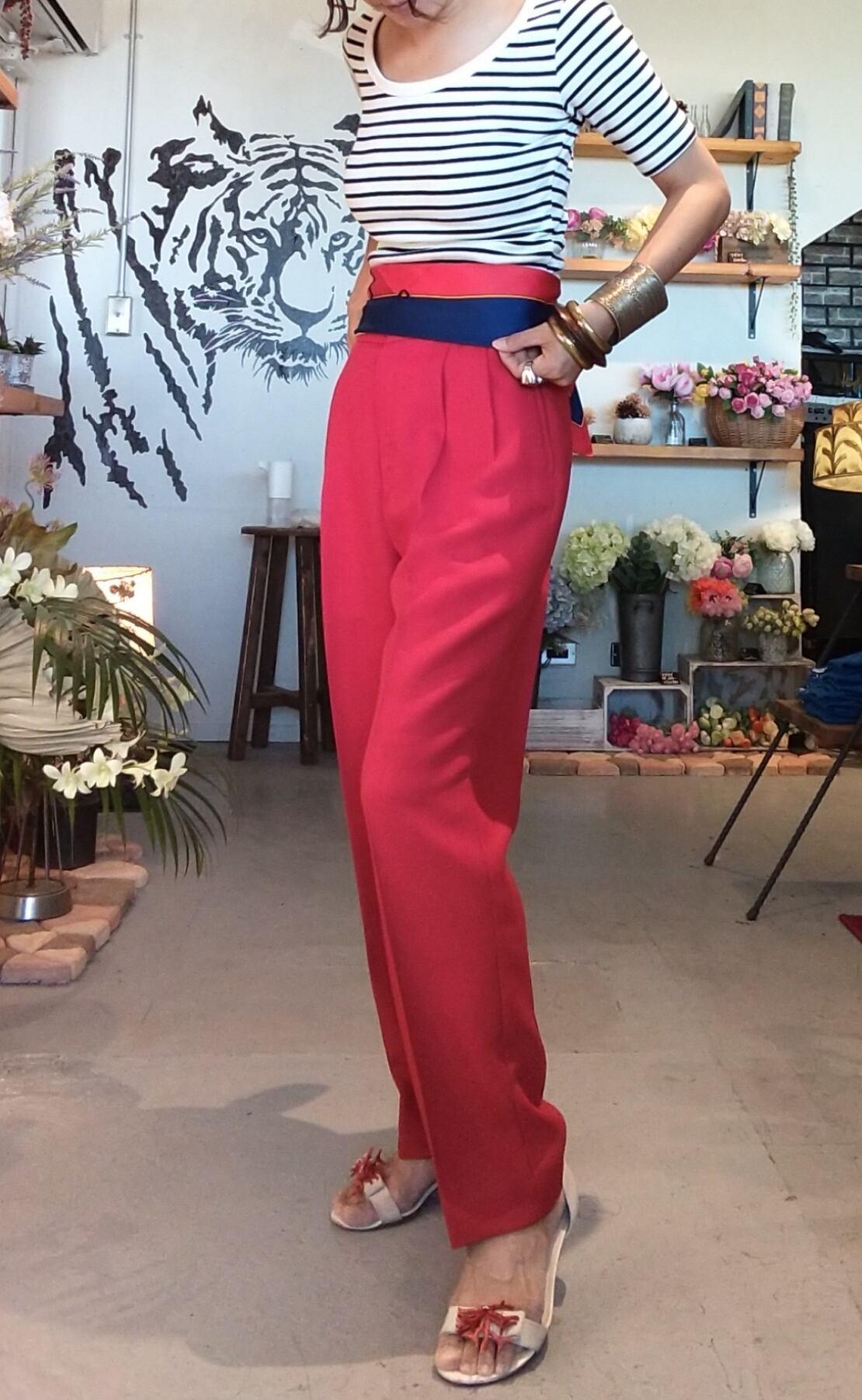 綺麗な赤のヴィンテージパンツ。素材表記はありませんがポリエステルのようです。透け感はありません。程よいハイウエスト、センタープレス入りでカジュアルにもきれいめにも履ける1枚。