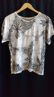 大きめ柄のカットワークが目を引くヴィンテージトップ。素材表記はありませんがレーヨンのような落ち感のある涼しい素材です。