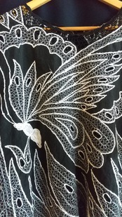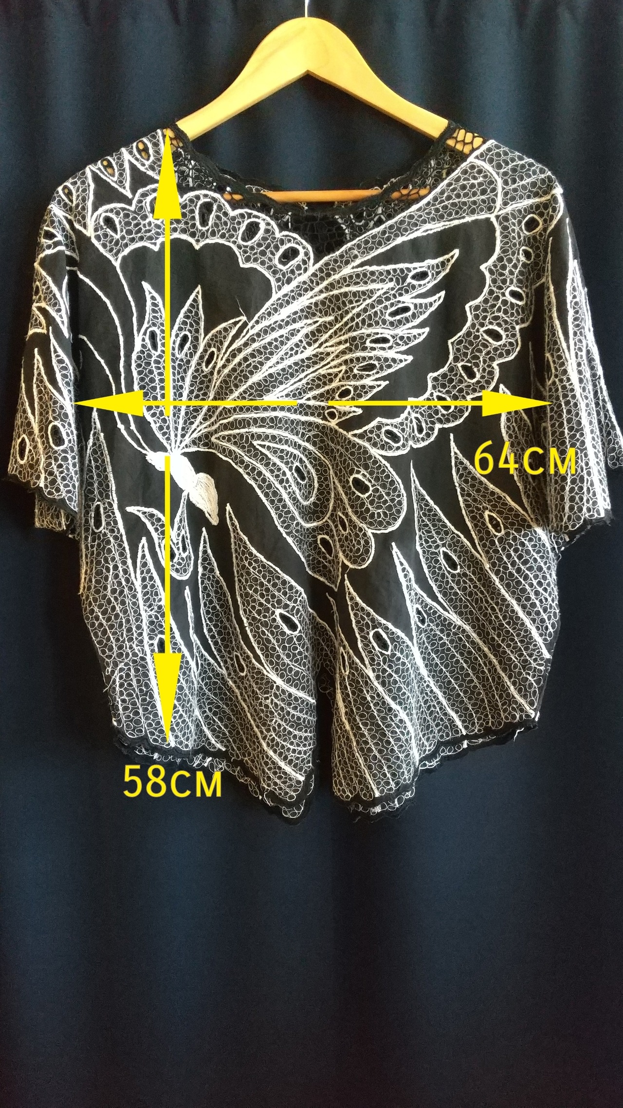 黒地にホワイトの刺繍とカットワークがふんだんに施されたヴィンテージトップ。素材表記はありませんがやや張り感のあるコットンのようです。豪華な蝶モチーフの刺繍や裾のスリット等、モノトーンながらも豪華な印象。
